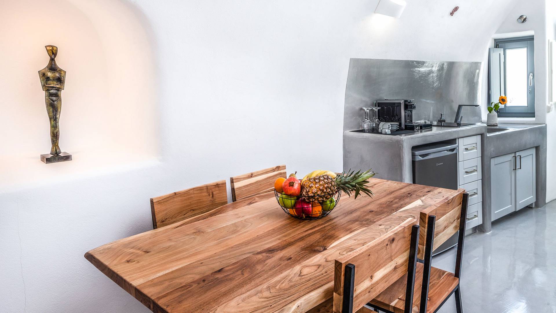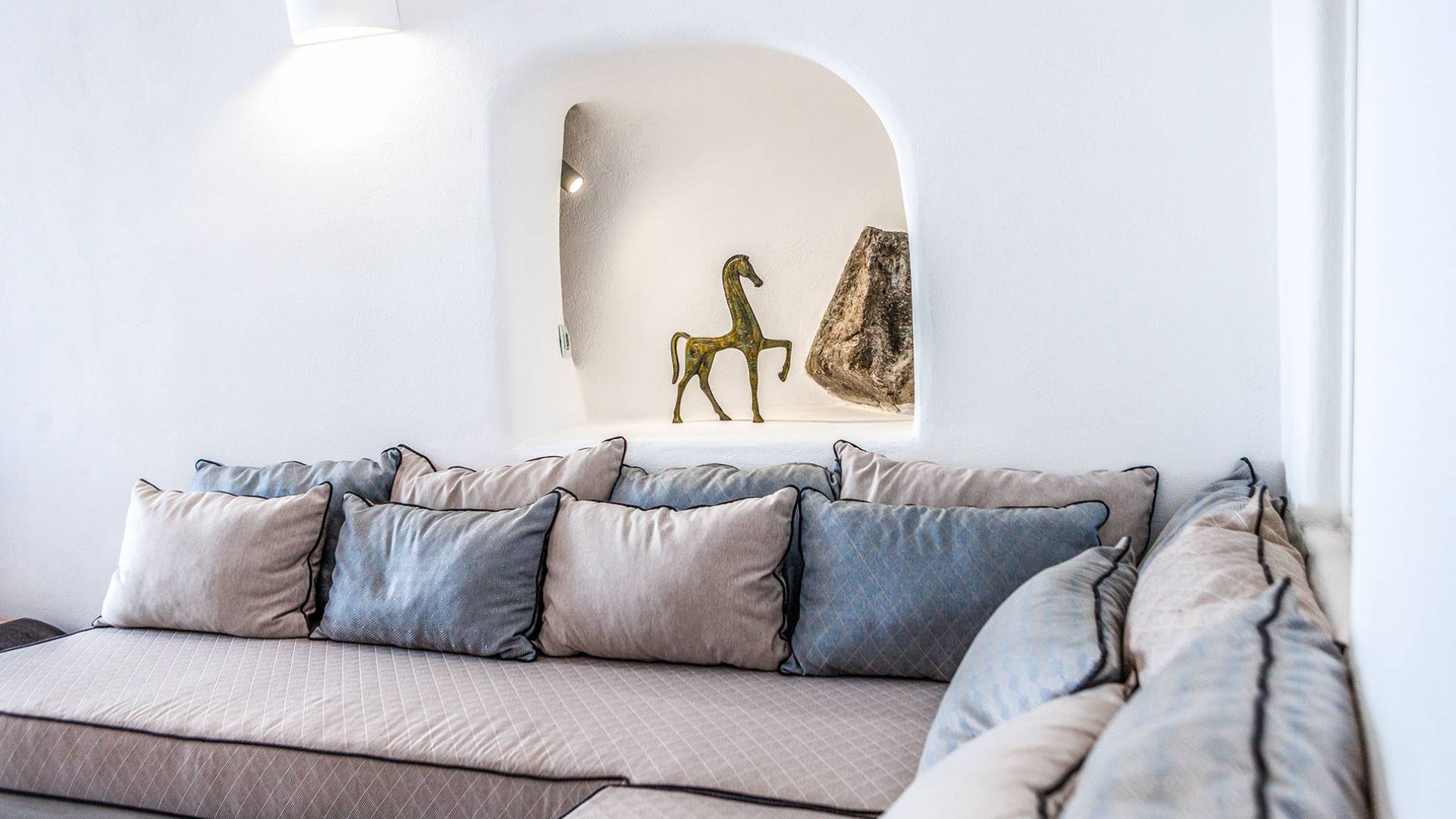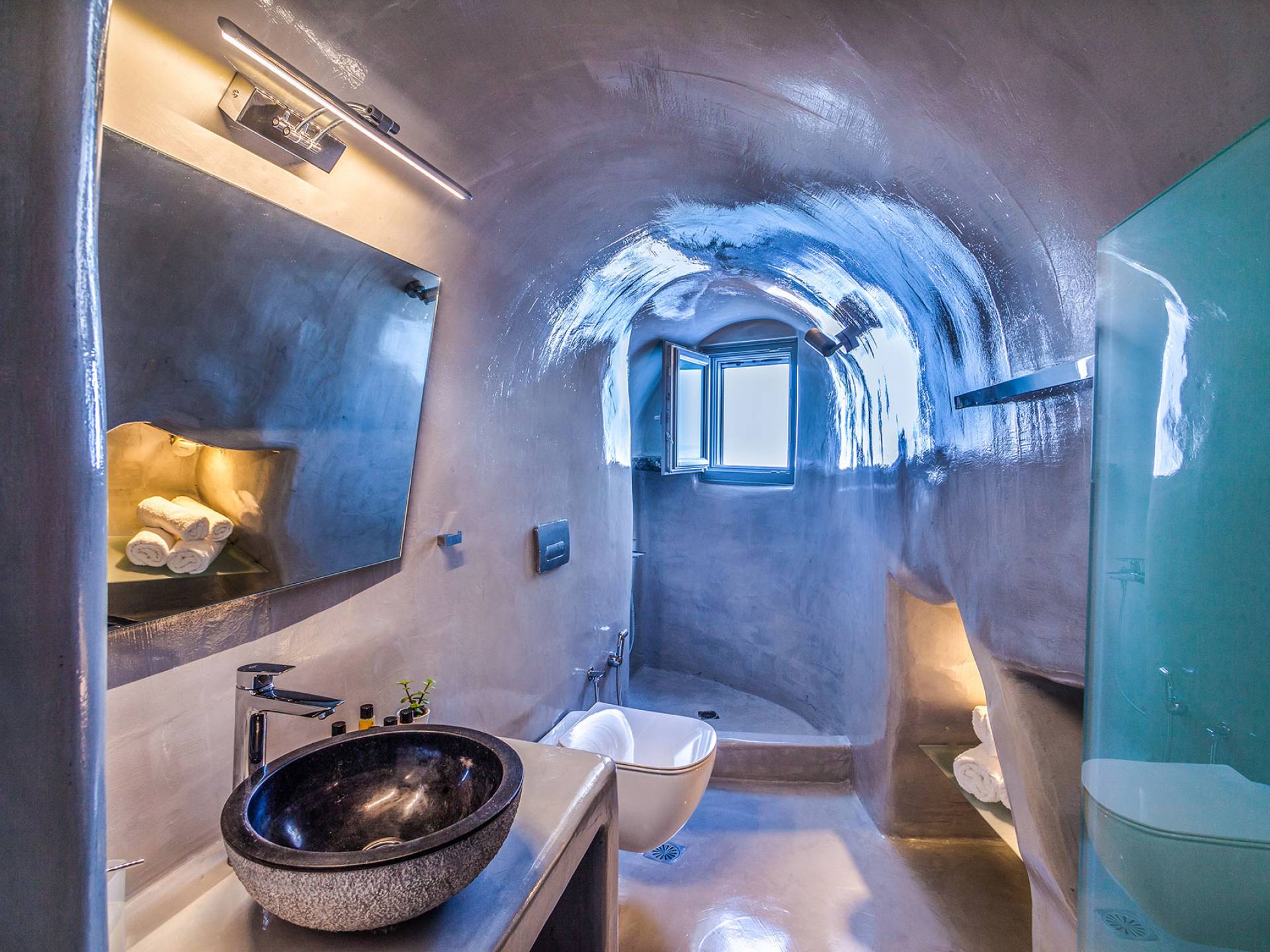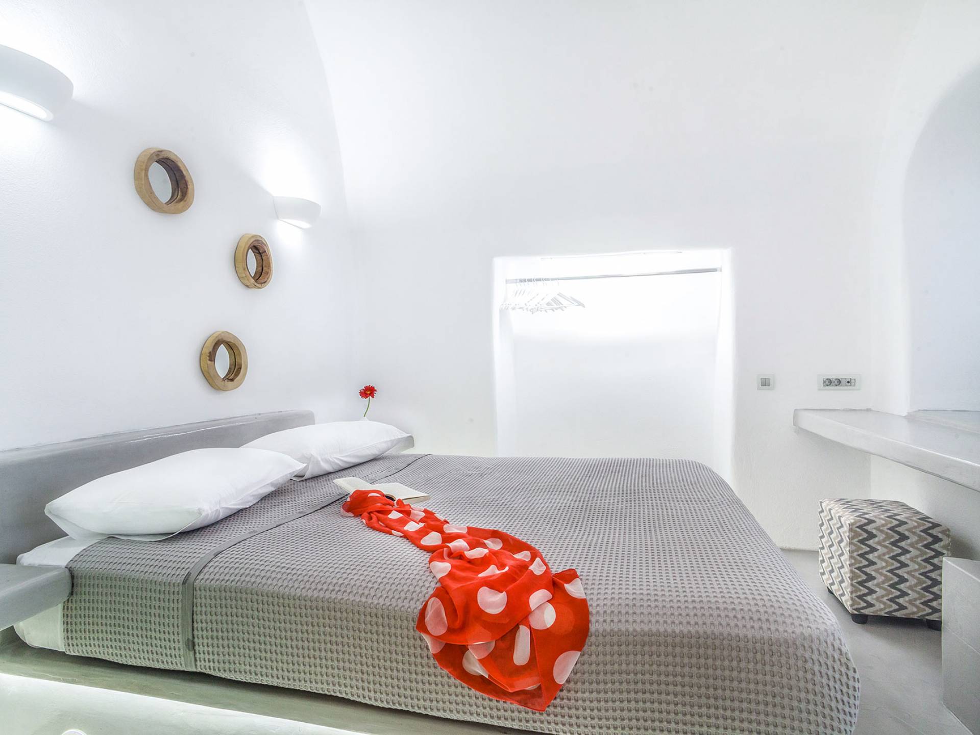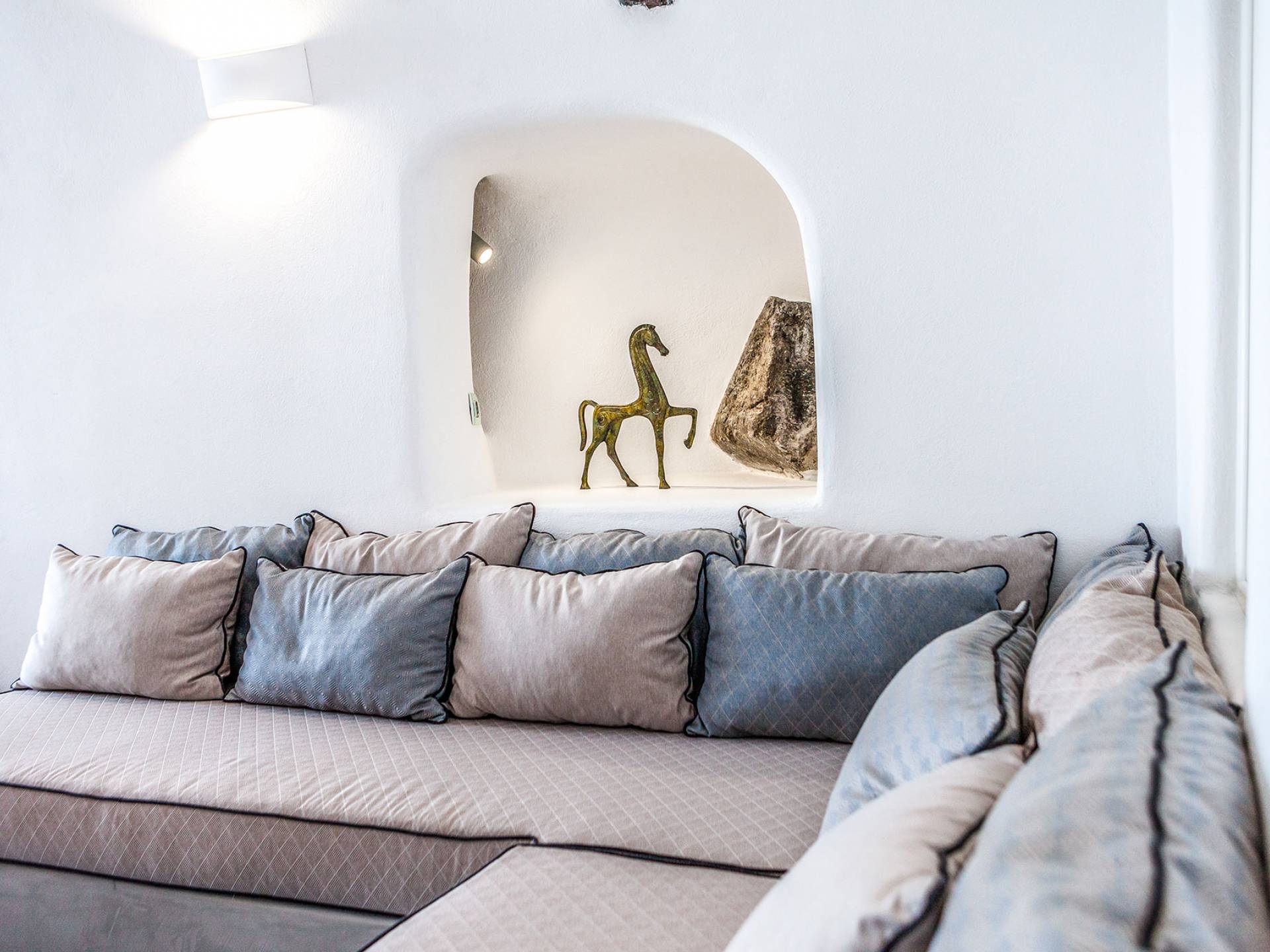 La villa Antrum comprende un'area di circa 84 metri quadrati dotata di due camere da letto spaziose e dal design brillante con un letto king-size e un lussuoso bagno ciascuna e due divani letto. La villa è dotata di un angolo cottura eccezionalmente progettato in uno spazio soggiorno a piano aperto. Rilassati sul divano mentre osservi il blu profondo del Mar Egeo e l'isolotto vulcanico. Esci sui balconi unici o sull'ampia terrazza panoramica e goditi la colazione o la cena mentre ti godi la vista unica della Caldera e del tramonto