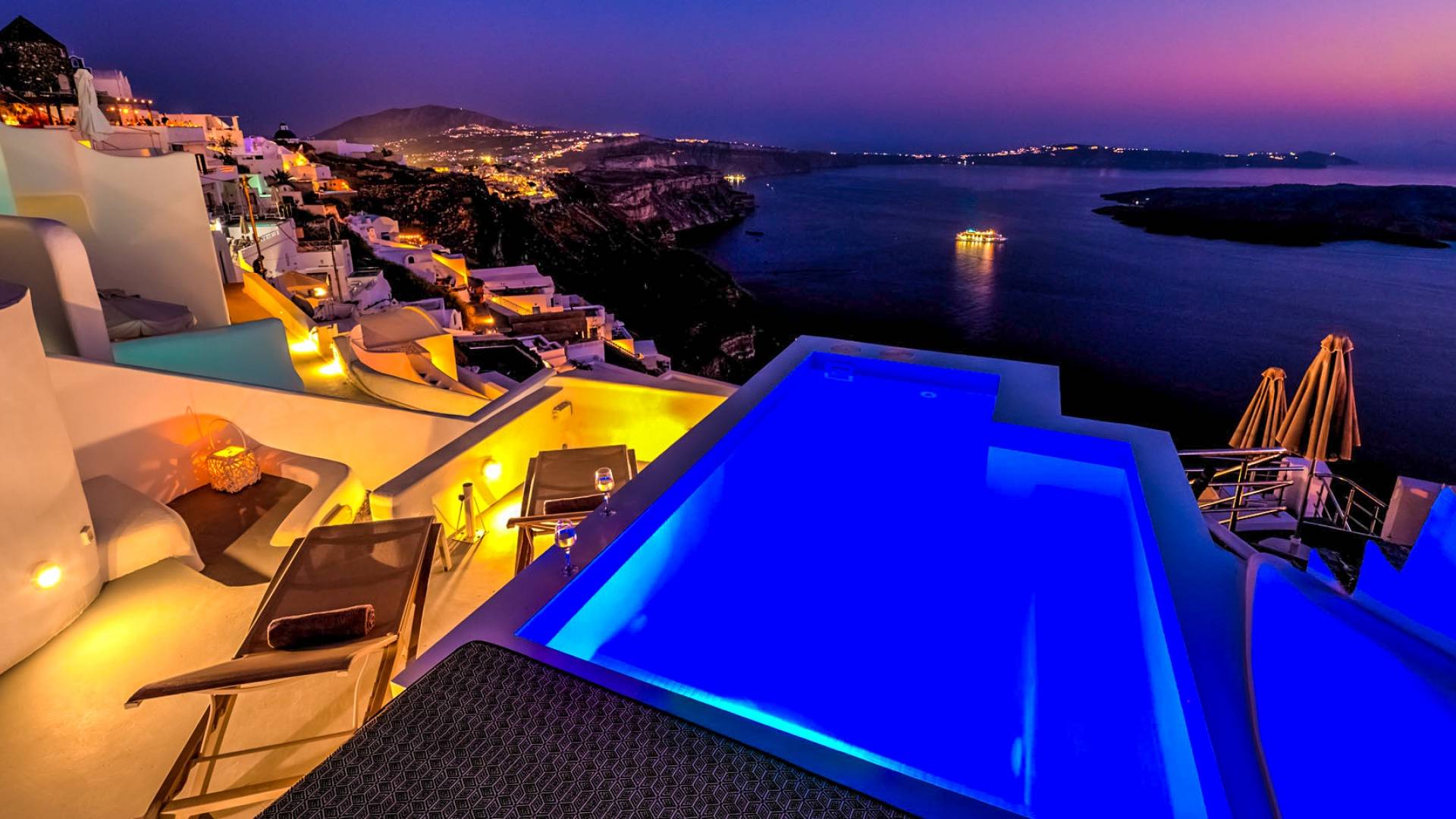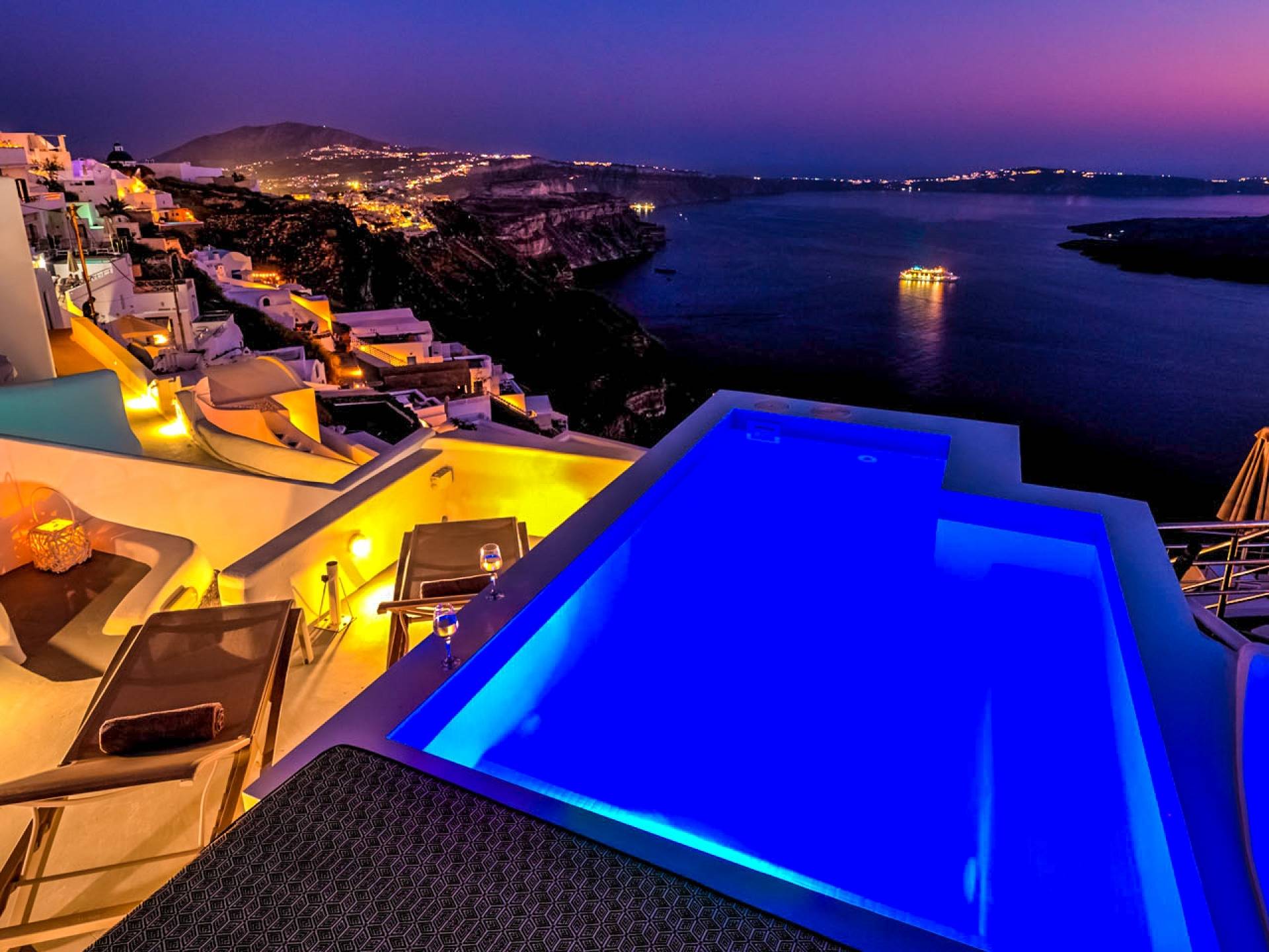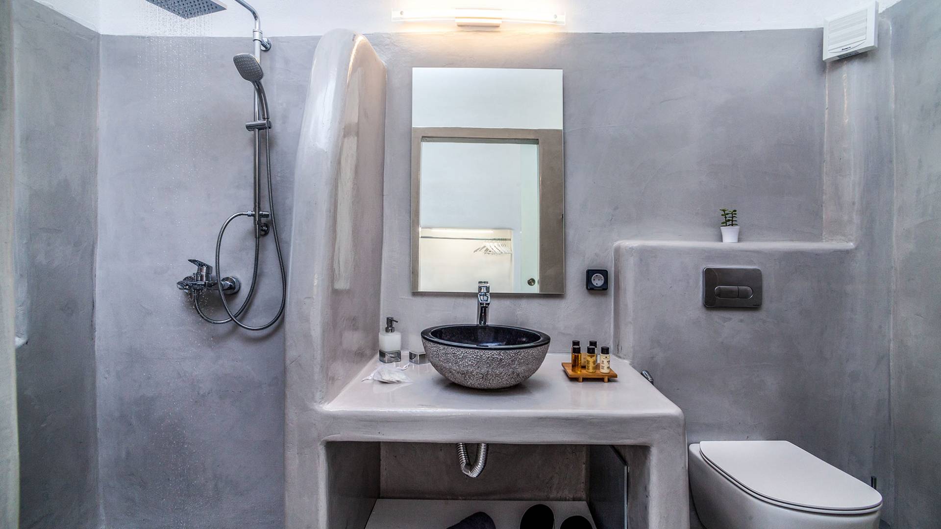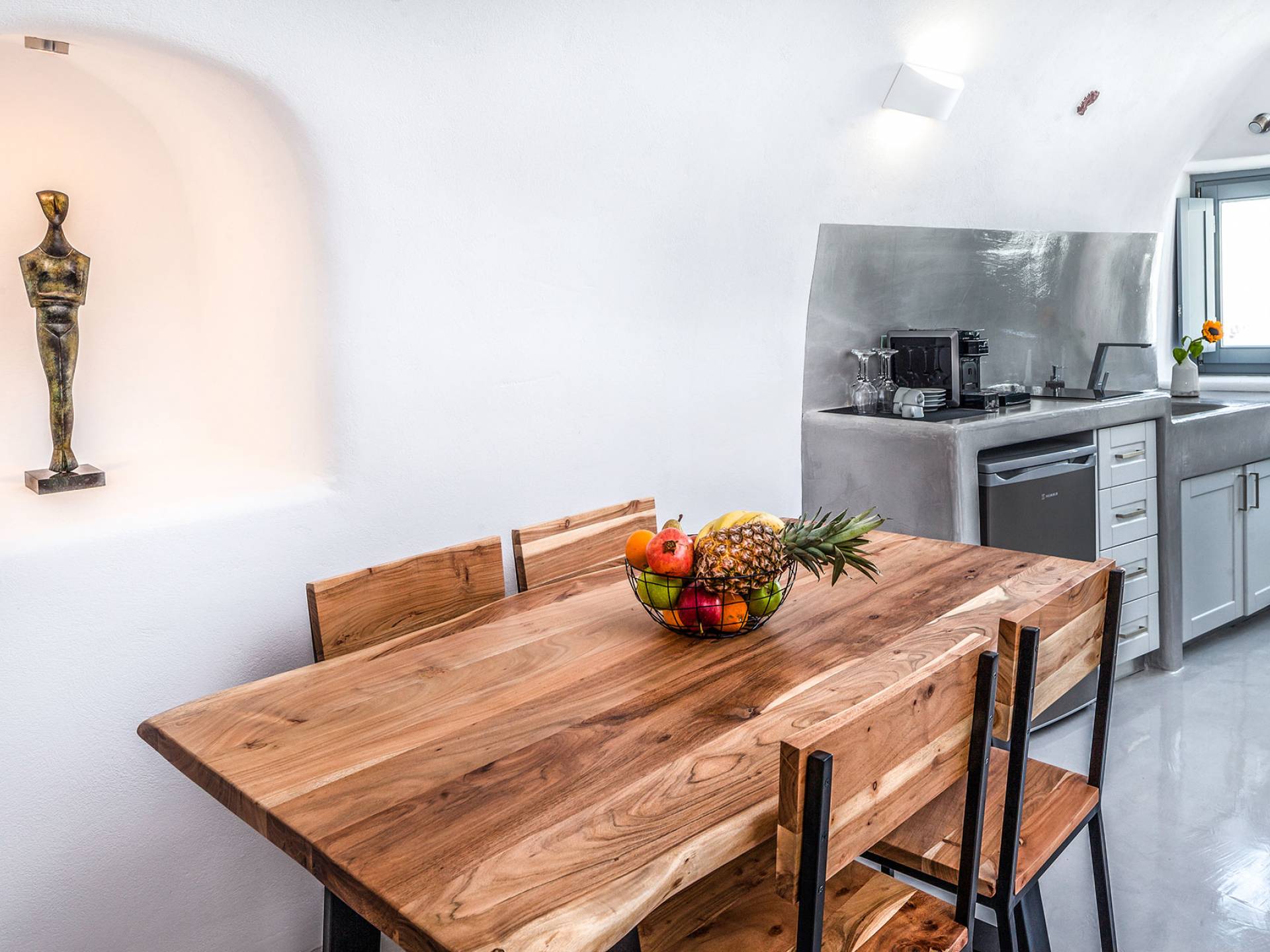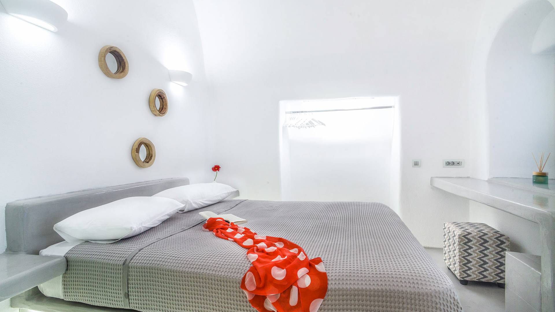 La villa Antrum comprende un'area di circa 84 metri quadrati dotata di due camere da letto spaziose e dal design brillante con un letto king-size e un lussuoso bagno ciascuna e due divani letto. La villa è dotata di un angolo cottura eccezionalmente progettato in uno spazio soggiorno a piano aperto. Rilassati sul divano mentre osservi il blu profondo del Mar Egeo e l'isolotto vulcanico. Esci sui balconi unici o sull'ampia terrazza panoramica e goditi la colazione o la cena mentre ti godi la vista unica della Caldera e del tramonto