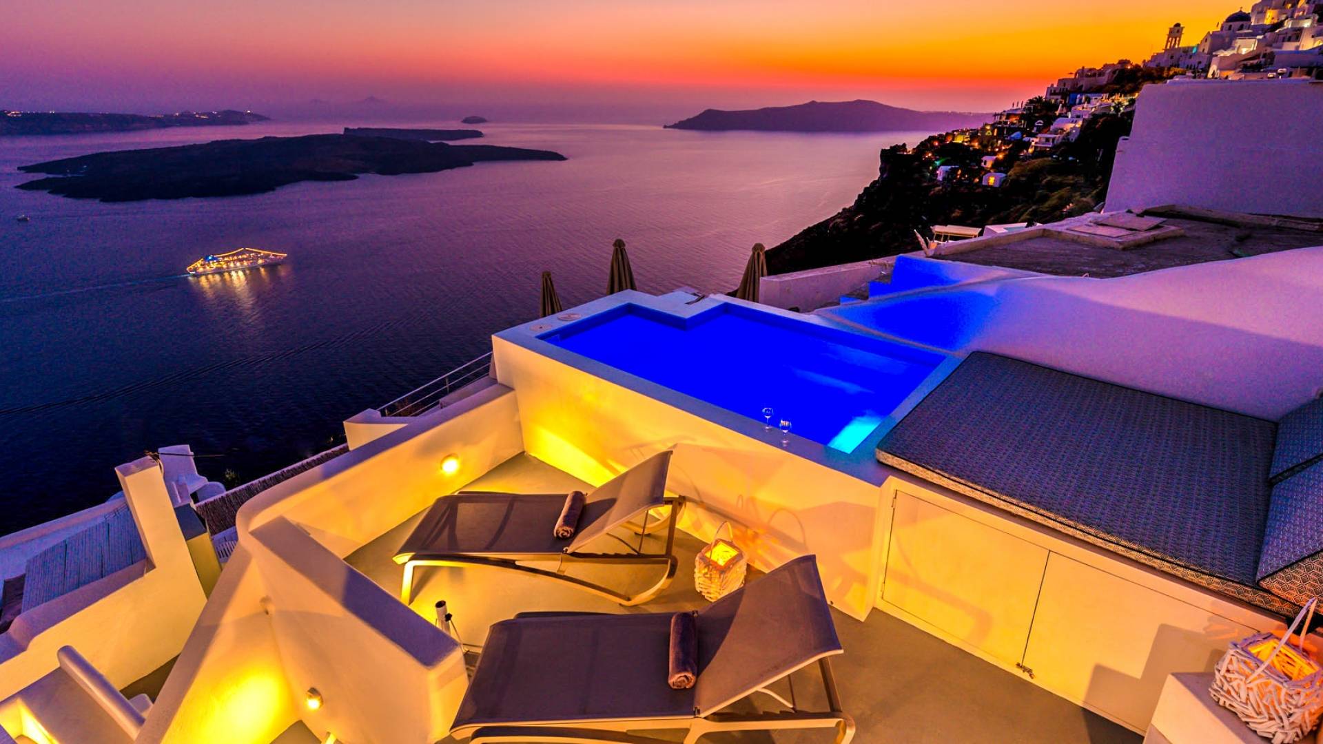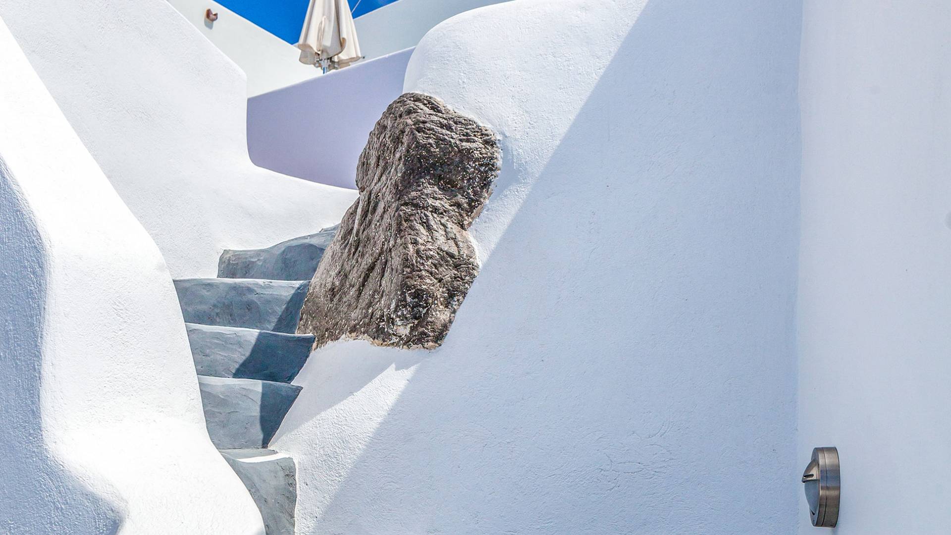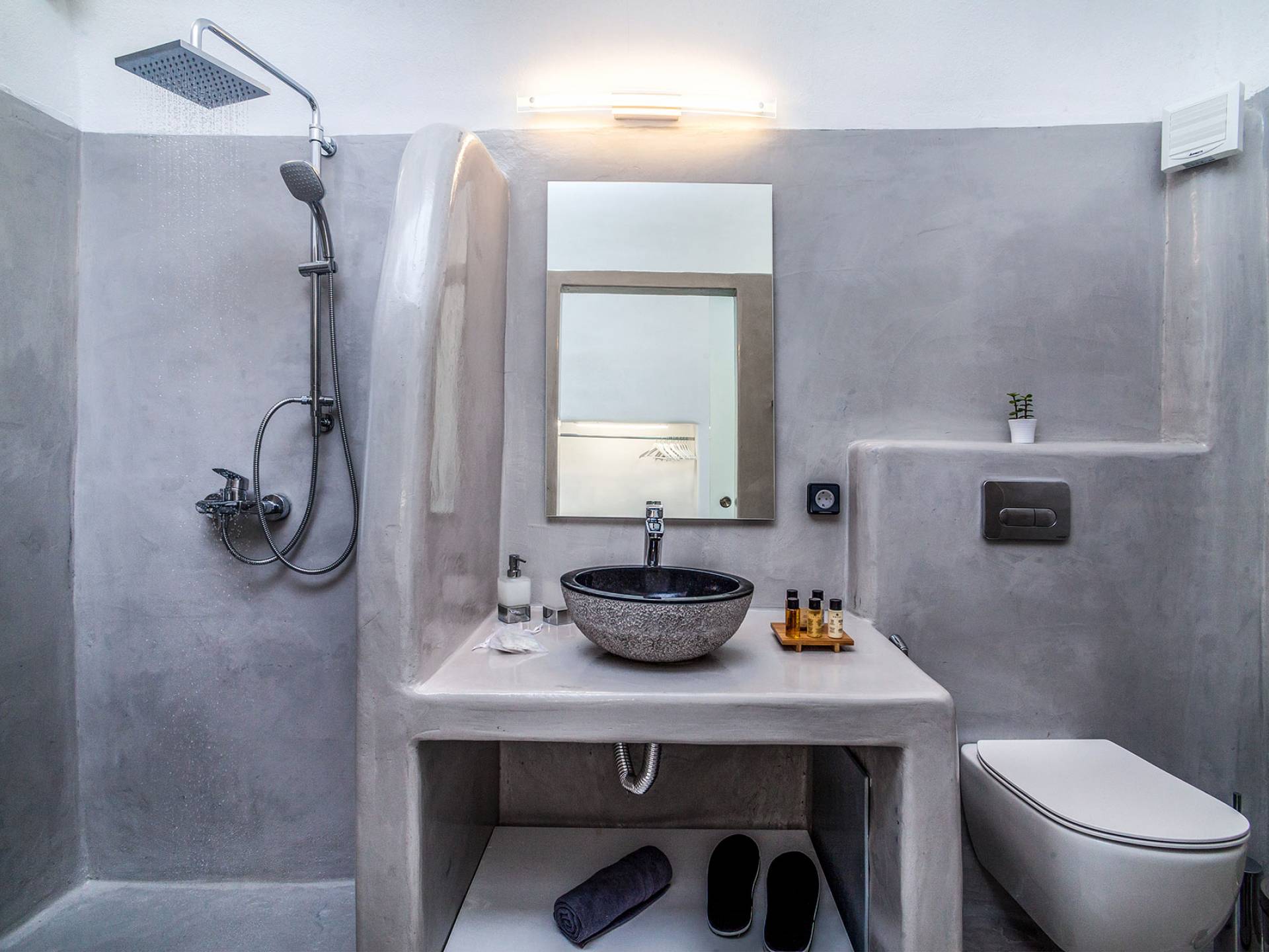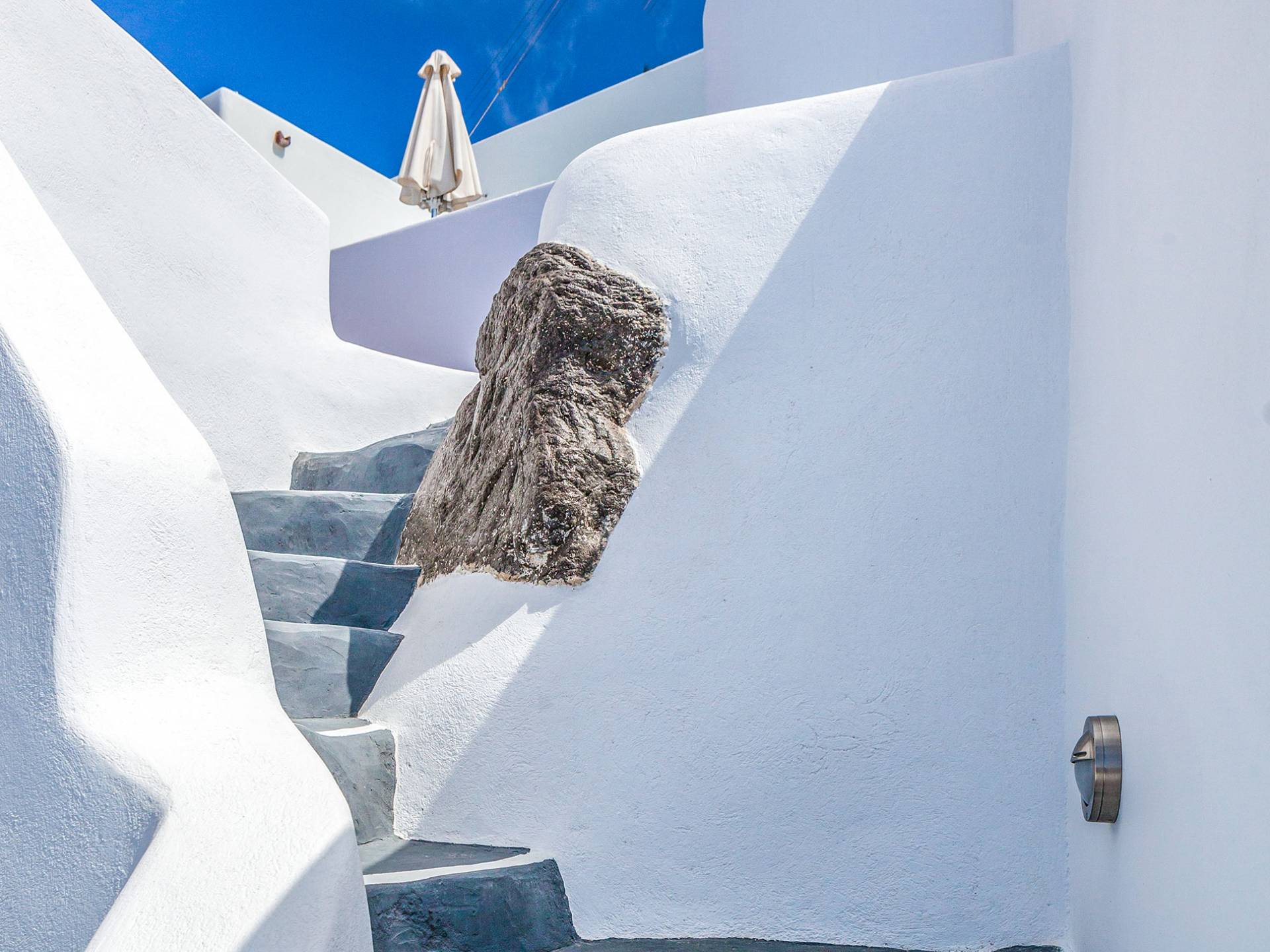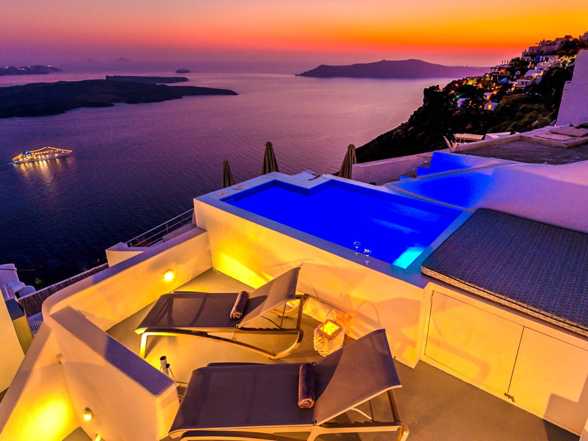 La villa Antrum comprende un'area di circa 84 metri quadrati dotata di due camere da letto spaziose e dal design brillante con un letto king-size e un lussuoso bagno ciascuna e due divani letto. La villa è dotata di un angolo cottura eccezionalmente progettato in uno spazio soggiorno a piano aperto. Rilassati sul divano mentre osservi il blu profondo del Mar Egeo e l'isolotto vulcanico. Esci sui balconi unici o sull'ampia terrazza panoramica e goditi la colazione o la cena mentre ti godi la vista unica della Caldera e del tramonto