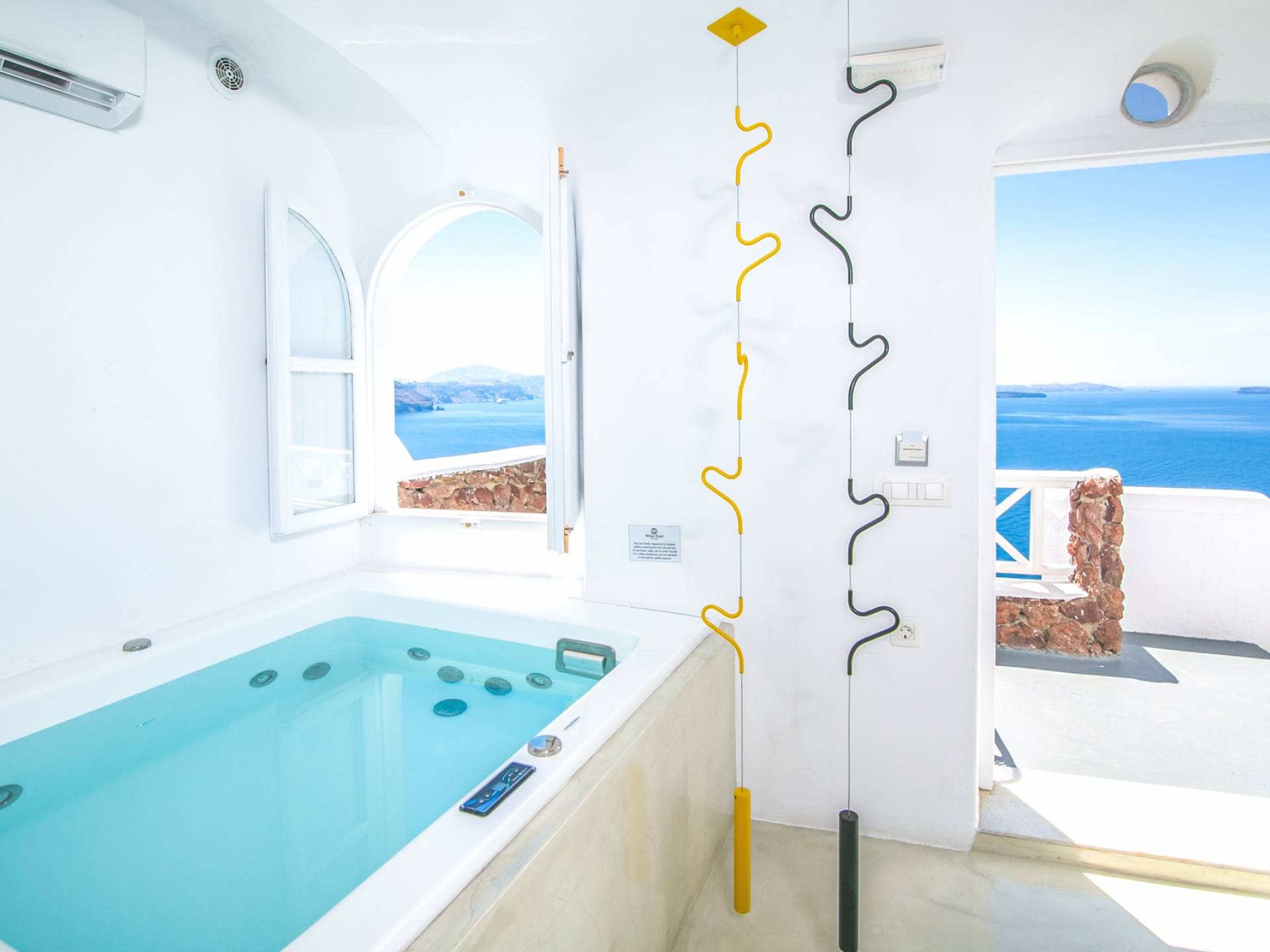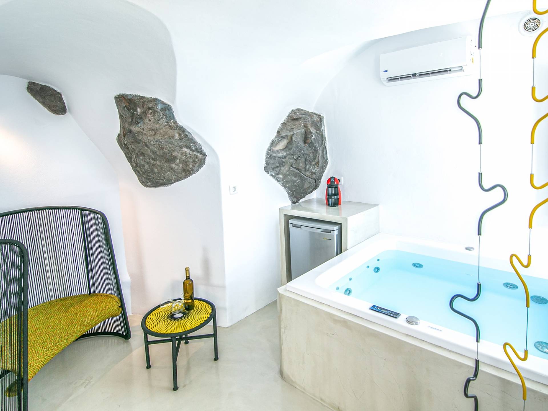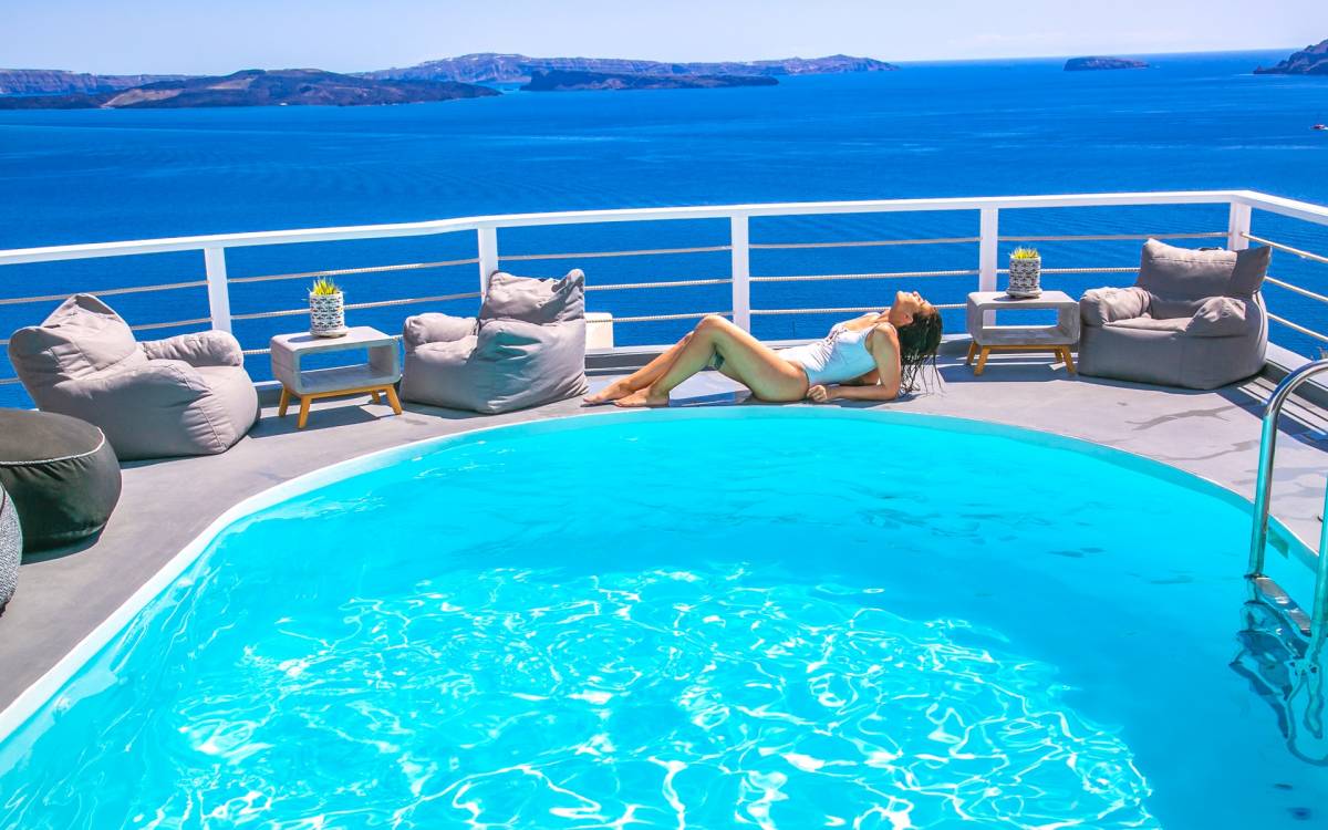 Questa eccezionale villa di 30 metri quadrati è davvero come un nido accogliente! Ha una vasca idromassaggio interna, proprio vicino alla finestra per godere al massimo di viste spettacolari, e una terrazza privata con mobili da esterno che gode di una vista mozzafiato sulla Caldera e sul Mar Egeo e accesso a una piscina in comune con lettini e ombrelloni.