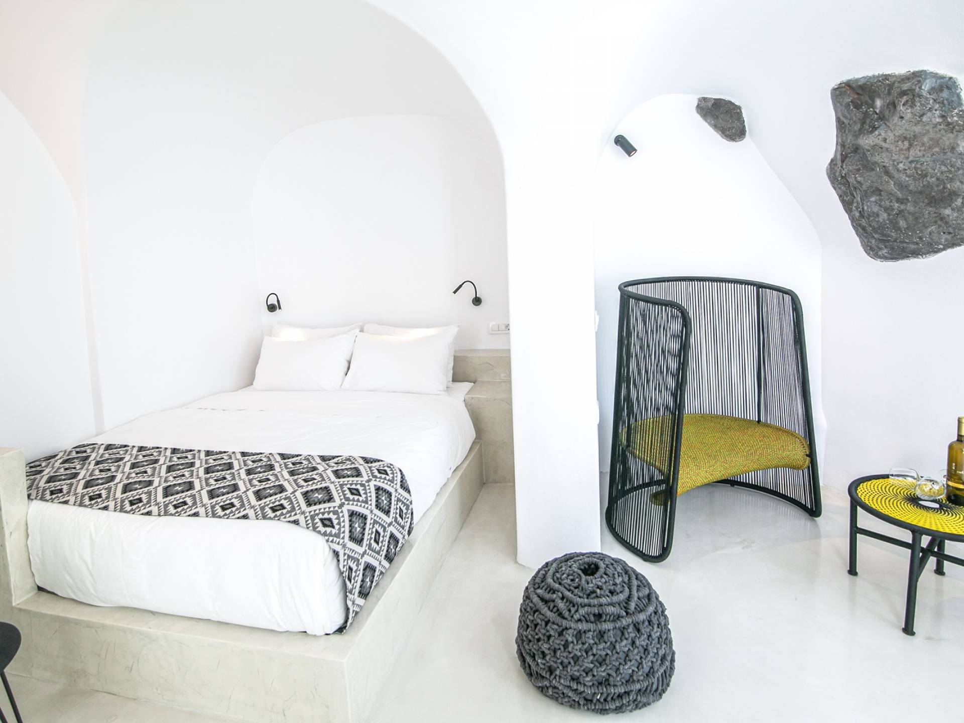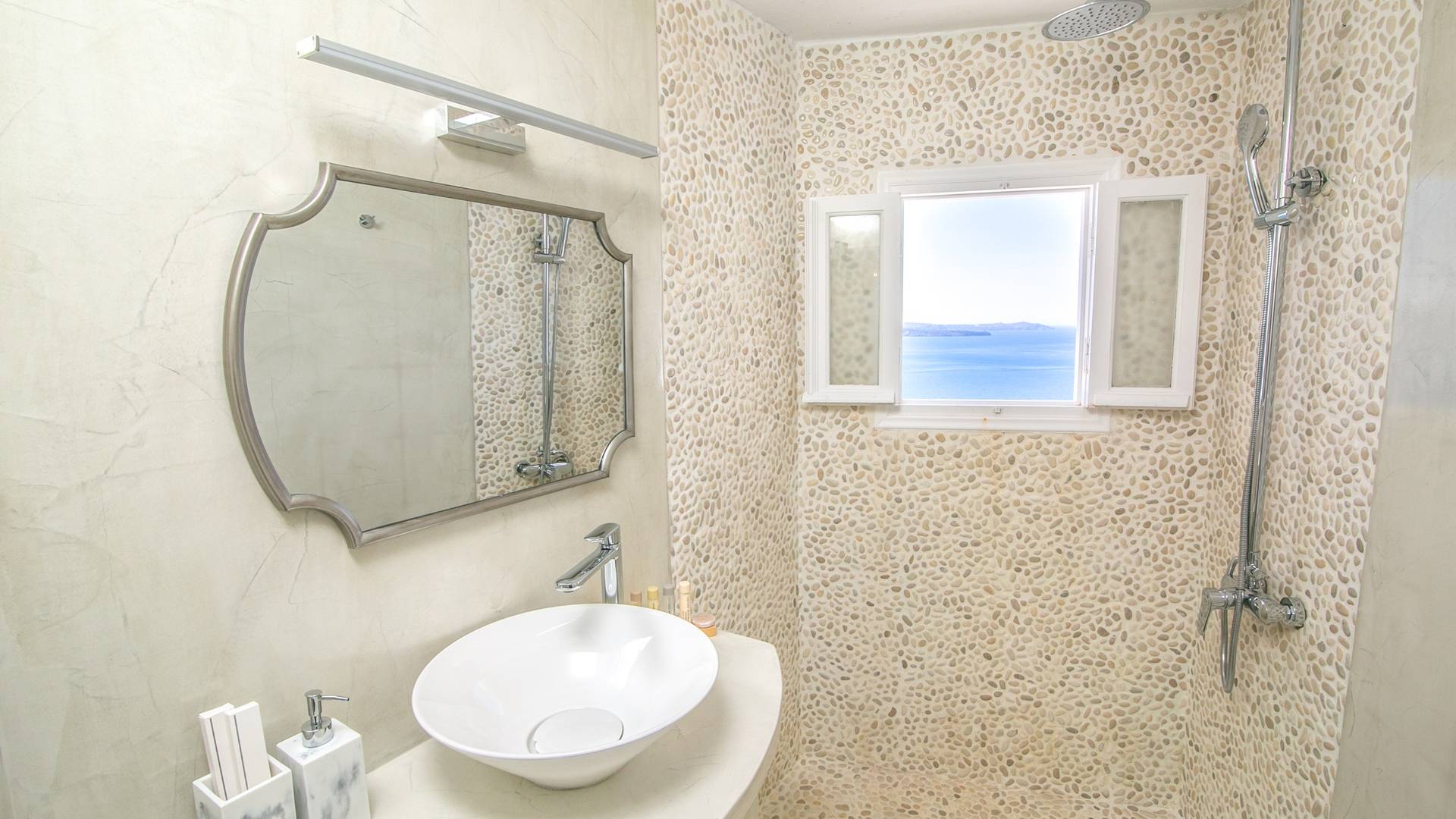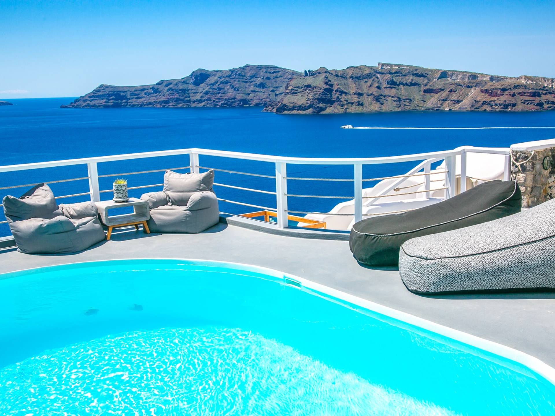 Questa eccezionale villa di 30 metri quadrati è davvero come un nido accogliente! Ha una vasca idromassaggio interna, proprio vicino alla finestra per godere al massimo di viste spettacolari, e una terrazza privata con mobili da esterno che gode di una vista mozzafiato sulla Caldera e sul Mar Egeo e accesso a una piscina in comune con lettini e ombrelloni.