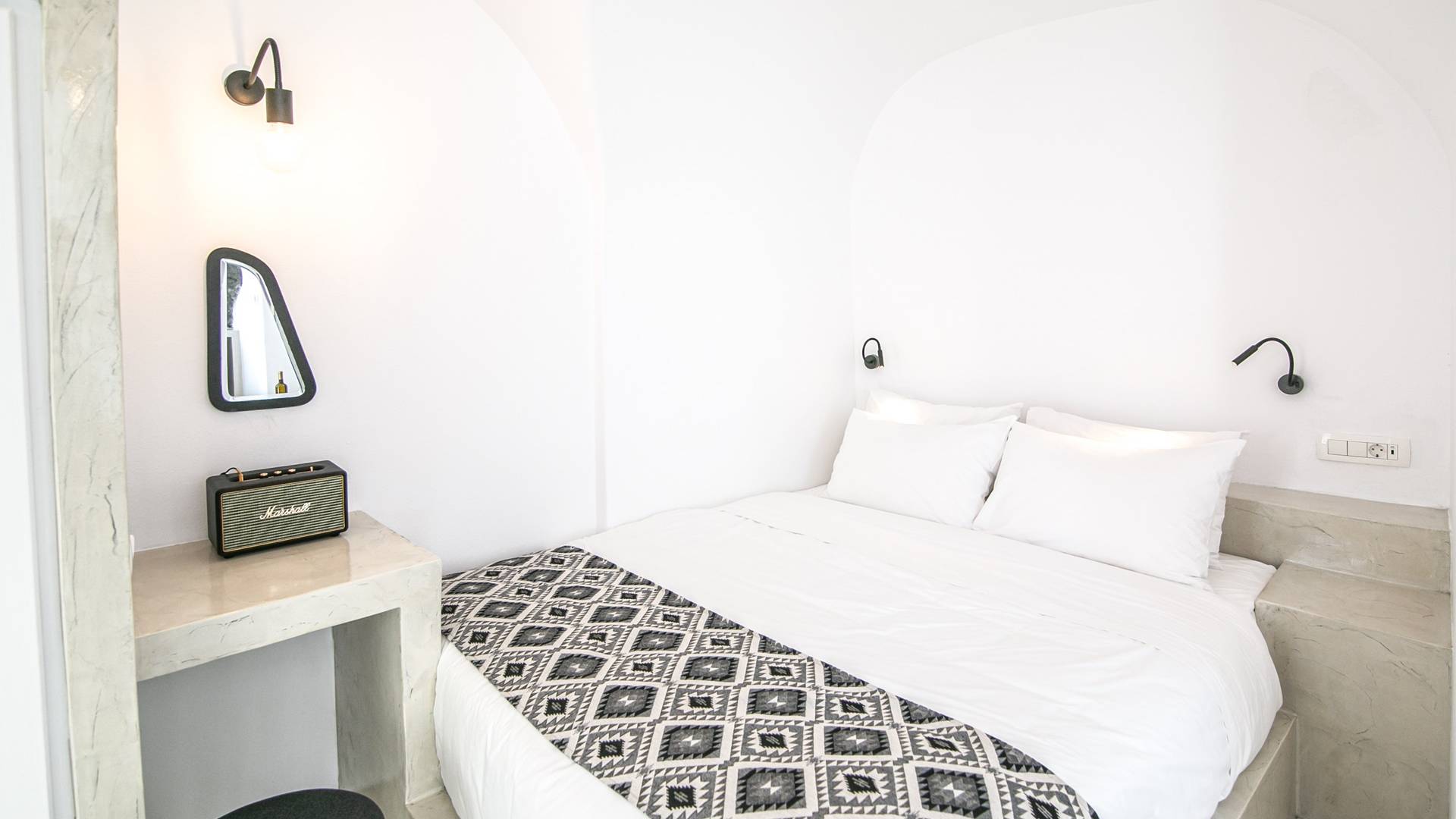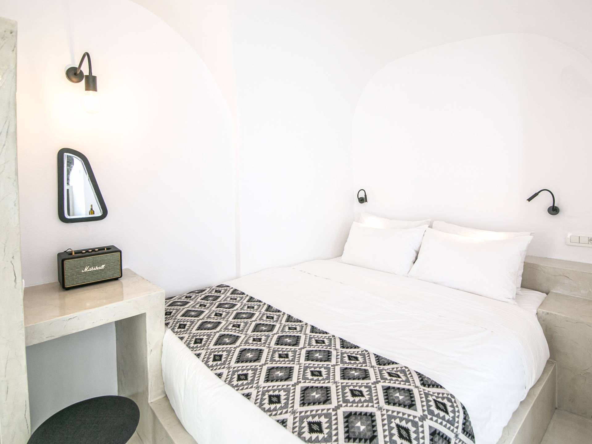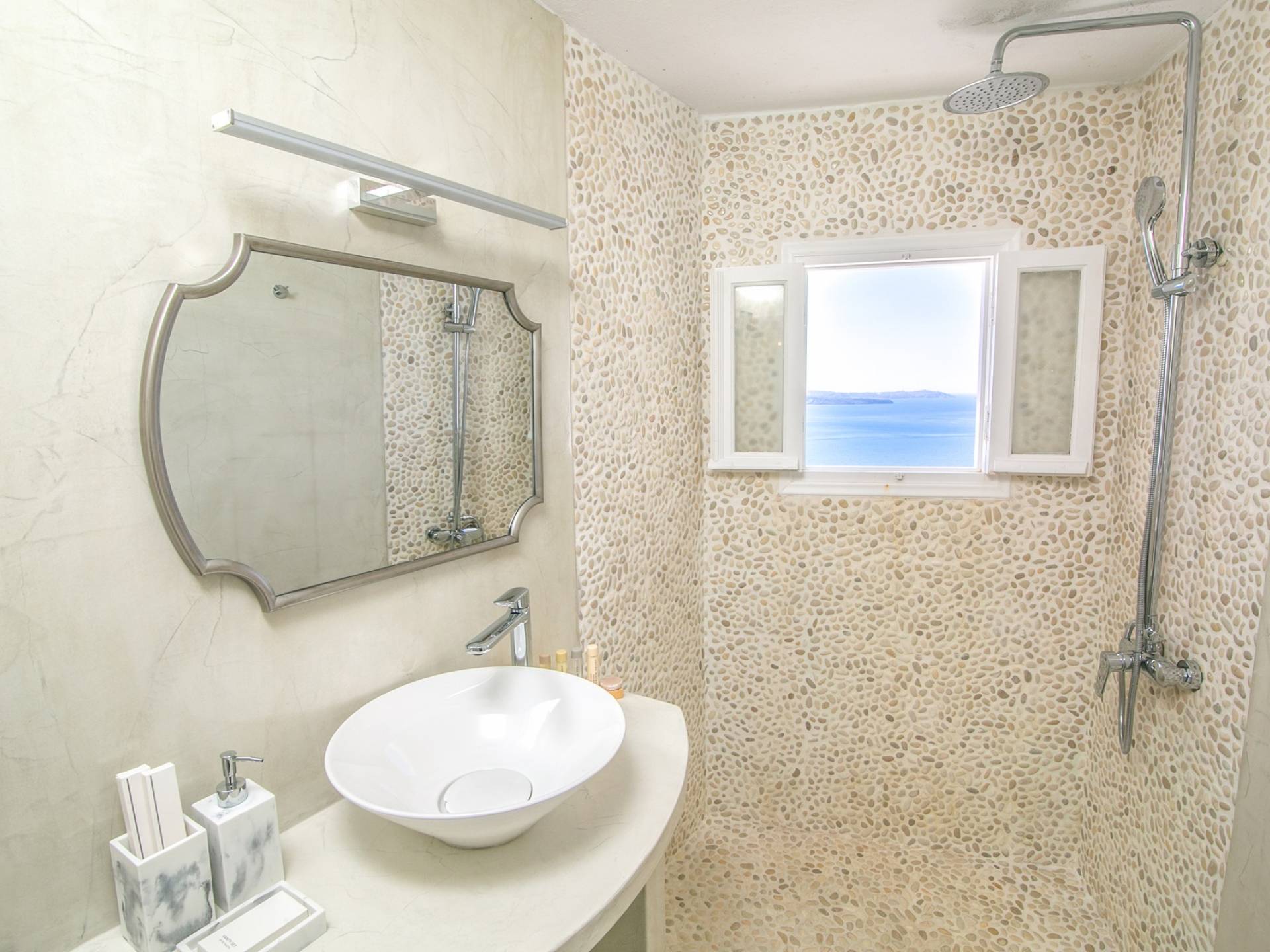 La villa dispone di un comodo letto queen size, aria condizionata, mini-frigo e macchina per caffè espresso, un bellissimo bagno con doccia, set di cortesia, pantofole, teli da bagno e da spiaggia, un salottino, TV satellitare a schermo piatto, Accesso Wi-Fi. La villa è convenientemente situata all'ingresso di Oia, vicino alla strada pedonale con tutti i ristoranti, le gallerie e i negozi.
