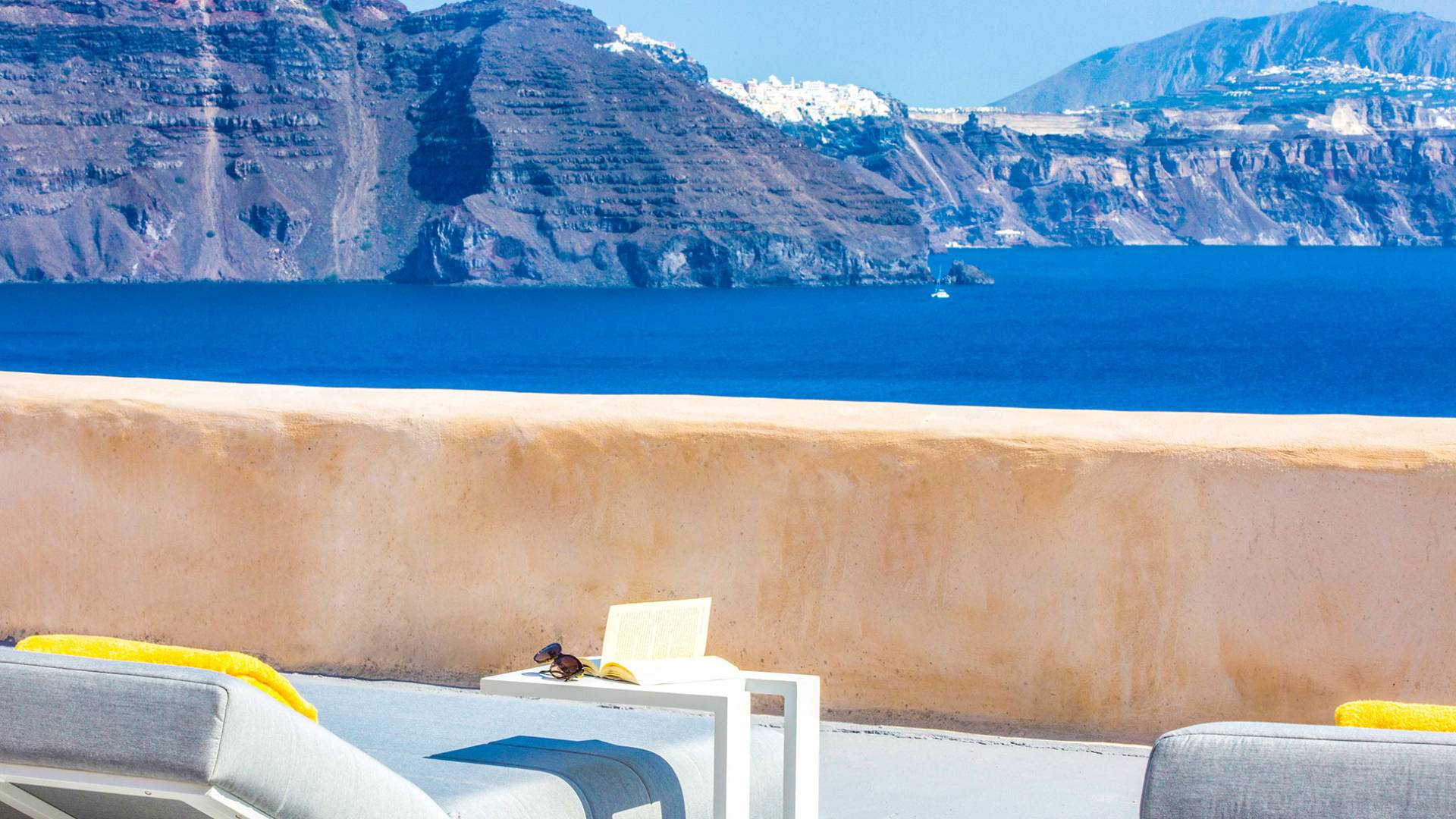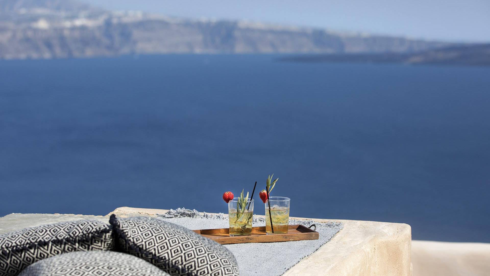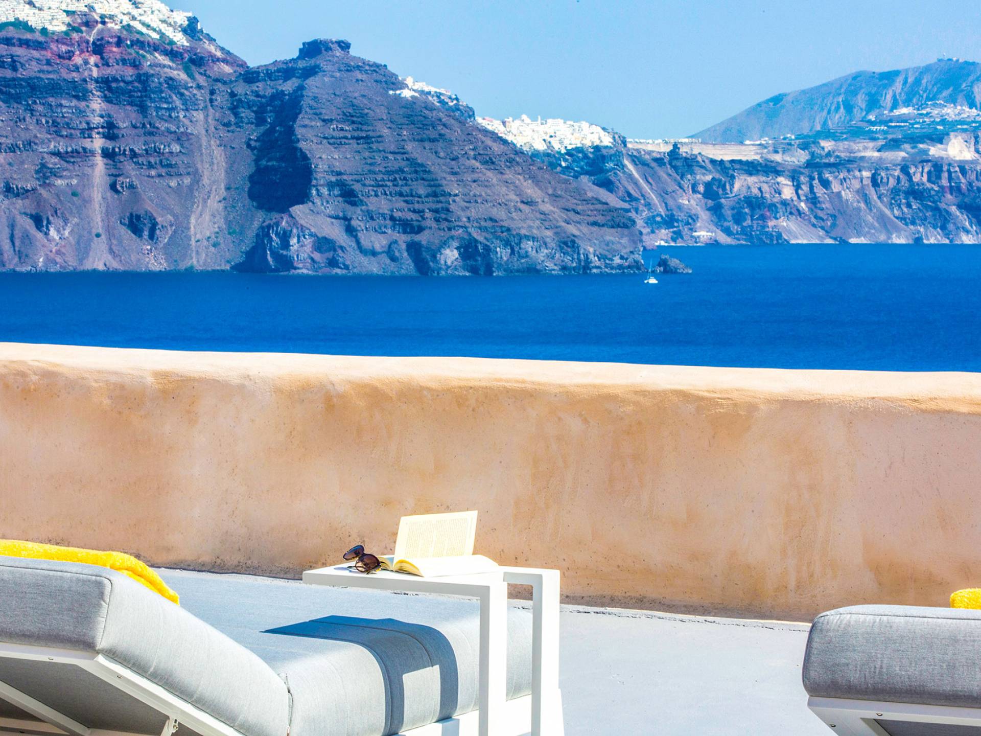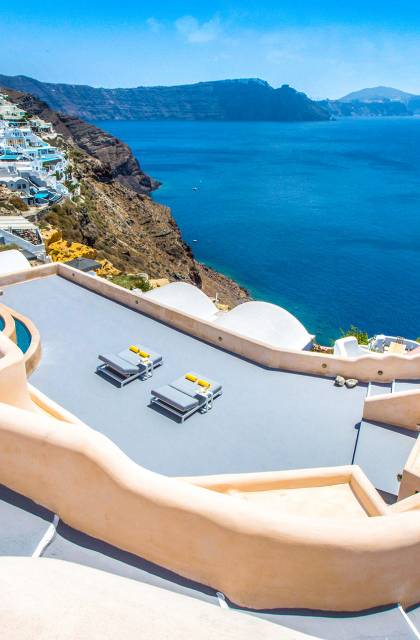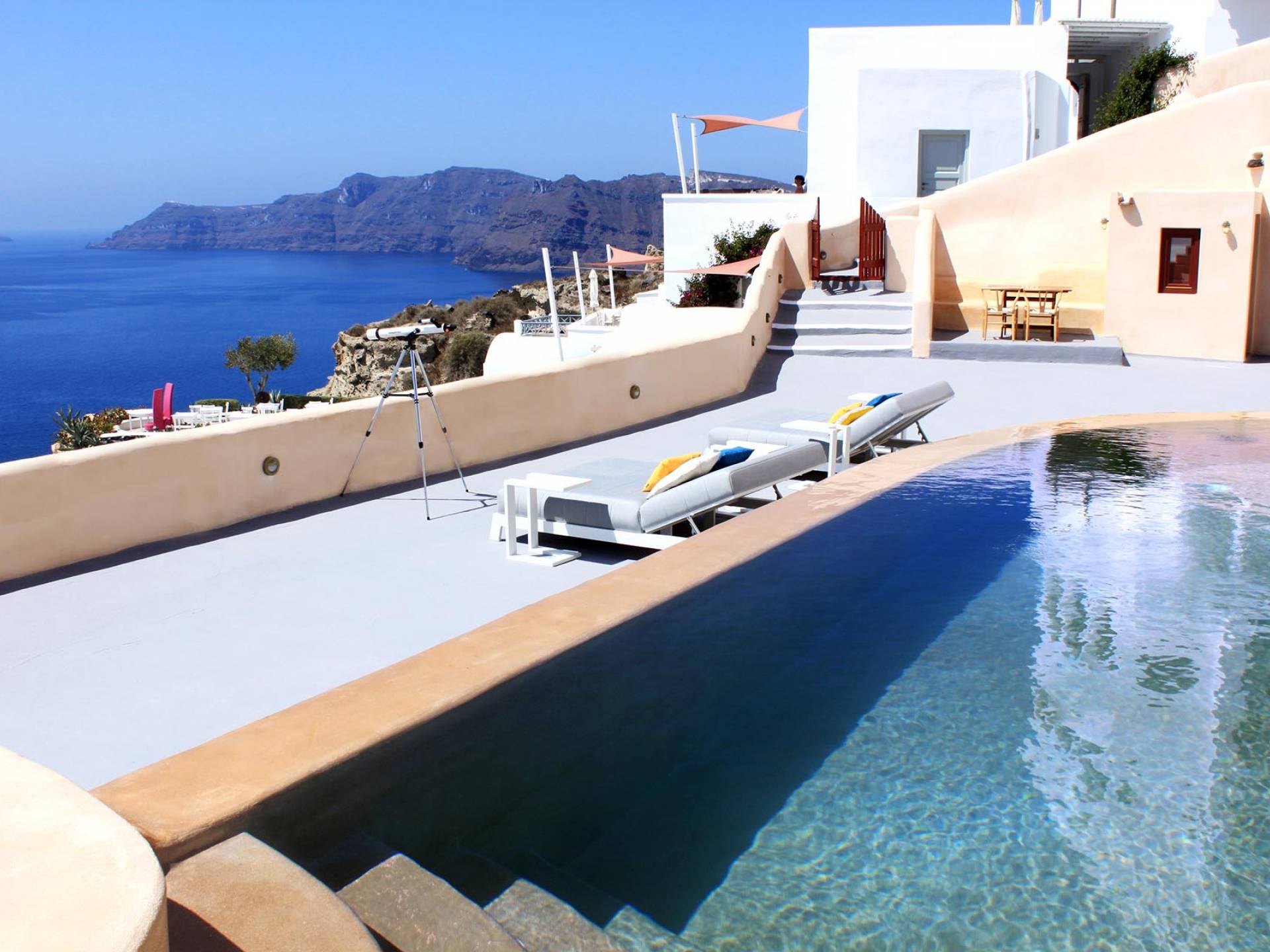Entrambe le suite condividono un'incredibile terrazza privata di 340 mq. e una piscina a sfioro di 70 mq con una vista mozzafiato sulla Caldera. Una bella cucina completamente attrezzata si trova a pochi passi da entrambe le suite. Che tu stia scaldando uno spuntino leggero, o preparando un pranzo o una cena semplice ed elegante (inoltre, lo chef può prepararlo per te, su richiesta), troverai tutto ciò di cui hai bisogno a portata di mano.
