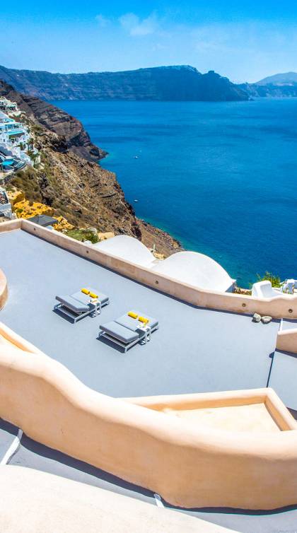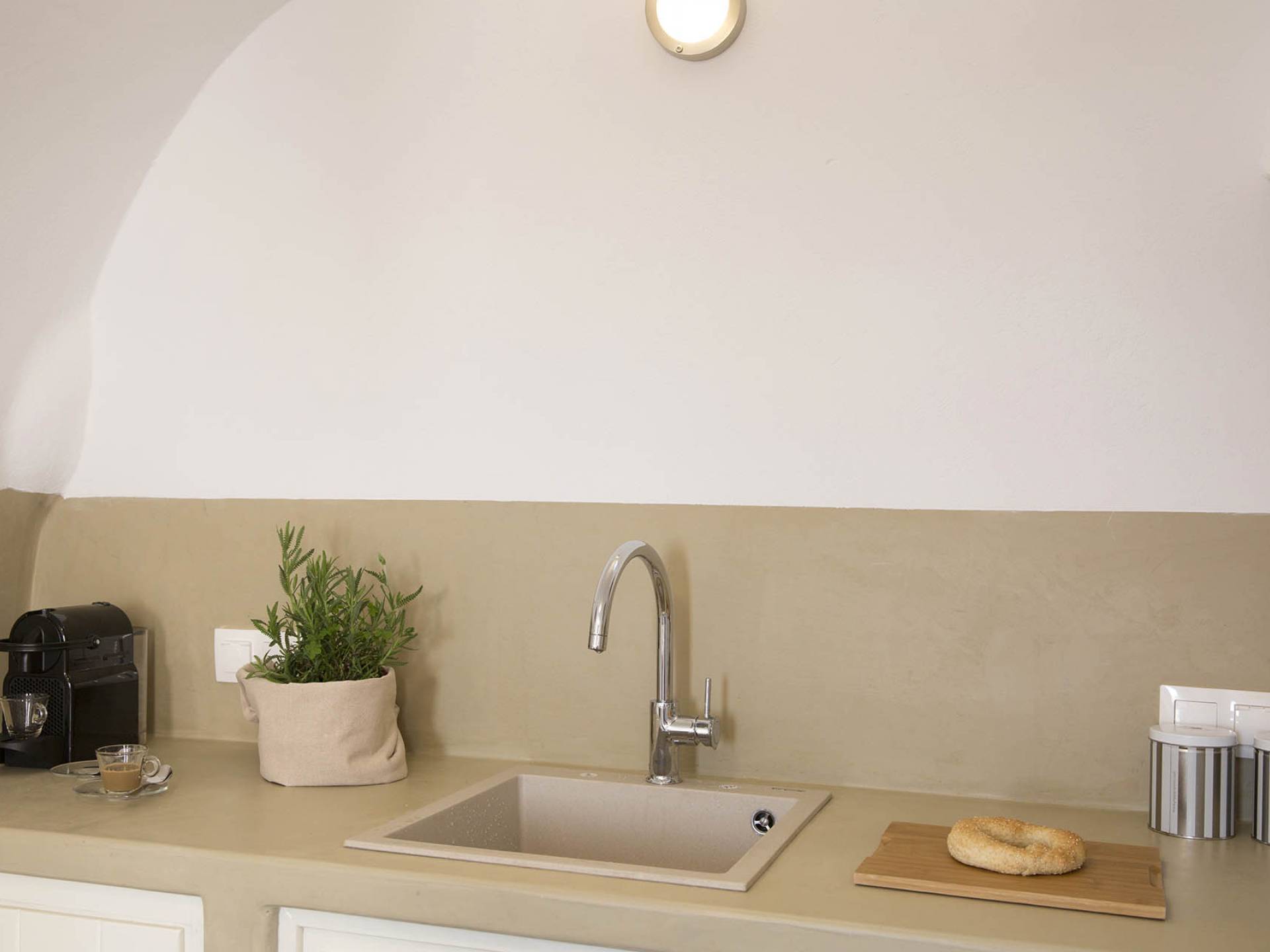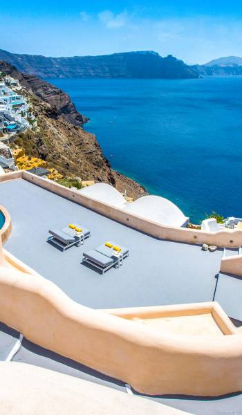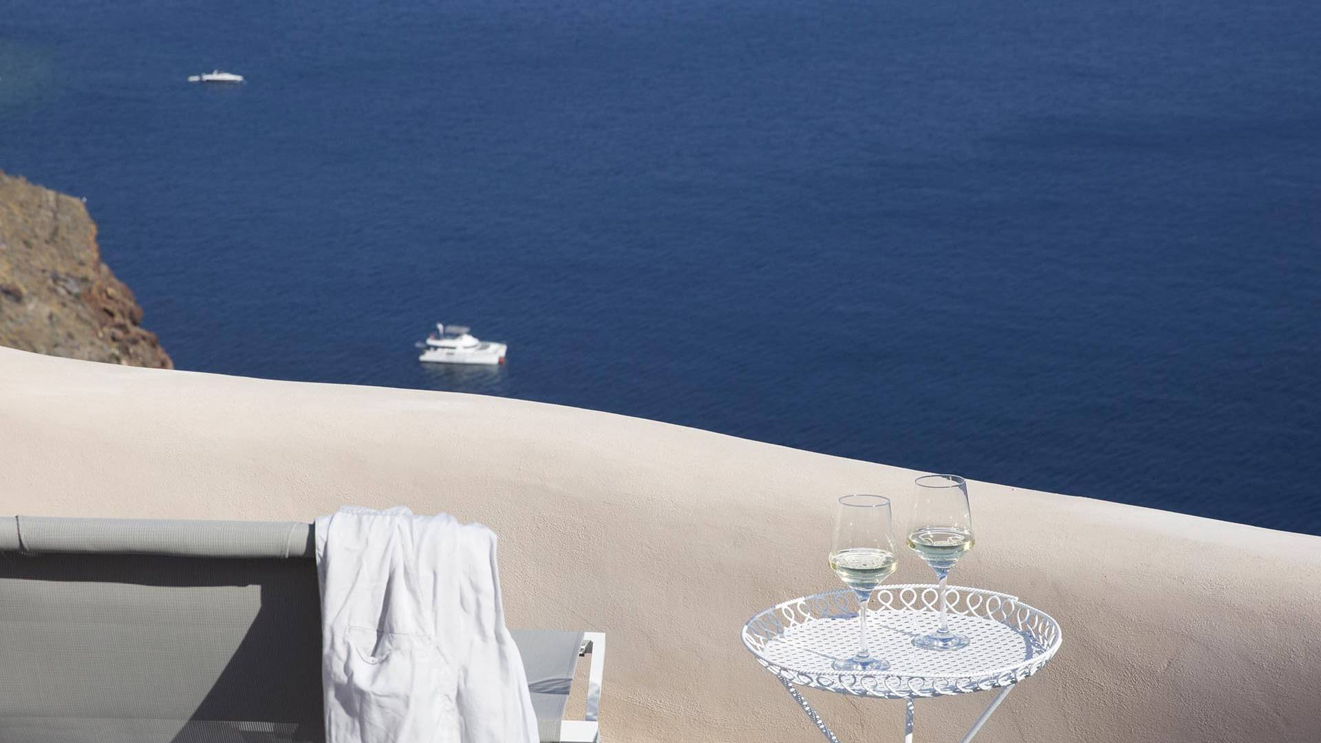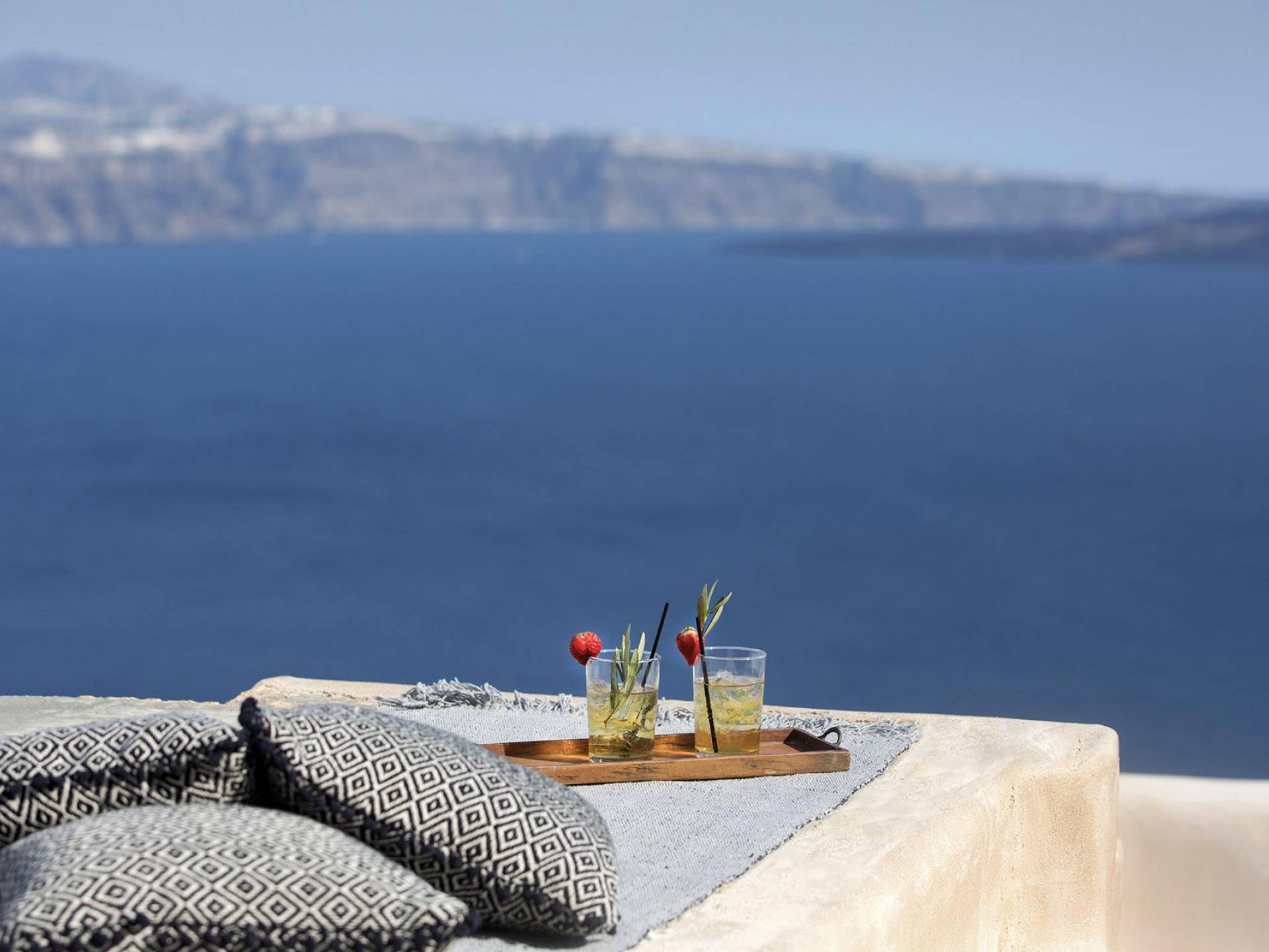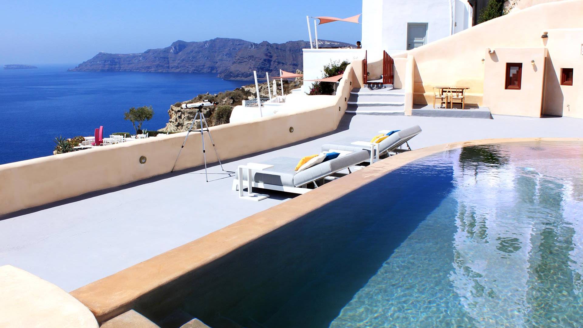Entrambe le suite condividono un'incredibile terrazza privata di 340 mq. e una piscina a sfioro di 70 mq con una vista mozzafiato sulla Caldera. Una bella cucina completamente attrezzata si trova a pochi passi da entrambe le suite. Che tu stia scaldando uno spuntino leggero, o preparando un pranzo o una cena semplice ed elegante (inoltre, lo chef può prepararlo per te, su richiesta), troverai tutto ciò di cui hai bisogno a portata di mano.