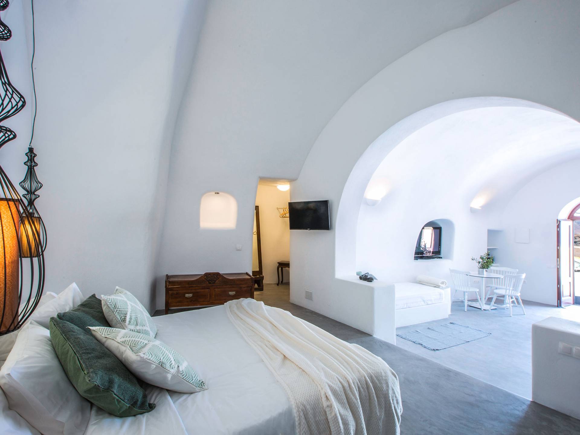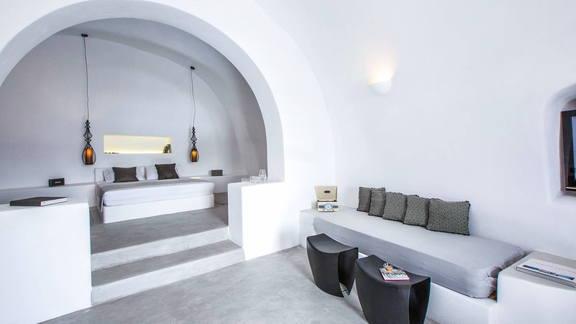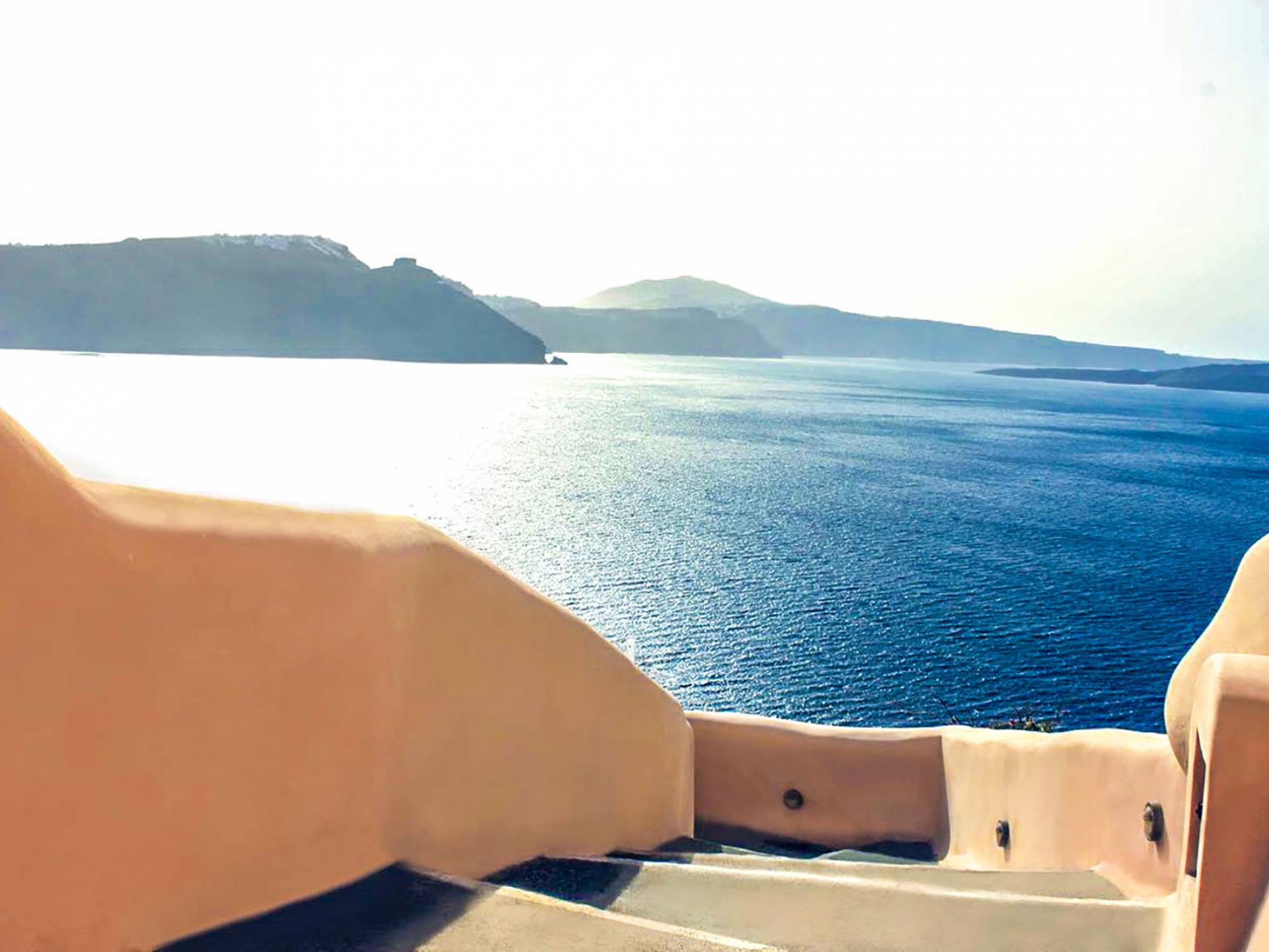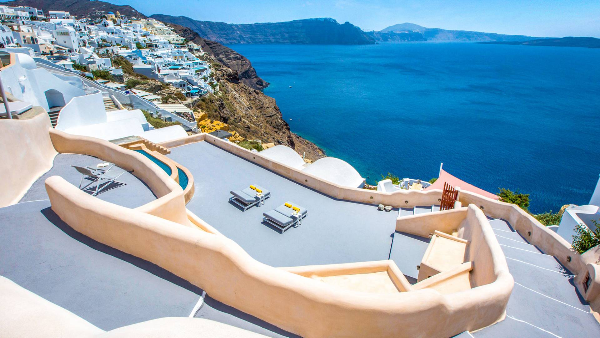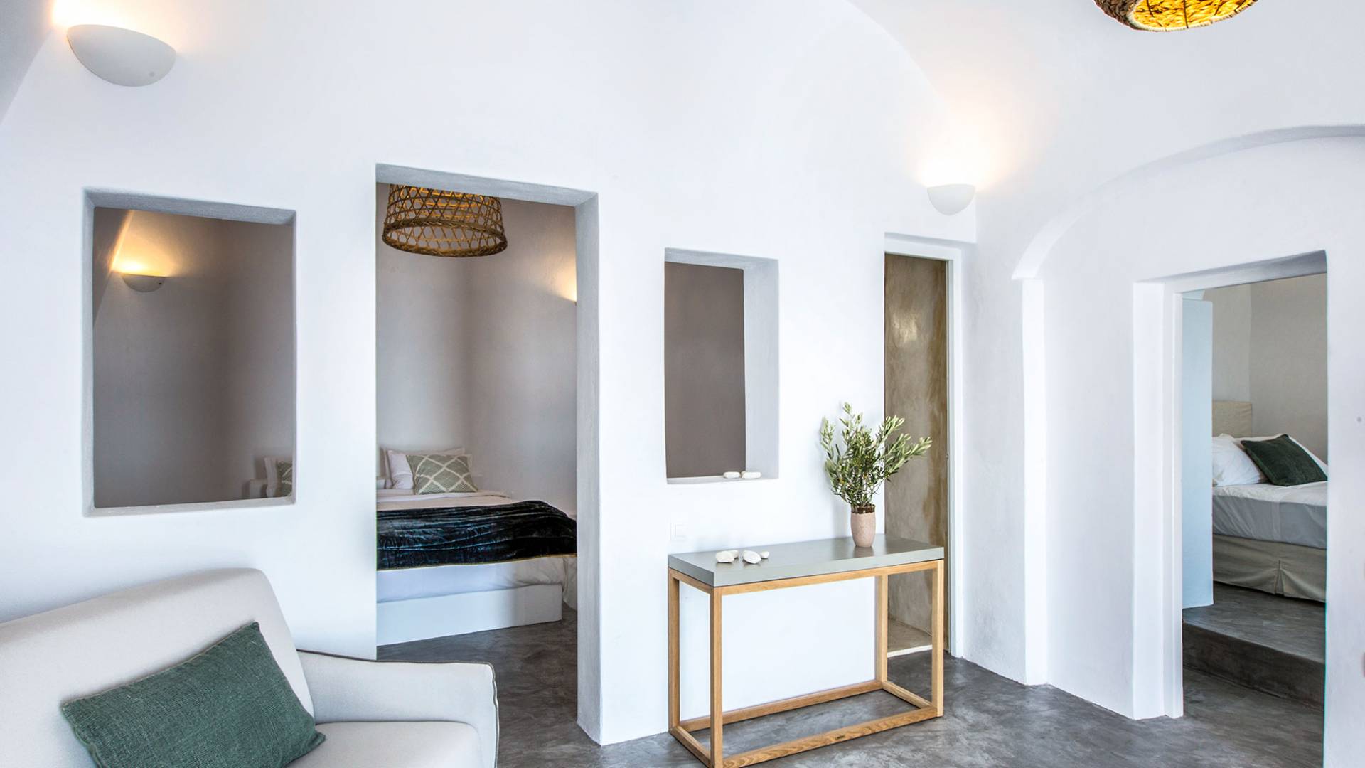 Entrambe le suite condividono un'incredibile terrazza privata di 340 mq. e una piscina a sfioro di 70 mq con una vista mozzafiato sulla Caldera. Una bella cucina completamente attrezzata si trova a pochi passi da entrambe le suite. Che tu stia scaldando uno spuntino leggero, o preparando un pranzo o una cena semplice ed elegante (inoltre, lo chef può prepararlo per te, su richiesta), troverai tutto ciò di cui hai bisogno a portata di mano.
