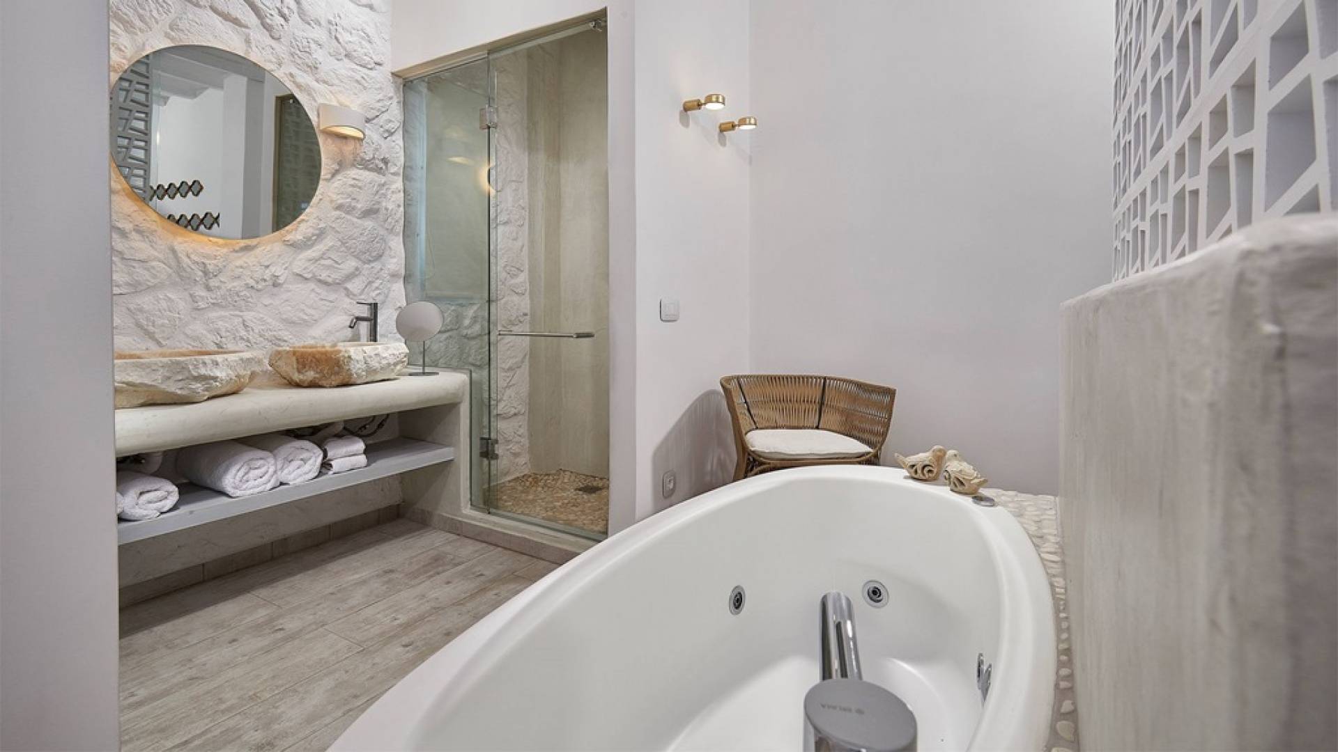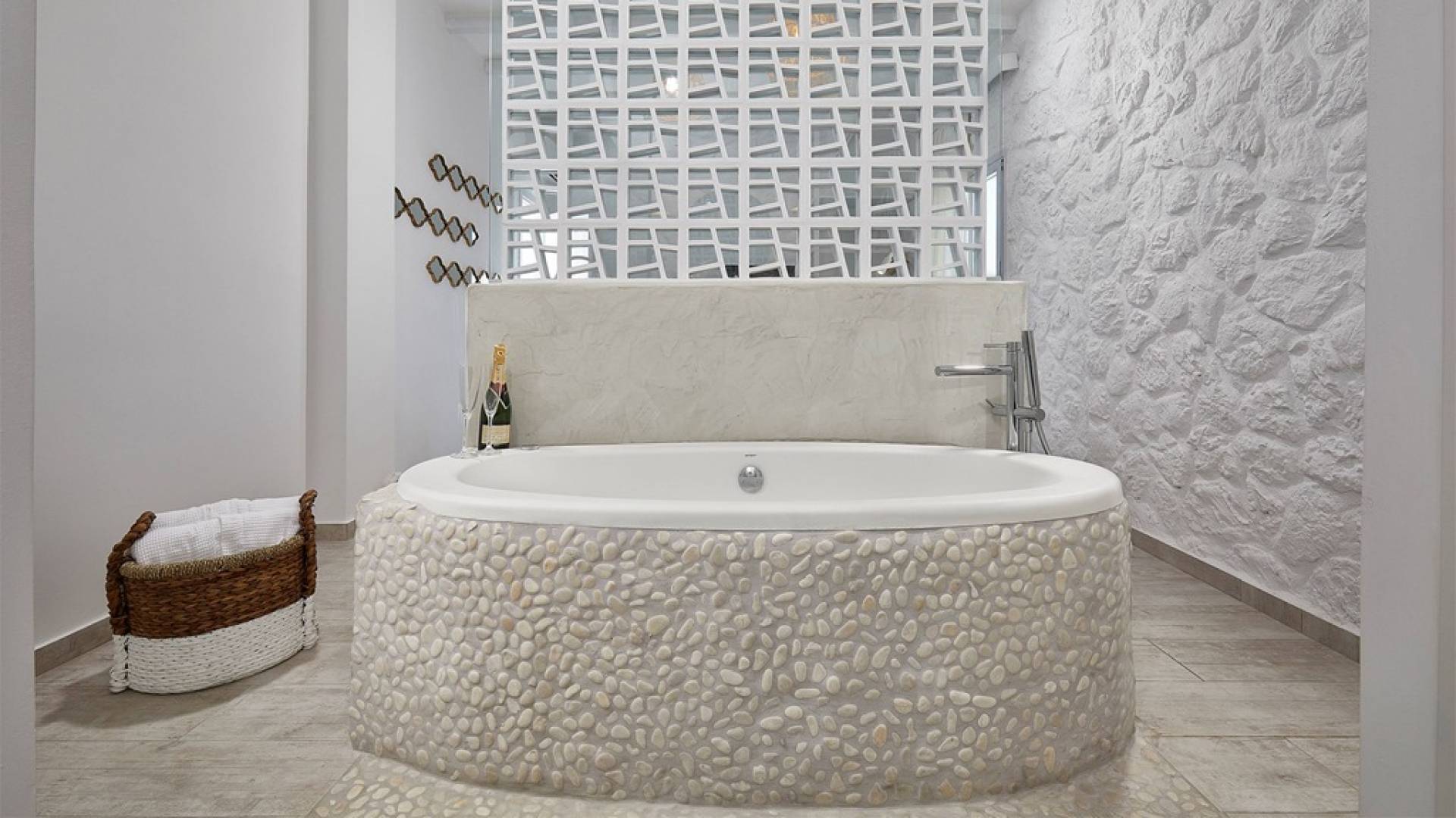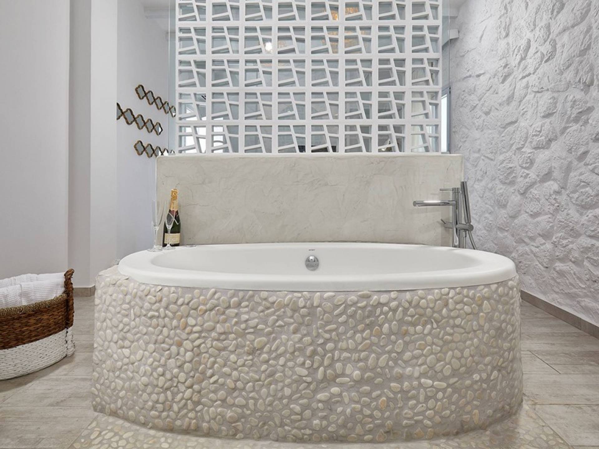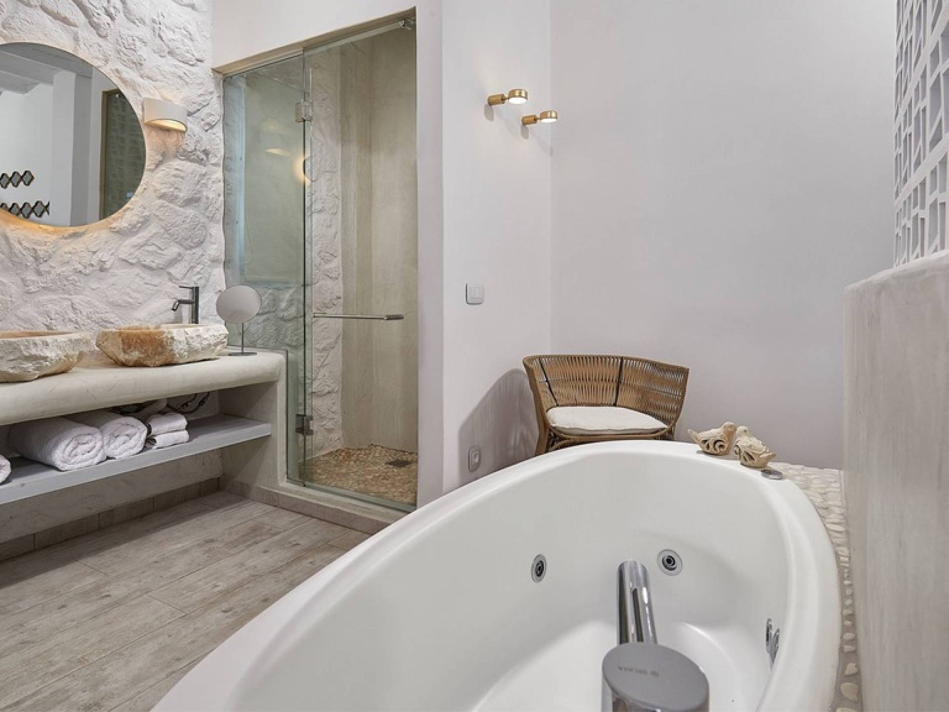 Superb Suite at Petri Suites Santorini è una suite di lusso in affitto con 1 camera da letto e vista sul mare. La Superb Suite at Petri Suites è l'unico tipo di suite che dispone di una vasca idromassaggio interna, è idealmente progettata per 2 persone che cercano un rifugio intimo a Santorini da chiamare proprio. Il balcone vista mare amplifica la sensazione di euforia che gli interni nutrono, e sarà il luogo in cui gli ospiti sceglieranno di rilassarsi e godersi momenti di relax con i colori del tramonto di Santorini che dipingono il cielo sullo sfondo.
