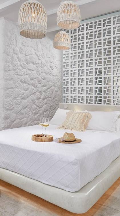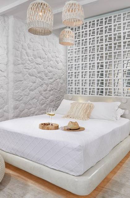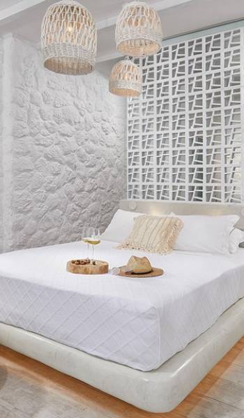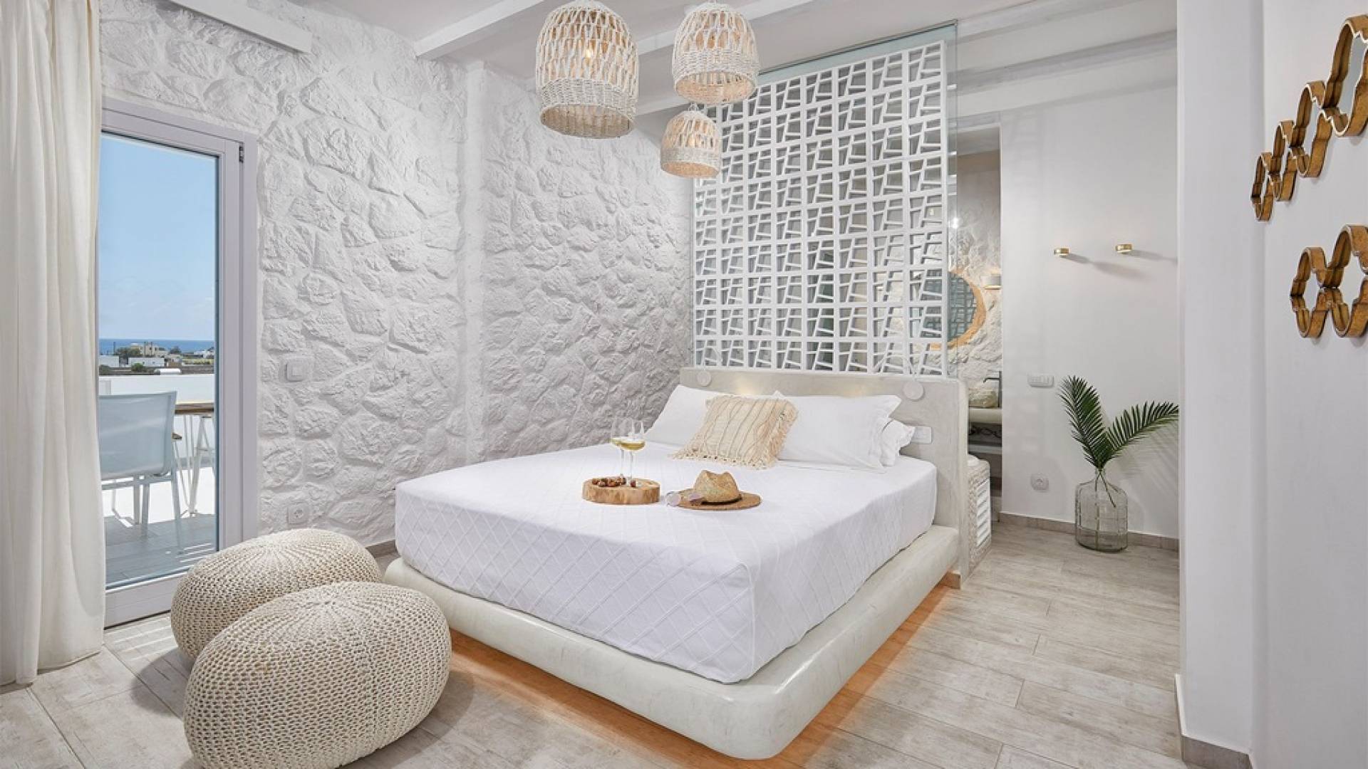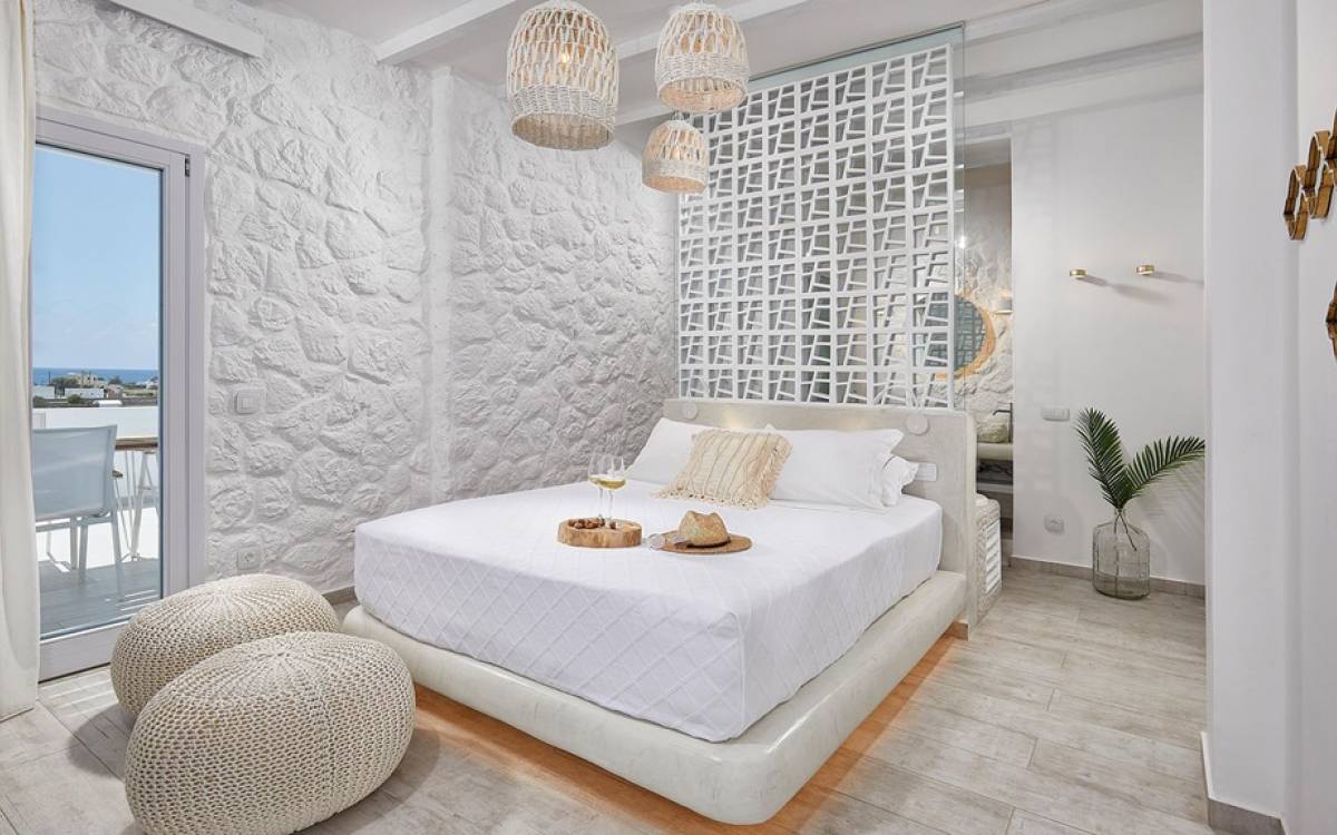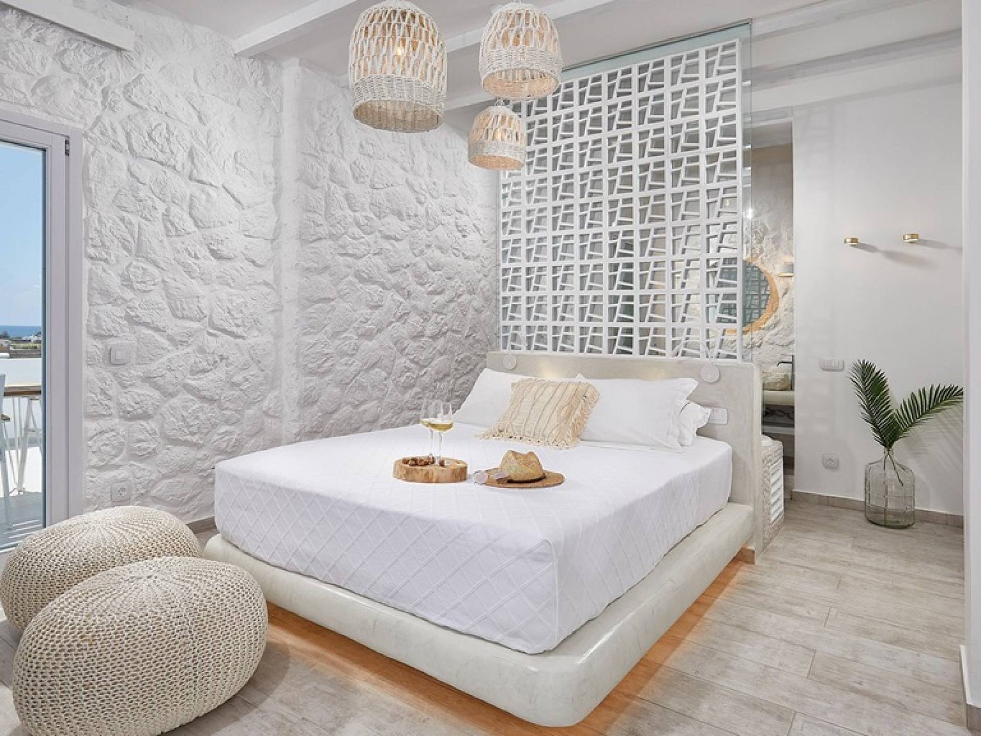 La superba suite del Petri Suites dispone di un letto matrimoniale extra-large con illuminazione nascosta, che migliora ulteriormente l'esperienza degli ospiti. Il sofisticato bagno dispone di una doccia oltre alla vasca idromassaggio e di due lavandini per quel tocco di lusso in più. La tavolozza dei colori bianca che prevale crea immediatamente un senso di calma, mentre l'arredamento è in linea con un design minimale, con elementi in paglia, pietra ed elementi in legno che si uniscono in un modo che trasuda raffinatezza.