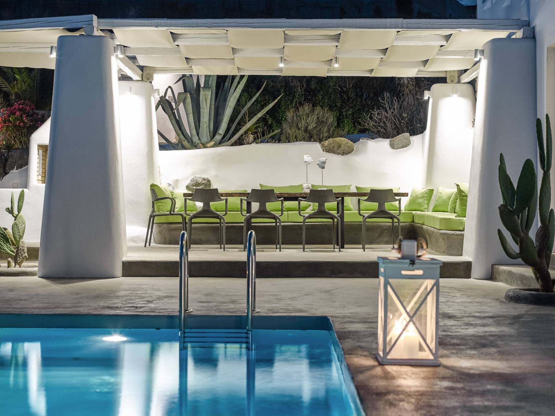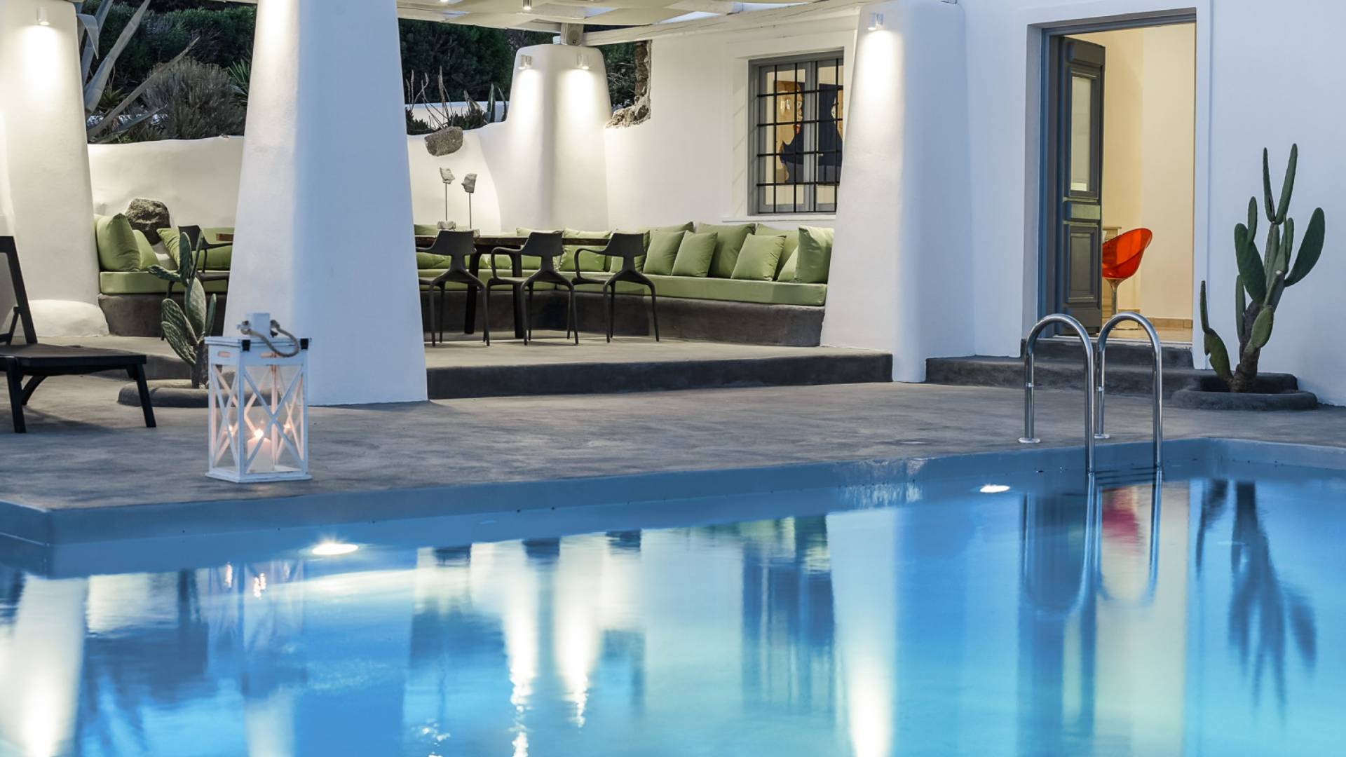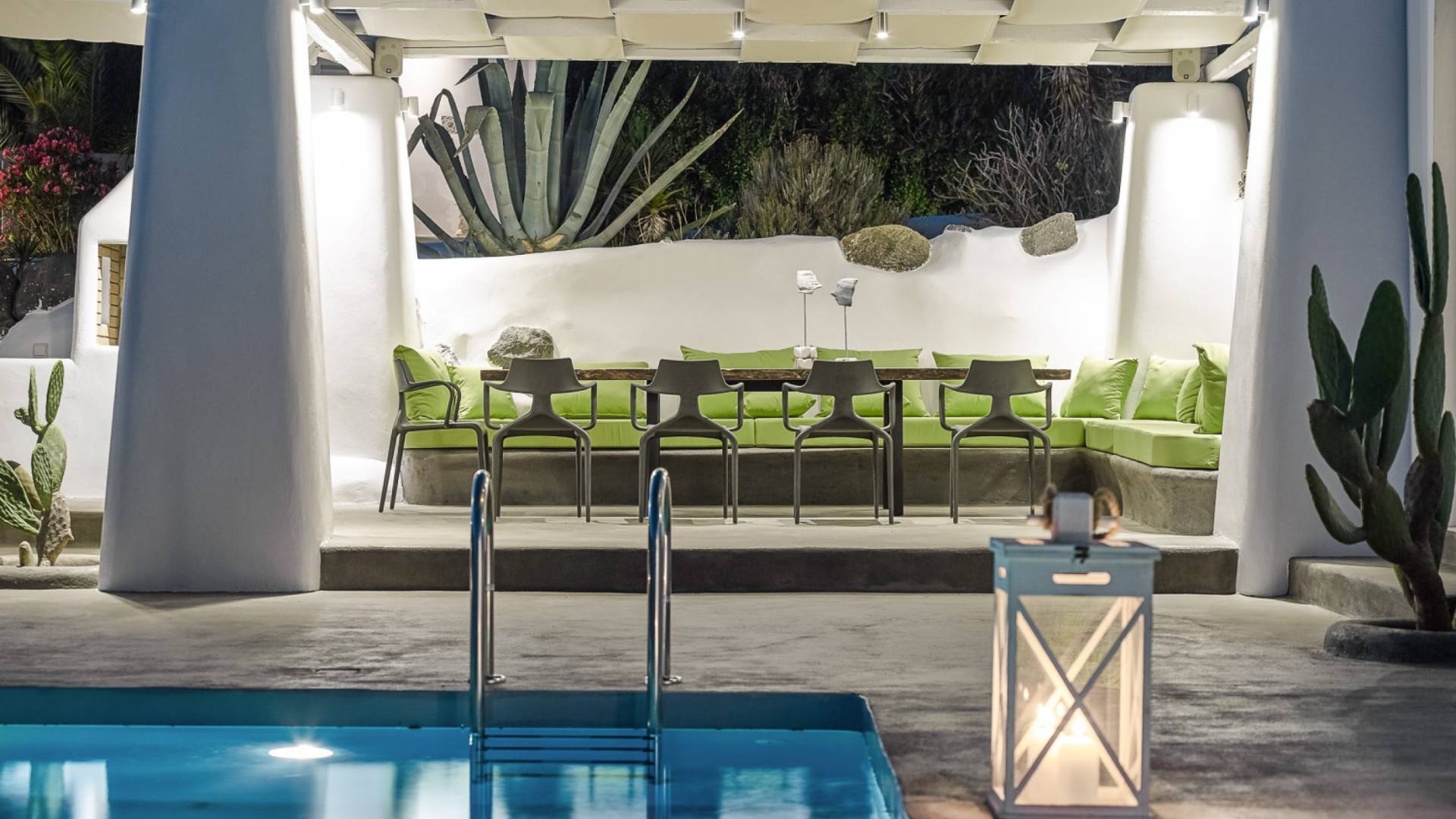 Elegantemente progettata e immersa nella brillante luce delle Cicladi, la tenuta è abbastanza spaziosa da ospitare fino a 14 ospiti nei suoi locali. La villa dispone di un ingresso indipendente su tutti e tre i livelli per garantire la massima privacy e tutti i comfort della casa per soddisfare le esigenze di ogni ospite. Le piscine private e le aree salotto all'aperto offrono viste suggestive sull'isola e sul blu del Mar Egeo.