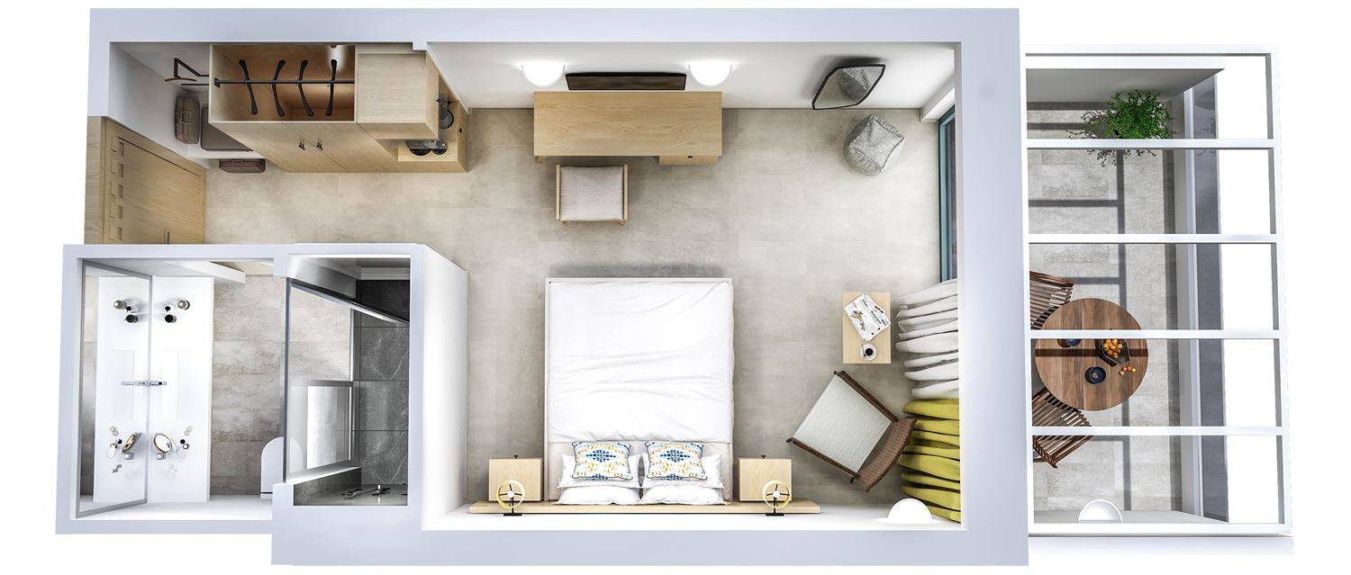 Con un balcone che riporta alla mente ricordi con scene dei bei film greci degli anni '60 e una vista mozzafiato ma tranquilla e rilassante, la camera doppia deluxe è stata progettata per 2 adulti. Motivi decorativi selezionati per abbinare lo stile elegante e semplice del design degli interni dell'hotel si fondono armoniosamente con i servizi generosi e le strutture eleganti. Comodamente spazioso, con vista anche dall'interno, un bagno che riflette purezza e luce nel design e nei materiali, dettagli nei servizi e comfort di lusso. Un luogo per i ricordi di una vita.