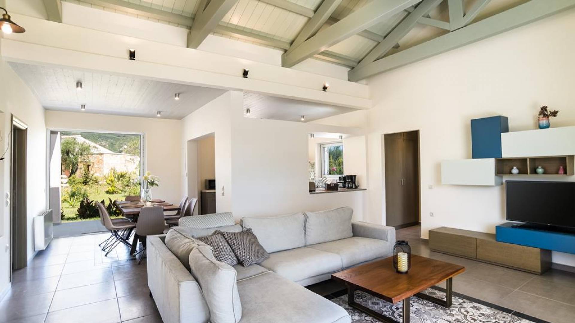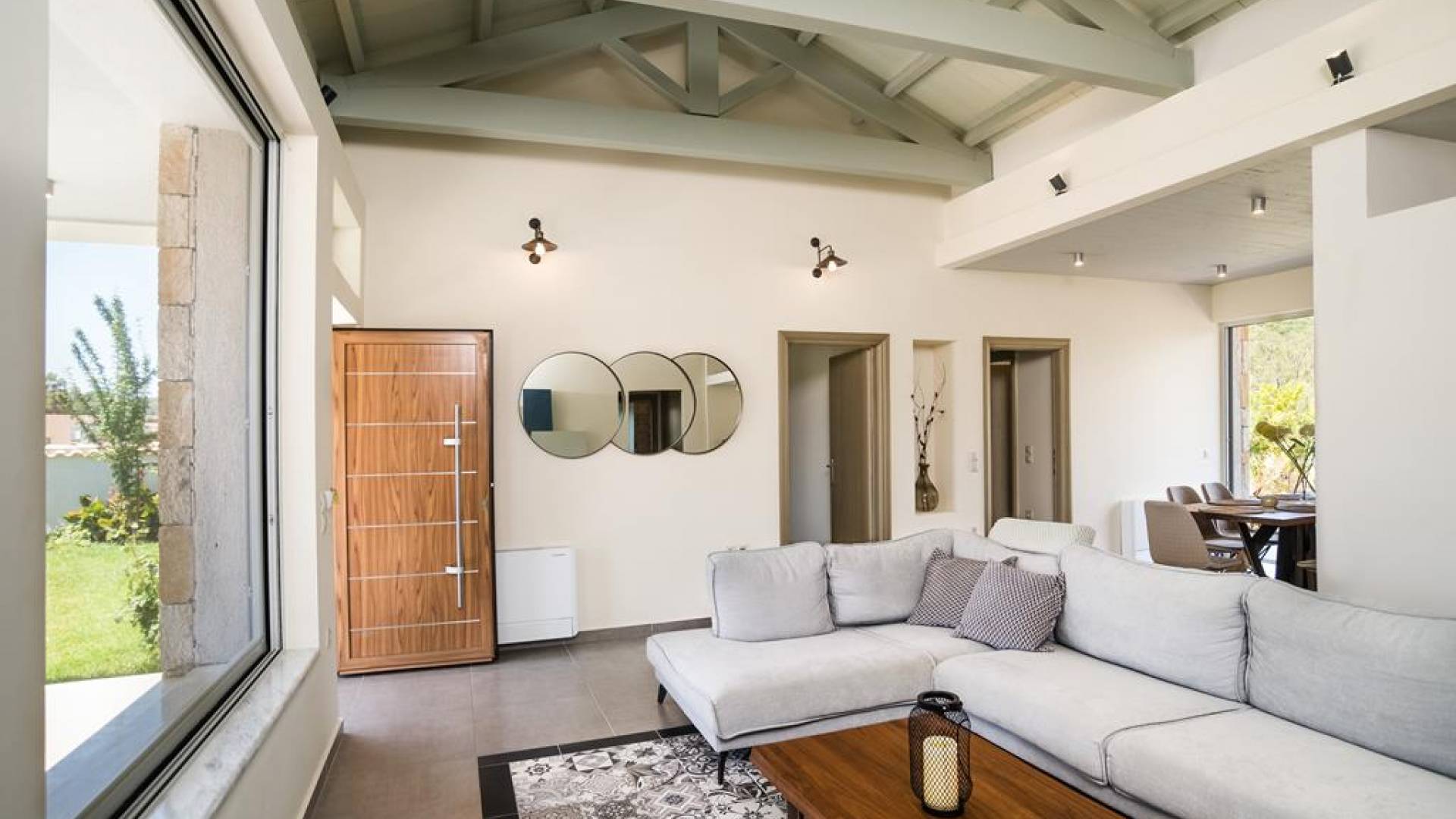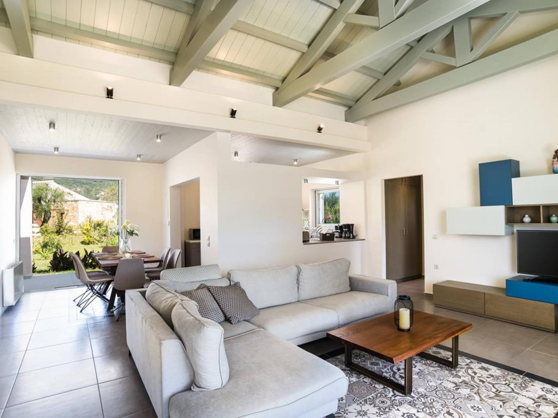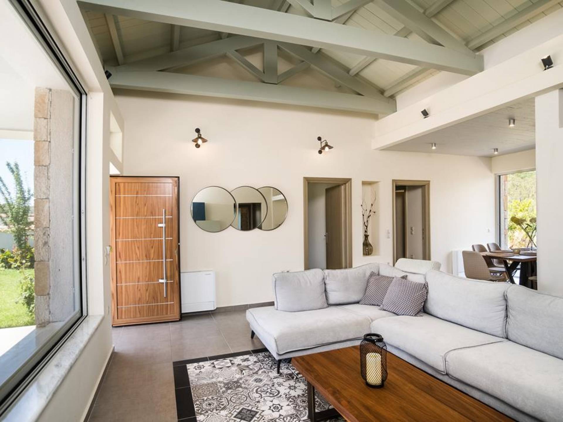 Villa Erotas Corfù offre una cucina completamente attrezzata, una sala da pranzo, un bagno extra e un soggiorno spazioso e moderno con un divano che può essere facilmente trasformato in un comodo letto singolo. La particolarità di Villa Erotas Corfù è il tetto con travi in legno a vista nel soggiorno, che si accostano ai toni del bianco e del grigio e creano una lussuosa atmosfera di relax e serenità. Dal soggiorno si accede direttamente ad una grande terrazza, dove potrete gustare la vostra colazione o un drink rinfrescante davanti al giardino e alla piscina. Tutte le camere offrono Smart TV da 32 pollici, mentre il soggiorno Smart TV da 43 pollici. Canali satellitari, connessione Wi-Fi gratuita, riscaldamento e aria condizionata sono disponibili in tutte le aree.