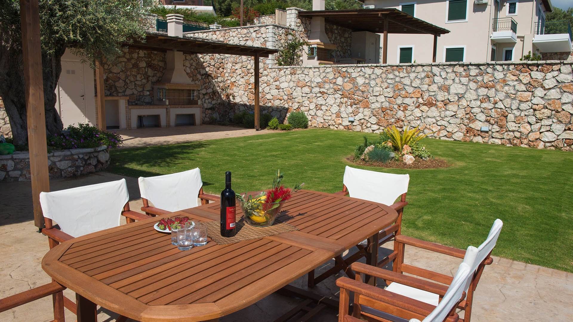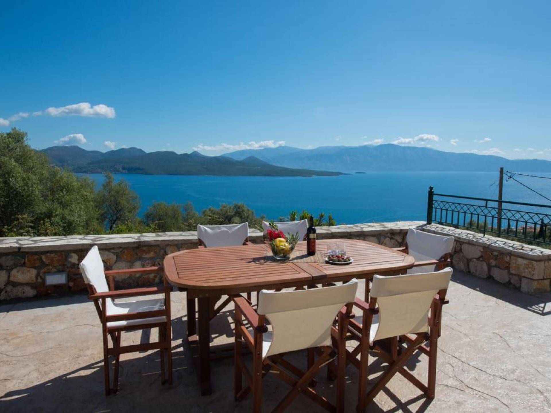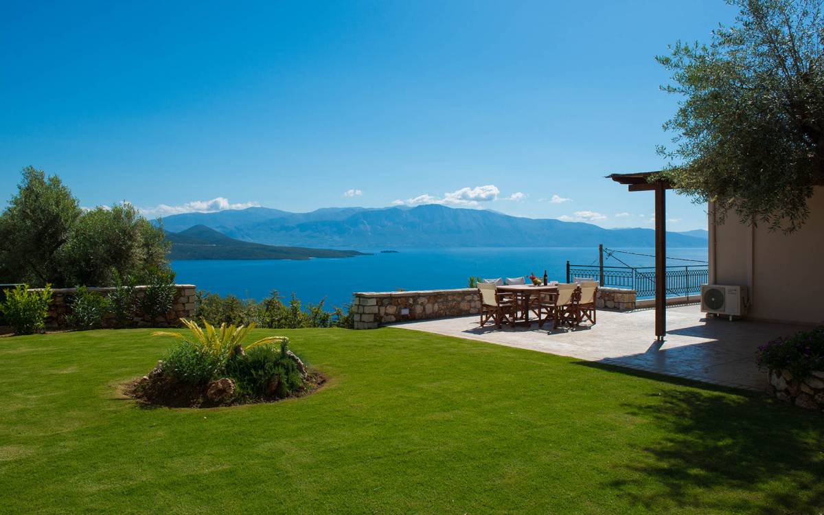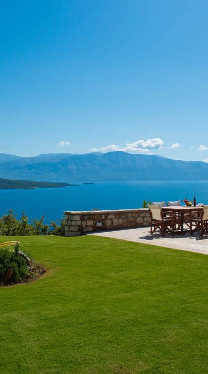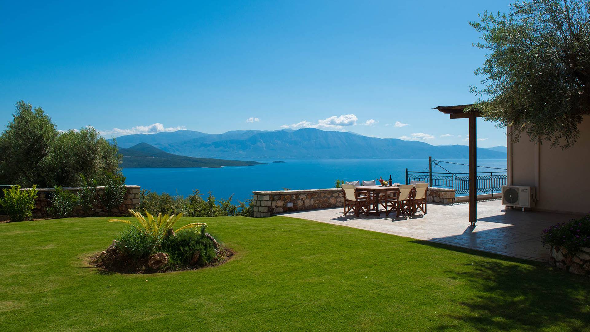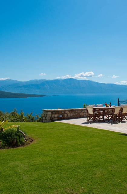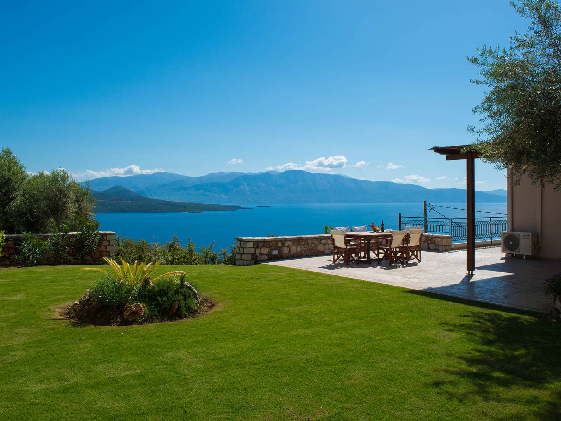 Esternamente, la villa è circondata da un curatissimo giardino e da ampi terrazzi e offre una vista spettacolare da ogni punto. Gli ospiti possono godere dello scenario montano mozzafiato e delle acque cristalline del Mar Ionio. Per i residenti che amano cucinare all'aperto, c'è una tradizionale area barbecue. C'è anche un parcheggio privato recintato per due auto