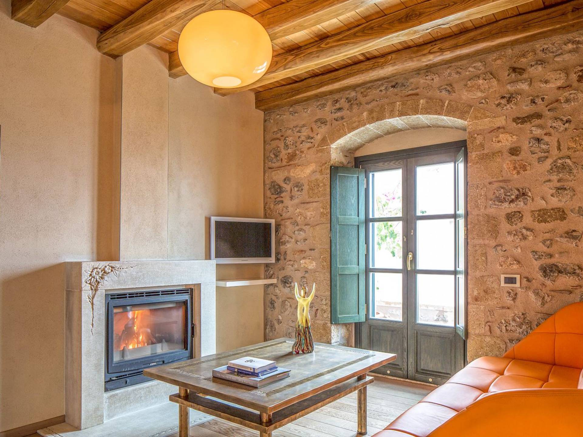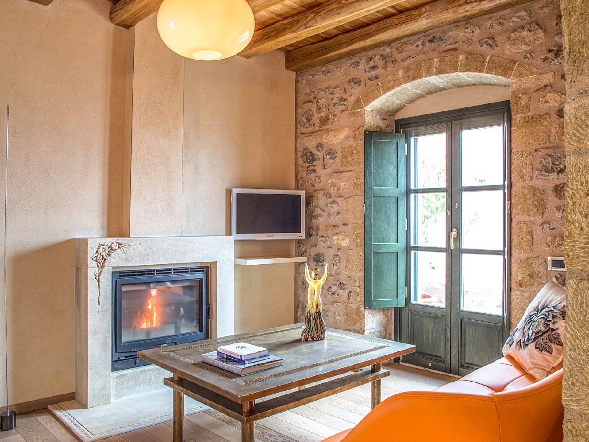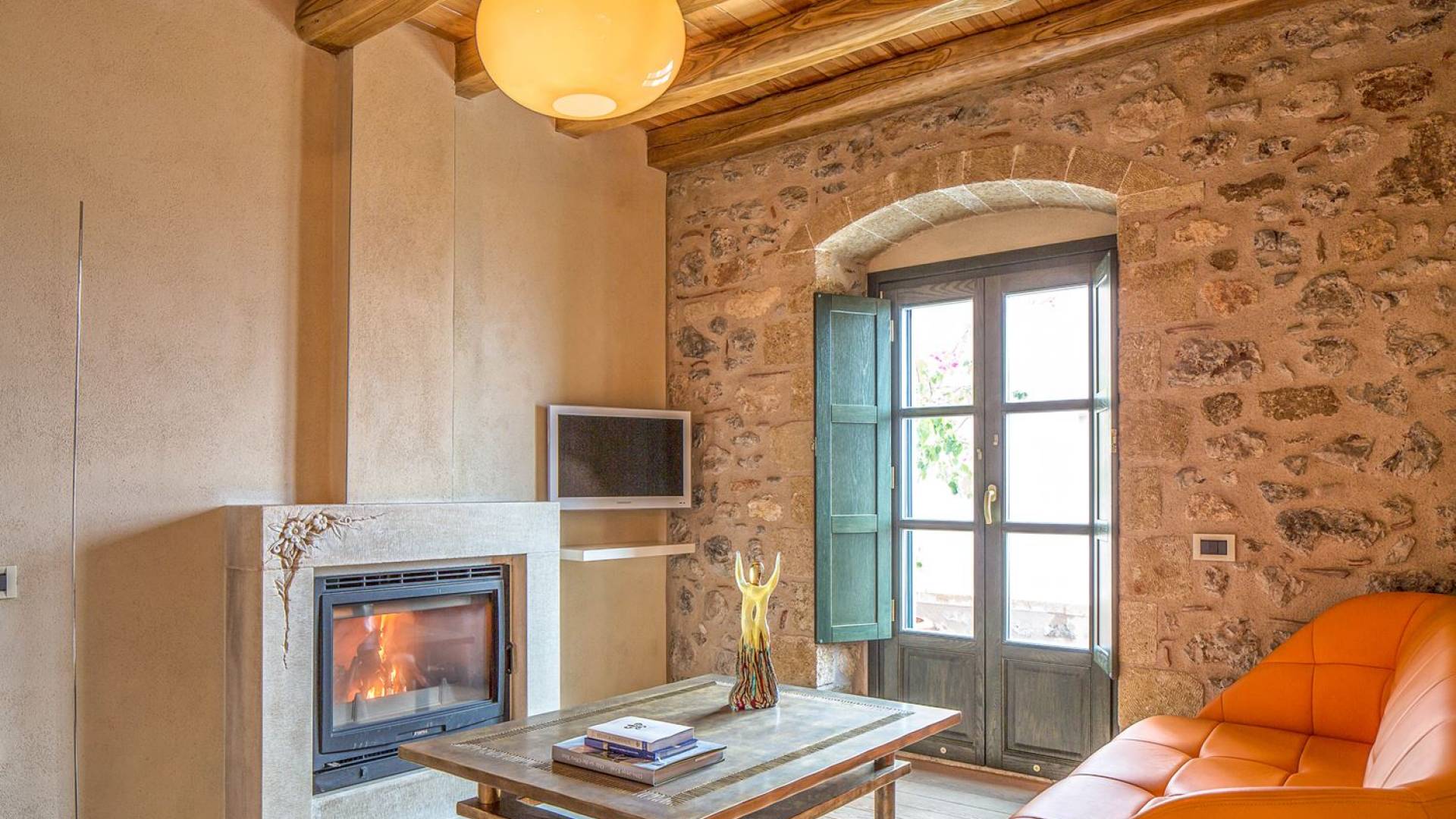 La Moni Emvasis Suite mette in scena un'atmosfera decisamente medievale. La camera da letto si trova in una spaziosa stanza illuminata dal sole con volta in pietra completa di mobili antichi e illuminazione di design italiano "Artemide", tutte circondate da una splendida muratura in pietra, seconda a nessuno. Il soggiorno separato è dotato di un design moderno unico di "Frau Poltrone" e di un accogliente caminetto in marmo. Un bagno spazioso e imponente dove puoi goderti una doccia "amazzonica", completa di cromoterapia e getti doccia Jacuzzi, non farà che aumentare la tua gioia generale. Concludi la giornata con un long drink sul tuo balcone privato e assapora le lunghe serate estive e le infinite viste sul mare.