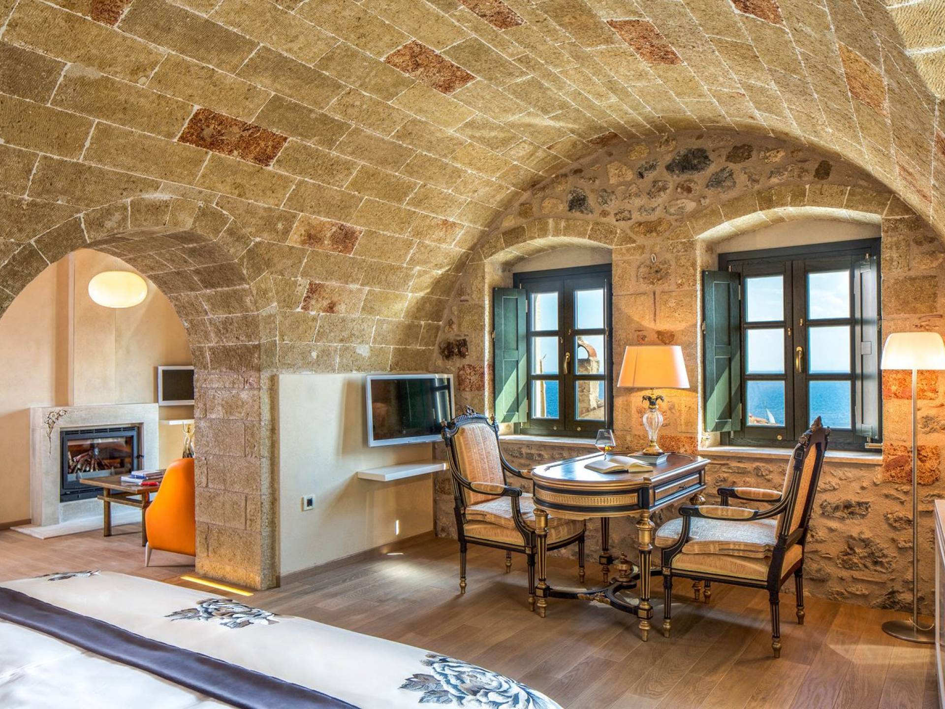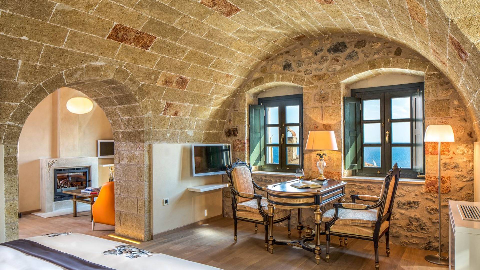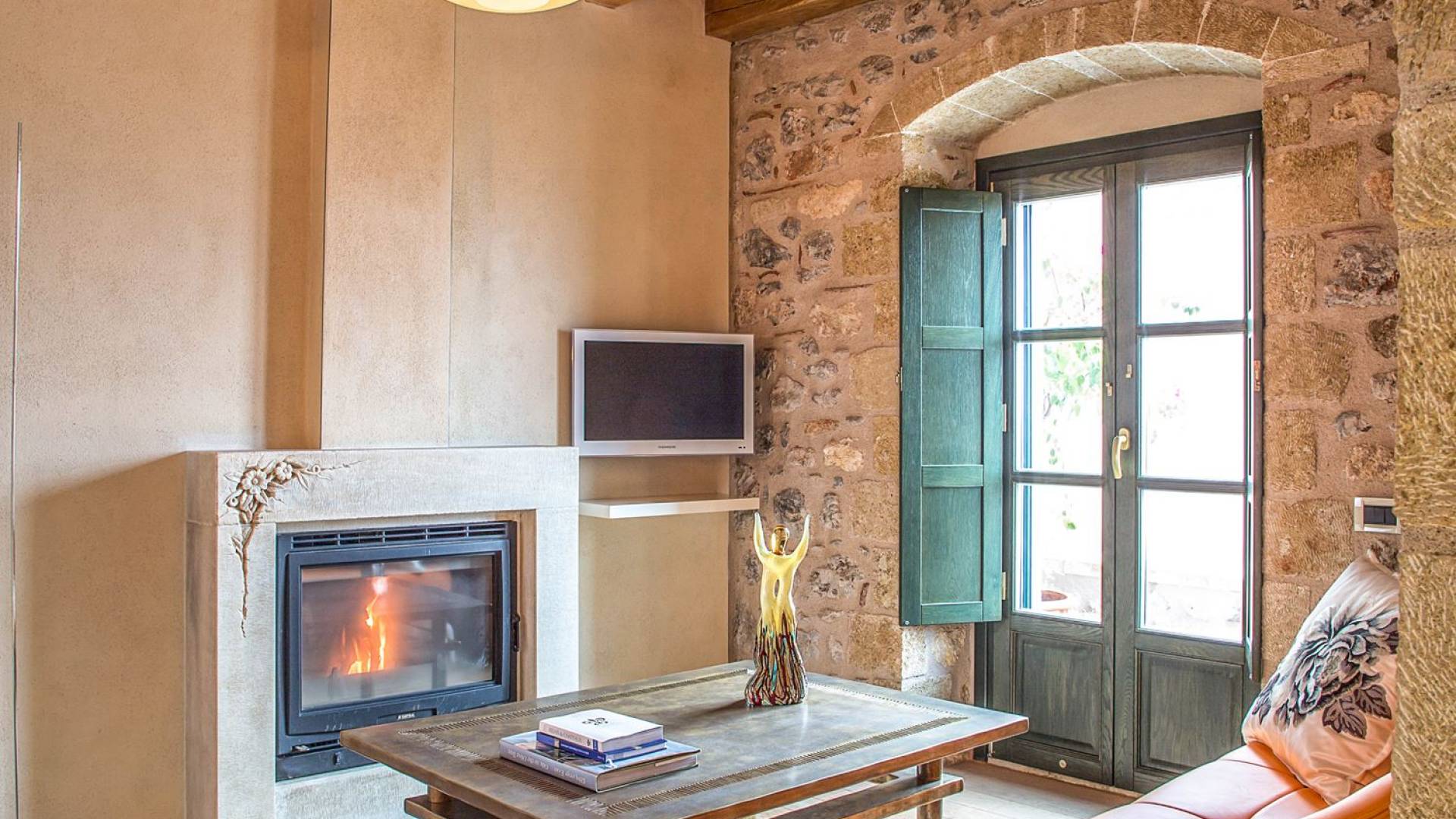 La Moni Emvasis Suite mette in scena un'atmosfera decisamente medievale. La camera da letto si trova in una spaziosa stanza illuminata dal sole con volta in pietra completa di mobili antichi e illuminazione di design italiano "Artemide", tutte circondate da una splendida muratura in pietra, seconda a nessuno. Il soggiorno separato è dotato di un design moderno unico di "Frau Poltrone" e di un accogliente caminetto in marmo. Un bagno spazioso e imponente dove puoi goderti una doccia "amazzonica", completa di cromoterapia e getti doccia Jacuzzi, non farà che aumentare la tua gioia generale. Concludi la giornata con un long drink sul tuo balcone privato e assapora le lunghe serate estive e le infinite viste sul mare.