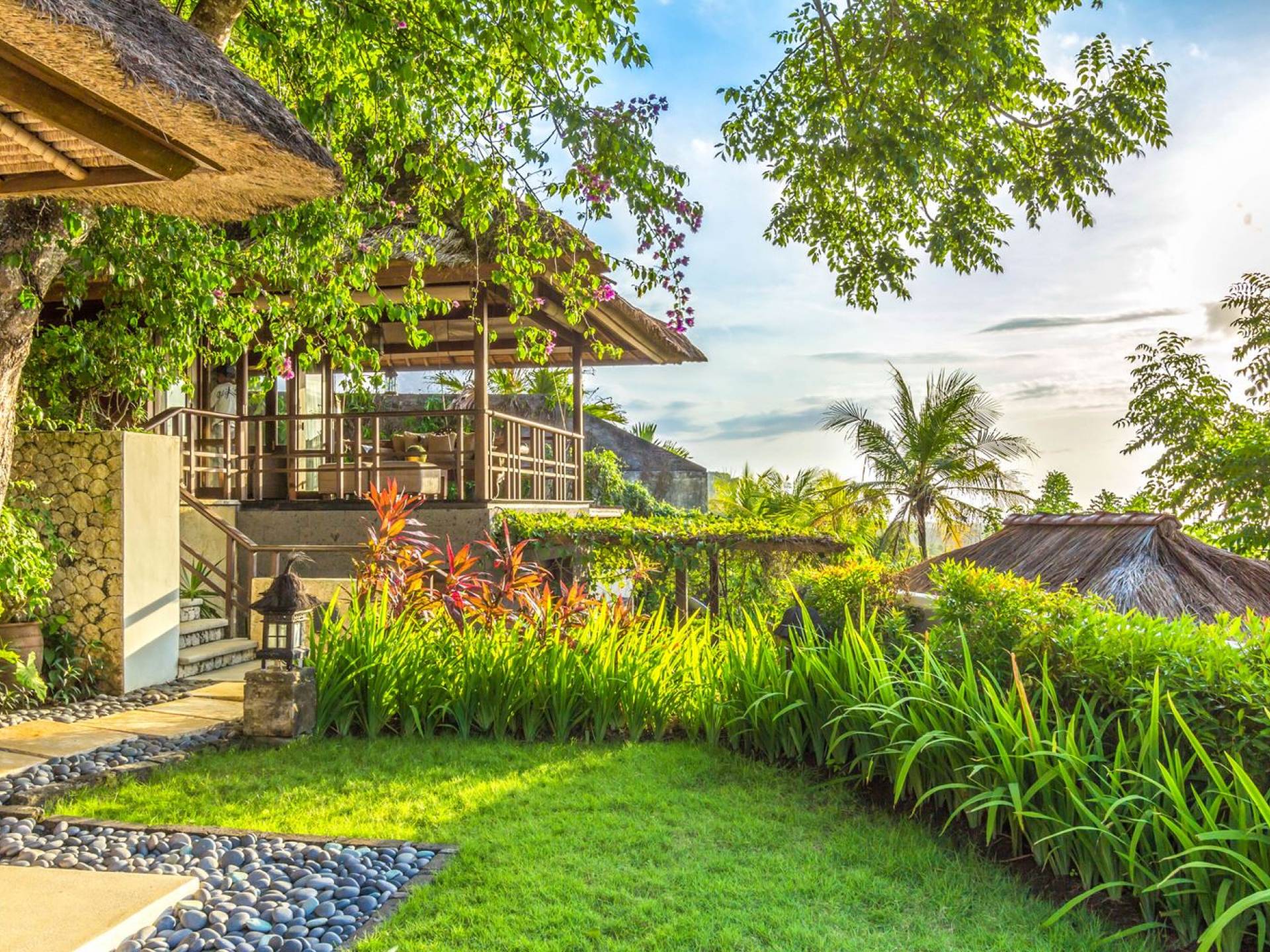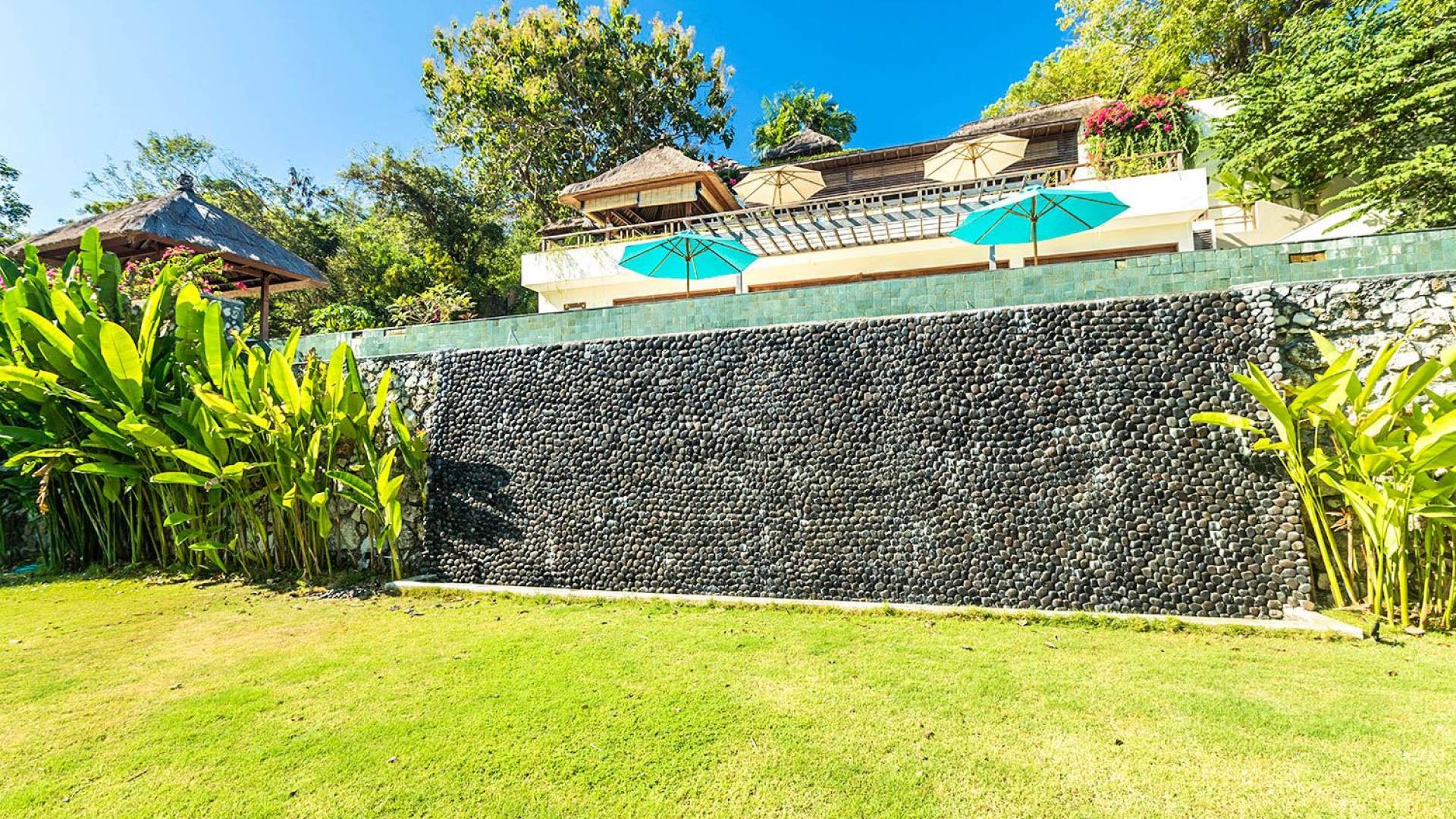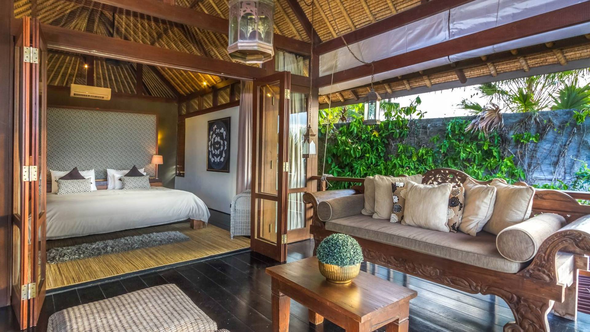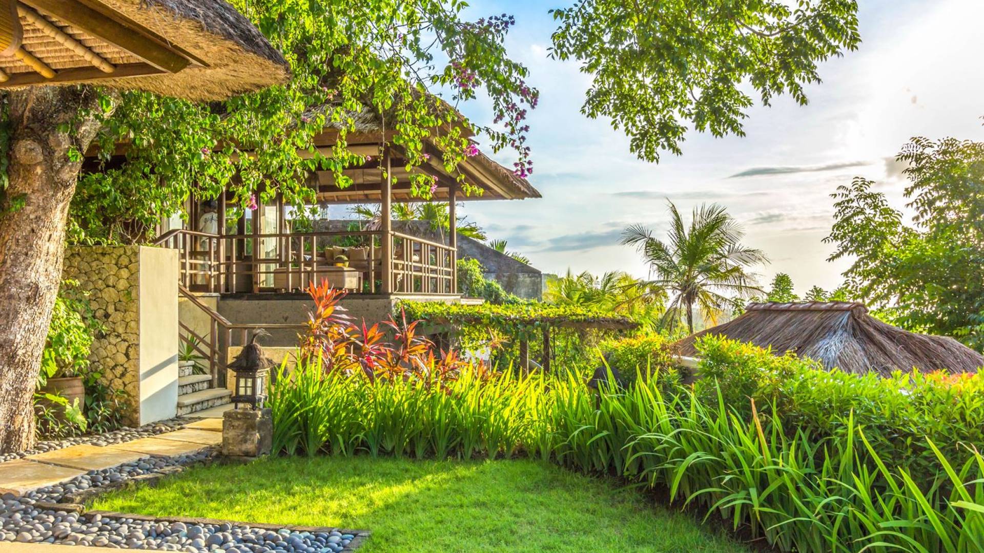 Le superfici della cucina rivestite in granito, i sanitari del bagno in acciaio inossidabile e l'illuminazione a incasso si fondono perfettamente con la pietra palimanan locale, le porte in legno finemente intagliate e i templi balinesi.
