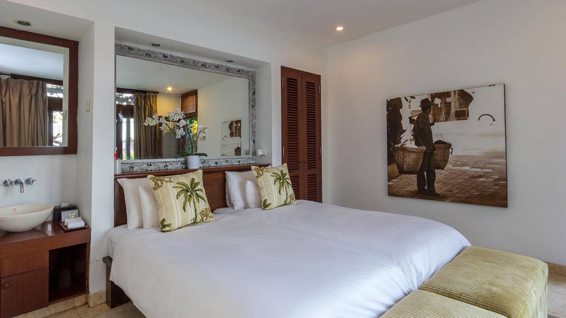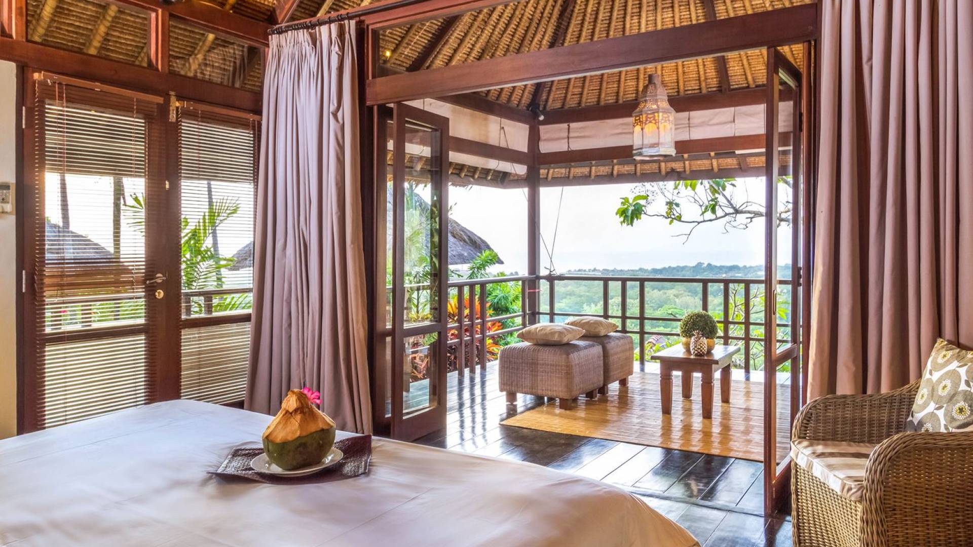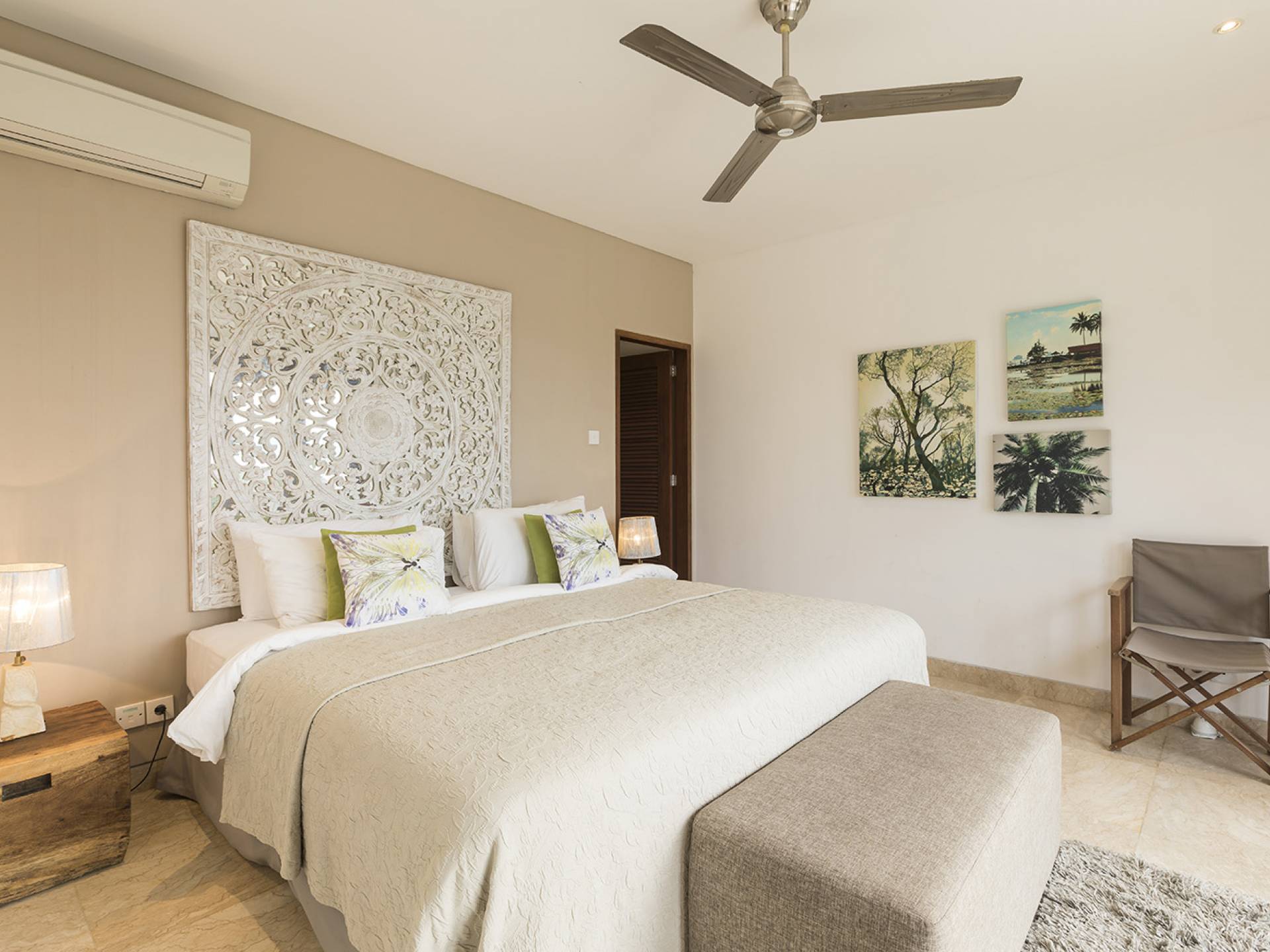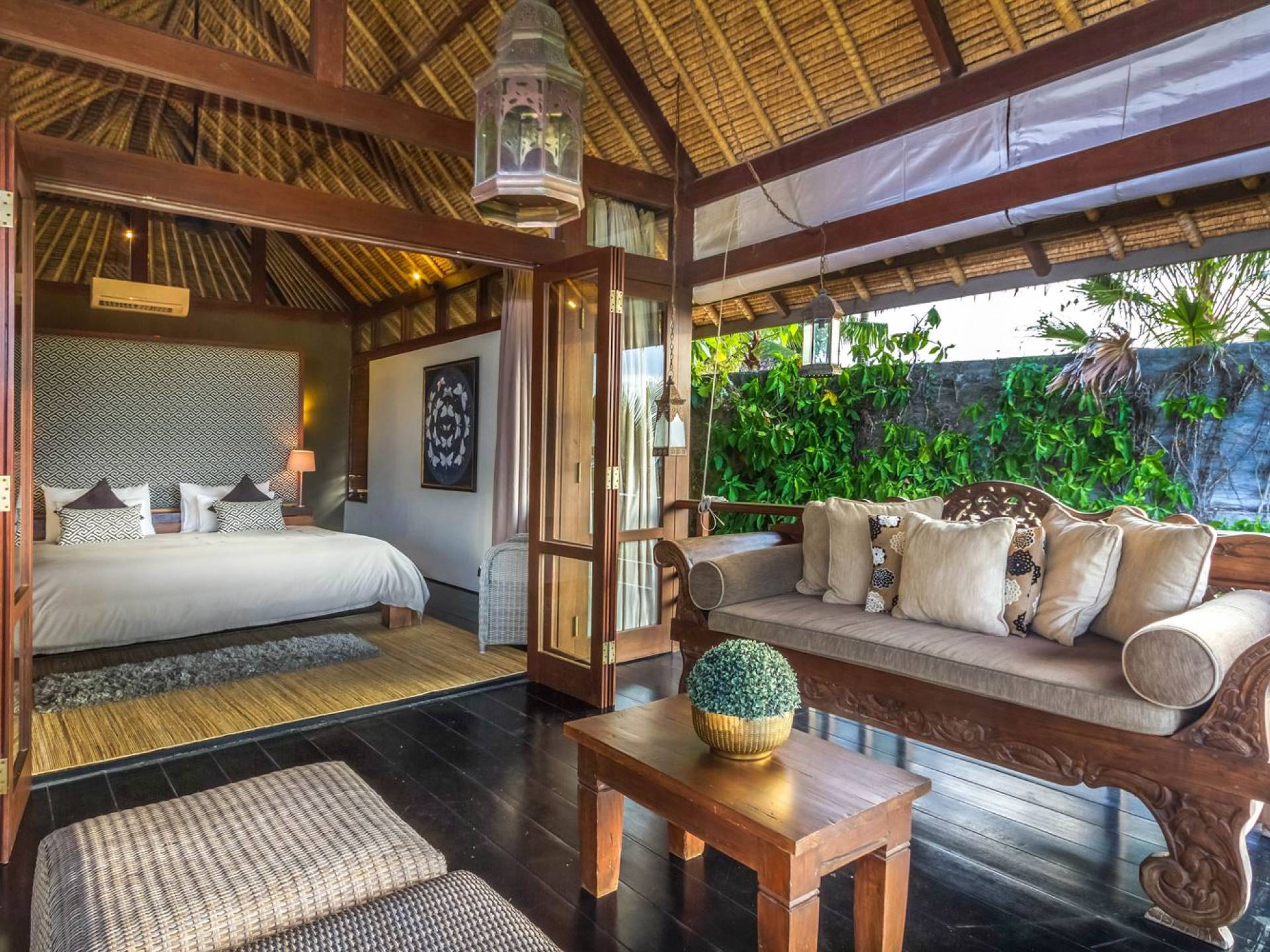 Le superfici della cucina rivestite in granito, i sanitari del bagno in acciaio inossidabile e l'illuminazione a incasso si fondono perfettamente con la pietra palimanan locale, le porte in legno finemente intagliate e i templi balinesi.