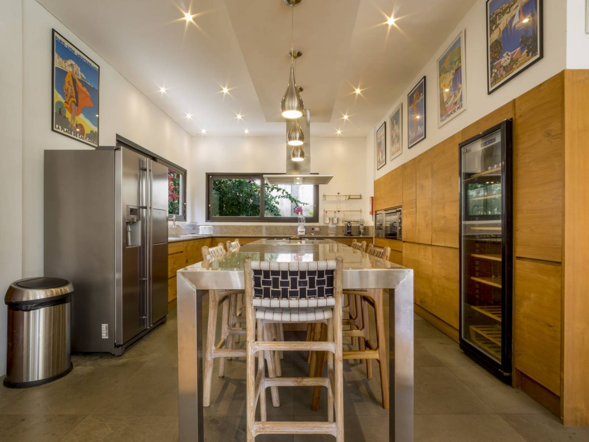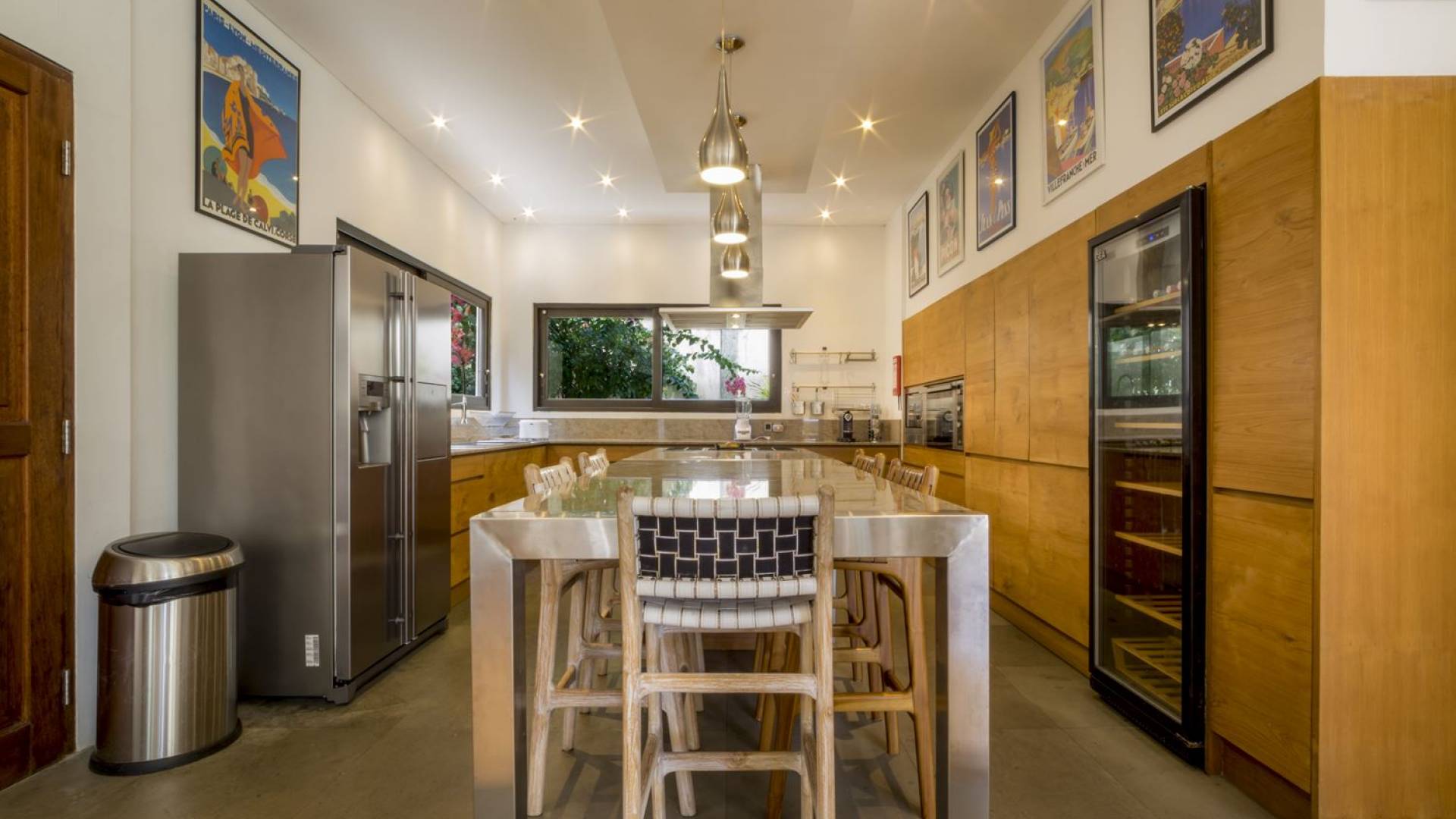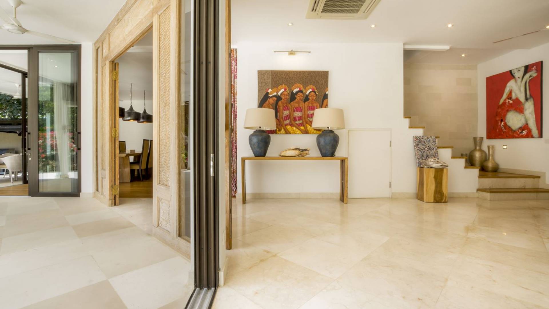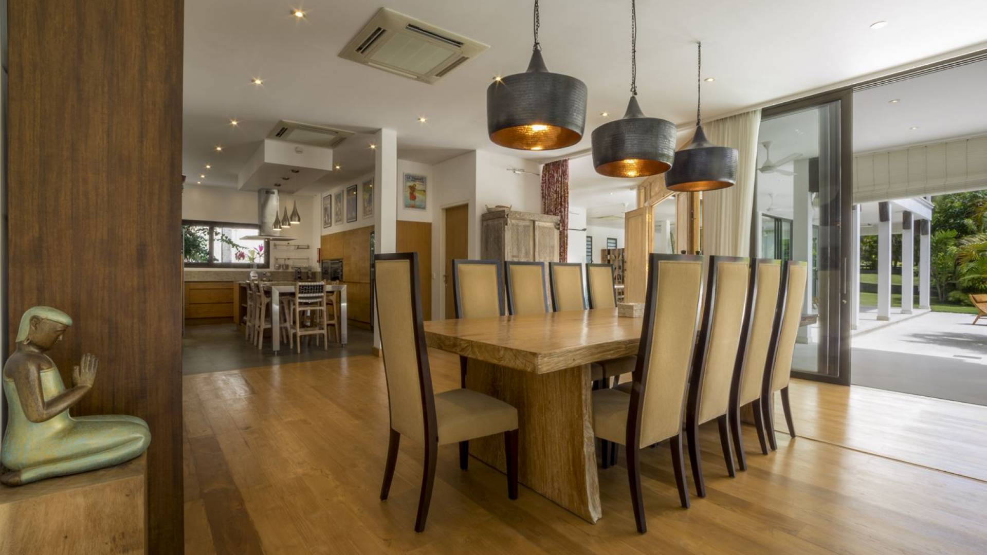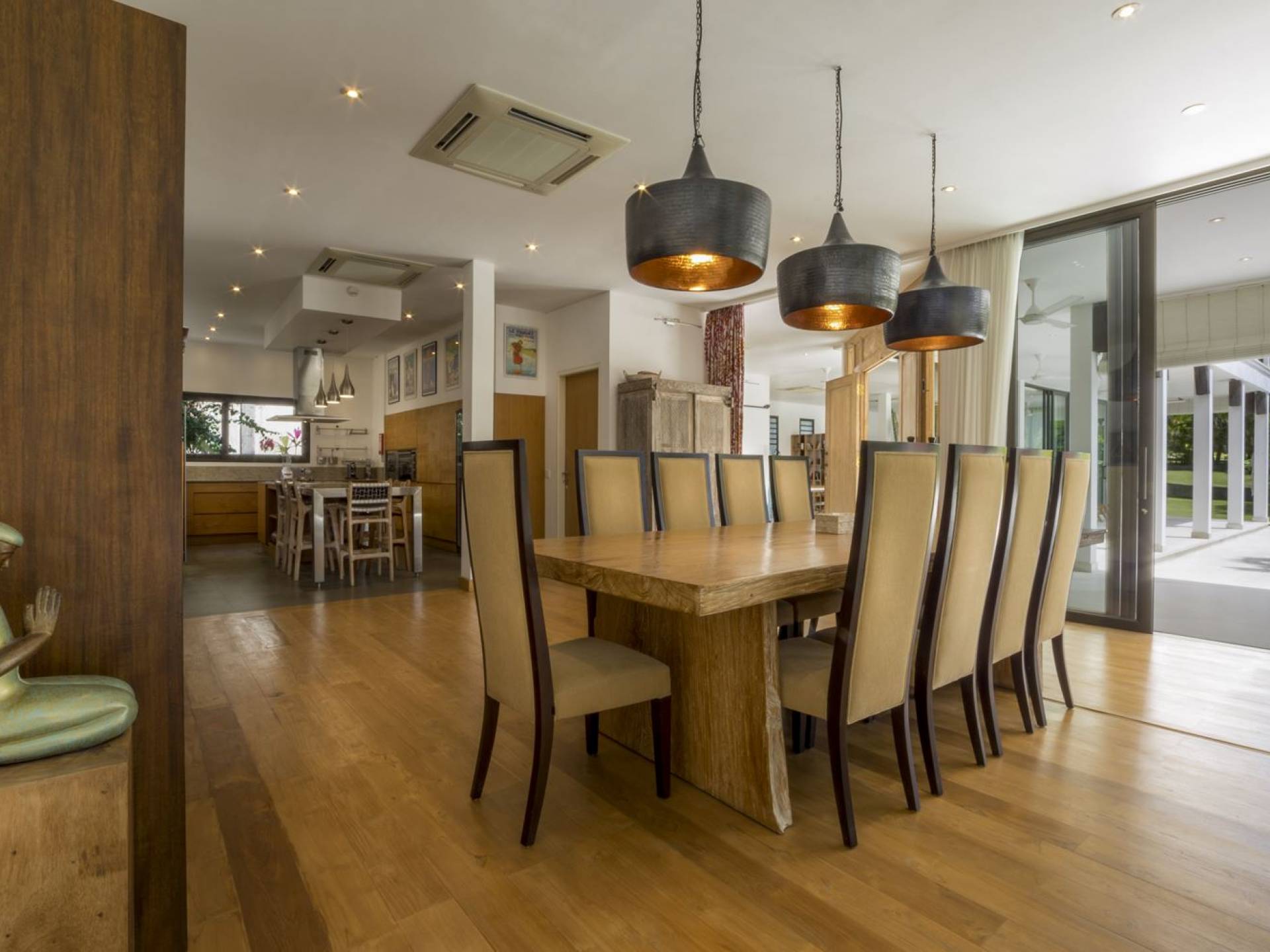Il soggiorno e la sala da pranzo sono entrambi completamente climatizzati e progettati con porte in vetro che si aprono sul solarium esterno. Il soggiorno è uno spazio pieno di luce dotato di un elegante divano in pelle con un tavolino abbinato, una biblioteca di libri e un'enorme TV a schermo piatto con canali satellitari, un lettore DVD e altoparlanti surround. Dall'altro lato dell'armadio dei libri, c'è uno spazio ufficio con vista sul giardino. La sala da pranzo dispone di un tavolo da pranzo in legno imbiancato a 10 posti, illuminato da 3 lampade in rame battuto a mano la sera. Adiacente, troverete la cucina, dotata di elettrodomestici da cucina all'avanguardia e dispone anche di un bar per la colazione con seggioloni per sedersi e gustare una tazza di Nespresso al mattino. C'è un frigorifero high-tech con doppia porta e persino un frigorifero per vini per mantenerli alla temperatura perfetta. Al piano superiore, al primo piano di questo edificio a due piani, c'è una terrazza ventilata e un tavolo da biliardo.