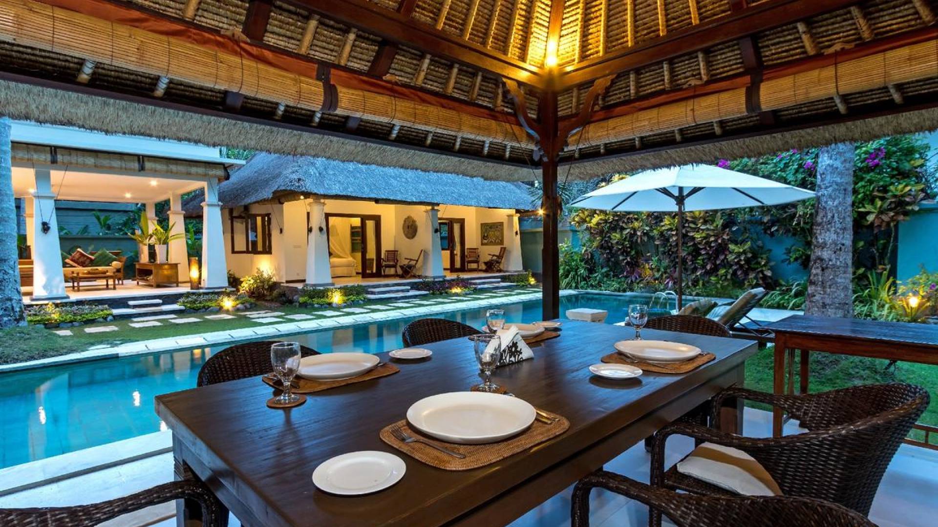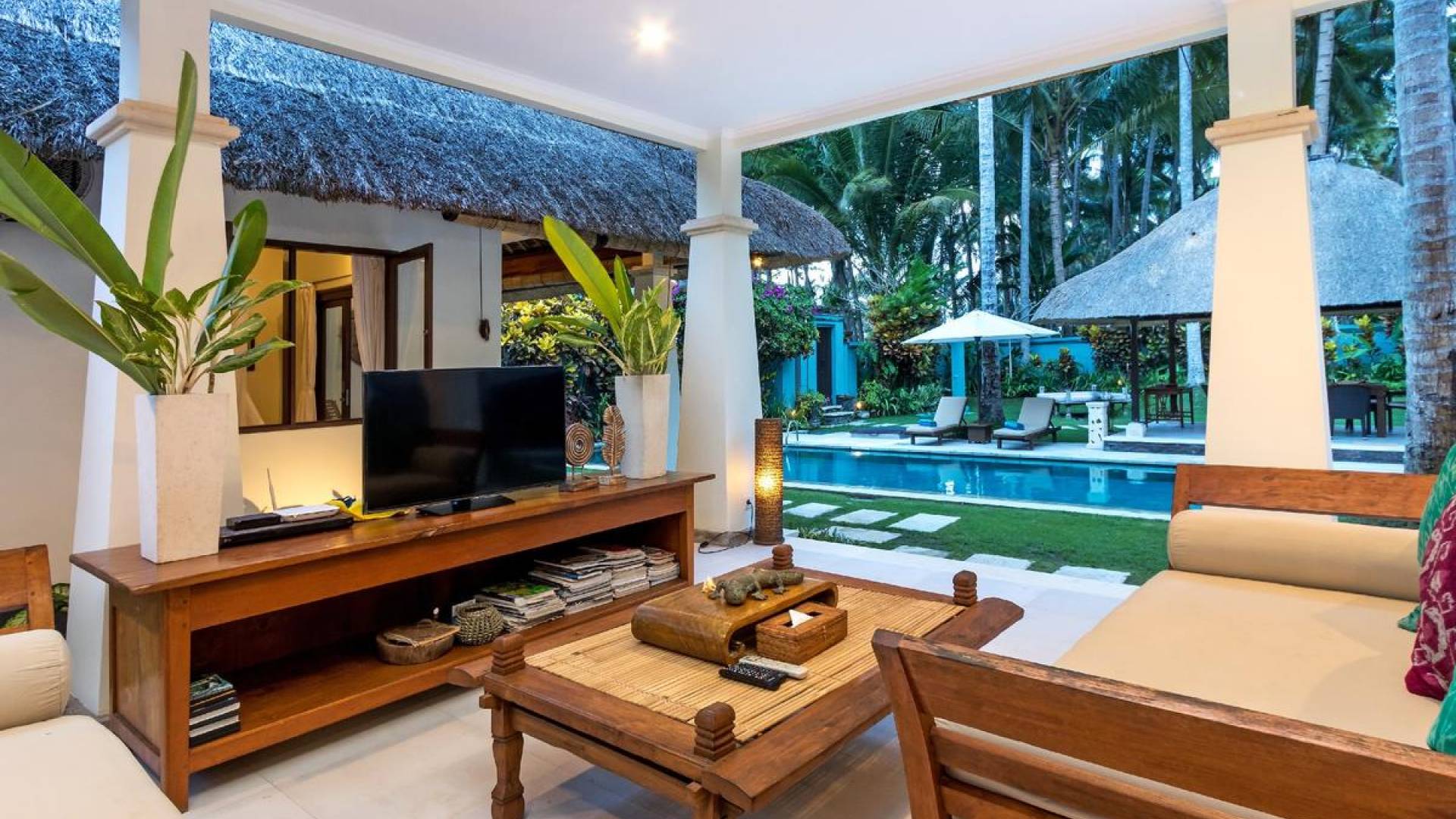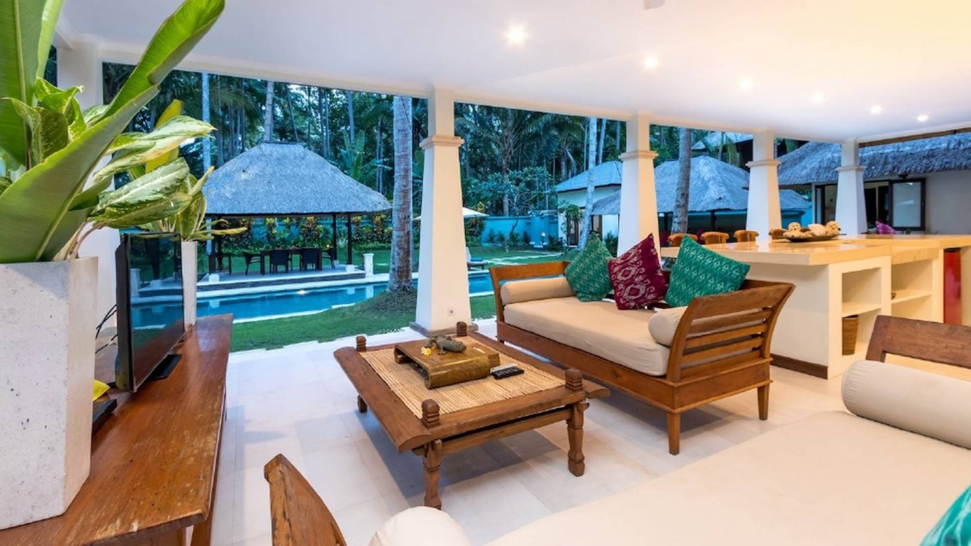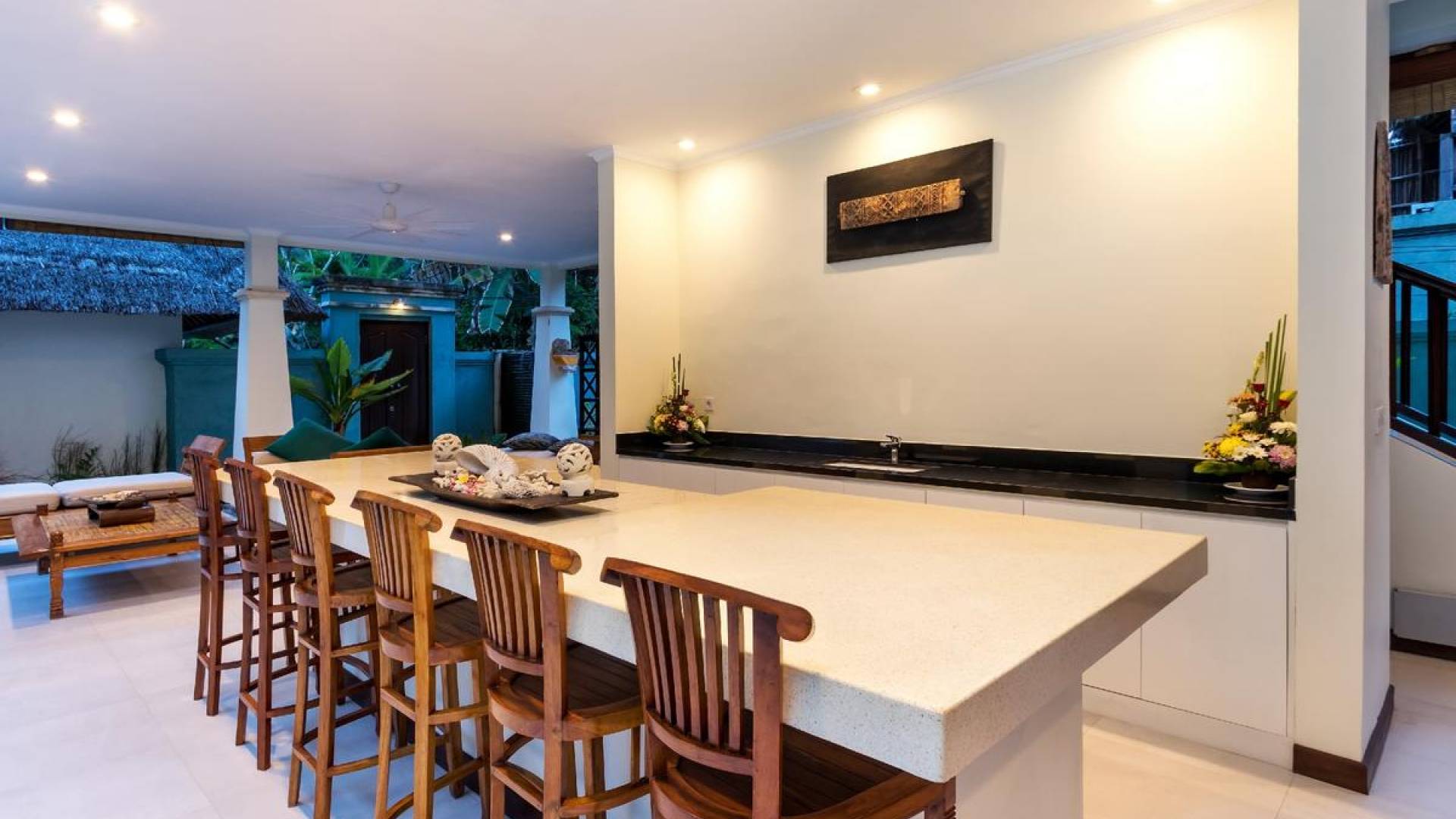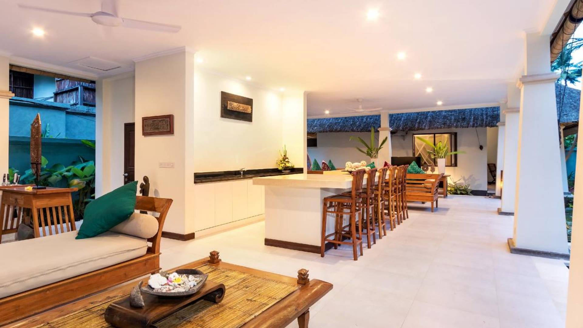 Il cocktail bar è il luogo ideale per sedersi e sorseggiare un drink insieme ai propri cari mentre i bambini corrono sul prato ben curato del giardino o nuotano in piscina. Comodi lettini e divani su ogni lato del cocktail bar offrono bei posti per rannicchiarsi con qualcosa da leggere o per riunirsi per un'accogliente serata al cinema, guardando un film di successo sulla TV a schermo piatto con lettore DVD. Gli amanti del dolce stile di vita dell'isola tropicale trascorreranno molto tempo in giardino, ceneranno all'aperto nella sala da pranzo a bordo piscina, leggeranno un libro nel gazebo ombreggiato nascosto con lettini da giorno o addirittura si concederanno un massaggio tradizionale balinese.