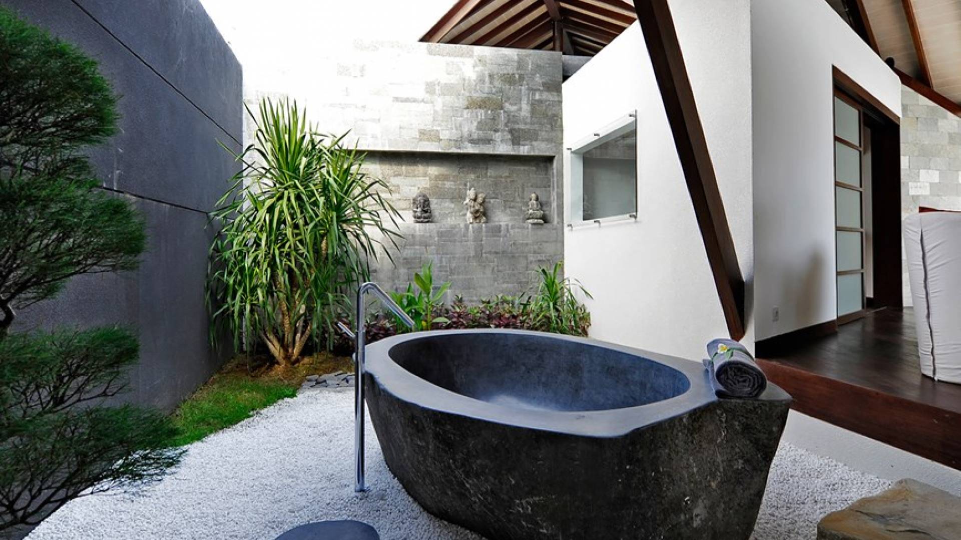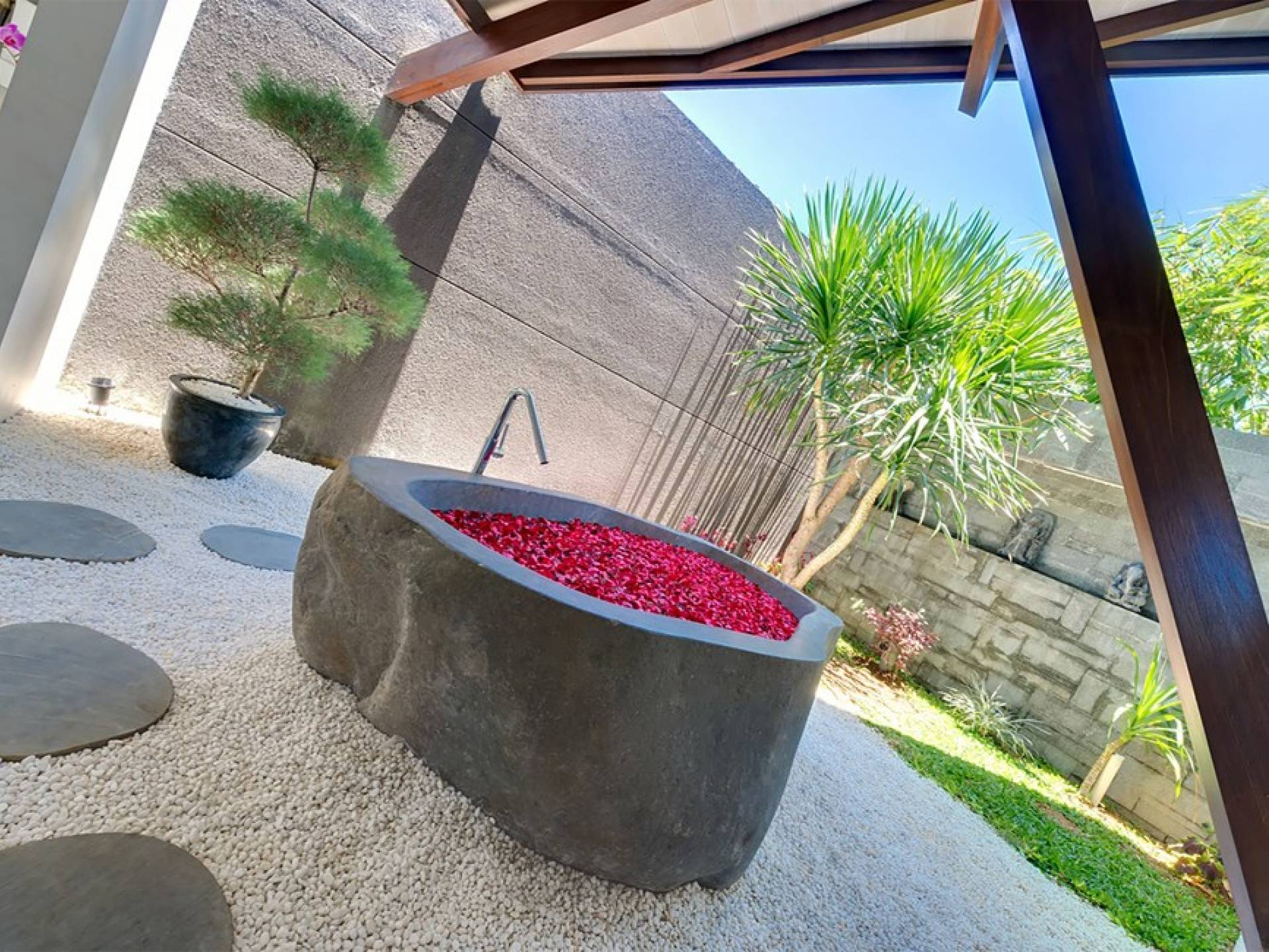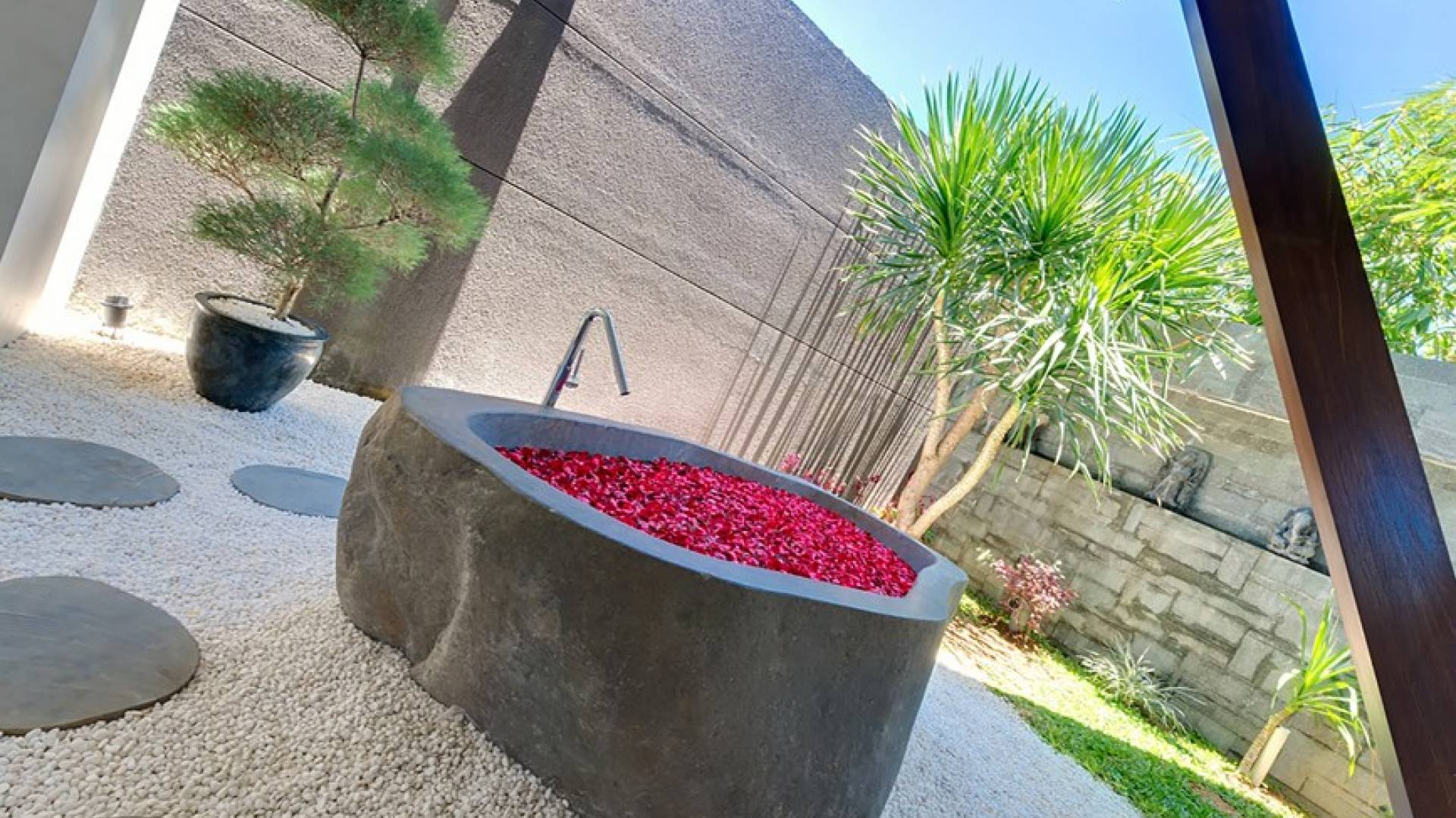 La villa con una camera da letto di Layar a Bali ti accoglie attraverso un giardino sopraelevato che segue la bellissima curva della piscina privata e ti indirizza verso la zona giorno e pranzo open space. Il prototipo del tetto con il suo design speciale è un plus per la forma architettonica. La cucina triangolare da un lato della zona giorno e la spaziosa camera da letto dall'altro con il suo splendido bagno privato in giardino ti stupiranno.