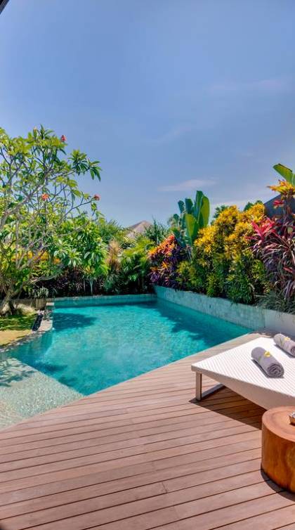 Goditi al massimo l'atmosfera rilassata della zona giorno con il suo tocco romantico e la splendida vista sulla piscina. Rilassati sui meravigliosi lettini o sul divano in legno di teak su misura e lascia che il tempo passi. L'ampia e luminosa camera da letto con la sua elegante area salotto e la finestra sul cortile è perfetta per viaggi di nozze e coppie, mentre il magnifico bagno ti fa sentire unico.