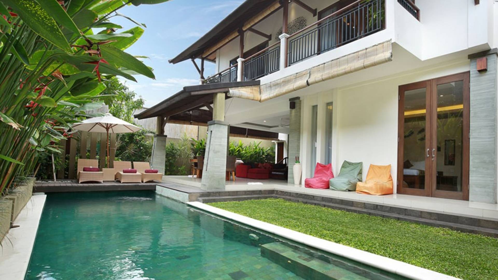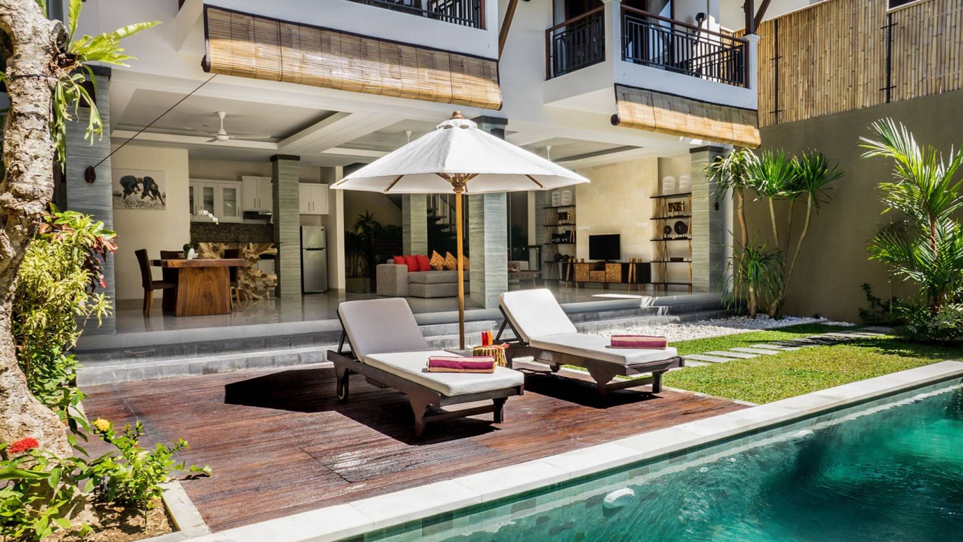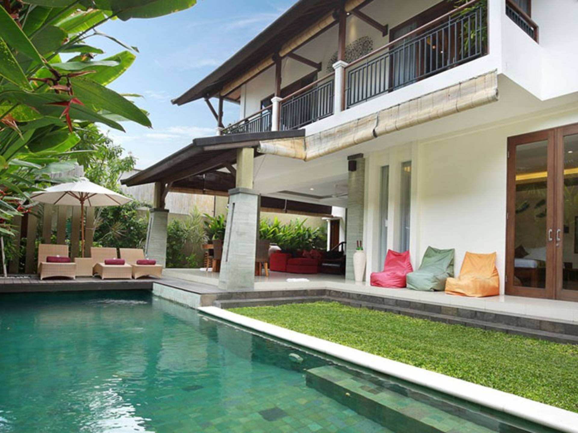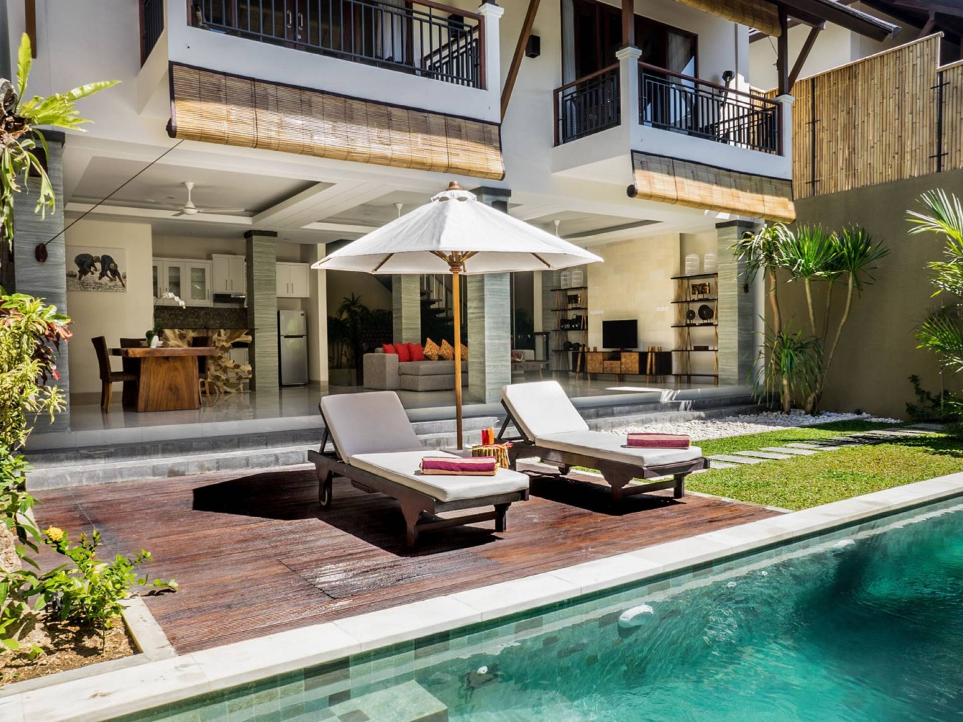 La villa con 3 camere da letto in affitto a Seminyak, Bali, comprende 3 diverse magnifiche camere da letto con aria condizionata, bagni interni, una cucina completamente organizzata e una sala da pranzo a bordo piscina. Al 1° piano sono presenti uno squisito soggiorno e la camera da letto principale con la faccia verso la piscina e il giardino.