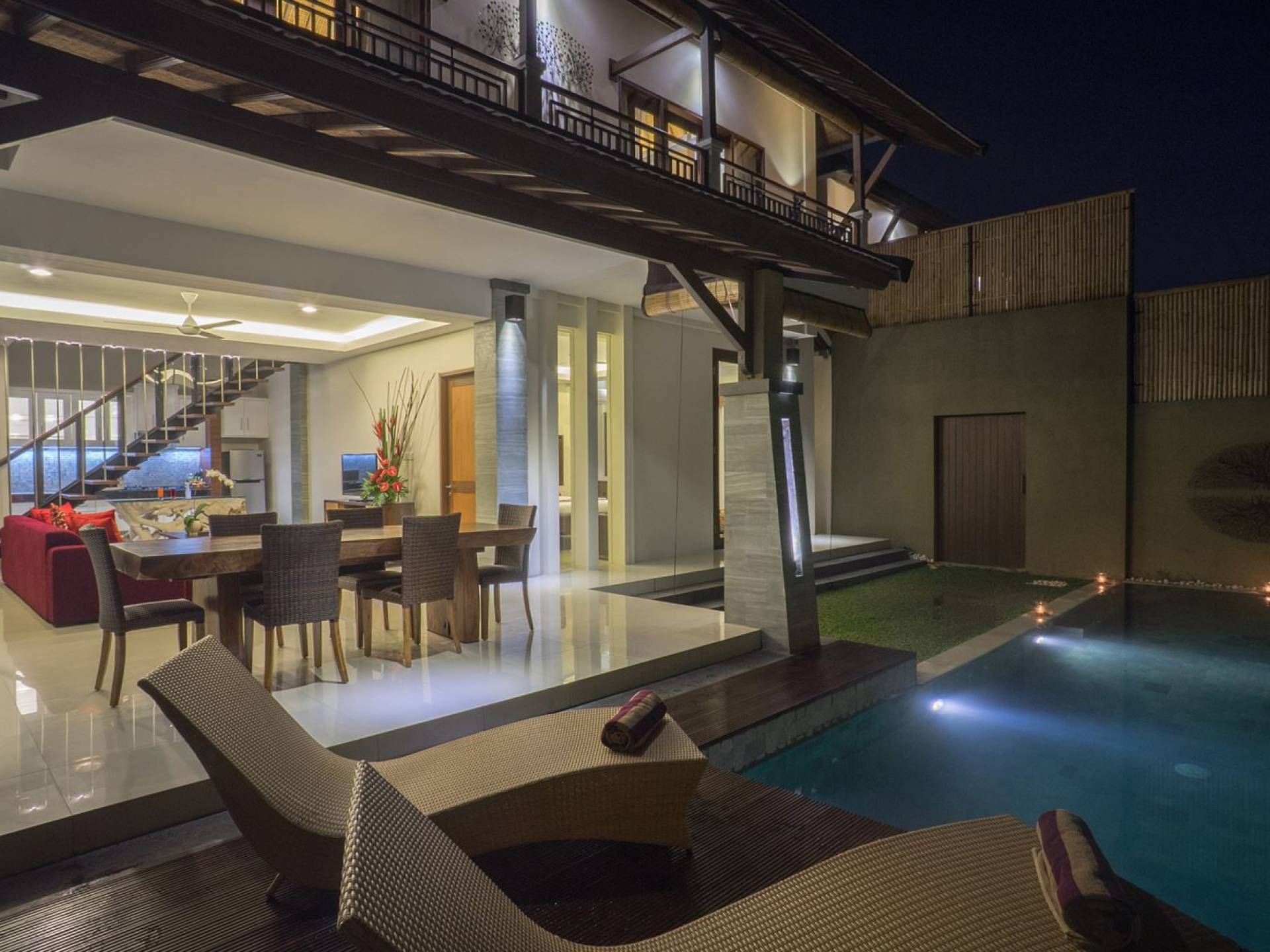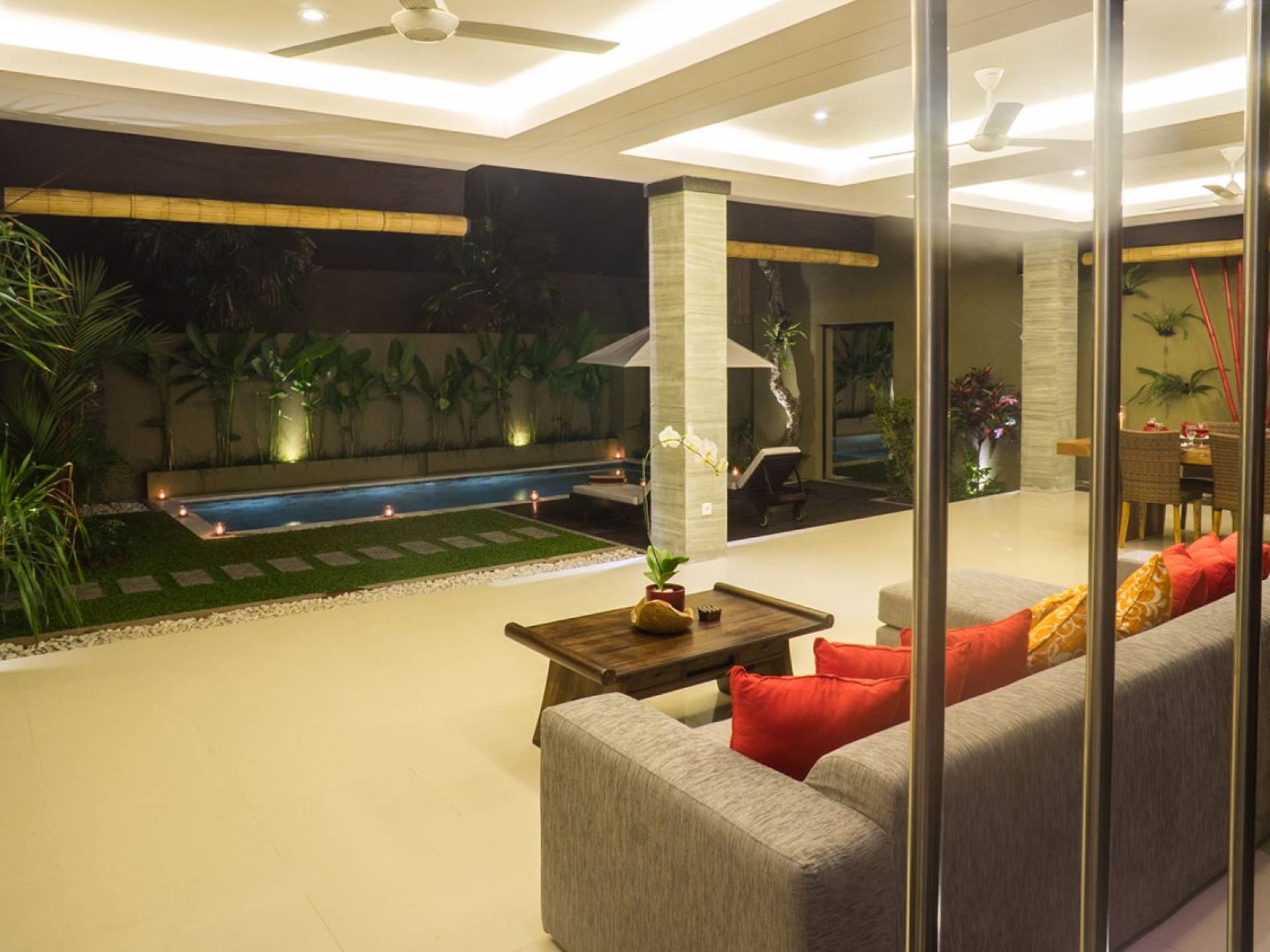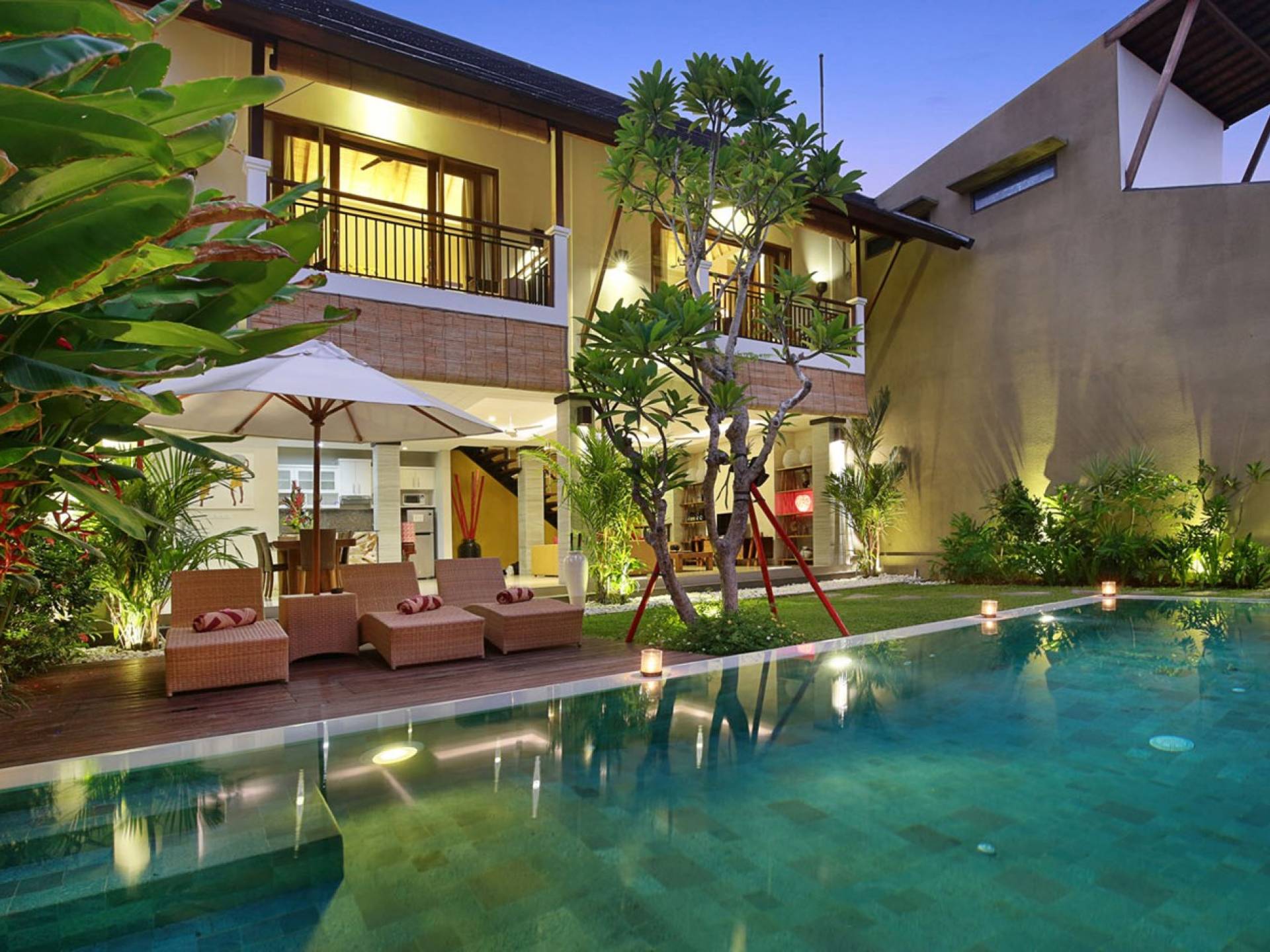 La villa con 3 camere da letto in affitto a Seminyak, Bali, comprende 3 diverse magnifiche camere da letto con aria condizionata, bagni interni, una cucina completamente organizzata e una sala da pranzo a bordo piscina. Al 1° piano sono presenti uno squisito soggiorno e la camera da letto principale con la faccia verso la piscina e il giardino.
