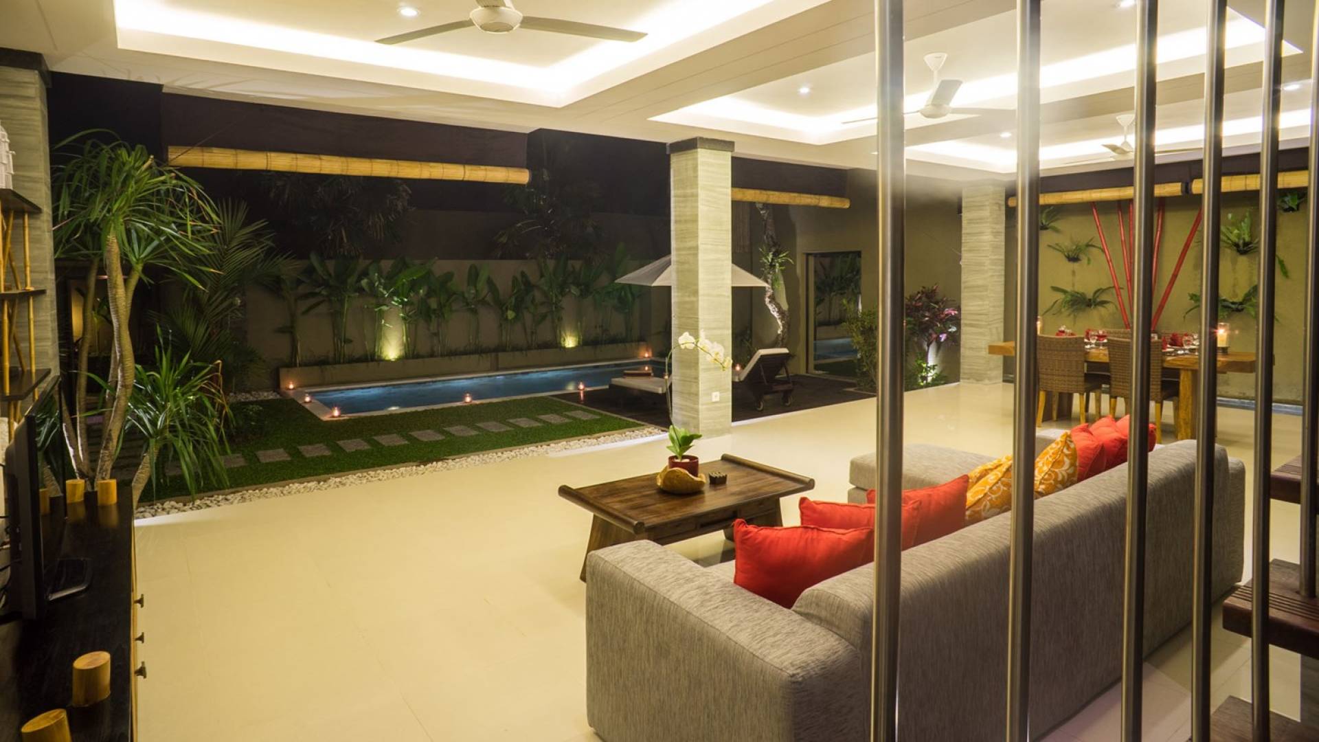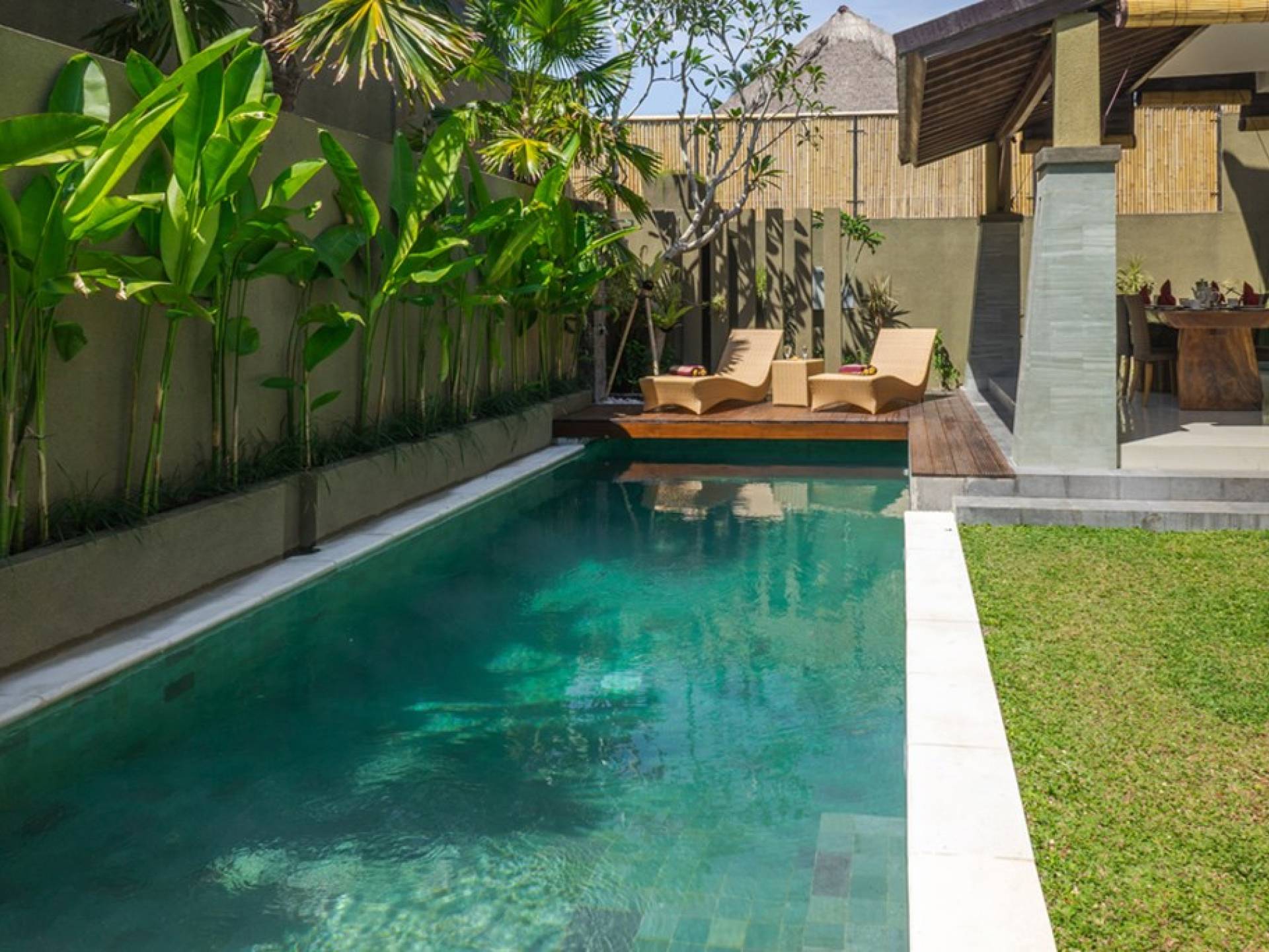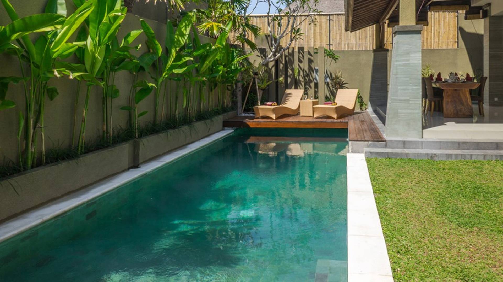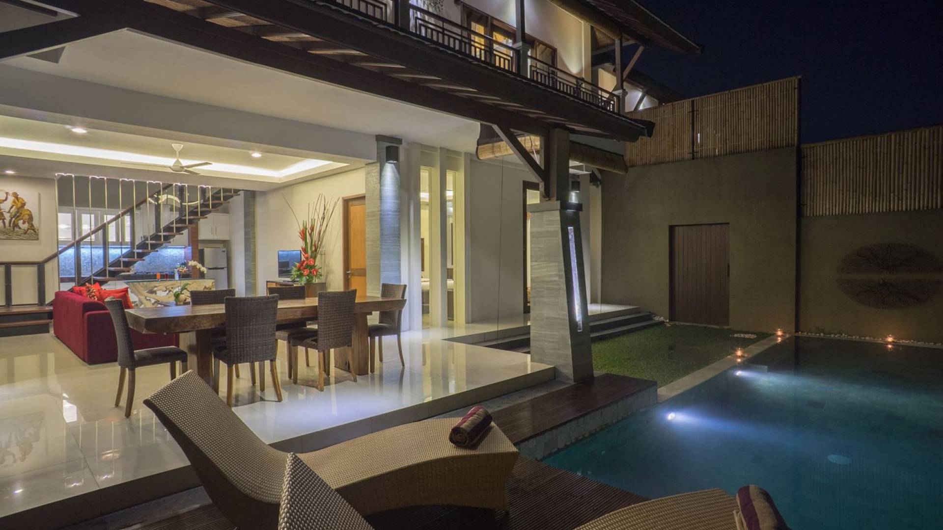 La villa con 3 camere da letto in affitto a Seminyak, Bali, comprende 3 diverse magnifiche camere da letto con aria condizionata, bagni interni, una cucina completamente organizzata e una sala da pranzo a bordo piscina. Al 1° piano sono presenti uno squisito soggiorno e la camera da letto principale con la faccia verso la piscina e il giardino.