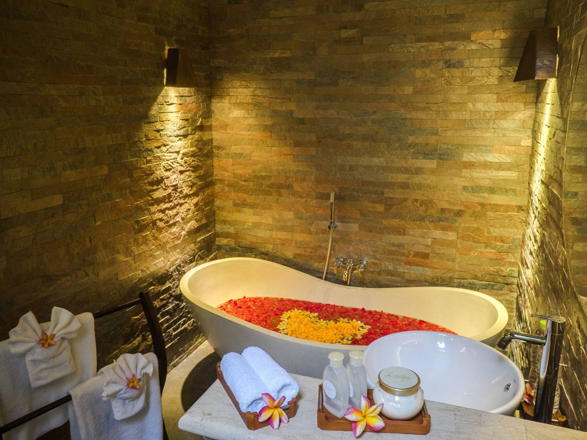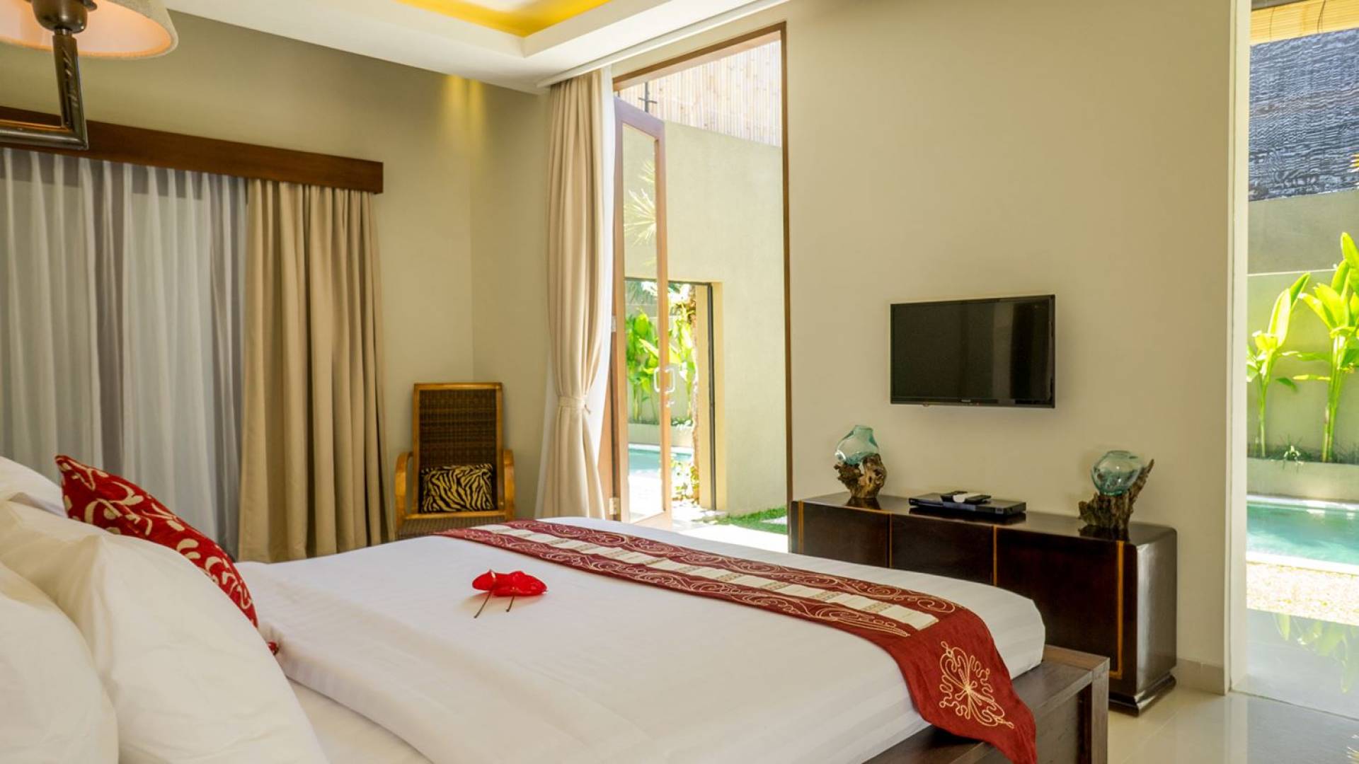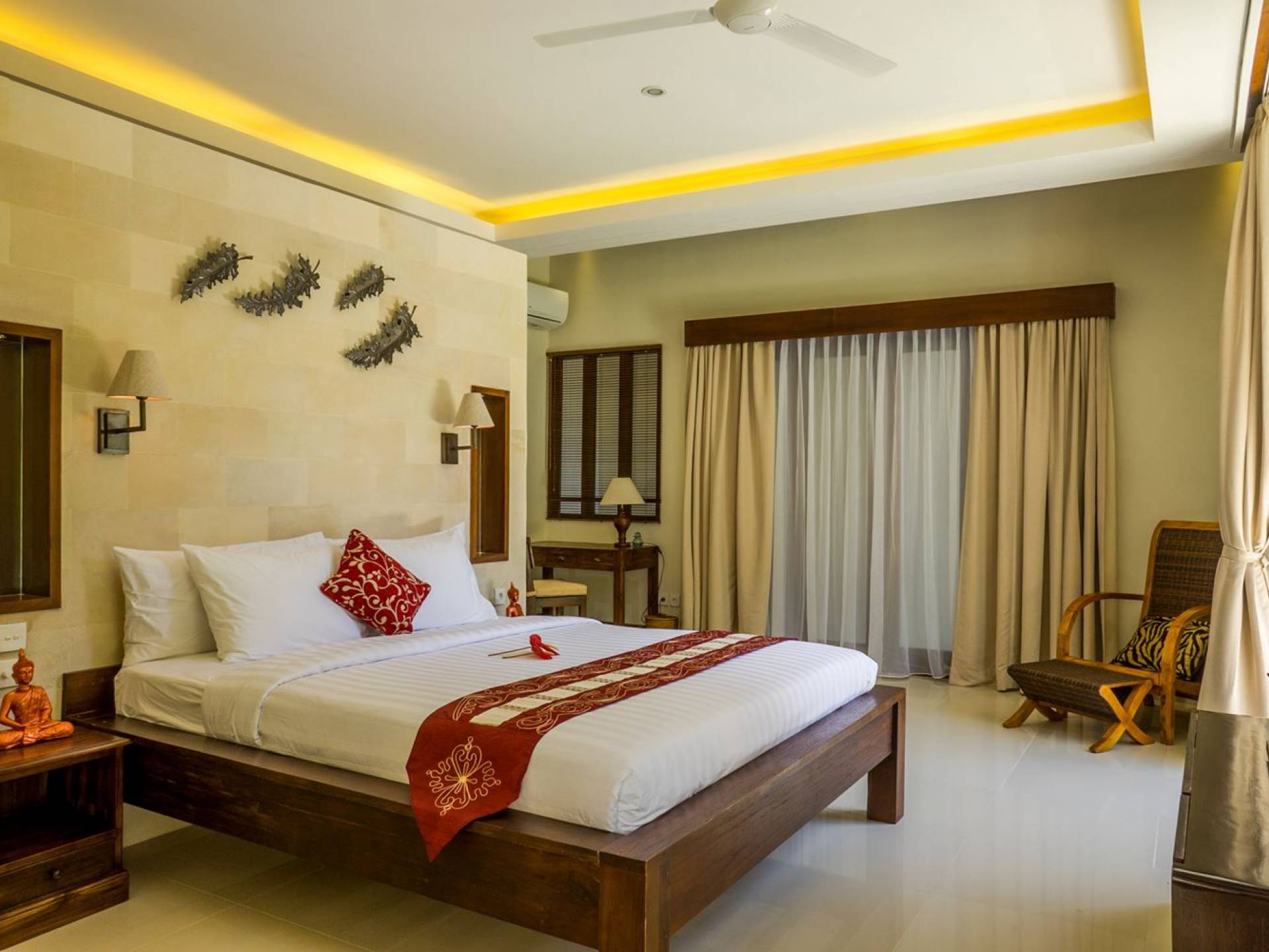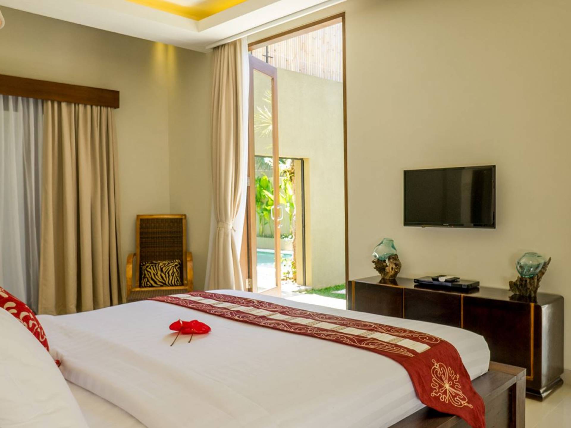 Questa villa con 5 camere da letto a Seminyak Bali è composta da una villa con due camere da letto e una villa con tre camere da letto collegate da un cancello. Tutte le sue camere sono climatizzate, dotate di ventilatore, lettori DVD, TV a schermo piatto, armadio, toletta, bagno privato e per non dimenticare le vasche da bagno.