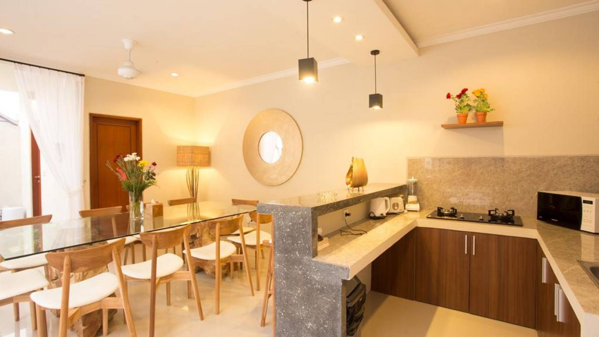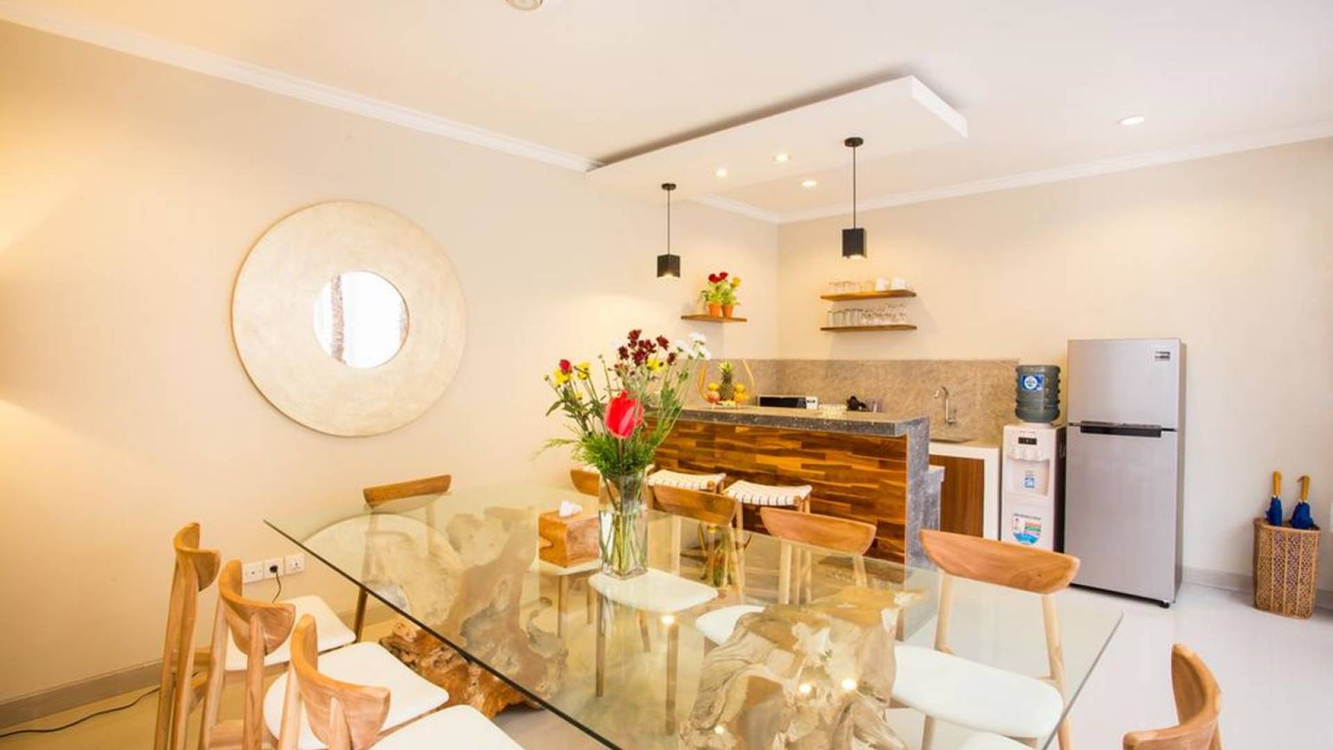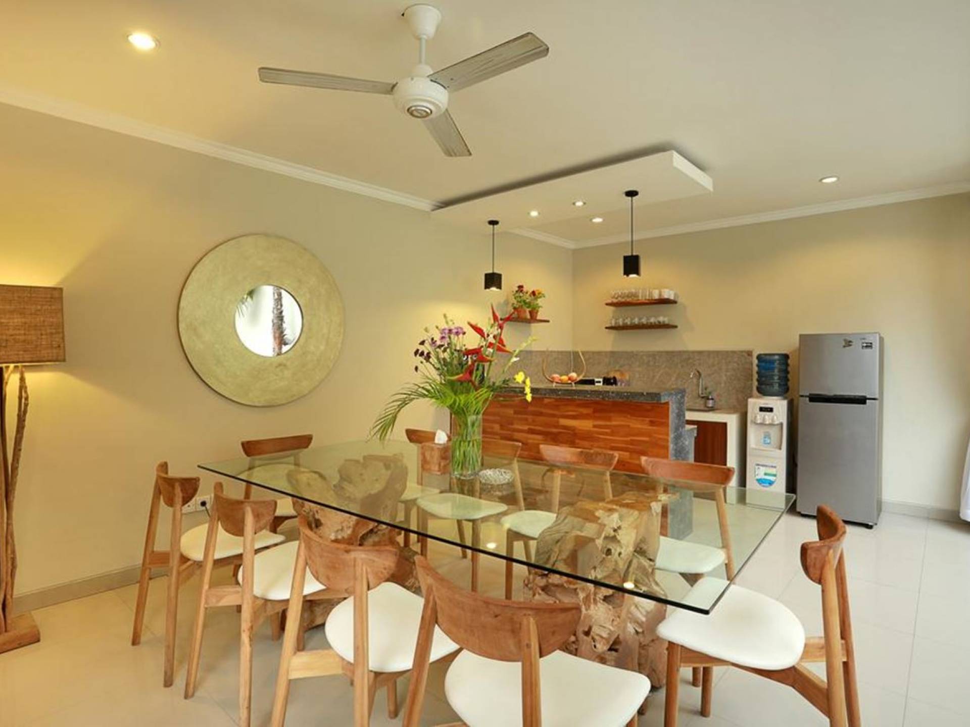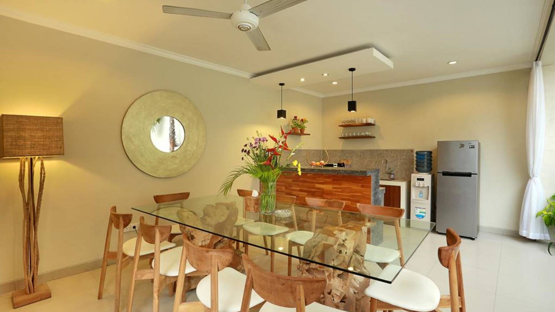 La piscina è lunga 7 metri e larga 2 metri e ha diversi livelli di profondità per consentire ai genitori di portare i loro bambini a fare una nuotata. La piscina è circondata da erba verde con trampolini di lancio che conducono al soggiorno e al padiglione della foresteria a due piani. Per coloro che amano prendere il sole e sorseggiare un cocktail a bordo piscina, ci sono 2 sedie prendisole bianche con un tavolo e un grande ombrellone bianco per fare ombra quando necessario. Dopo una nuotata in piscina, potrete sciacquarvi nella doccia a pioggia all'aperto in giardino. Che tropicale! La sala da pranzo e la cucina sono nascoste in un padiglione a pianta aperta con tende bianche che possono essere chiuse per renderlo un luogo da pranzo accogliente e semi-interno la sera. Lo spazio ha interni eleganti e minimalisti. Il tavolo da pranzo presenta un design unico con un grande ripiano in vetro poggiato su 2 pezzi di legni a forma libera e il tavolo di questo designer è accompagnato da 10 sedie in legno fatte a mano. Lo spazio gode di una brezza naturale ed è dotato di ventilatore a soffitto.
