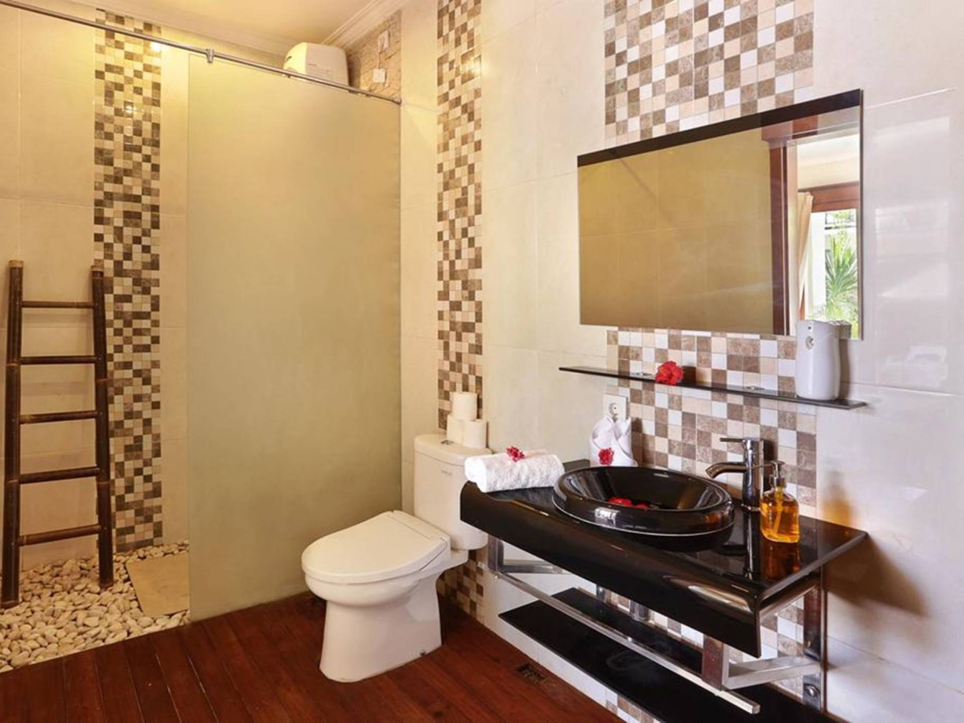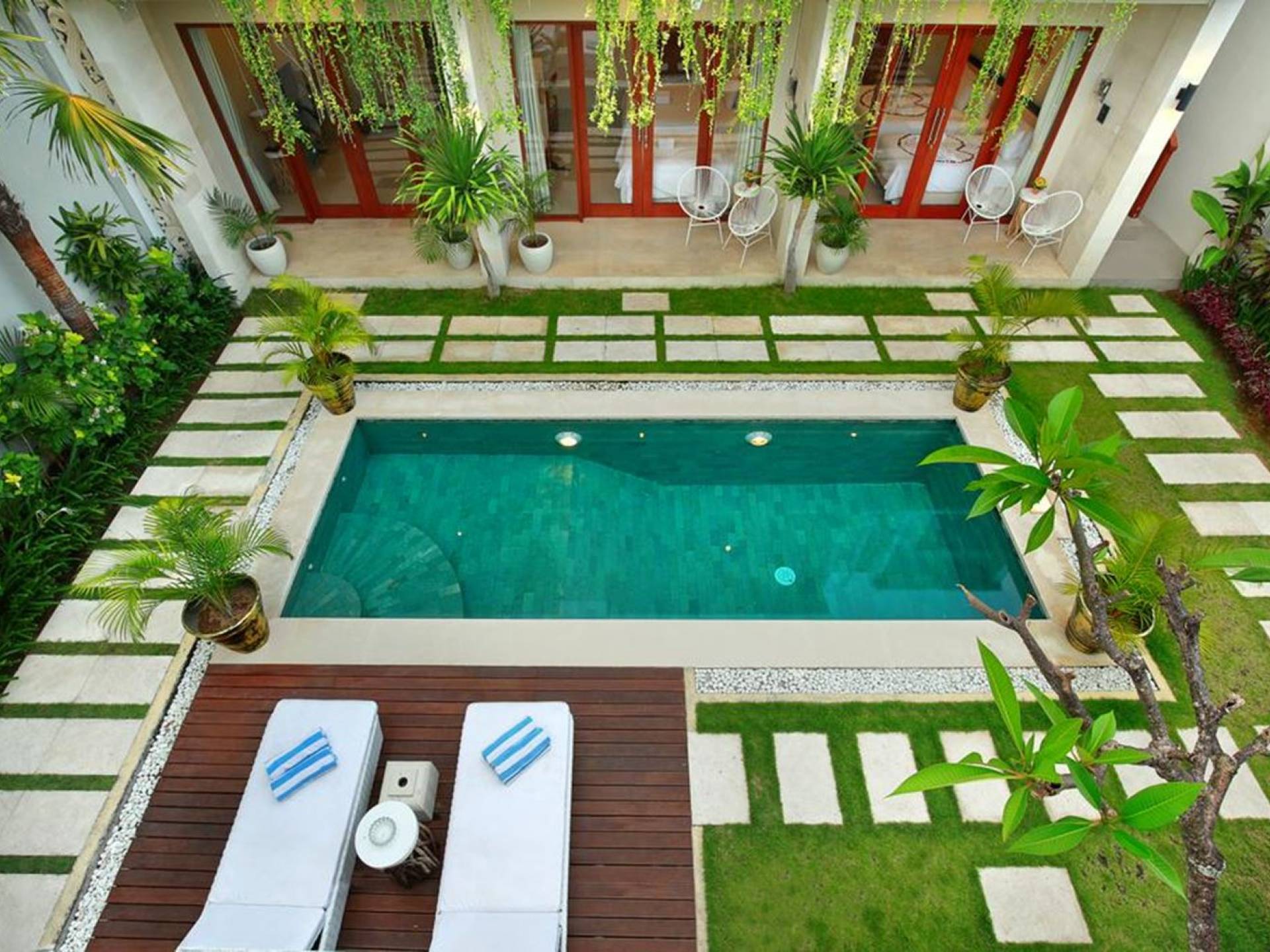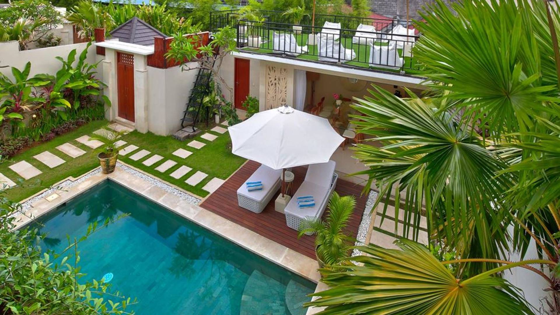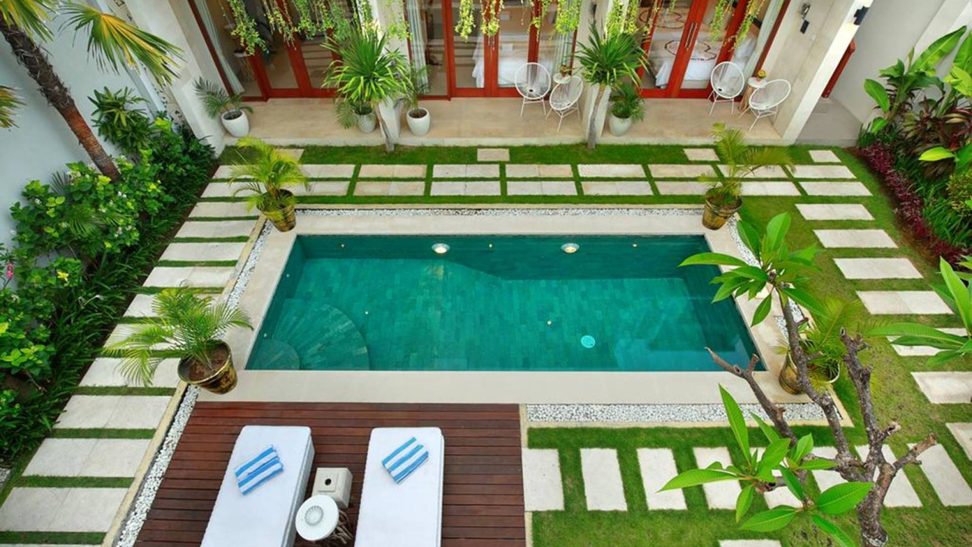 La piscina è lunga 7 metri e larga 2 metri e ha diversi livelli di profondità per consentire ai genitori di portare i loro bambini a fare una nuotata. La piscina è circondata da erba verde con trampolini di lancio che conducono al soggiorno e al padiglione della foresteria a due piani. Per coloro che amano prendere il sole e sorseggiare un cocktail a bordo piscina, ci sono 2 sedie prendisole bianche con un tavolo e un grande ombrellone bianco per fare ombra quando necessario. Dopo una nuotata in piscina, potrete sciacquarvi nella doccia a pioggia all'aperto in giardino. Che tropicale! La sala da pranzo e la cucina sono nascoste in un padiglione a pianta aperta con tende bianche che possono essere chiuse per renderlo un luogo da pranzo accogliente e semi-interno la sera. Lo spazio ha interni eleganti e minimalisti. Il tavolo da pranzo presenta un design unico con un grande ripiano in vetro poggiato su 2 pezzi di legni a forma libera e il tavolo di questo designer è accompagnato da 10 sedie in legno fatte a mano. Lo spazio gode di una brezza naturale ed è dotato di ventilatore a soffitto.