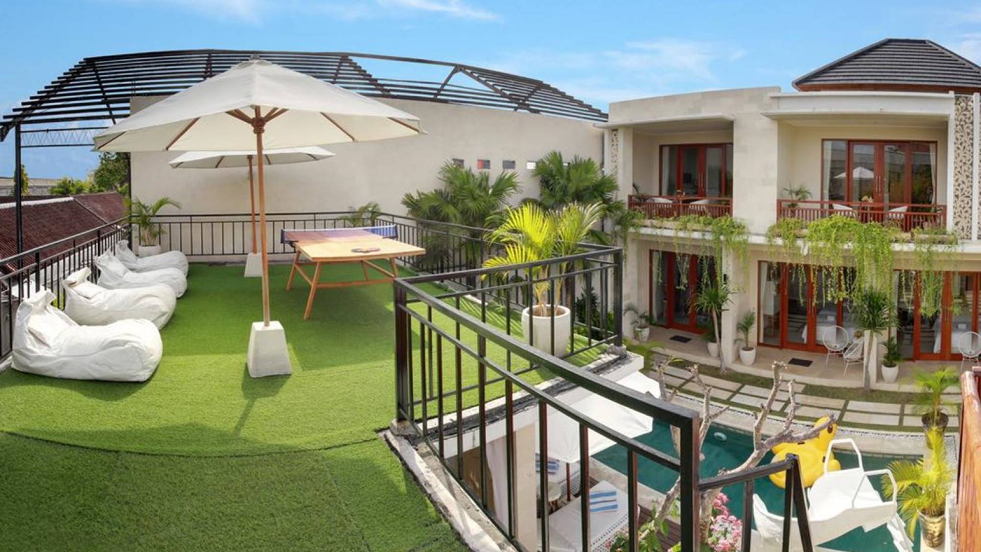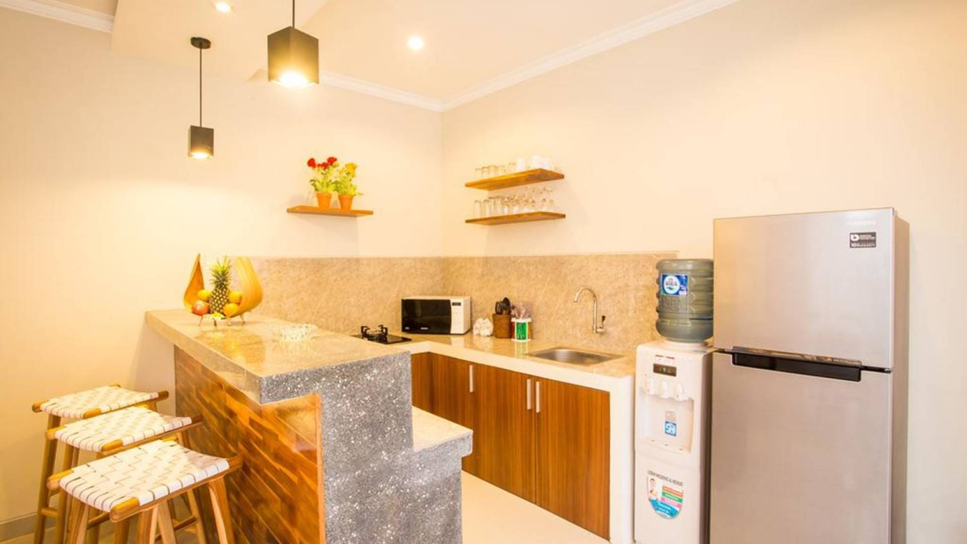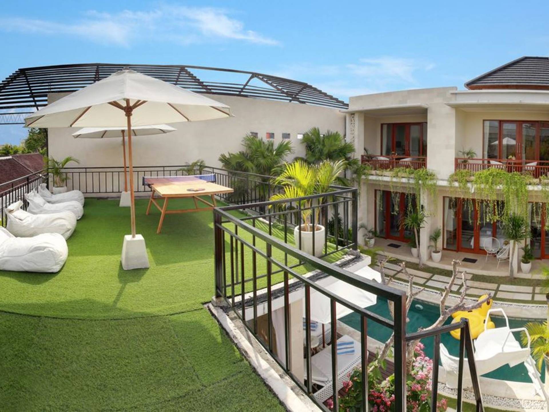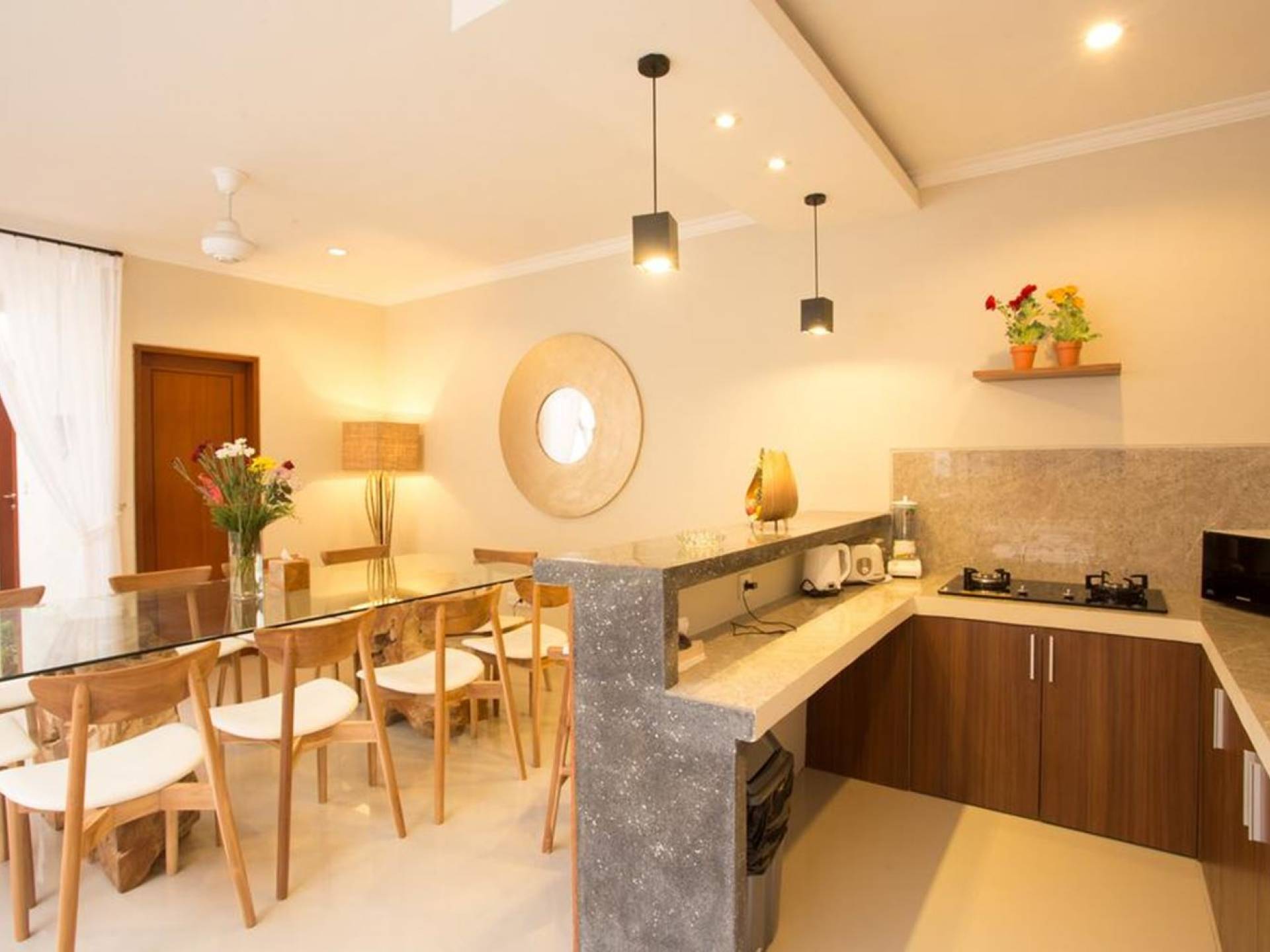 Anche la cucina è ben attrezzata. Poi, per chi ha bisogno di un po' di meritato 'sofà', rilassarsi con un libro o guardare la TV, Casa Daha vanta una sala multimediale climatizzata, decorata con un vaso di ceramica, un tappeto zebrato e un dipinto di un pavone in tutti i suoi colori accesi. La sala TV/salotto si trova sull'altro lato della piscina, nel padiglione della guest house. Un altro punto forte di Villa Daha è il ponte superiore all'aperto, che si trova sopra la sala da pranzo. Dotato di erba sintetica, 8 comodi pouf bianchi e un ombrellone, il ponte non è solo un divertente luogo di ritrovo per cocktail e tramonti, ma è anche ottimo per sessioni di yoga al mattino presto o nel tardo pomeriggio.