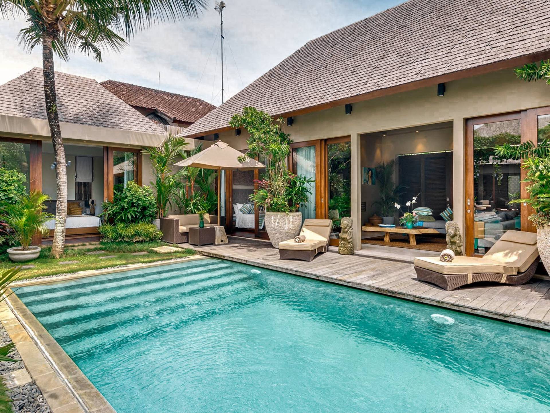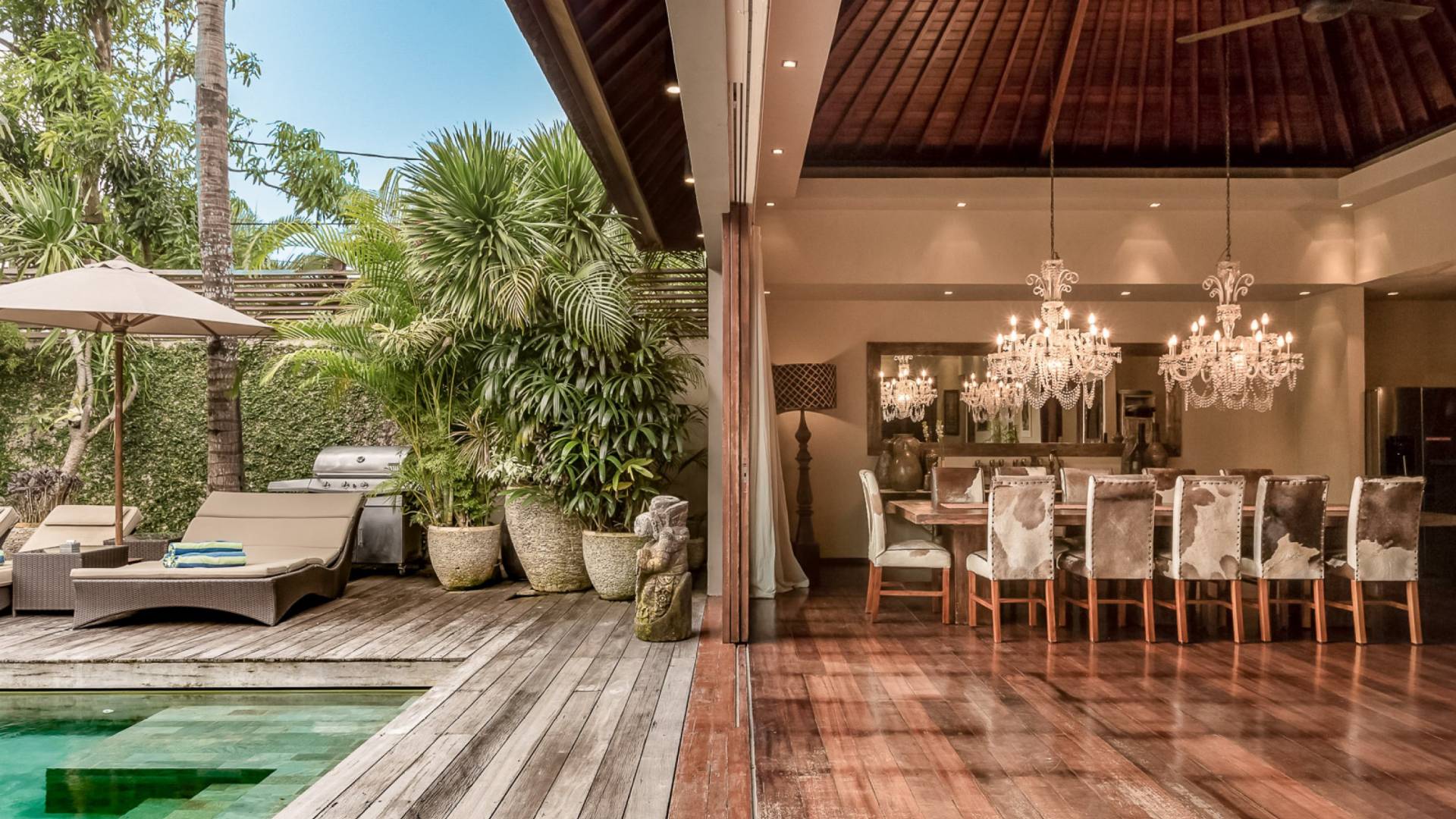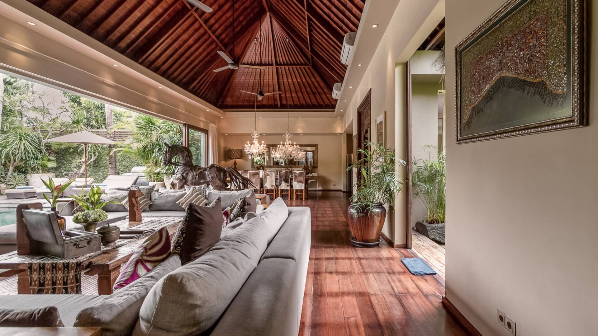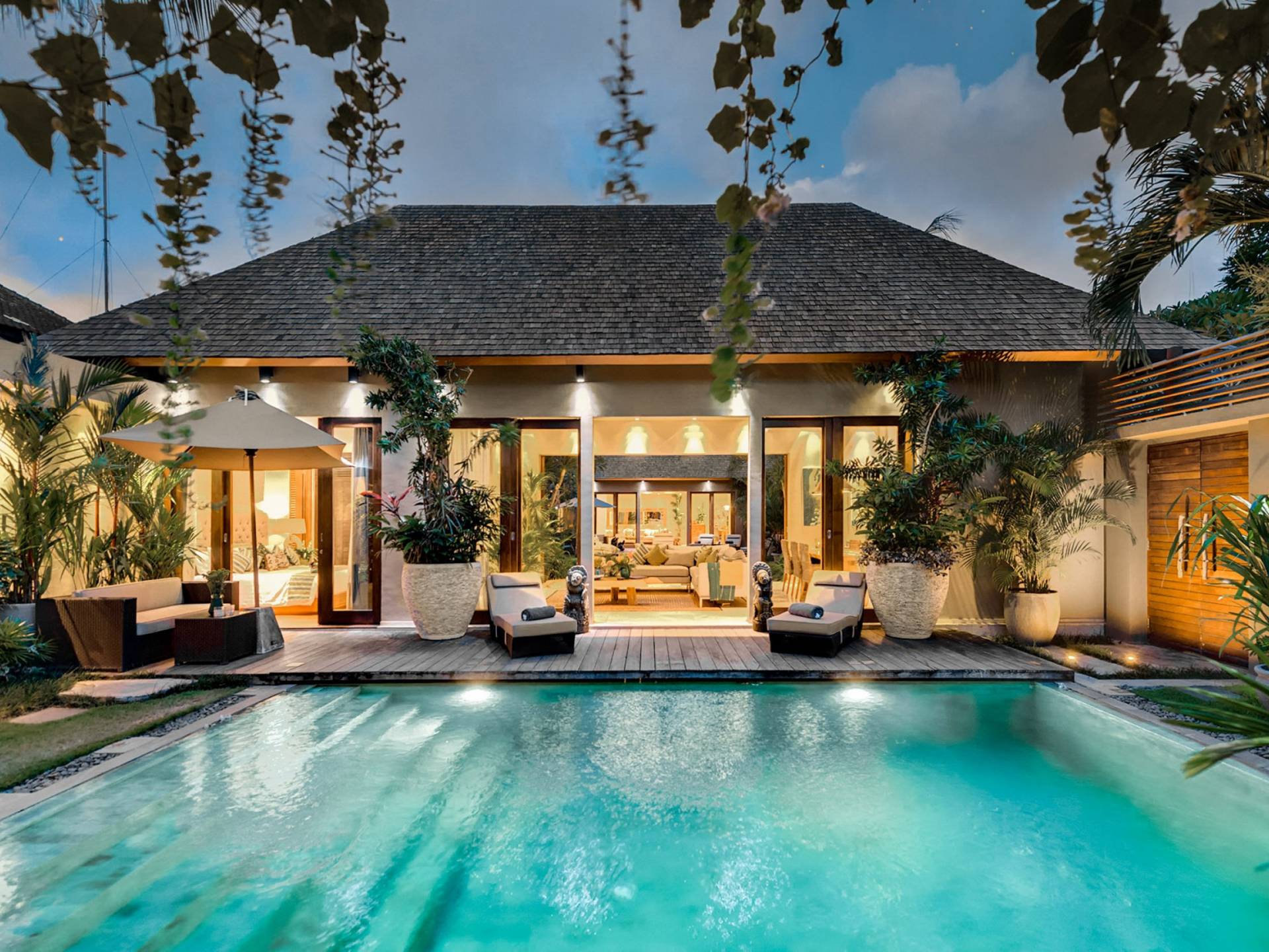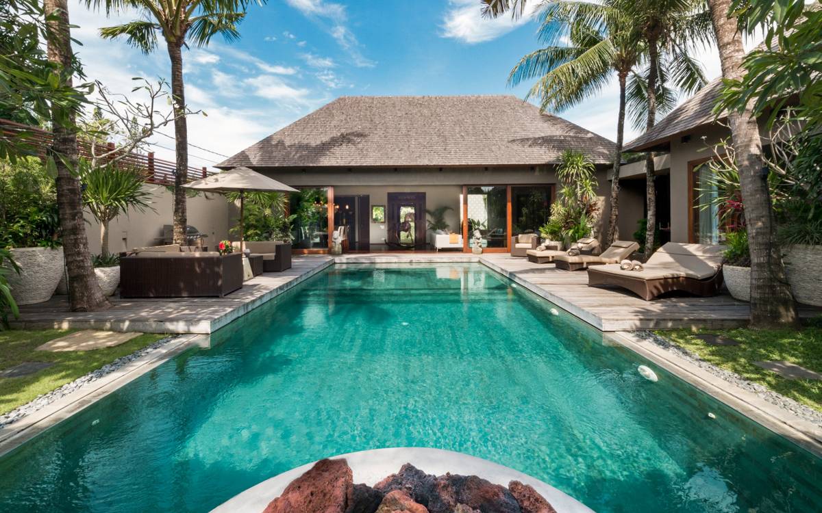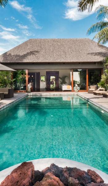 Eshara Estate Seminyak è un grande complesso di tre ville completamente attrezzato, situato in una strada tranquilla e silenziosa a soli 300 metri dalla spiaggia, dai negozi e dai ristoranti del centro di Seminyak. Questa versatile proprietà tre in uno offre la scelta di un'opzione di affitto di 8, 5, 3 o 2 camere da letto grazie a un intelligente sistema di porte scorrevoli e ingressi separati. Ogni villa ha un soggiorno e una sala da pranzo glamour e una cucina integrata, mentre ogni camera da letto con bagno privato ha un letto king-size, uno spogliatoio e un lettore TV/DVD. Ci sono anche tre piscine immerse in giardini tropicali completi di alberi di frangipani, palme da cocco, lettini prendisole e ponti in legno.