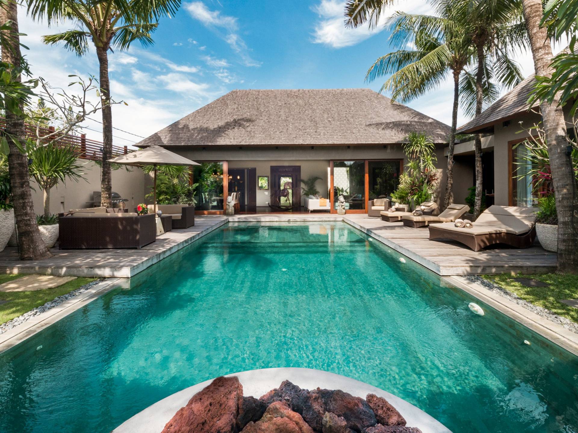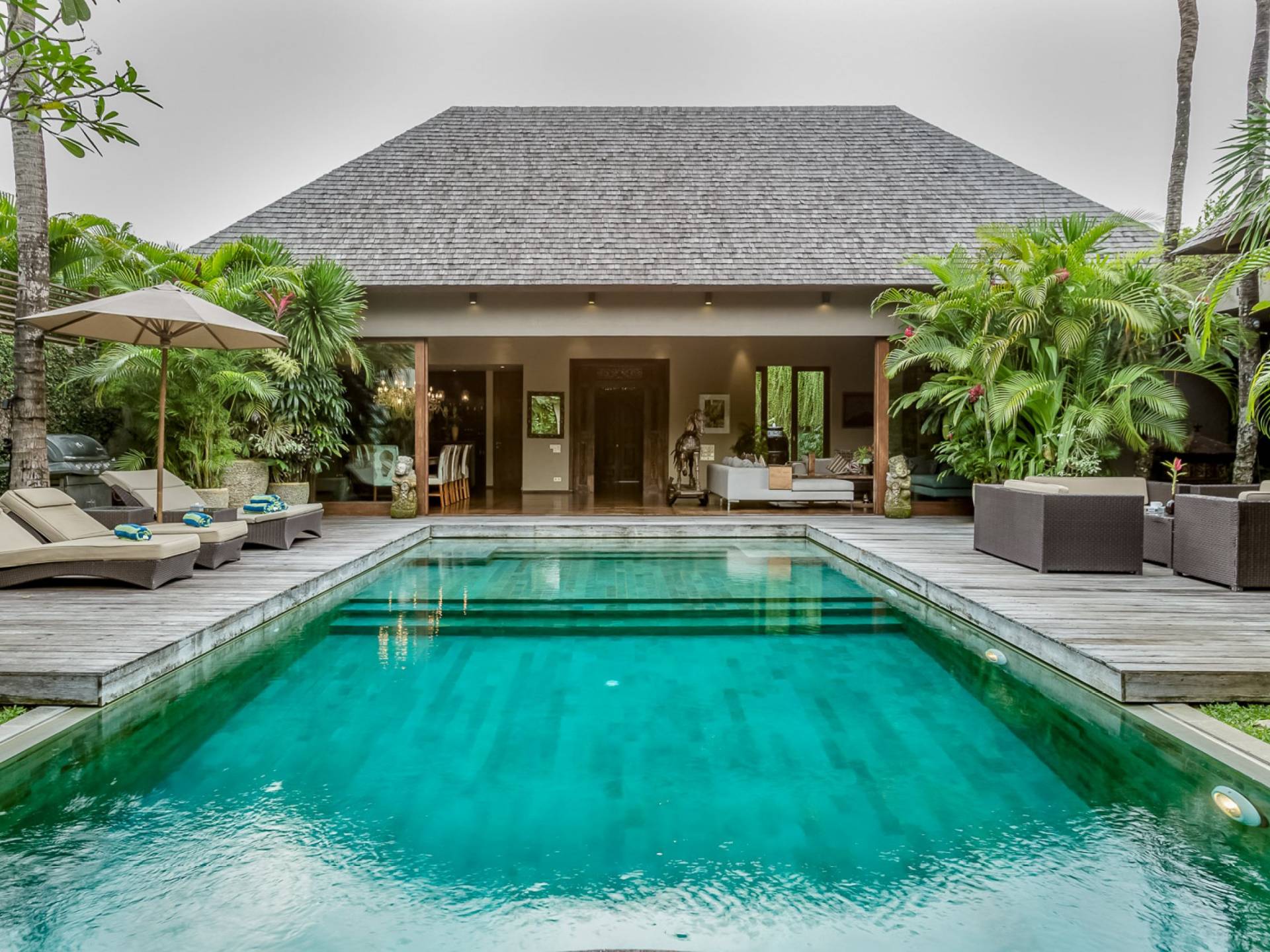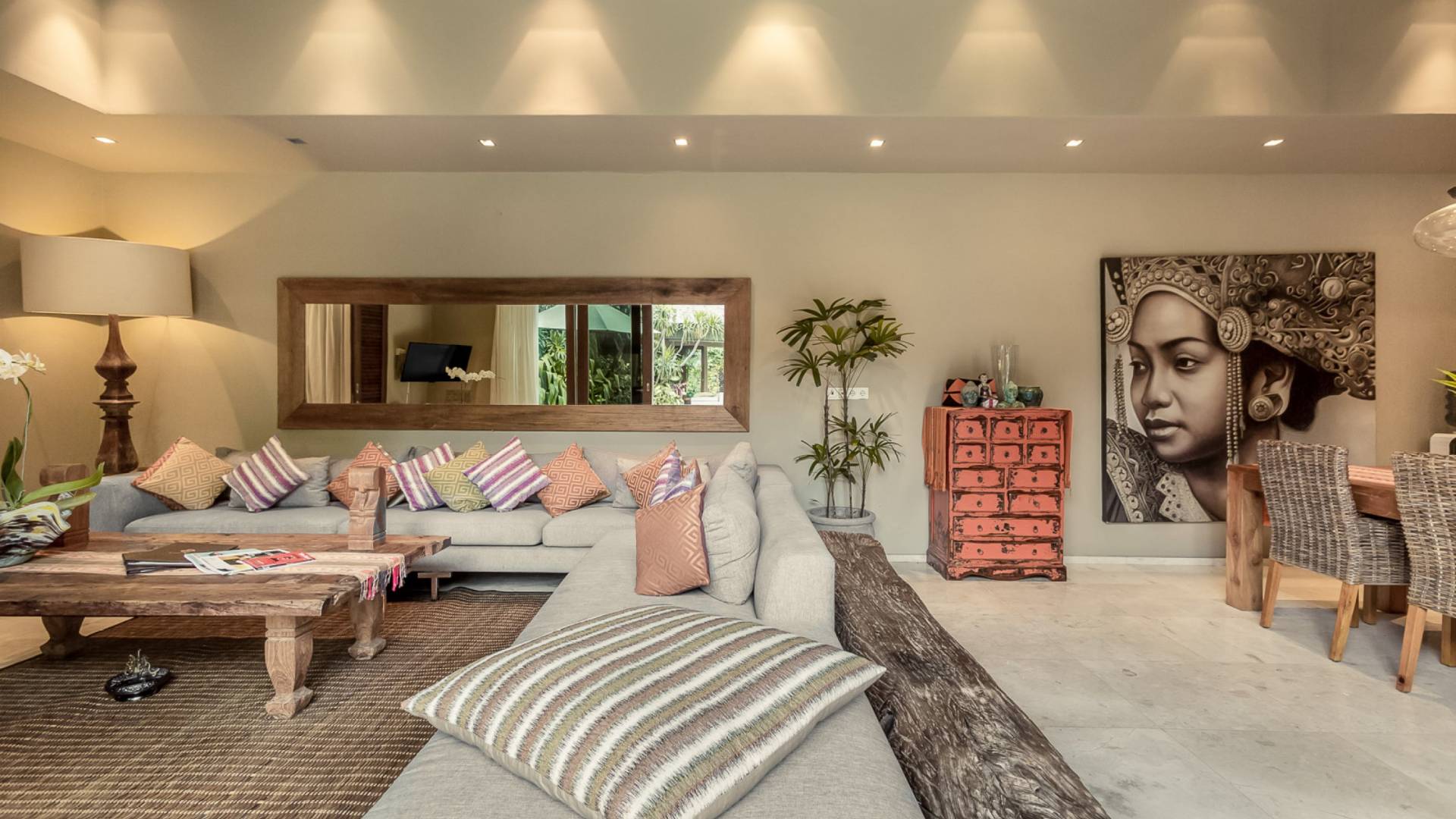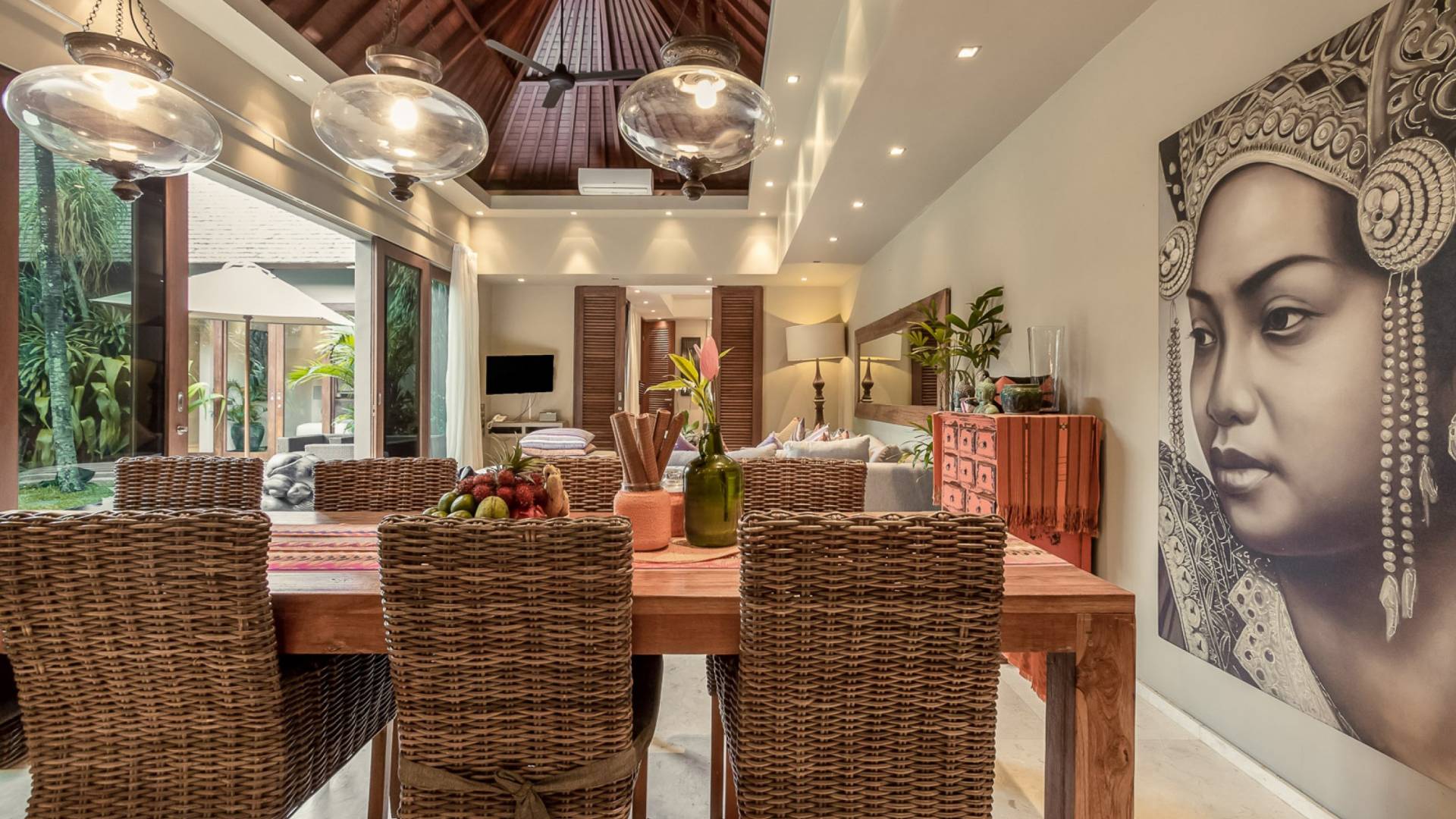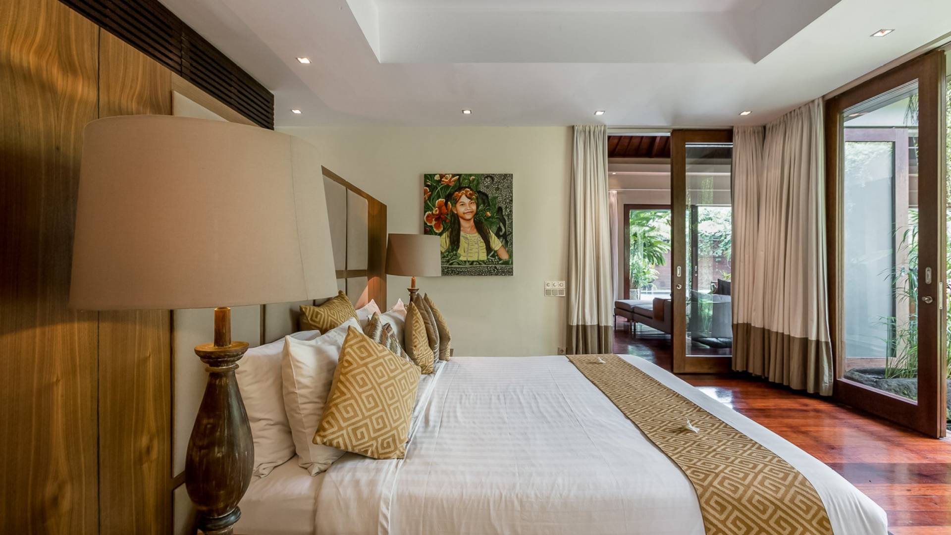 Eshara Estate Seminyak è un grande complesso di tre ville completamente attrezzato, situato in una strada tranquilla e silenziosa a soli 300 metri dalla spiaggia, dai negozi e dai ristoranti del centro di Seminyak. Questa versatile proprietà tre in uno offre la scelta di un'opzione di affitto di 8, 5, 3 o 2 camere da letto grazie a un intelligente sistema di porte scorrevoli e ingressi separati. Ogni villa ha un soggiorno e una sala da pranzo glamour e una cucina integrata, mentre ogni camera da letto con bagno privato ha un letto king-size, uno spogliatoio e un lettore TV/DVD. Ci sono anche tre piscine immerse in giardini tropicali completi di alberi di frangipani, palme da cocco, lettini prendisole e ponti in legno.
