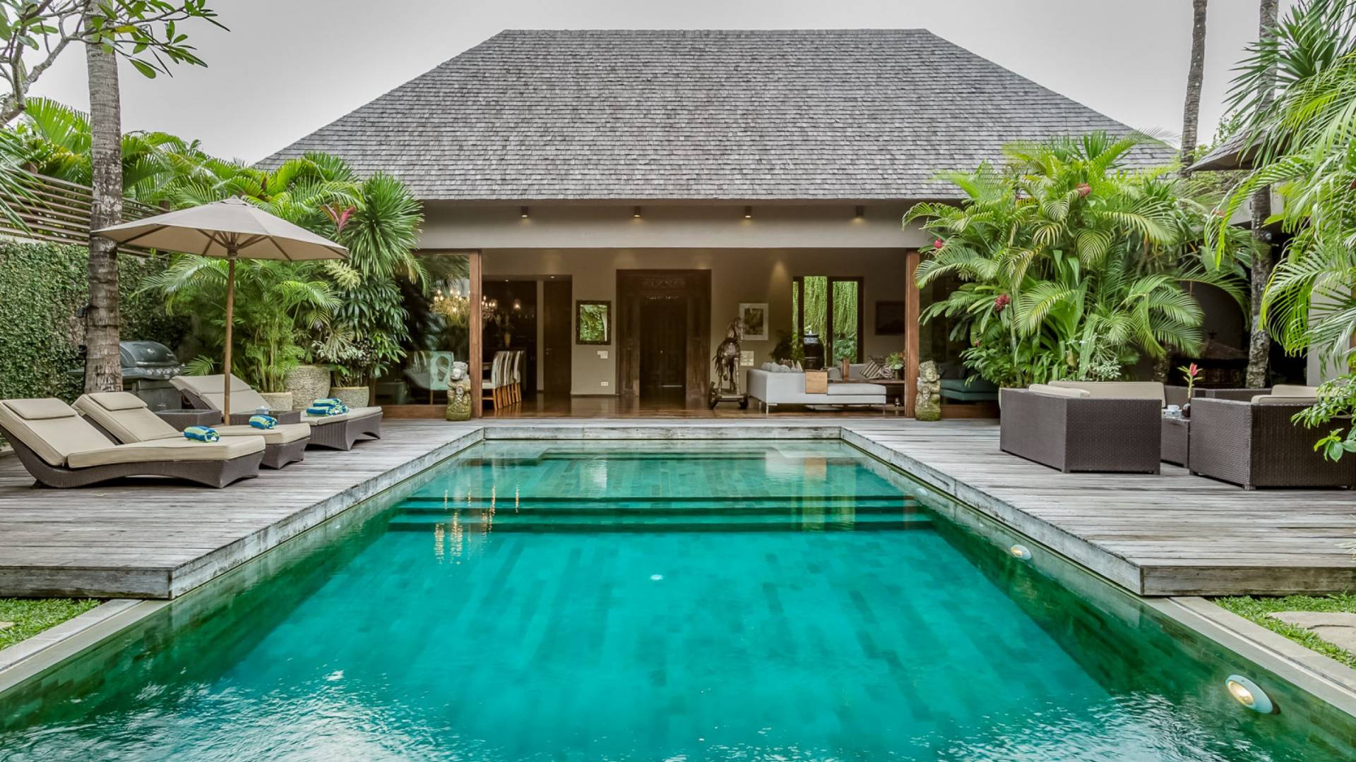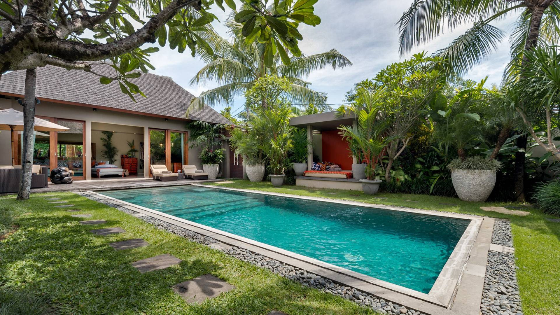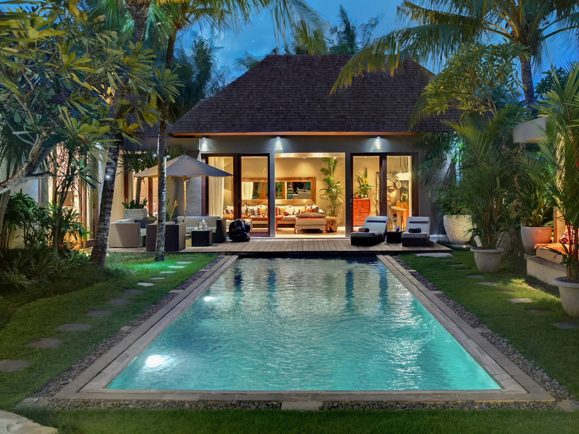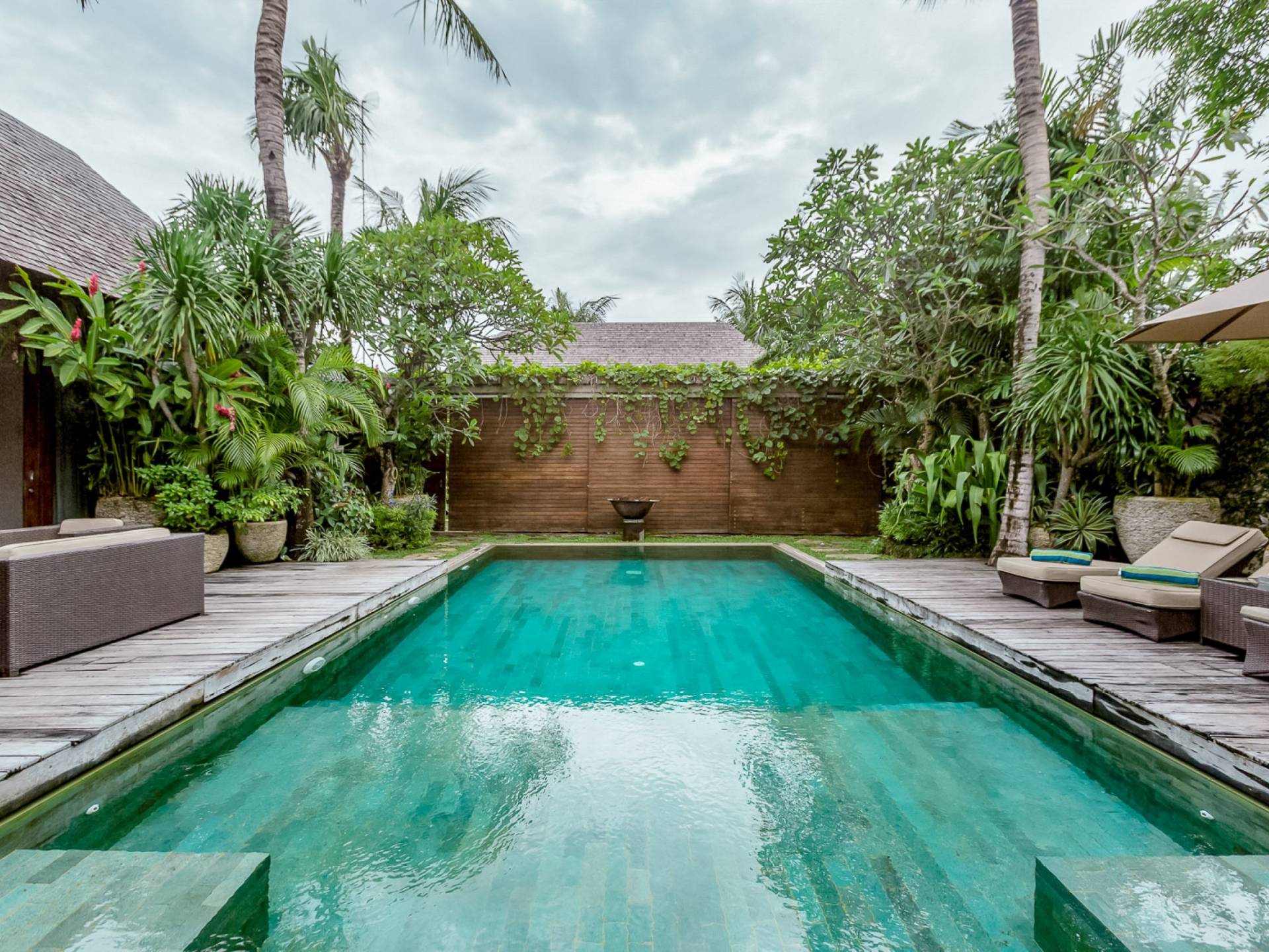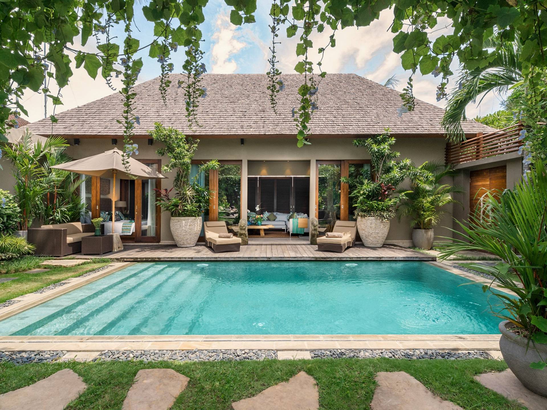 Eshara Estate Seminyak è un grande complesso di tre ville completamente attrezzato, situato in una strada tranquilla e silenziosa a soli 300 metri dalla spiaggia, dai negozi e dai ristoranti del centro di Seminyak. Questa versatile proprietà tre in uno offre la scelta di un'opzione di affitto di 8, 5, 3 o 2 camere da letto grazie a un intelligente sistema di porte scorrevoli e ingressi separati. Ogni villa ha un soggiorno e una sala da pranzo glamour e una cucina integrata, mentre ogni camera da letto con bagno privato ha un letto king-size, uno spogliatoio e un lettore TV/DVD. Ci sono anche tre piscine immerse in giardini tropicali completi di alberi di frangipani, palme da cocco, lettini prendisole e ponti in legno.