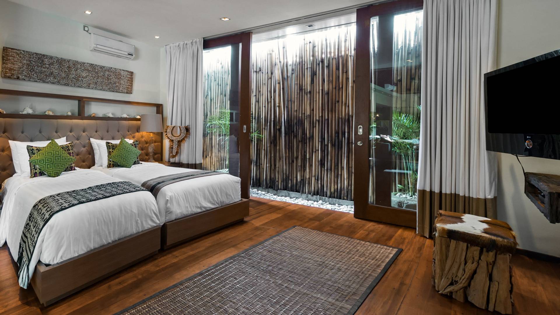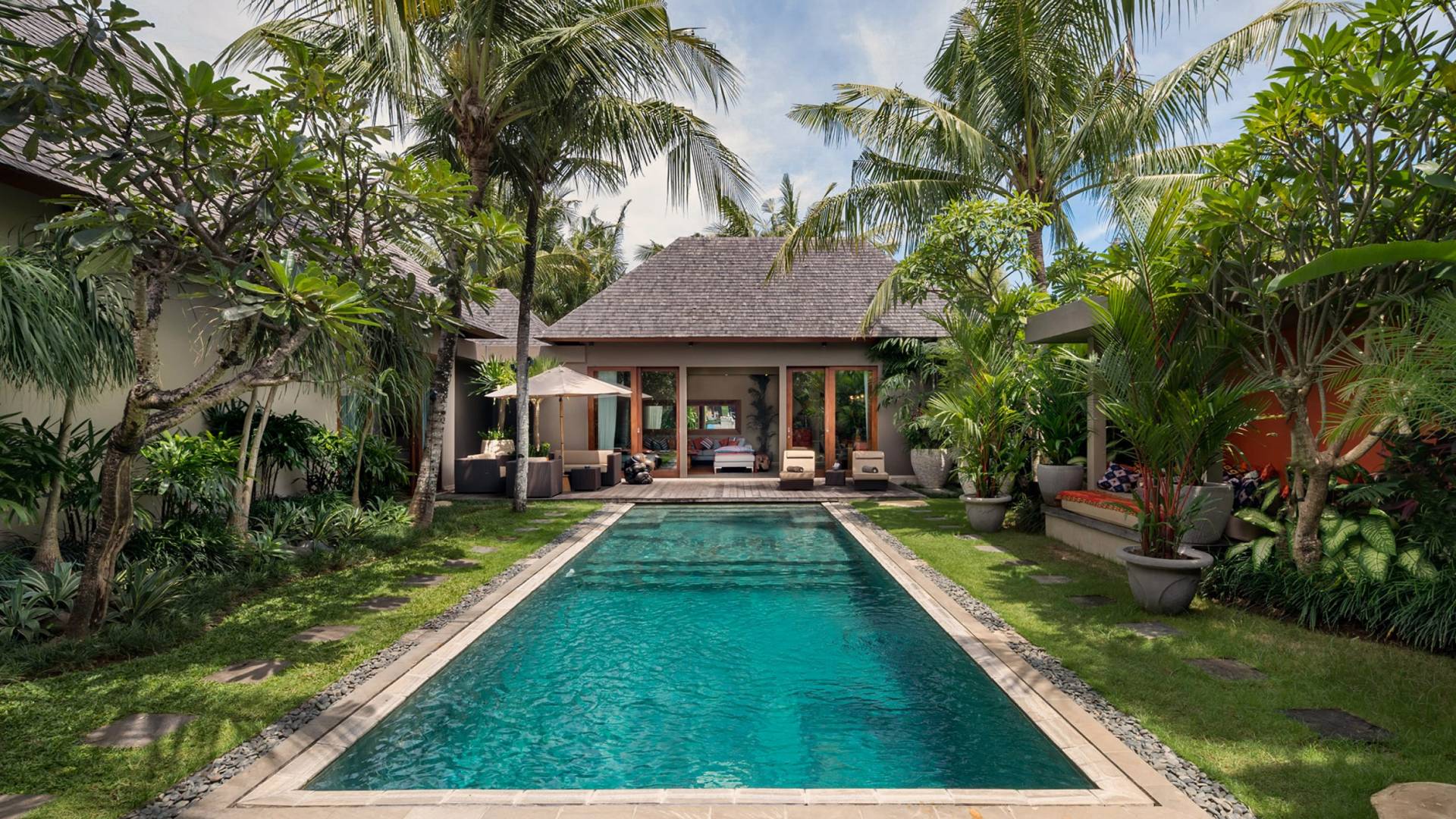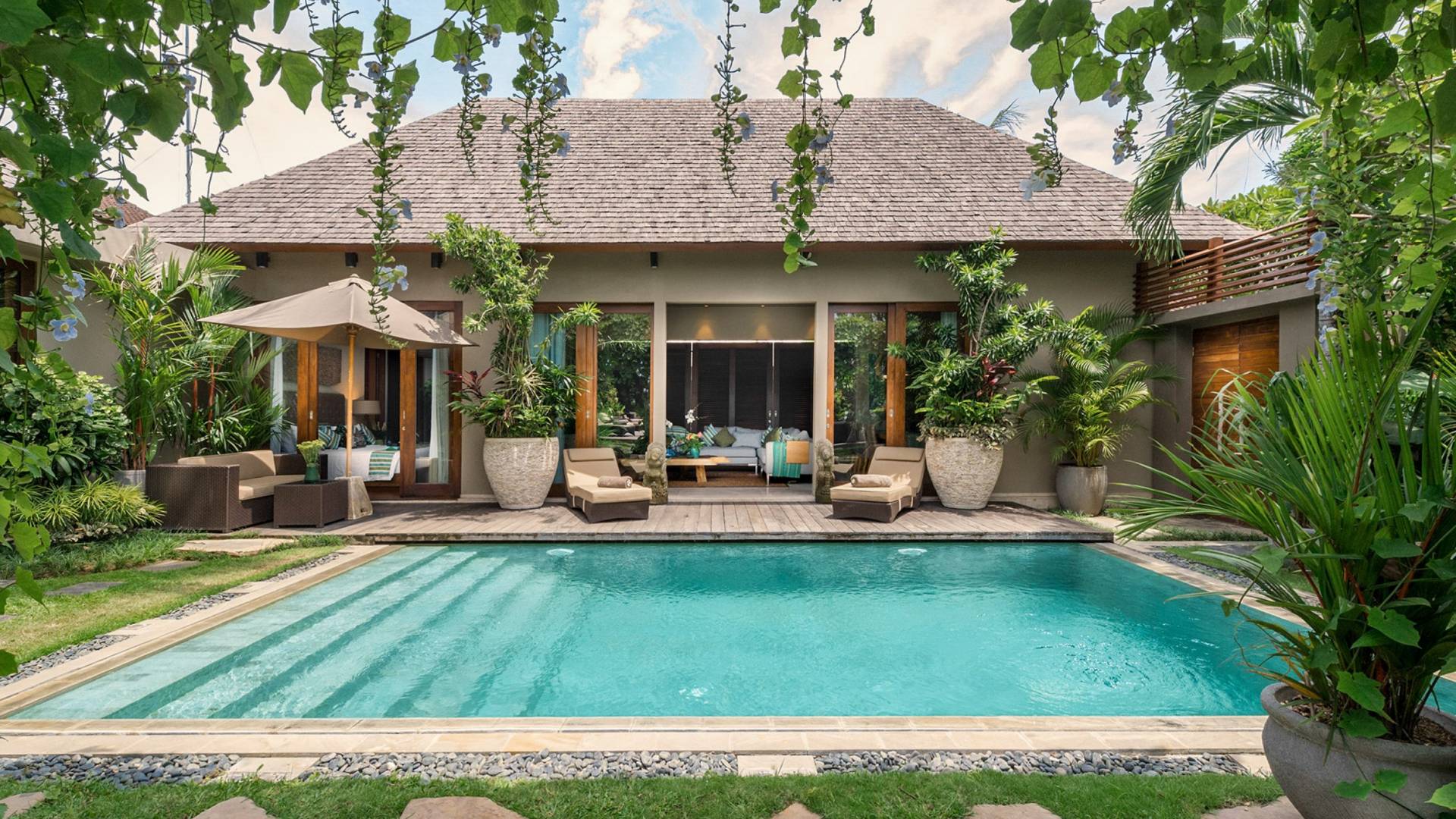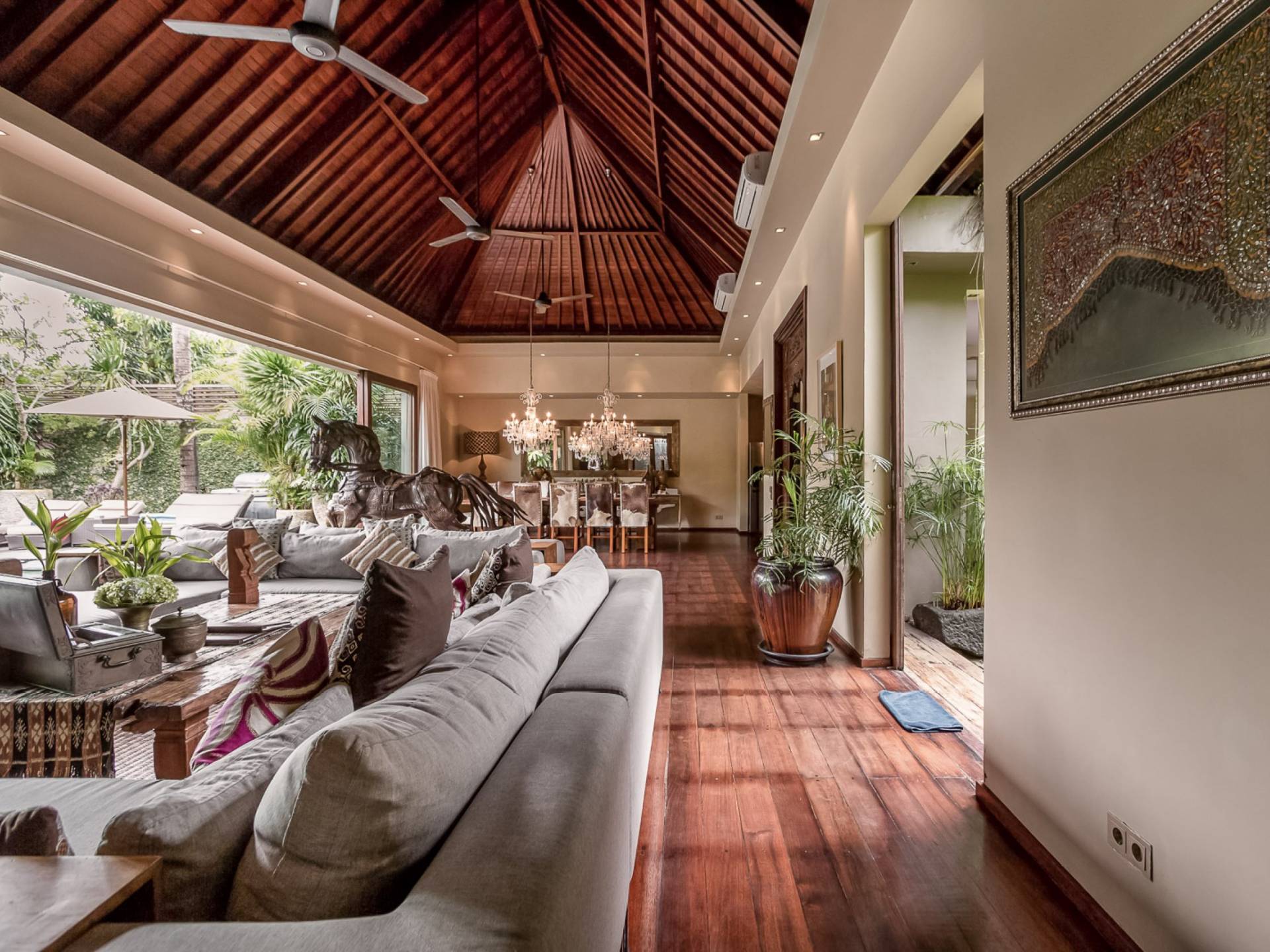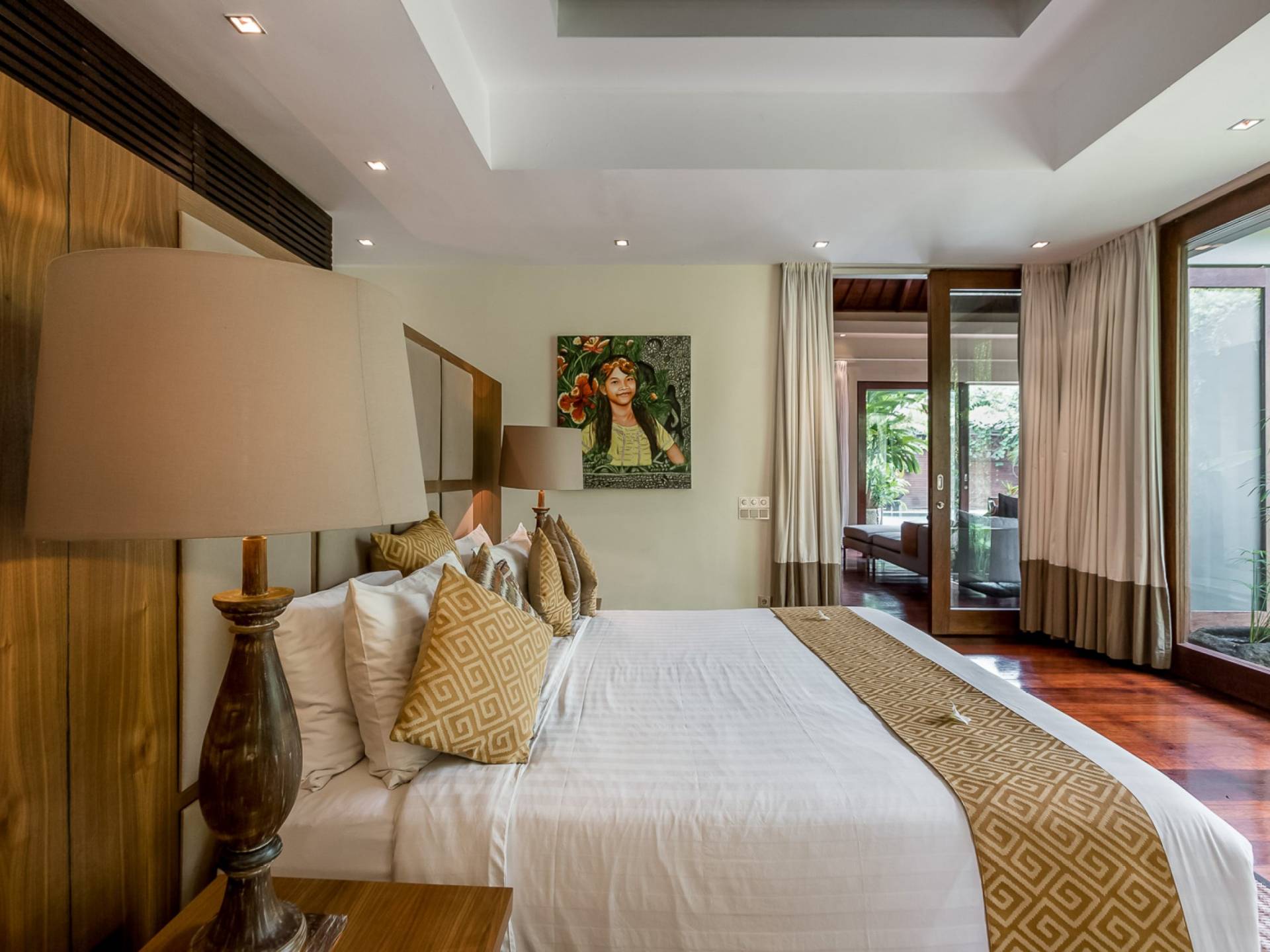 Eshara Estate Seminyak è un grande complesso di tre ville completamente attrezzato, situato in una strada tranquilla e silenziosa a soli 300 metri dalla spiaggia, dai negozi e dai ristoranti del centro di Seminyak. Questa versatile proprietà tre in uno offre la scelta di un'opzione di affitto di 8, 5, 3 o 2 camere da letto grazie a un intelligente sistema di porte scorrevoli e ingressi separati. Ogni villa ha un soggiorno e una sala da pranzo glamour e una cucina integrata, mentre ogni camera da letto con bagno privato ha un letto king-size, uno spogliatoio e un lettore TV/DVD. Ci sono anche tre piscine immerse in giardini tropicali completi di alberi di frangipani, palme da cocco, lettini prendisole e ponti in legno.