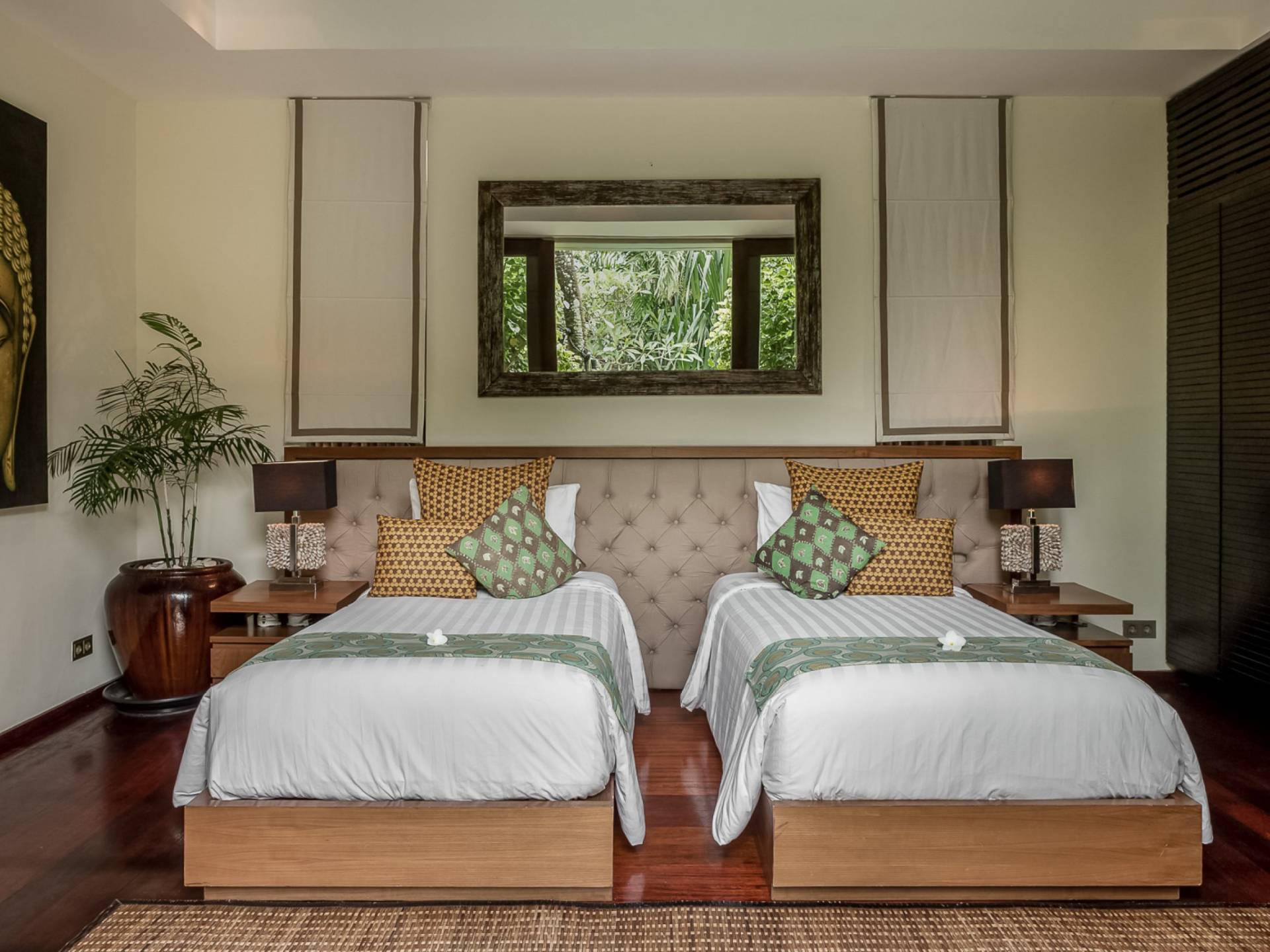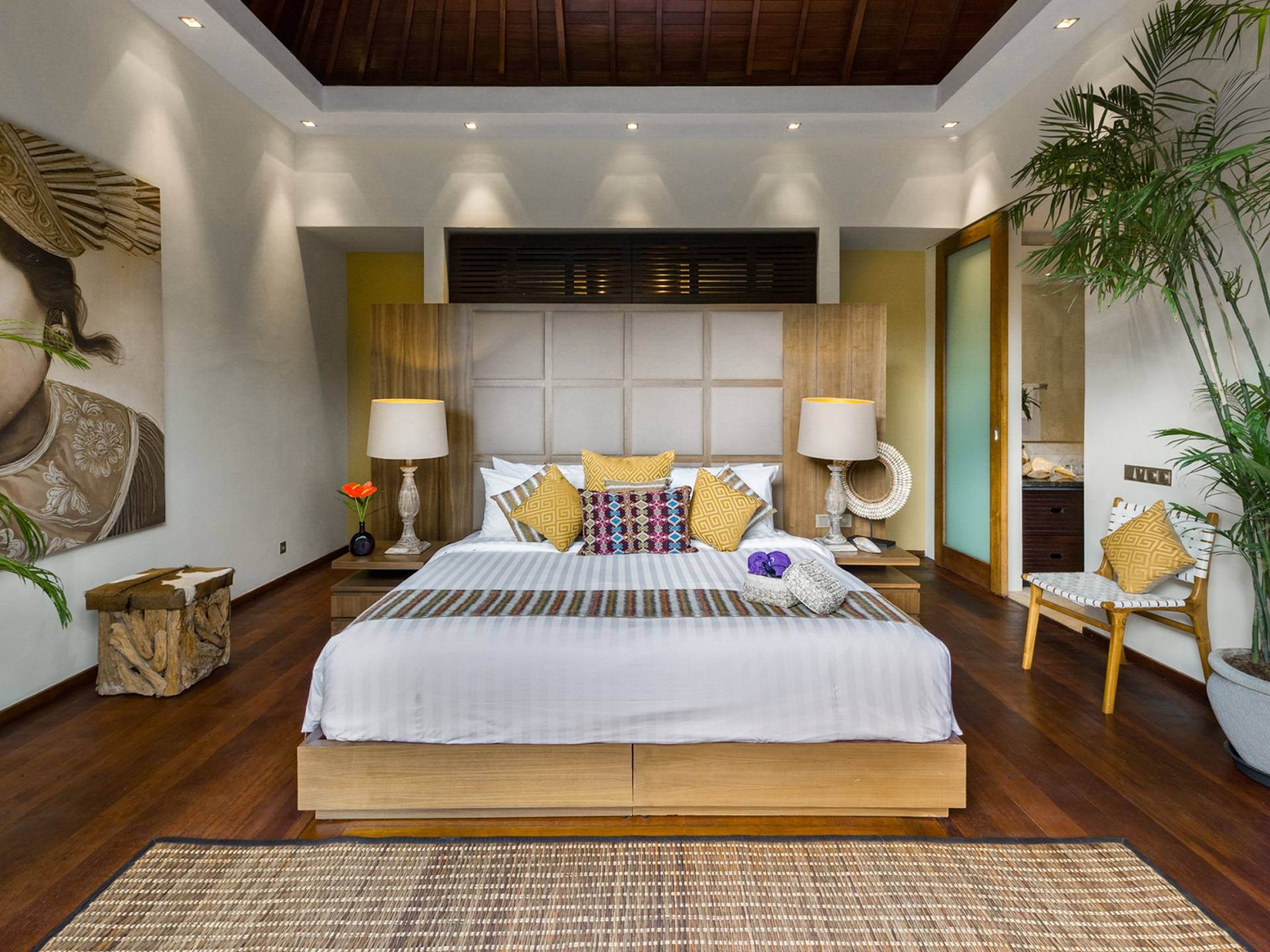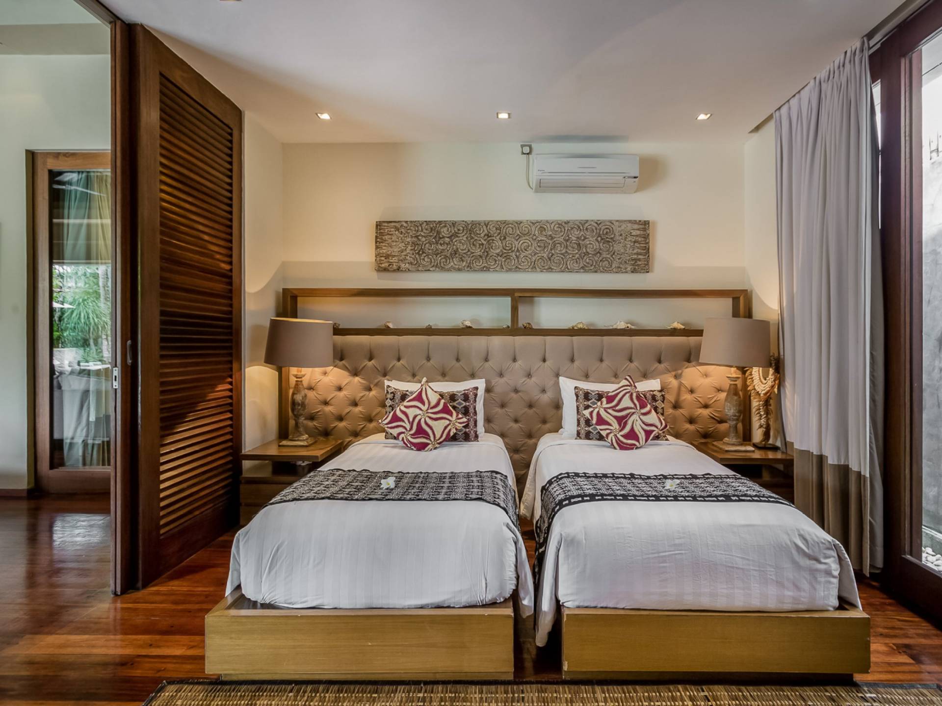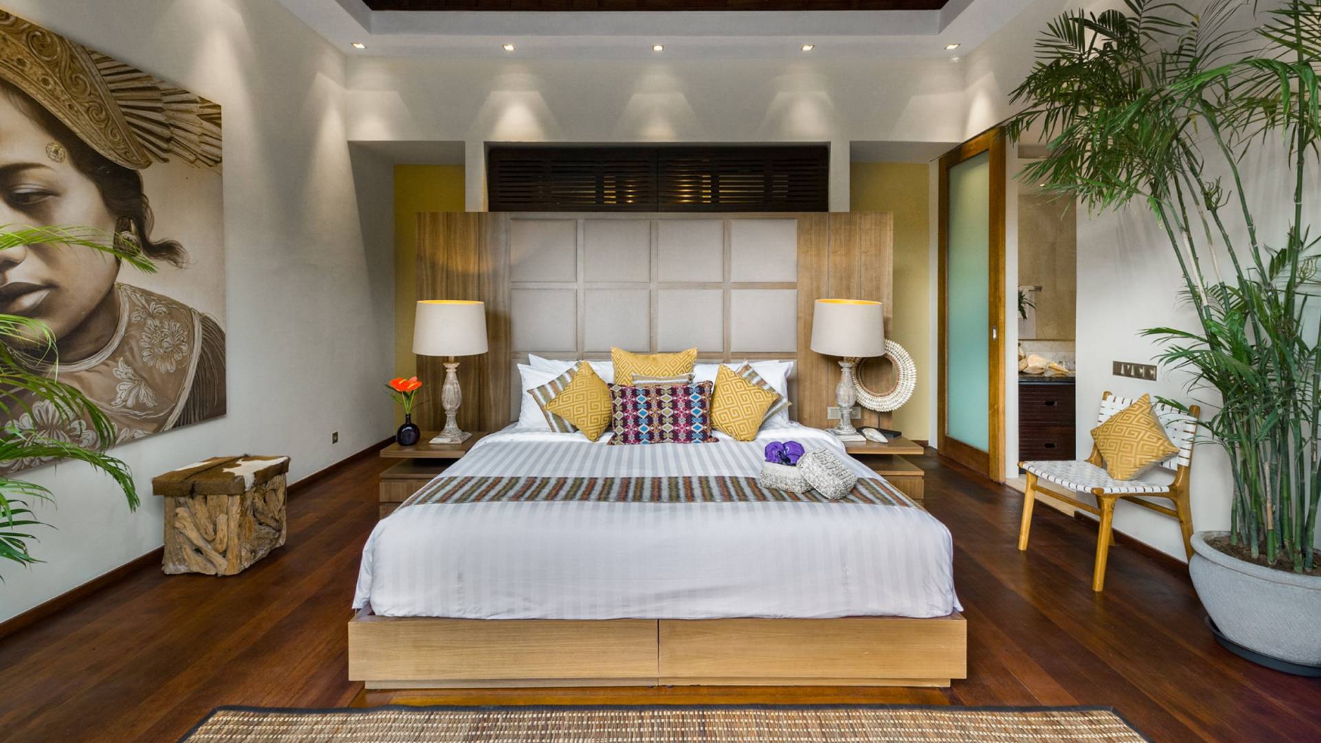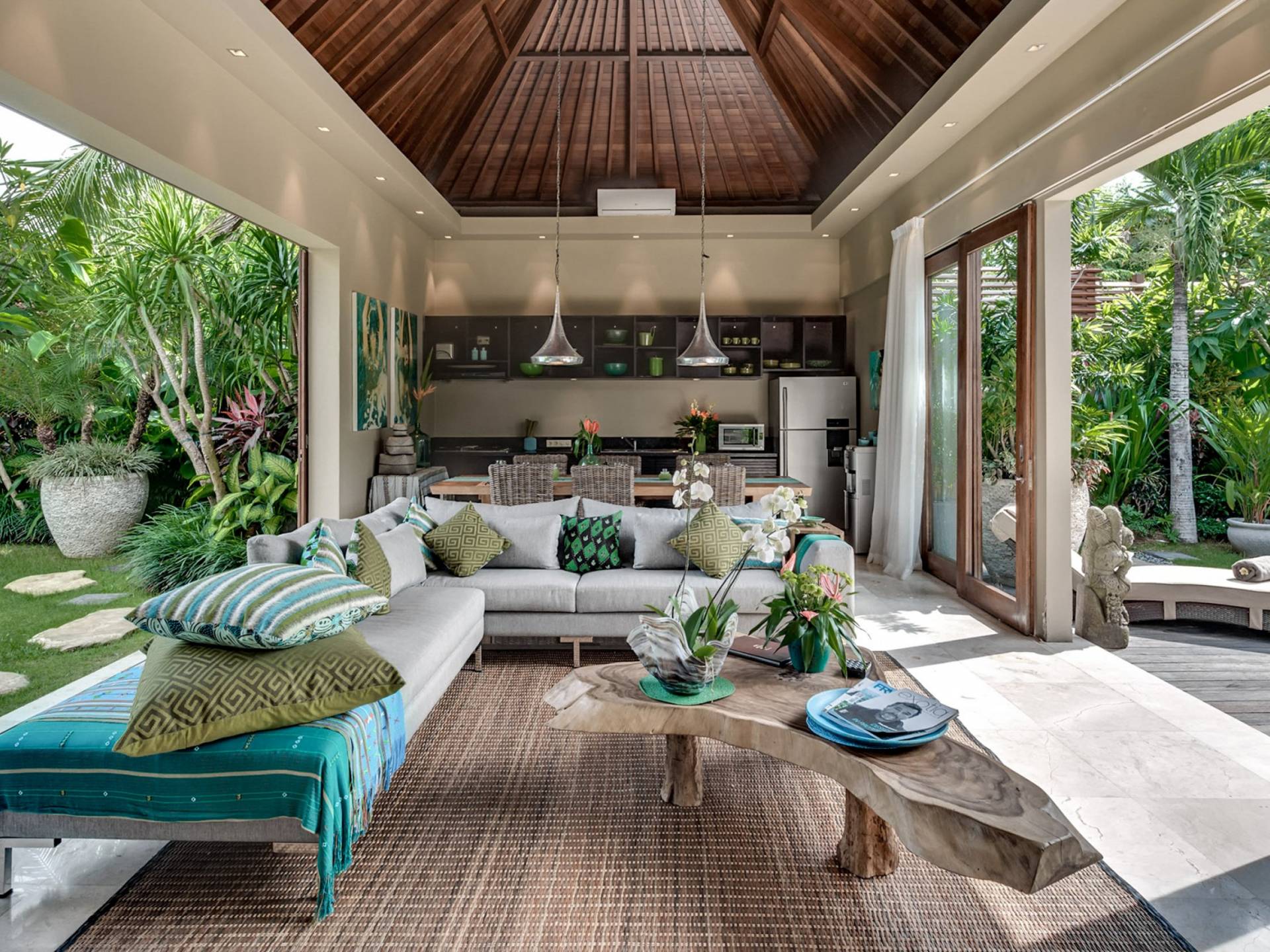 Eshara Estate Seminyak è un grande complesso di tre ville completamente attrezzato, situato in una strada tranquilla e silenziosa a soli 300 metri dalla spiaggia, dai negozi e dai ristoranti del centro di Seminyak. Questa versatile proprietà tre in uno offre la scelta di un'opzione di affitto di 8, 5, 3 o 2 camere da letto grazie a un intelligente sistema di porte scorrevoli e ingressi separati. Ogni villa ha un soggiorno e una sala da pranzo glamour e una cucina integrata, mentre ogni camera da letto con bagno privato ha un letto king-size, uno spogliatoio e un lettore TV/DVD. Ci sono anche tre piscine immerse in giardini tropicali completi di alberi di frangipani, palme da cocco, lettini prendisole e ponti in legno.