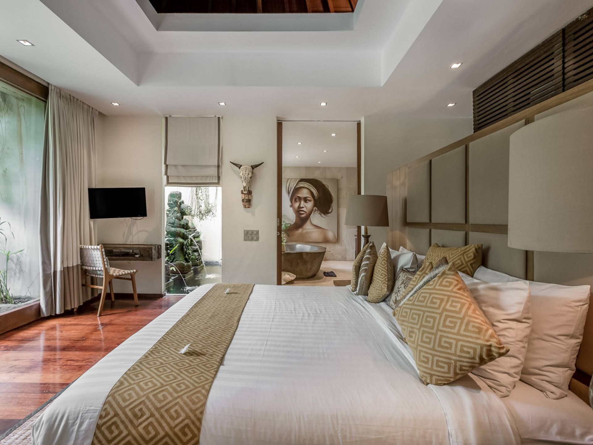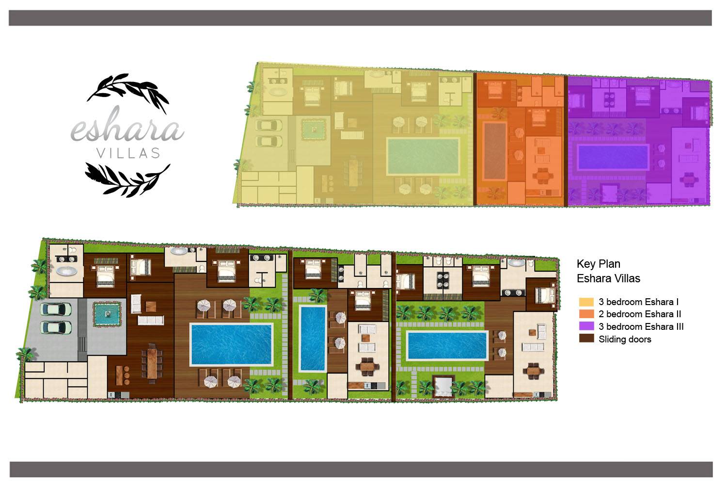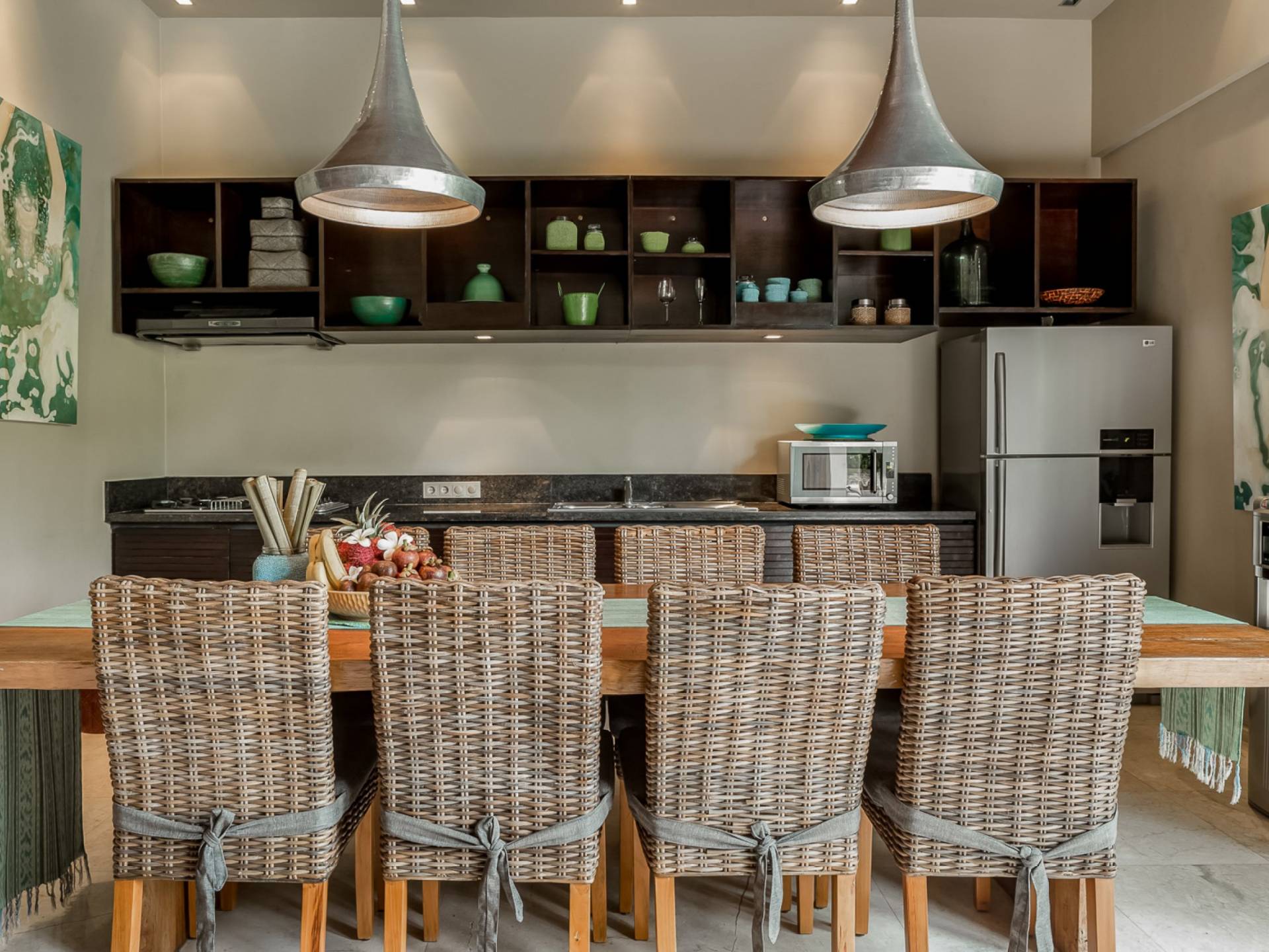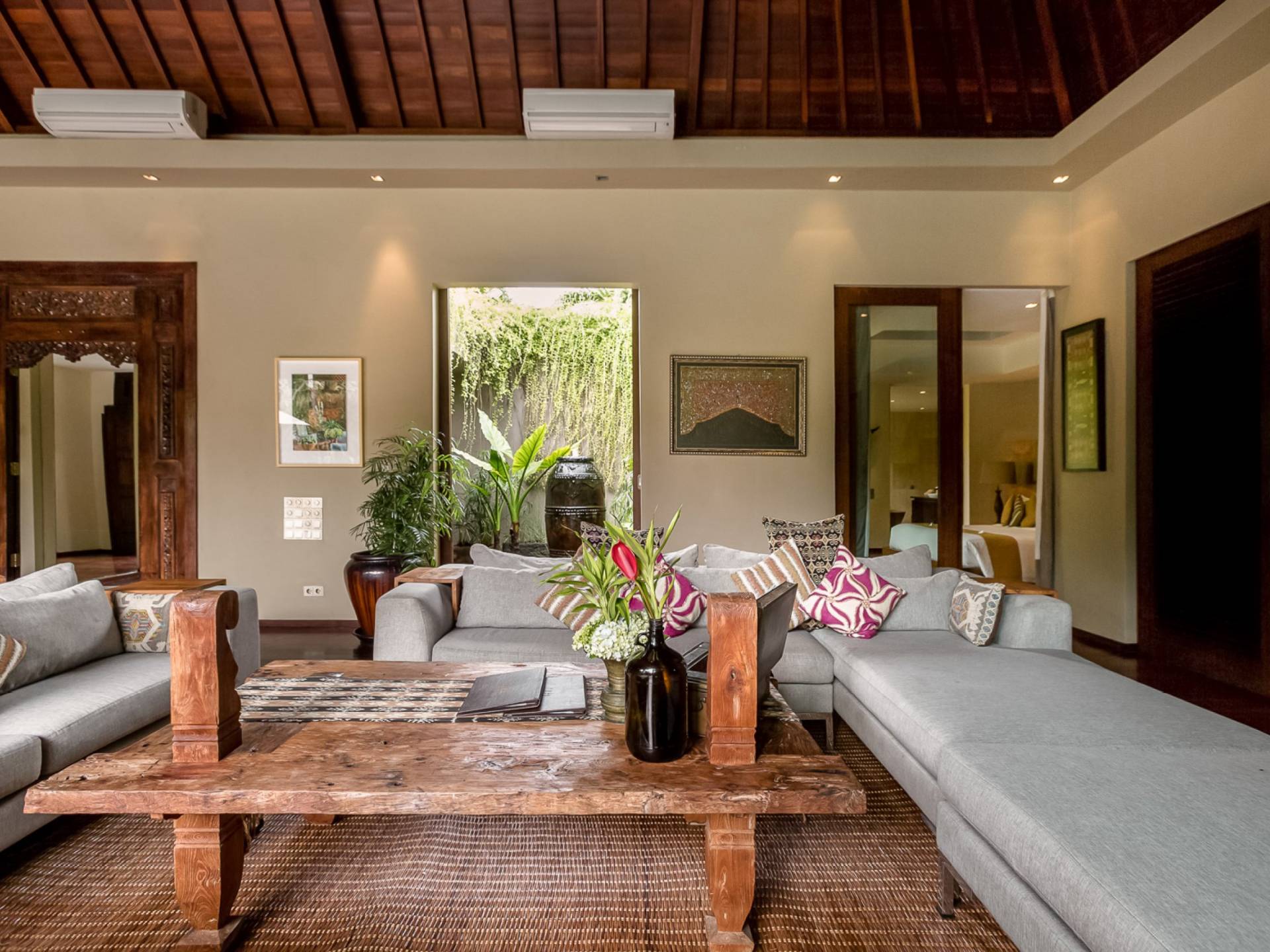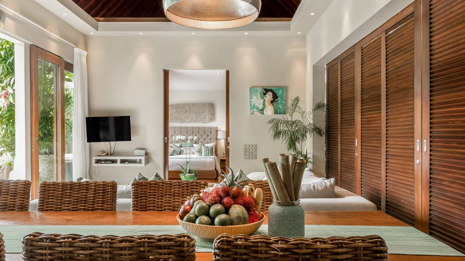 Eshara Estate Seminyak è un grande complesso di tre ville completamente attrezzato, situato in una strada tranquilla e silenziosa a soli 300 metri dalla spiaggia, dai negozi e dai ristoranti del centro di Seminyak. Questa versatile proprietà tre in uno offre la scelta di un'opzione di affitto di 8, 5, 3 o 2 camere da letto grazie a un intelligente sistema di porte scorrevoli e ingressi separati. Ogni villa ha un soggiorno e una sala da pranzo glamour e una cucina integrata, mentre ogni camera da letto con bagno privato ha un letto king-size, uno spogliatoio e un lettore TV/DVD. Ci sono anche tre piscine immerse in giardini tropicali completi di alberi di frangipani, palme da cocco, lettini prendisole e ponti in legno.