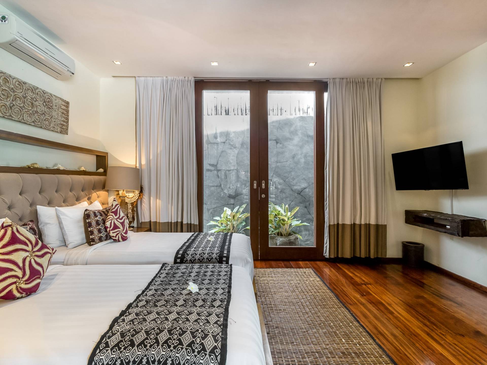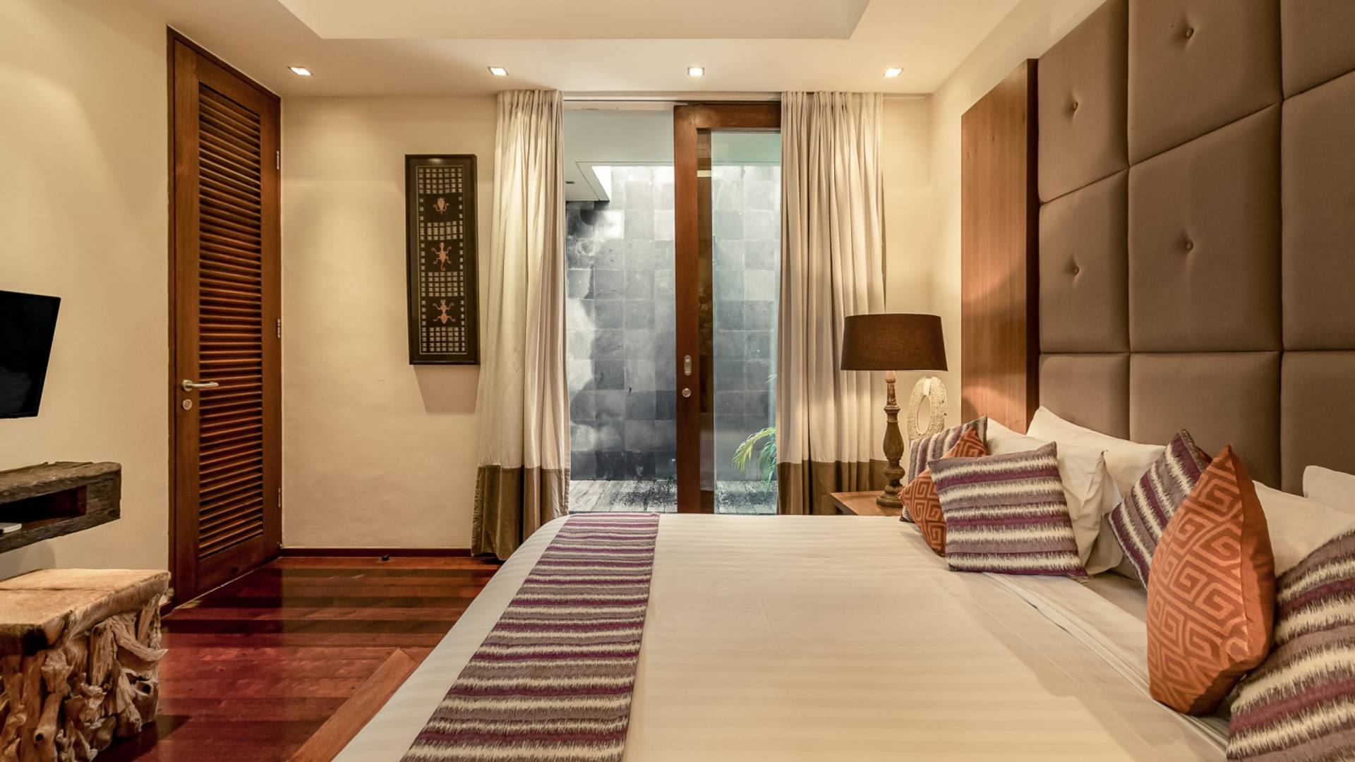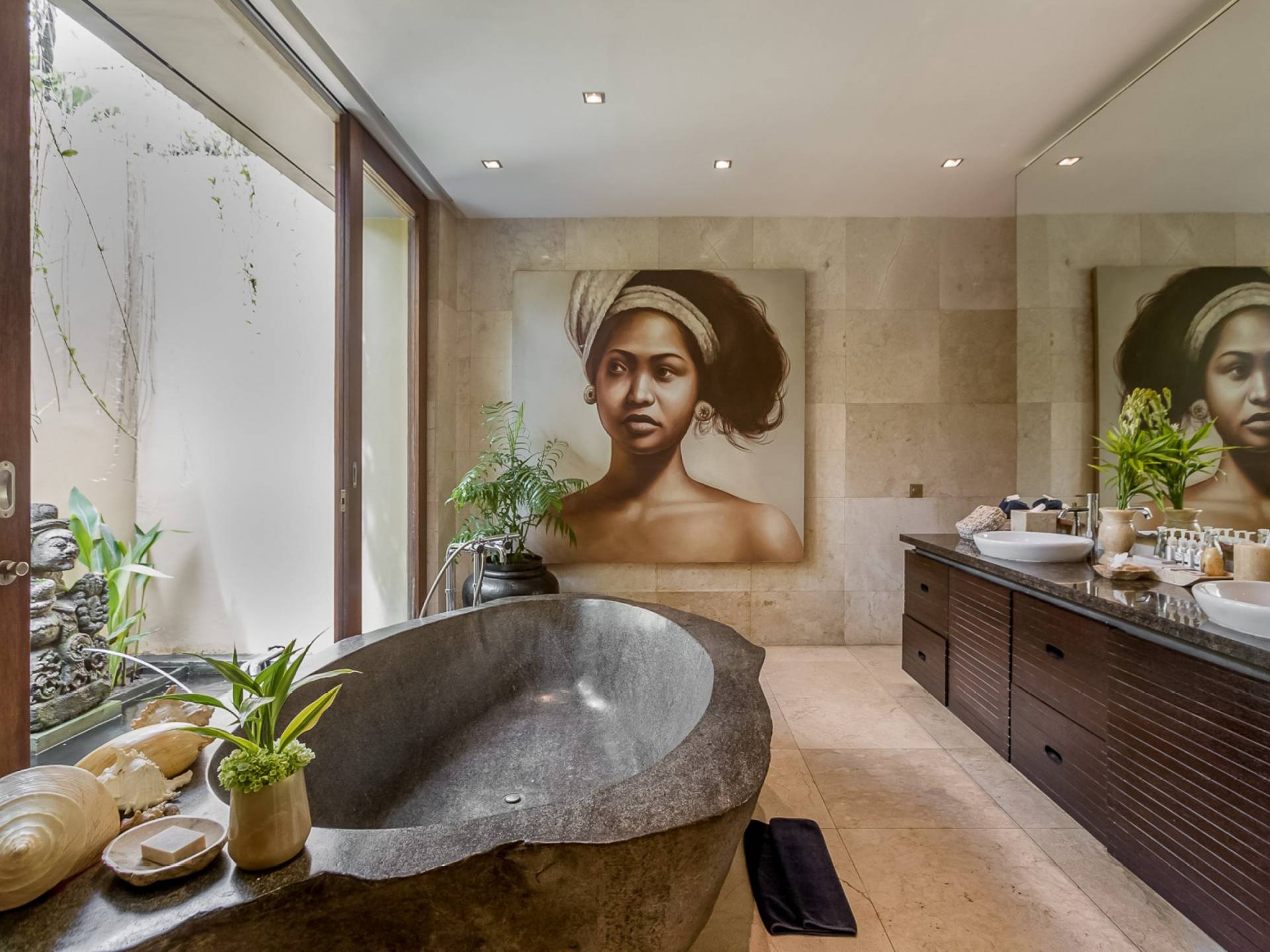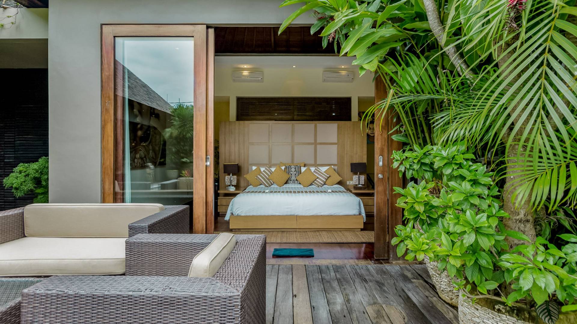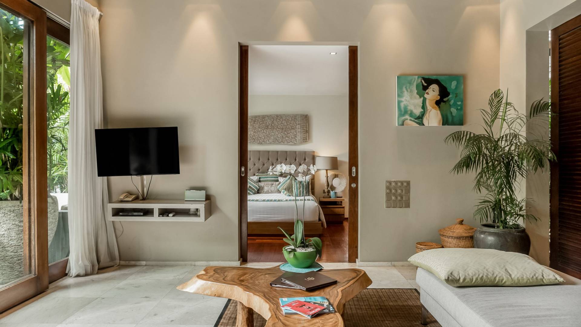 Eshara Estate Seminyak è un grande complesso di tre ville completamente attrezzato, situato in una strada tranquilla e silenziosa a soli 300 metri dalla spiaggia, dai negozi e dai ristoranti del centro di Seminyak. Questa versatile proprietà tre in uno offre la scelta di un'opzione di affitto di 8, 5, 3 o 2 camere da letto grazie a un intelligente sistema di porte scorrevoli e ingressi separati. Ogni villa ha un soggiorno e una sala da pranzo glamour e una cucina integrata, mentre ogni camera da letto con bagno privato ha un letto king-size, uno spogliatoio e un lettore TV/DVD. Ci sono anche tre piscine immerse in giardini tropicali completi di alberi di frangipani, palme da cocco, lettini prendisole e ponti in legno.