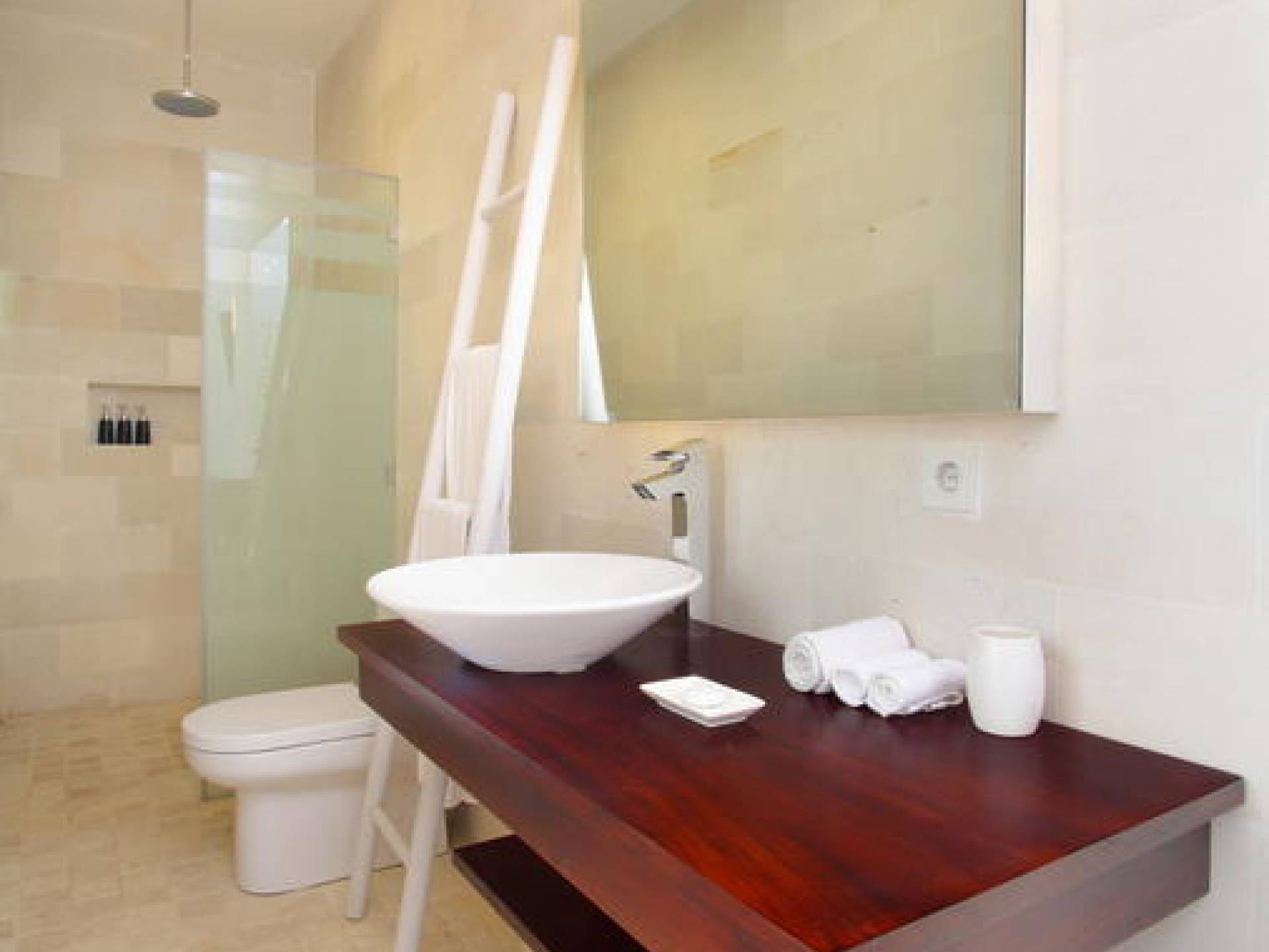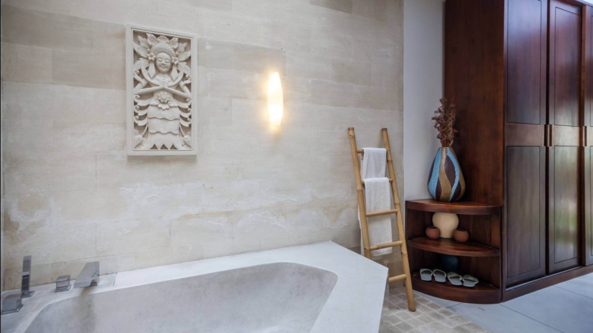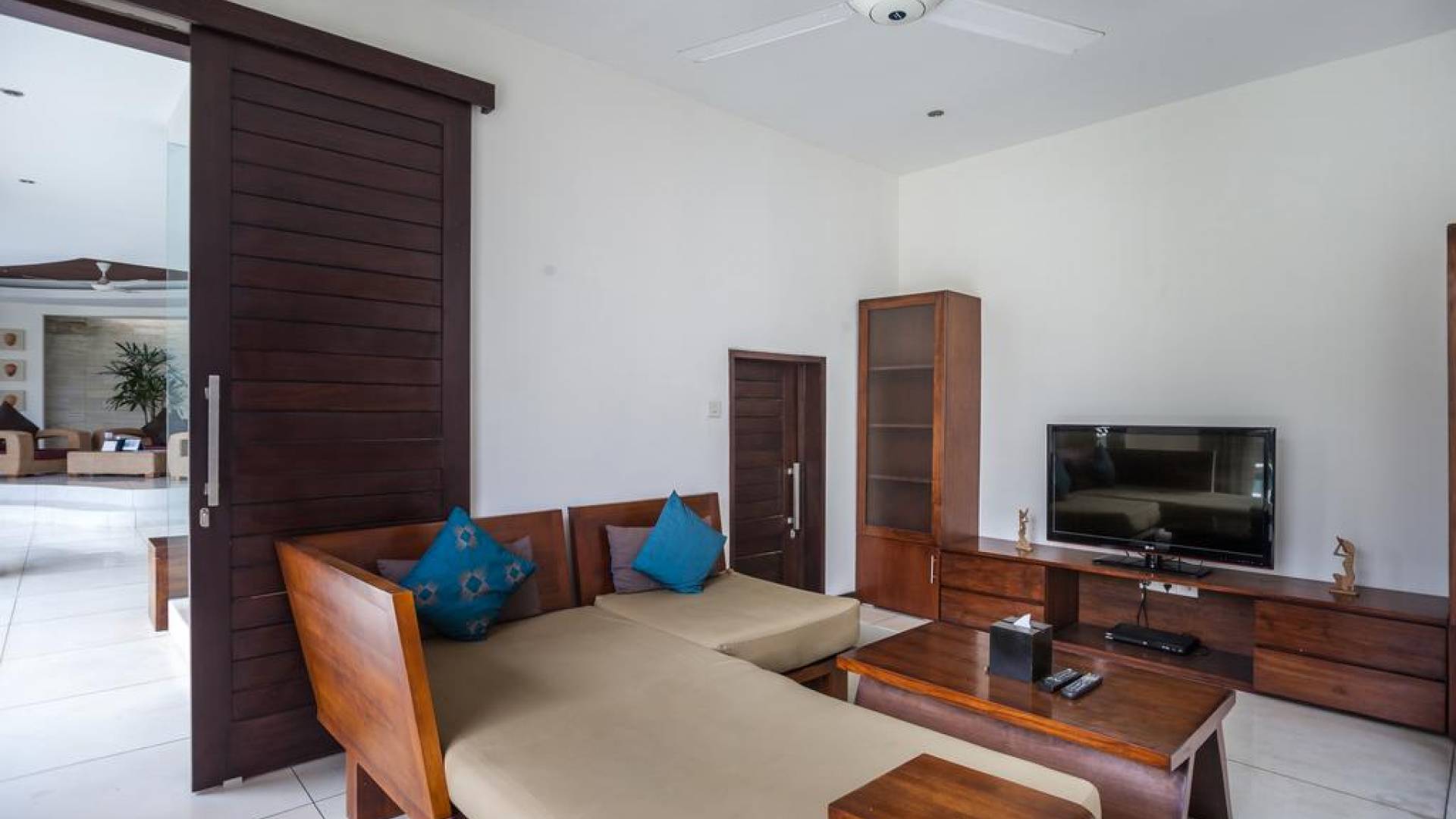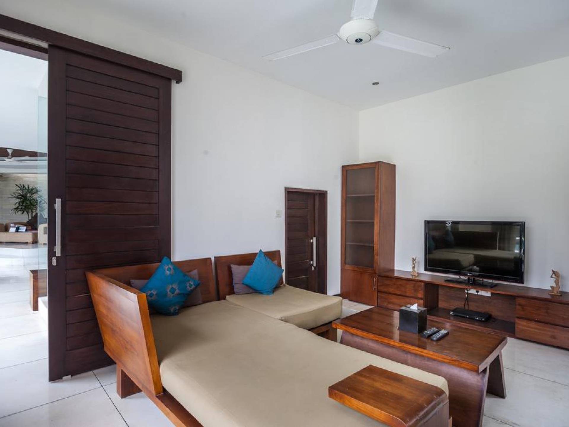 All'interno dell'edificio principale, il pianterreno semi-aperto rivela un'area soggiorno-pranzo a pianta aperta, completa di una cucina completamente attrezzata con gli elettrodomestici più recenti e un tavolo da pranzo in teak per otto persone. Adiacente qui c'è una TV/salotto completamente chiusa, oltre a un piccolo bagno con doccia. Una sontuosa e ultra-chic Master Suite occupa l'intero piano superiore, completa di una parete reversibile centrale con TV LED a schermo piatto - che offre opzioni di visione TV a letto o dall'angolo divano - mentre le generose dimensioni, en -bagno privato, con vasca in pietra incassata, conduce a una terrazza panoramica privata. Due camere da letto indipendenti più piccole, progettate in uno stile simile, sono collegate su entrambi i lati dell'edificio principale da passerelle in legno che attraversano le piscine e offrono maggiore privacy.