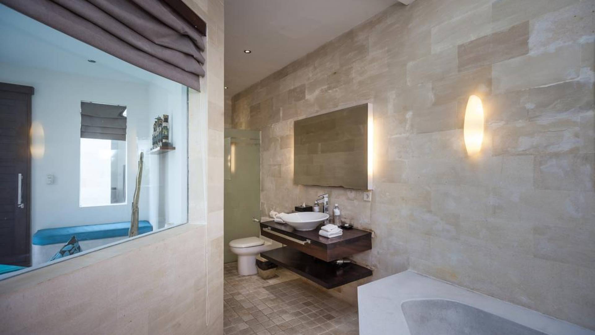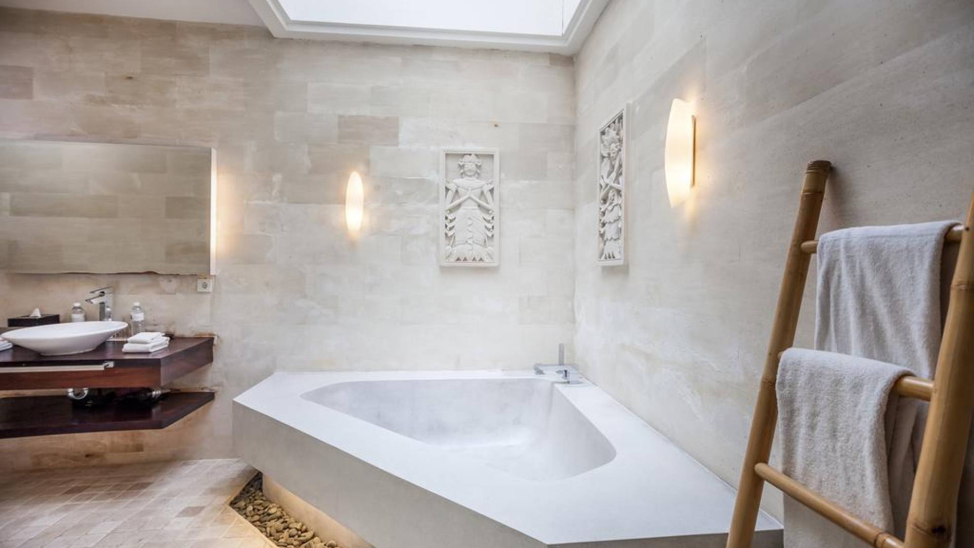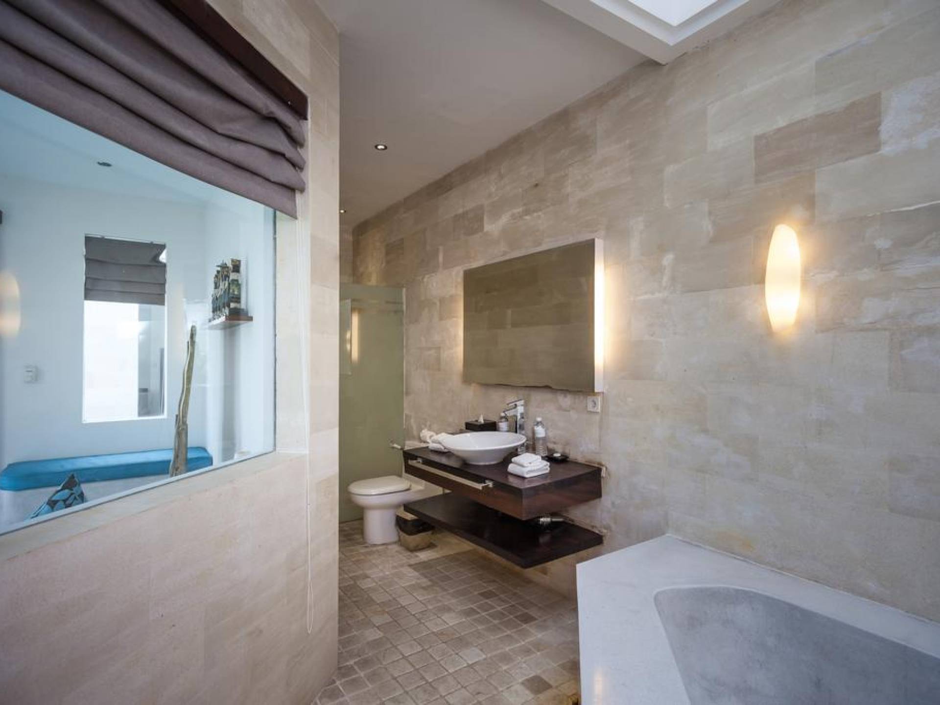 All'interno dell'edificio principale, il pianterreno semi-aperto rivela un'area soggiorno-pranzo a pianta aperta, completa di una cucina completamente attrezzata con gli elettrodomestici più recenti e un tavolo da pranzo in teak per otto persone. Adiacente qui c'è una TV/salotto completamente chiusa, oltre a un piccolo bagno con doccia. Una sontuosa e ultra-chic Master Suite occupa l'intero piano superiore, completa di una parete reversibile centrale con TV LED a schermo piatto - che offre opzioni di visione TV a letto o dall'angolo divano - mentre le generose dimensioni, en -bagno privato, con vasca in pietra incassata, conduce a una terrazza panoramica privata. Due camere da letto indipendenti più piccole, progettate in uno stile simile, sono collegate su entrambi i lati dell'edificio principale da passerelle in legno che attraversano le piscine e offrono maggiore privacy.