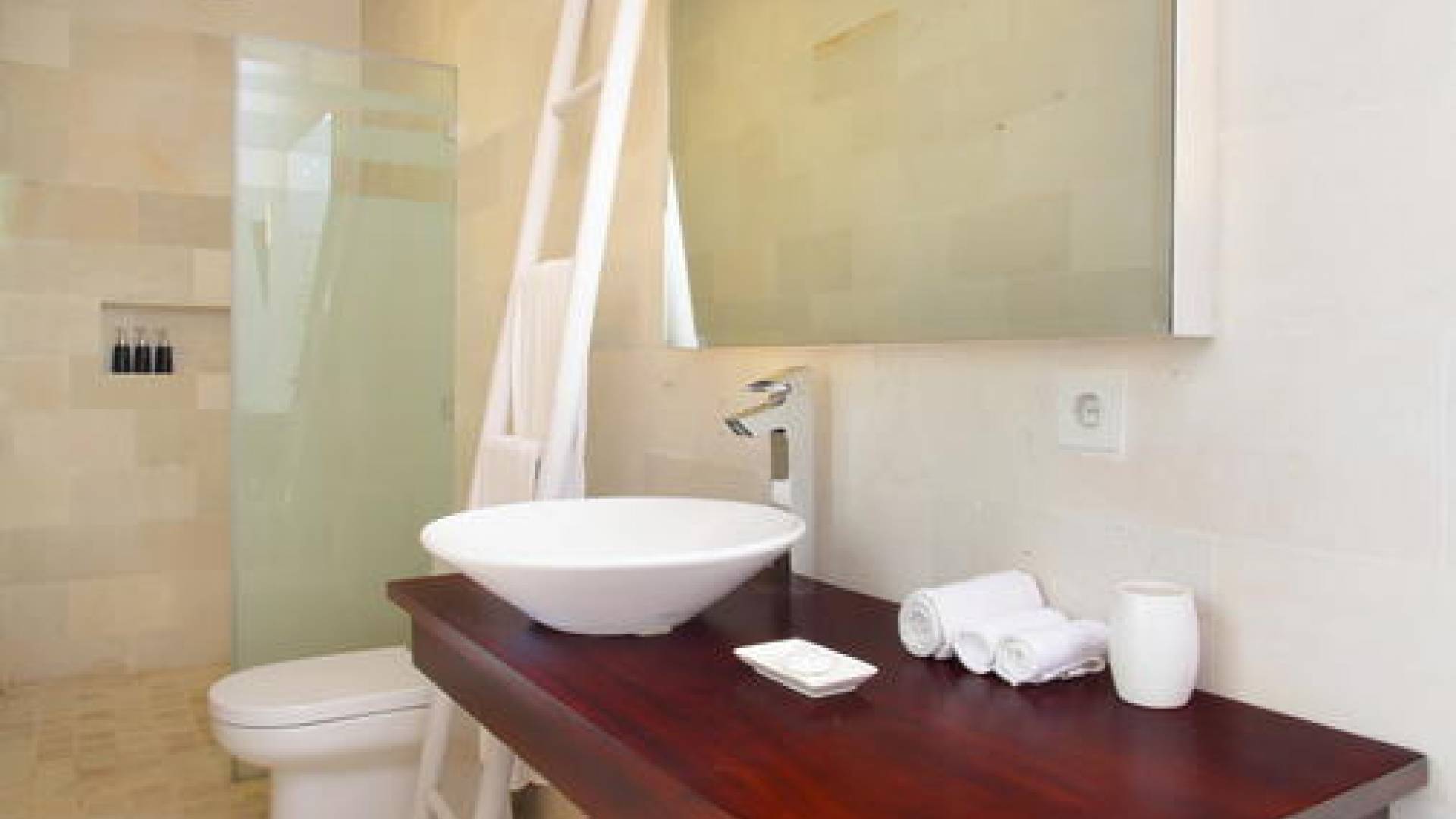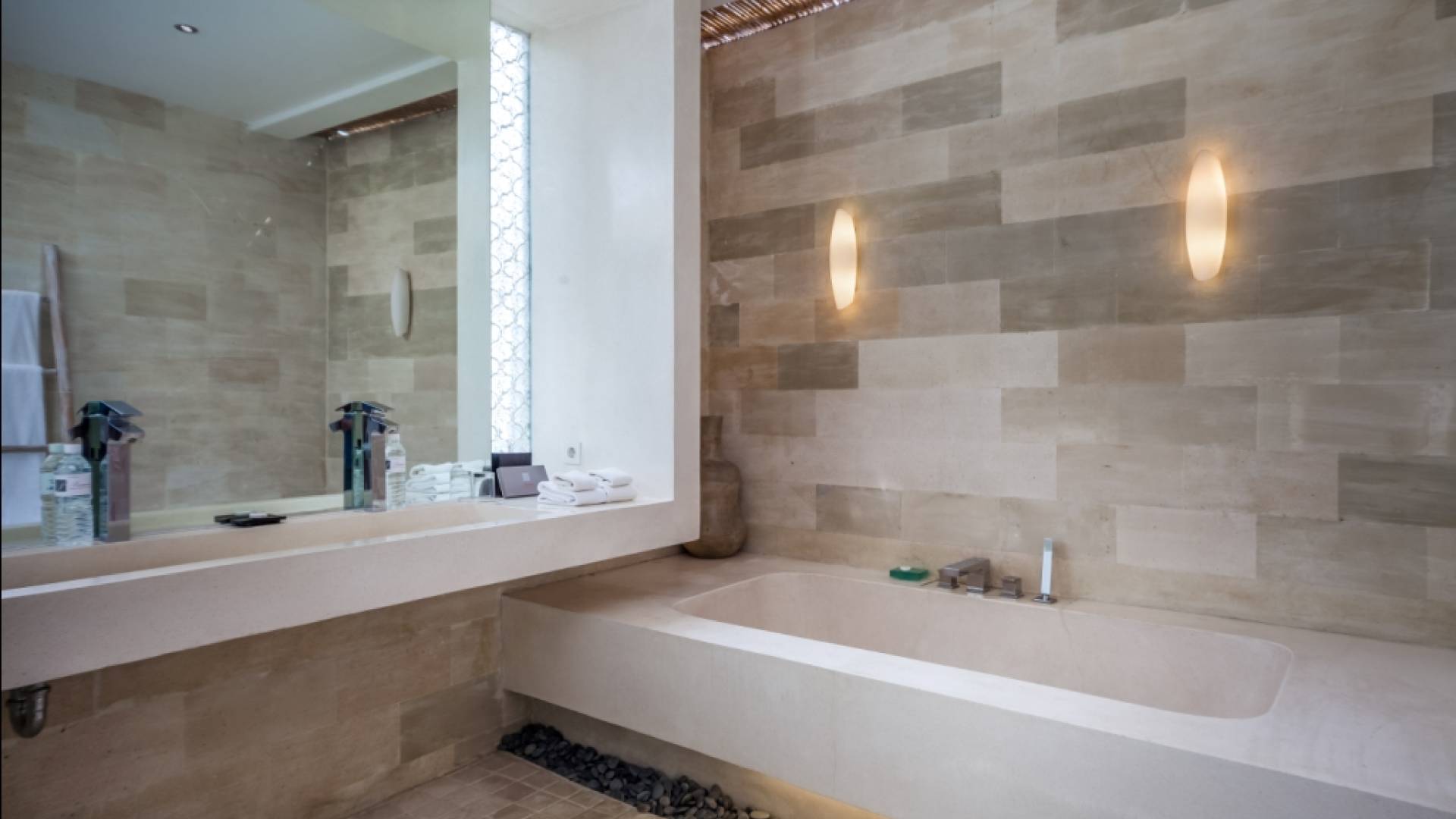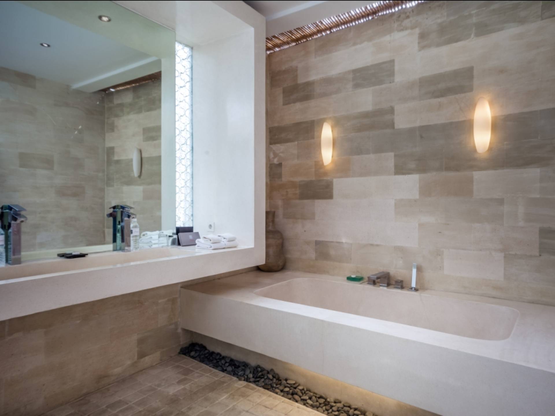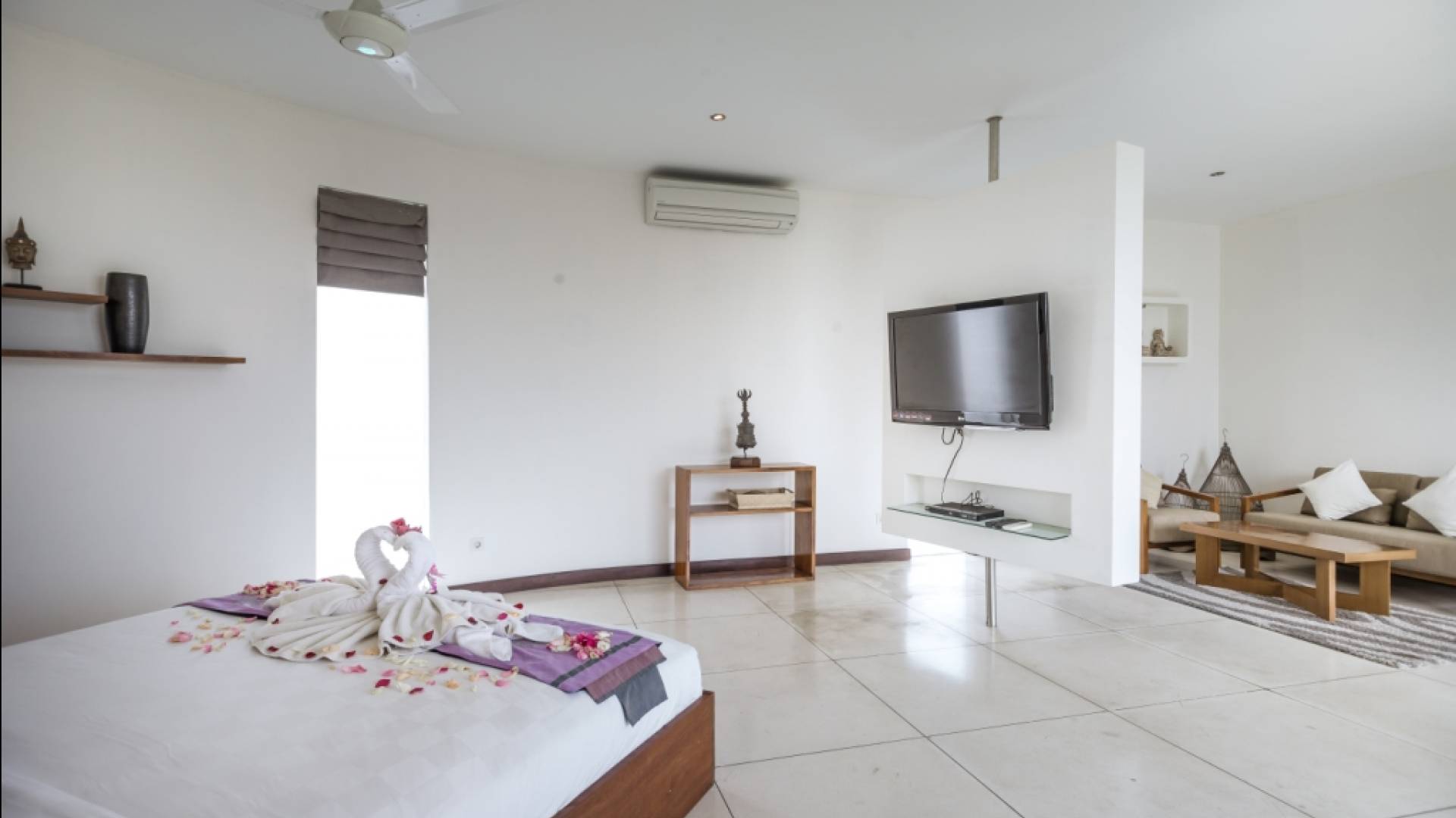 All'interno dell'edificio principale, il pianterreno semi-aperto rivela un'area soggiorno-pranzo a pianta aperta, completa di una cucina completamente attrezzata con gli elettrodomestici più recenti e un tavolo da pranzo in teak per otto persone. Adiacente qui c'è una TV/salotto completamente chiusa, oltre a un piccolo bagno con doccia. Una sontuosa e ultra-chic Master Suite occupa l'intero piano superiore, completa di una parete reversibile centrale con TV LED a schermo piatto - che offre opzioni di visione TV a letto o dall'angolo divano - mentre le generose dimensioni, en -bagno privato, con vasca in pietra incassata, conduce a una terrazza panoramica privata. Due camere da letto indipendenti più piccole, progettate in uno stile simile, sono collegate su entrambi i lati dell'edificio principale da passerelle in legno che attraversano le piscine e offrono maggiore privacy.