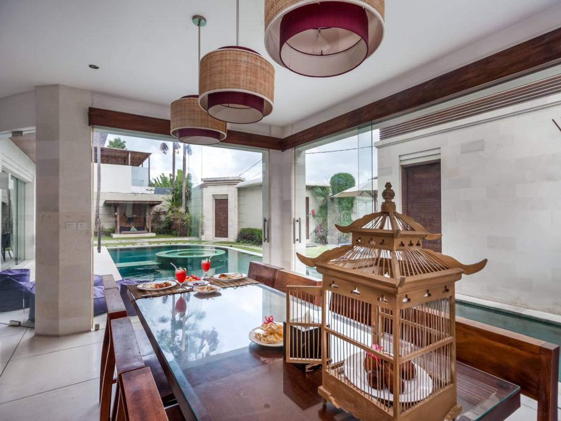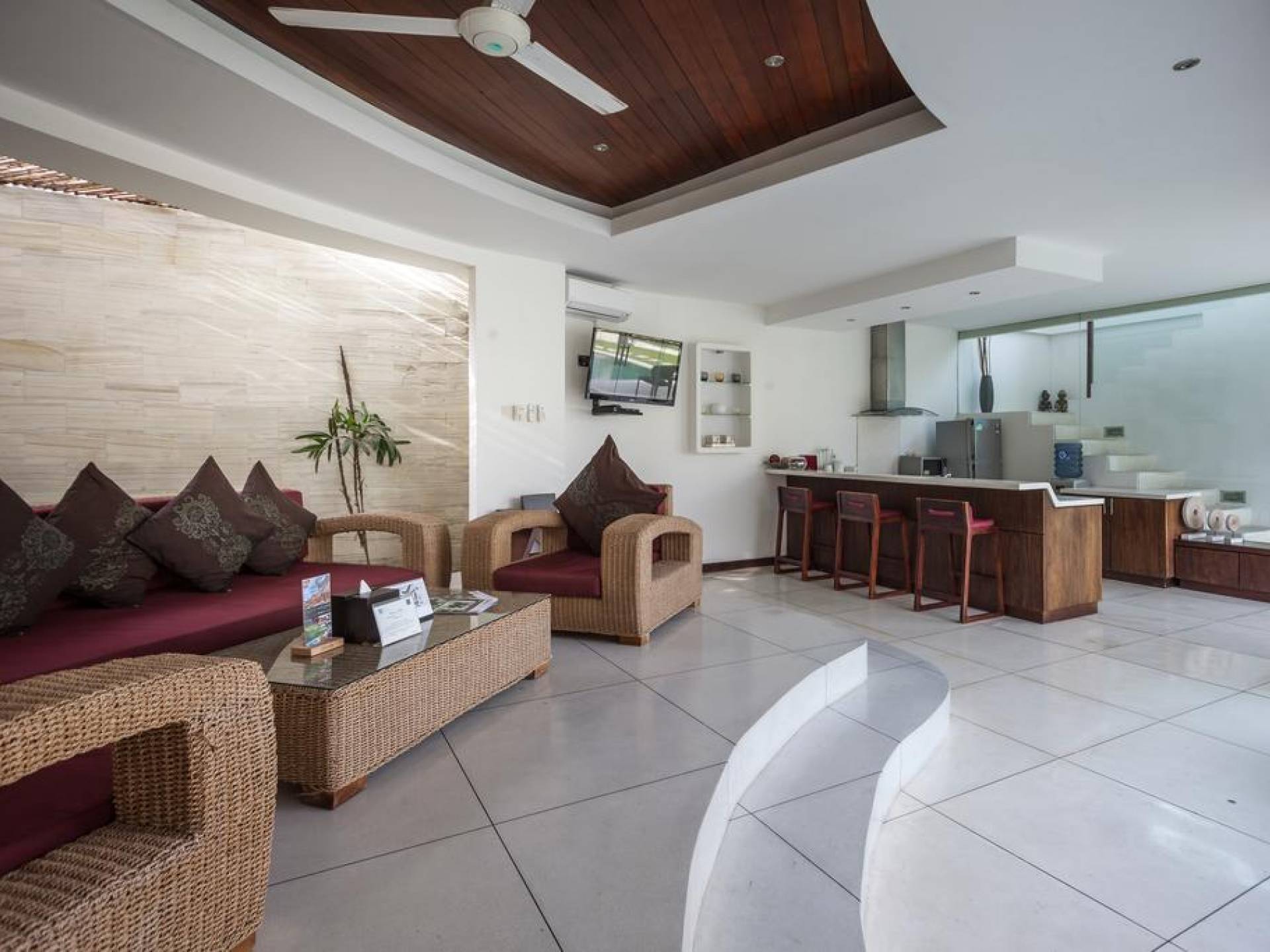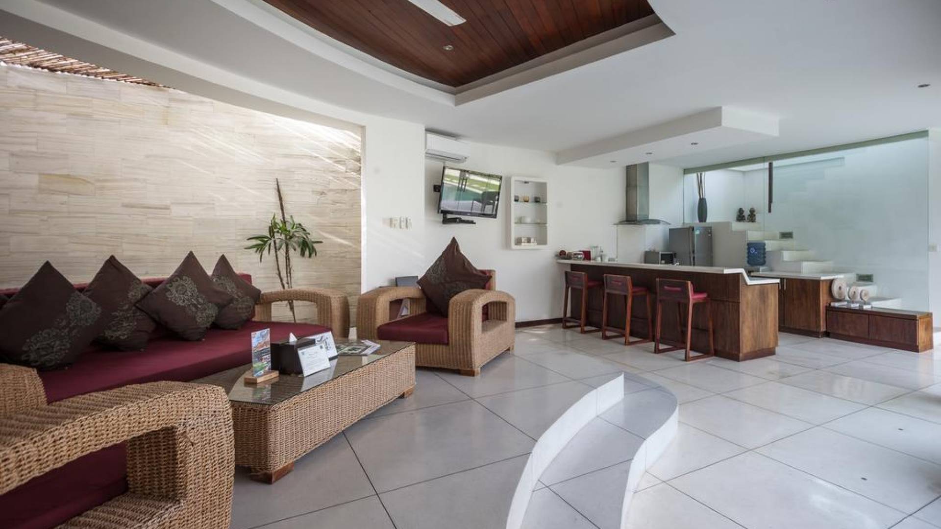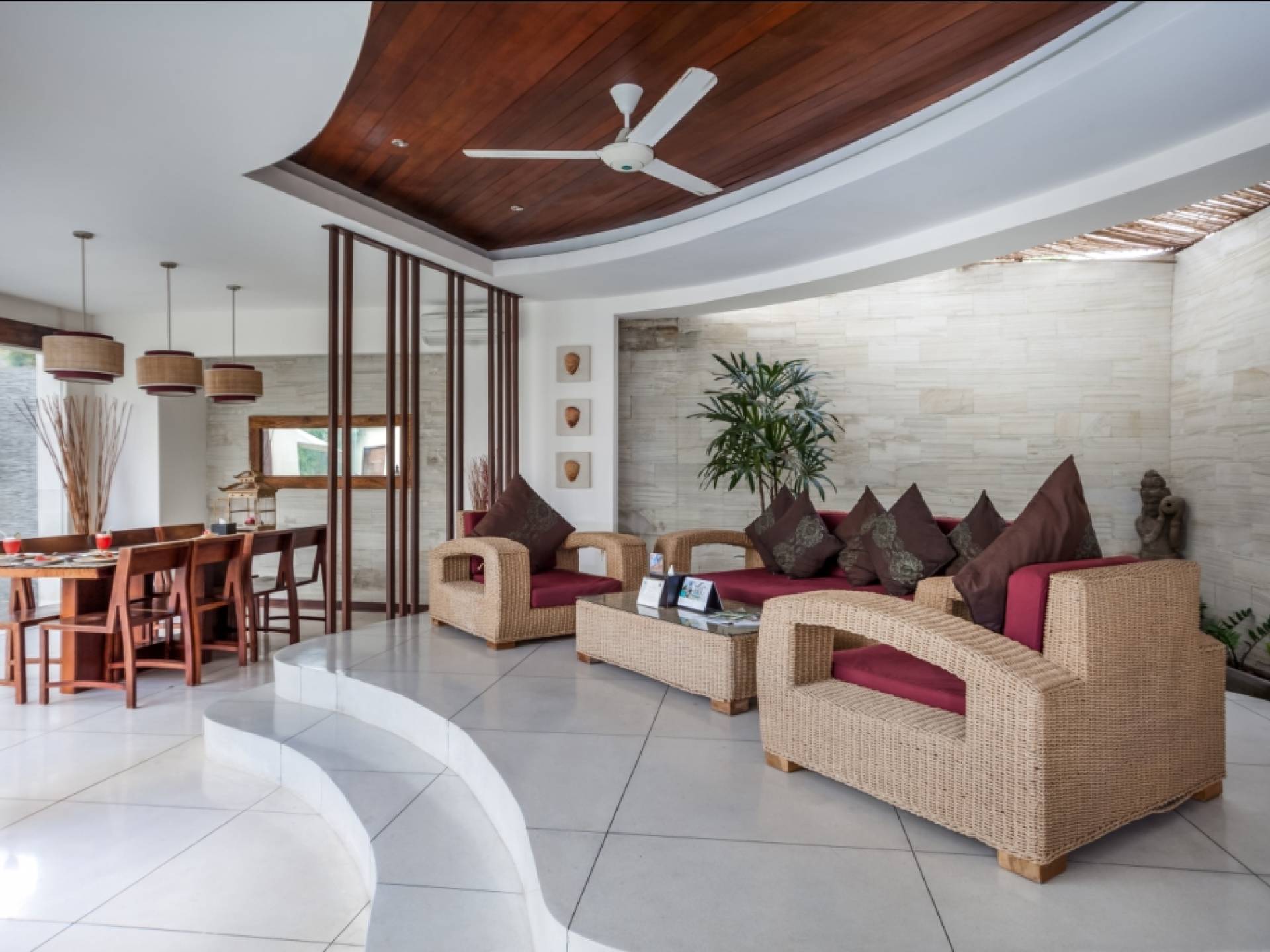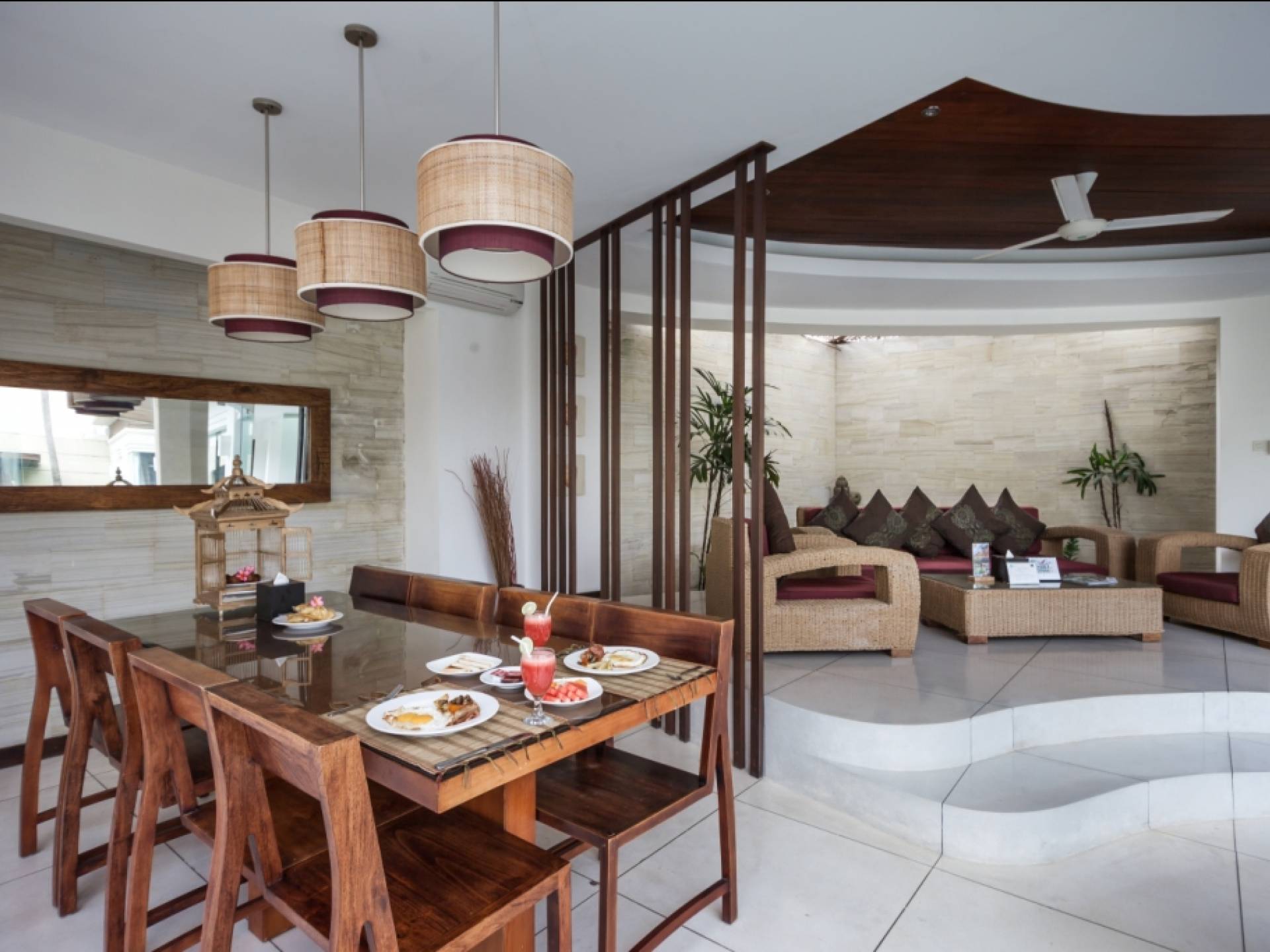 K Villas offre una meravigliosa sensazione di spaziosità e offre le ultime novità in fatto di servizi moderni, tra cui una TV LED a schermo piatto, stazioni per iPod, Internet WiFi e riscaldamento dell'acqua a energia solare. I materiali di qualità ampiamente utilizzati in tutto includono terrazzo e pietra Kalimantan, marmo e legni naturali, mentre le finestre dal pavimento al soffitto e le porte scorrevoli in vetro consentono la luce solare naturale e le brezze rinfrescanti.