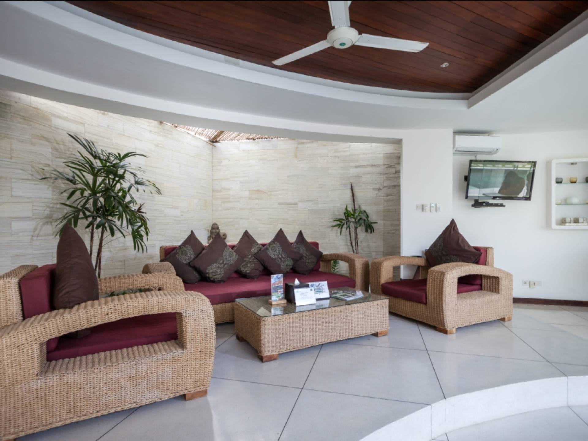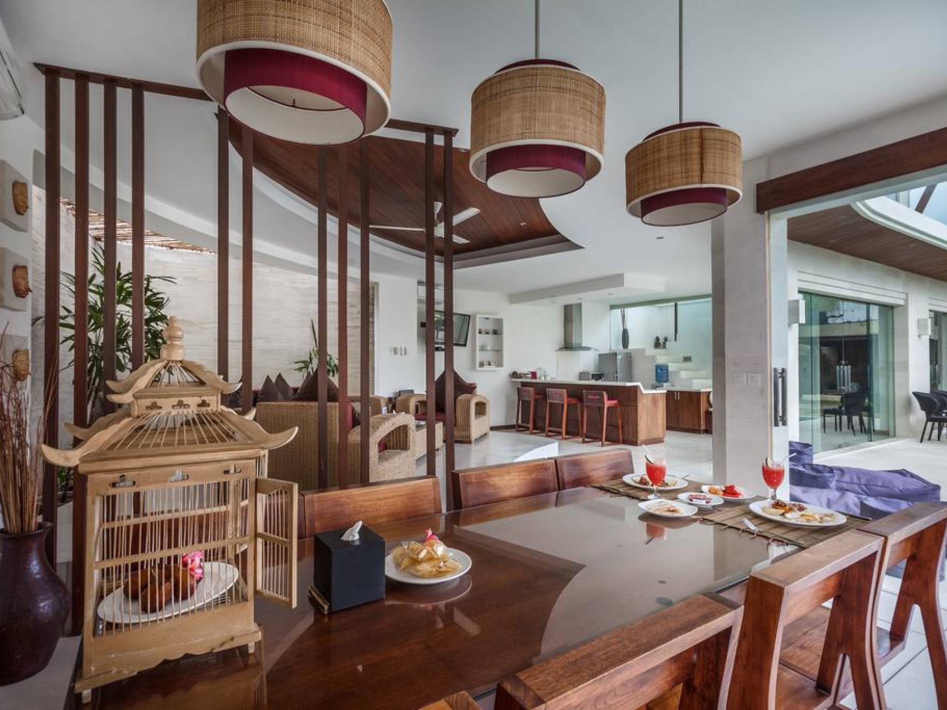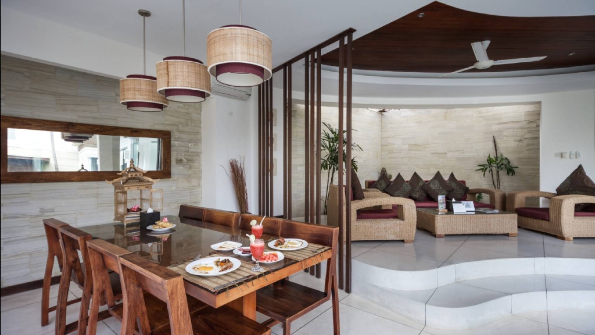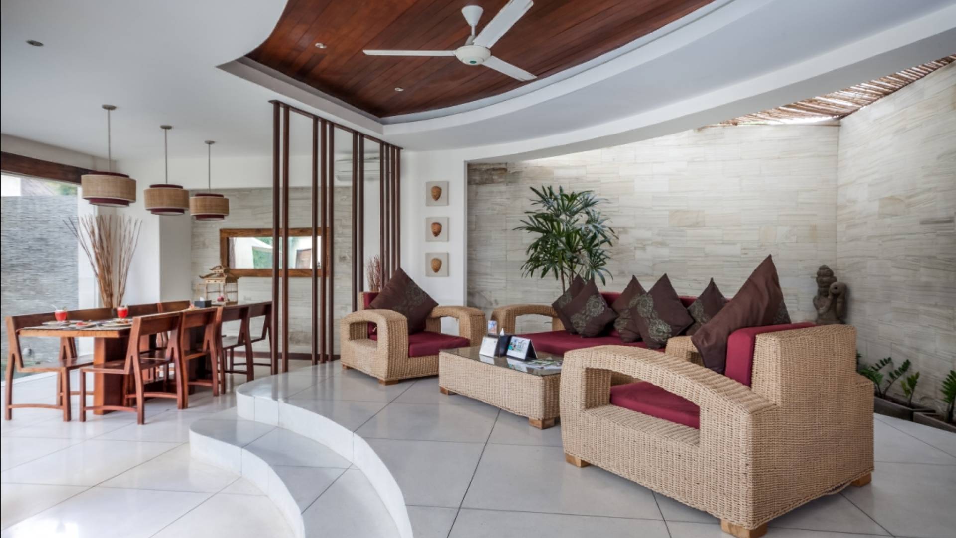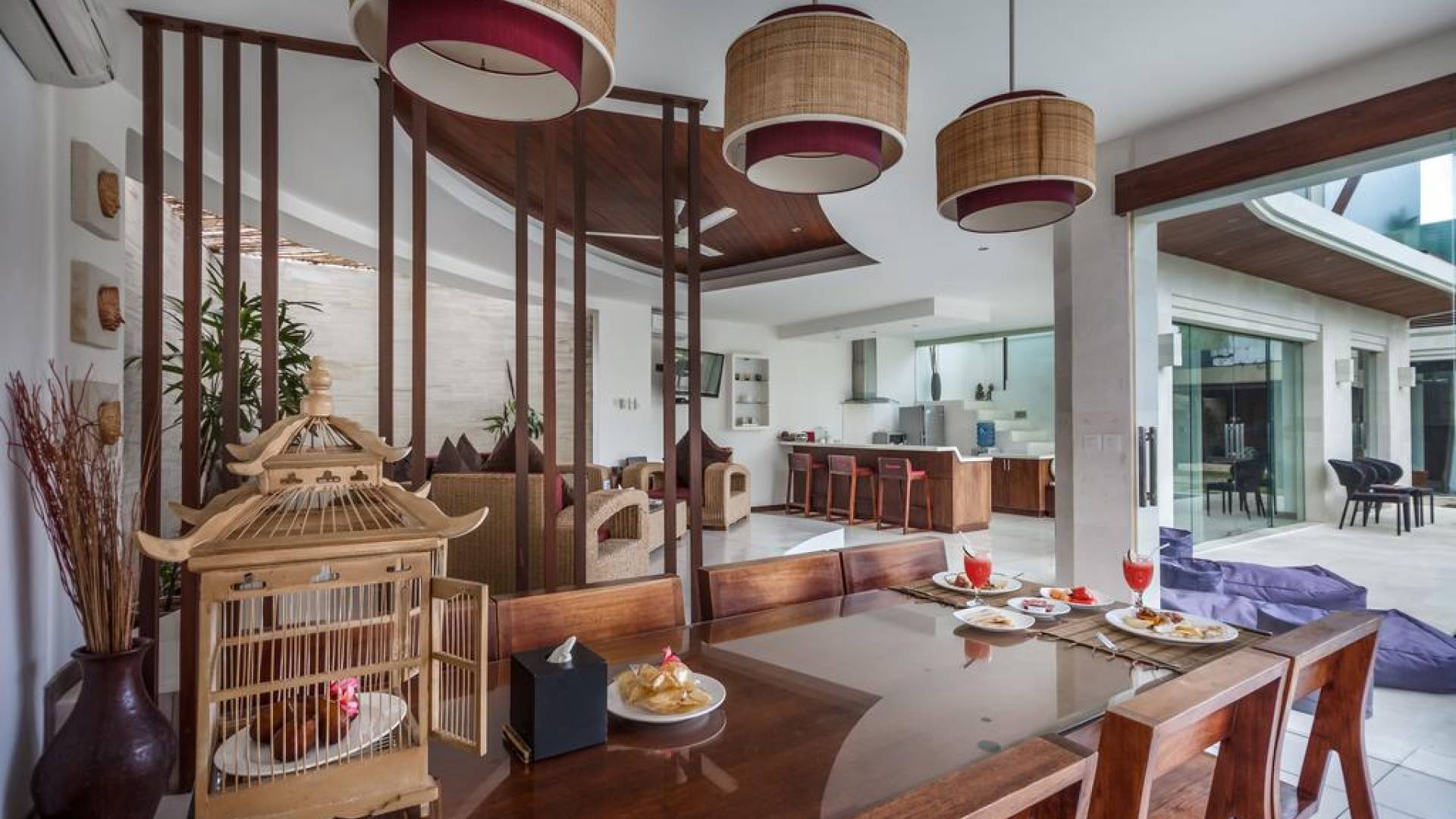 K Villas offre una meravigliosa sensazione di spaziosità e offre le ultime novità in fatto di servizi moderni, tra cui una TV LED a schermo piatto, stazioni per iPod, Internet WiFi e riscaldamento dell'acqua a energia solare. I materiali di qualità ampiamente utilizzati in tutto includono terrazzo e pietra Kalimantan, marmo e legni naturali, mentre le finestre dal pavimento al soffitto e le porte scorrevoli in vetro consentono la luce solare naturale e le brezze rinfrescanti.