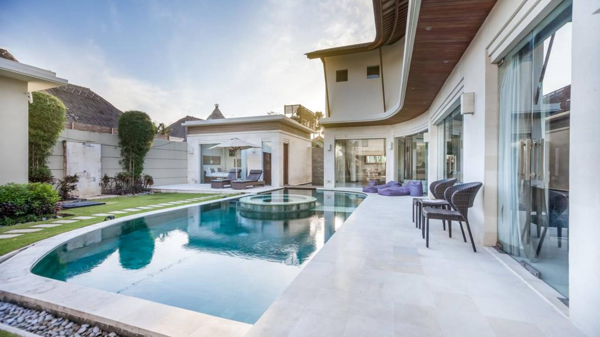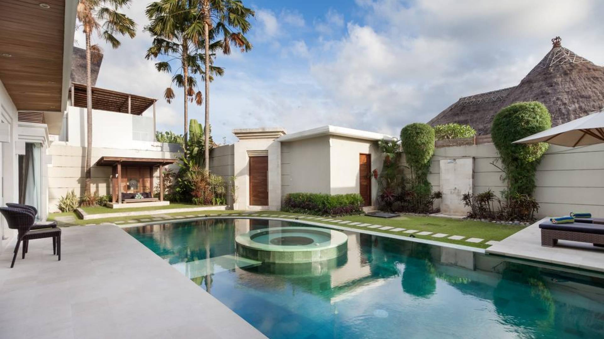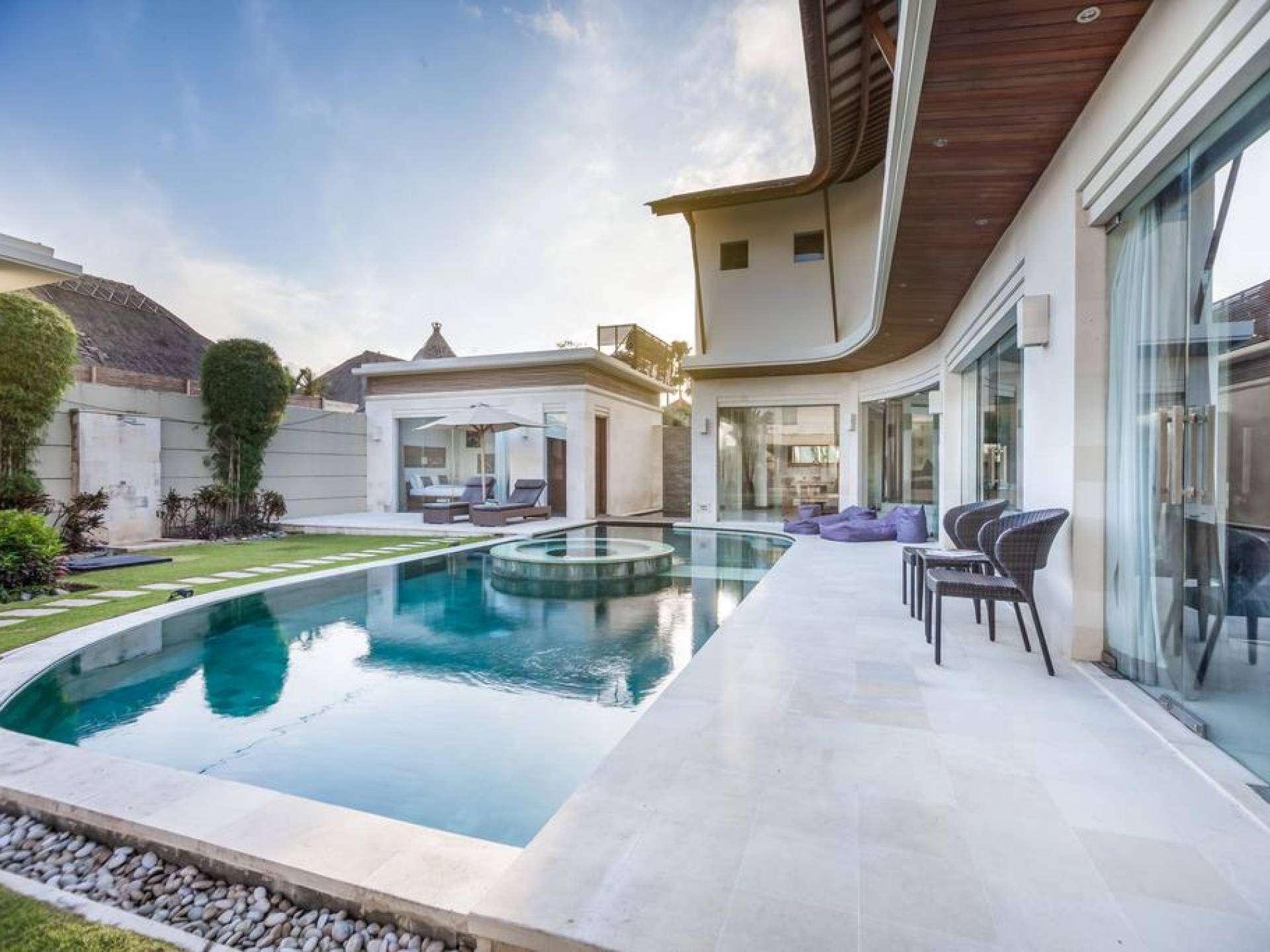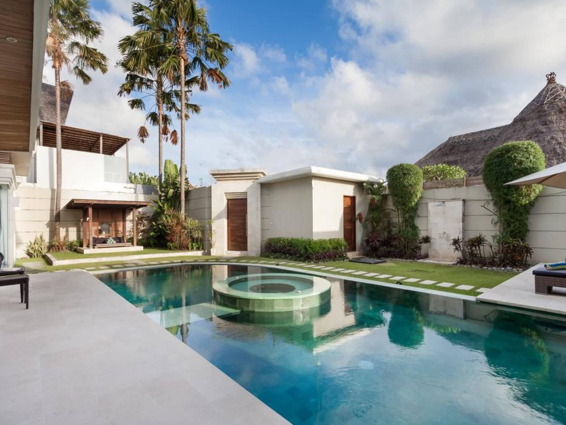 Ogni villa circonda un giardino recintato di prati e rilassanti piscine d'acqua, con una piscina centrale di 12 metri con vasca idromassaggio integrata e terrazza in legno. Una balla aperta sui lati (gazebo balinese) e posti a sedere all'aperto - ogni villa con il proprio allestimento - offre un perfetto relax a bordo piscina e cene all'aperto.