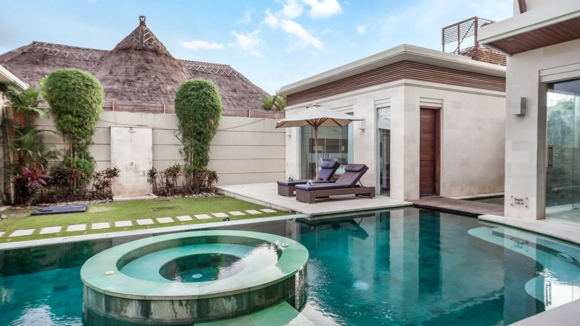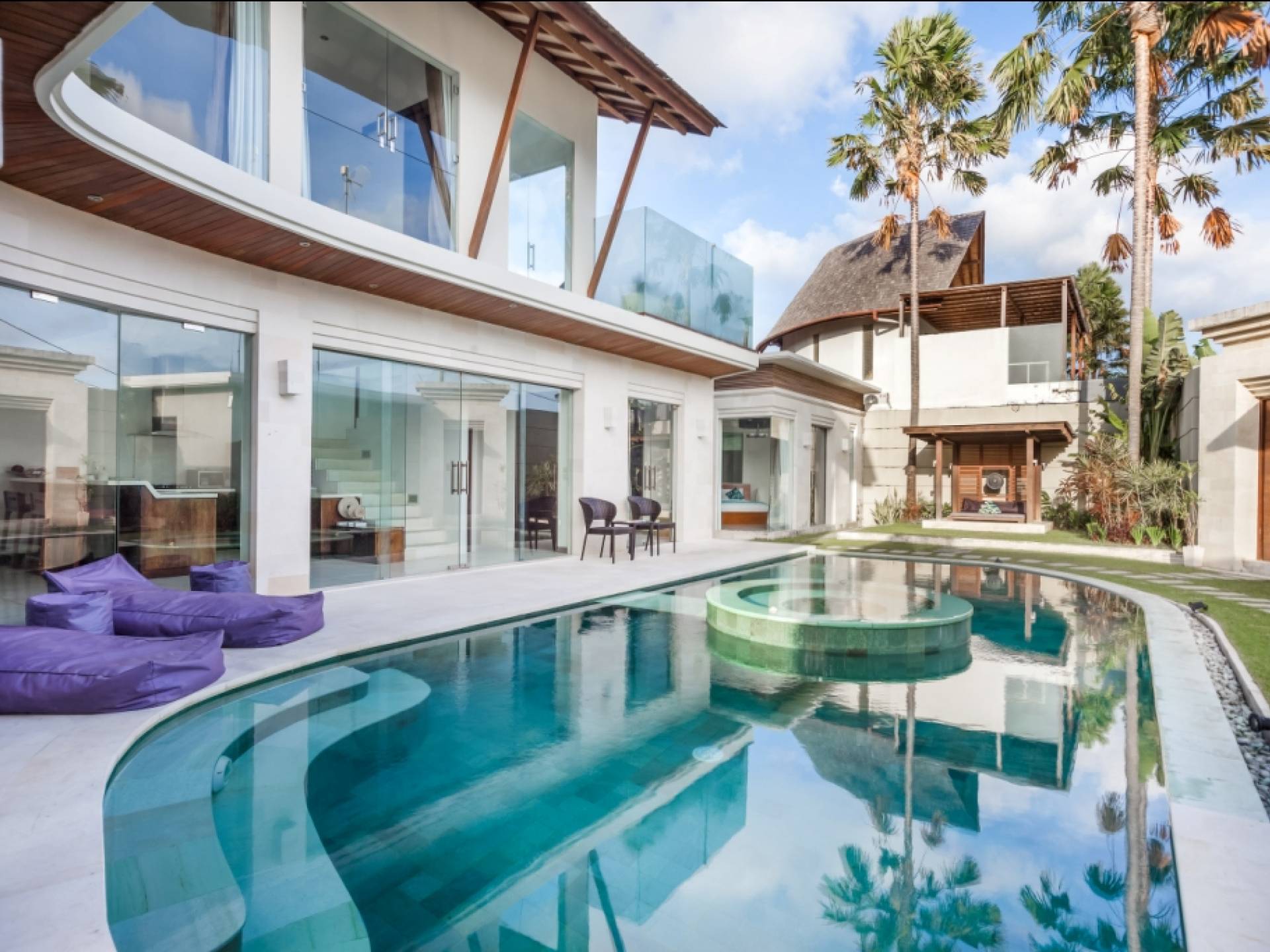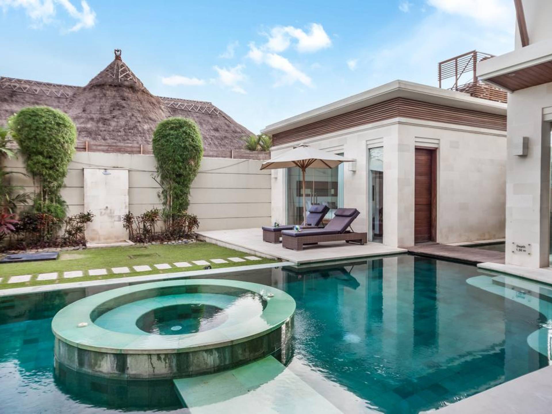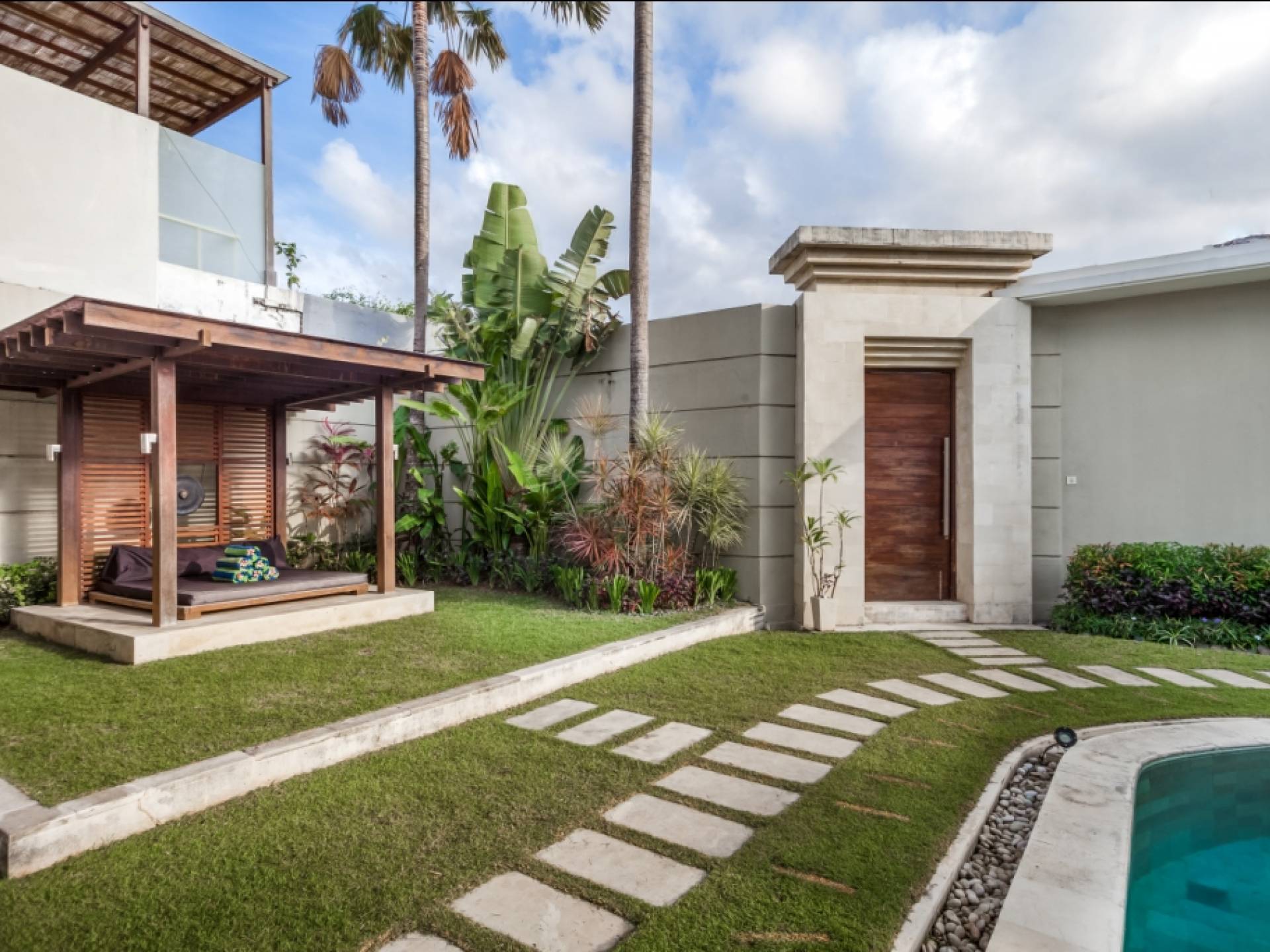 Ogni villa circonda un giardino recintato di prati e rilassanti piscine d'acqua, con una piscina centrale di 12 metri con vasca idromassaggio integrata e terrazza in legno. Una balla aperta sui lati (gazebo balinese) e posti a sedere all'aperto - ogni villa con il proprio allestimento - offre un perfetto relax a bordo piscina e cene all'aperto.