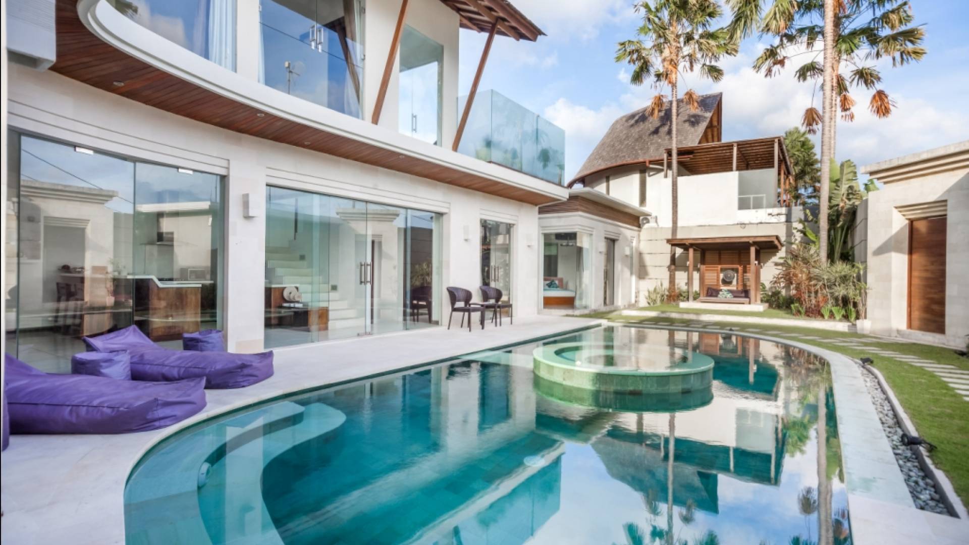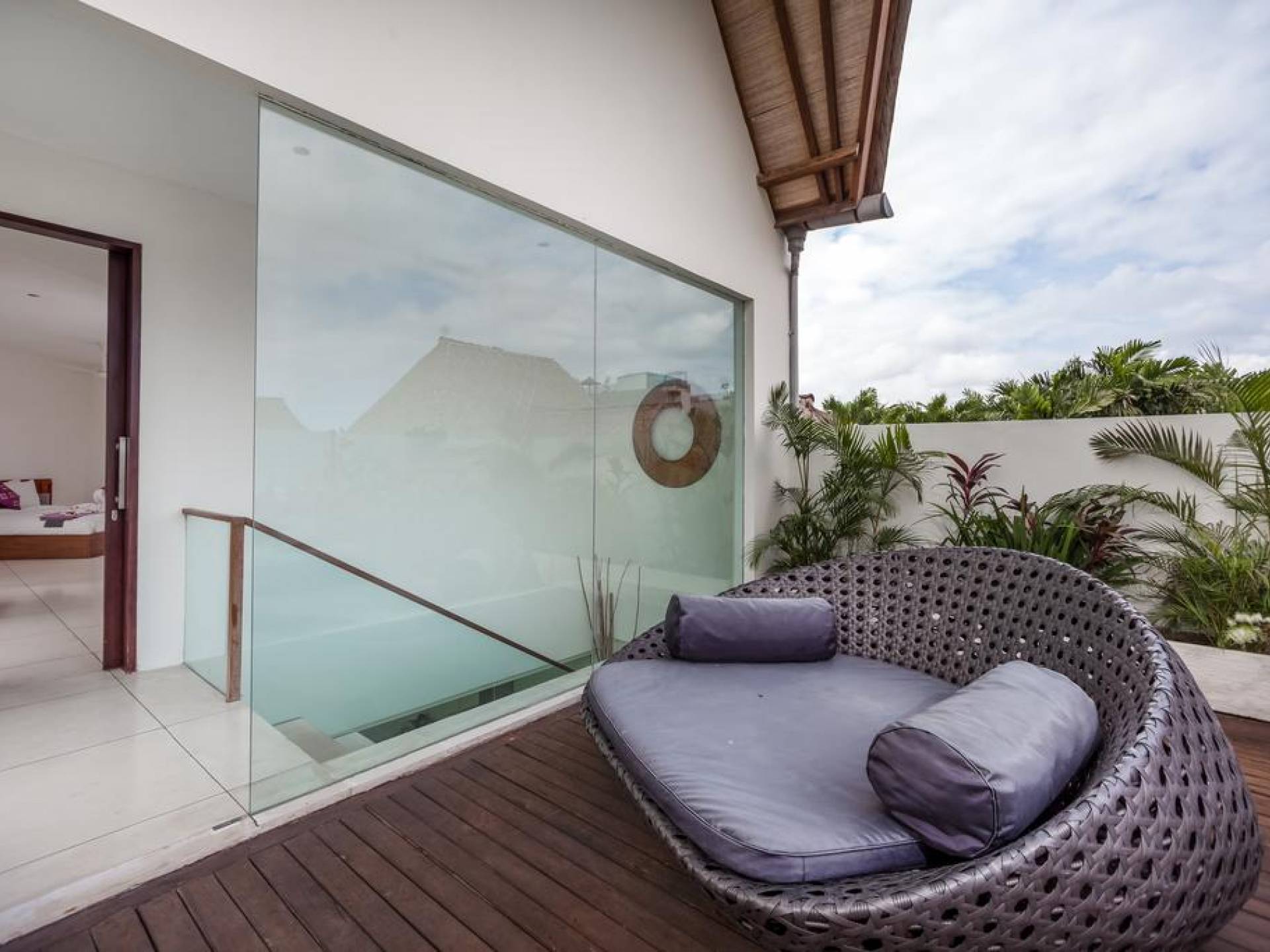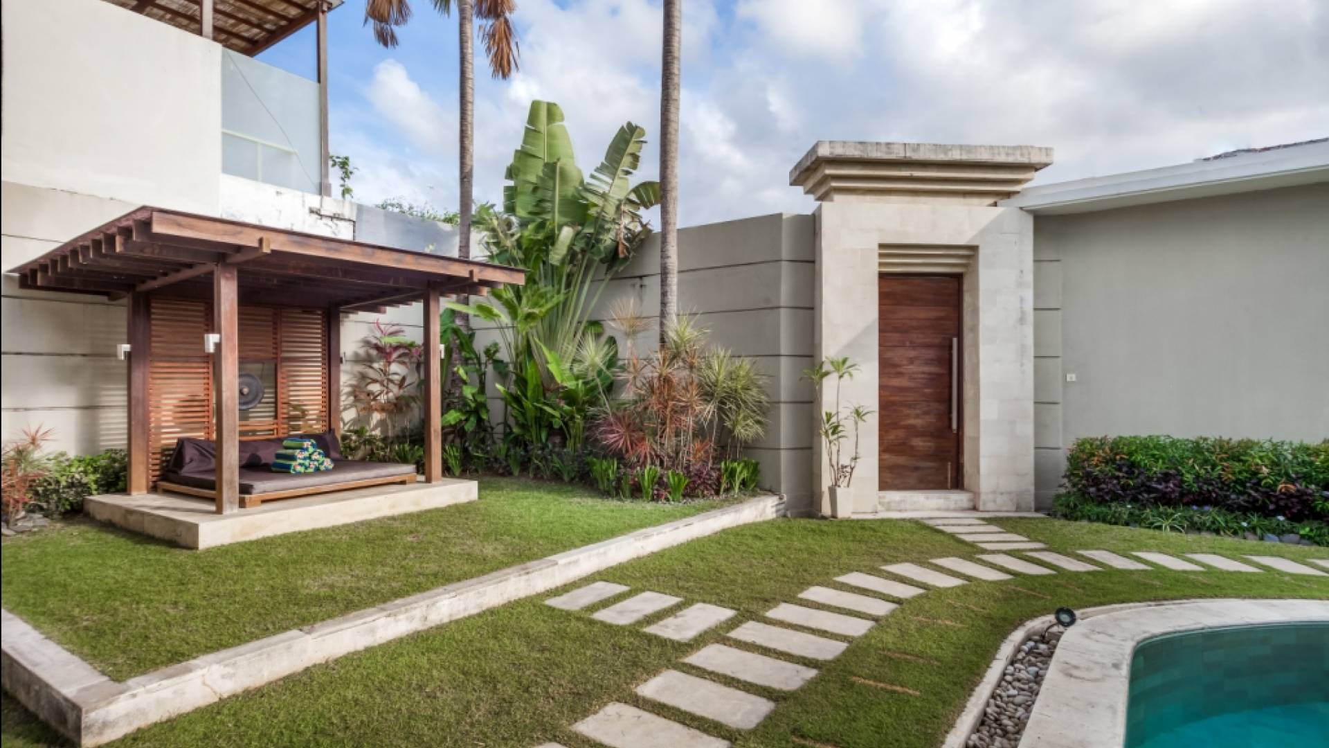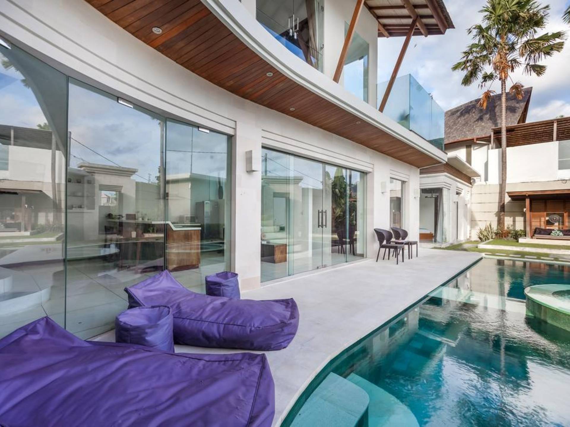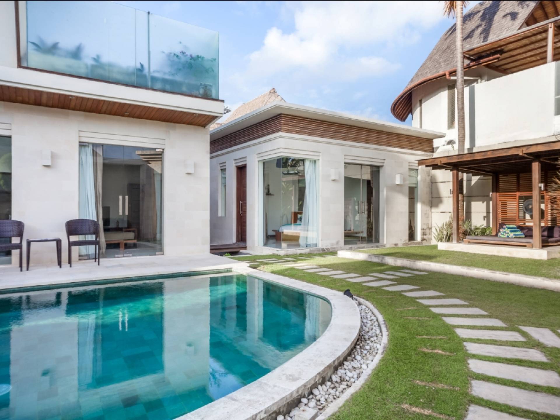 Ogni villa circonda un giardino recintato di prati e rilassanti piscine d'acqua, con una piscina centrale di 12 metri con vasca idromassaggio integrata e terrazza in legno. Una balla aperta sui lati (gazebo balinese) e posti a sedere all'aperto - ogni villa con il proprio allestimento - offre un perfetto relax a bordo piscina e cene all'aperto.