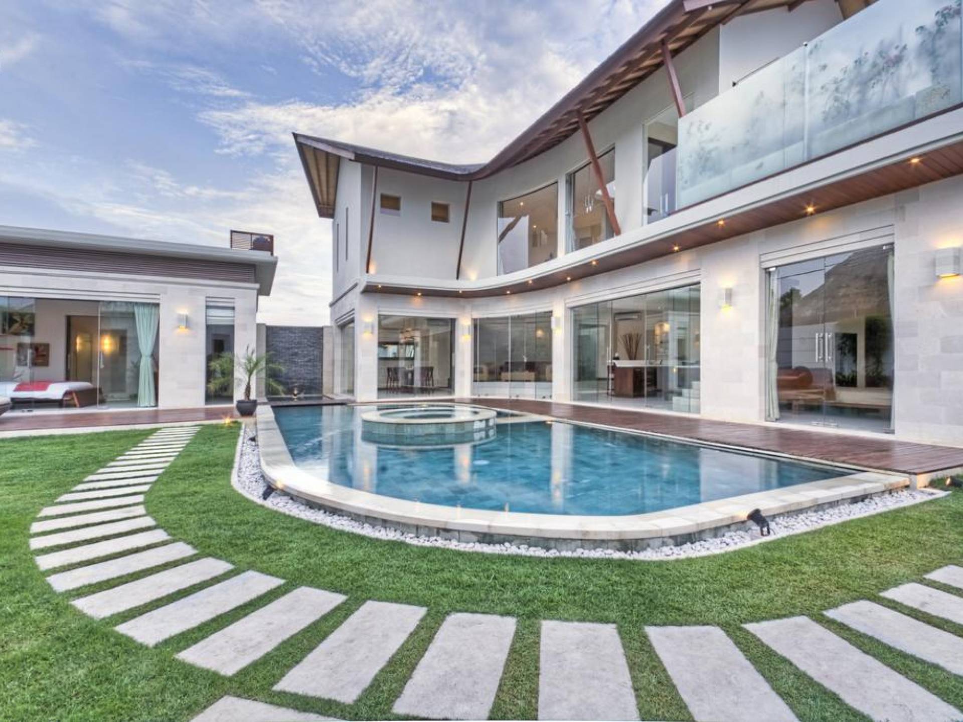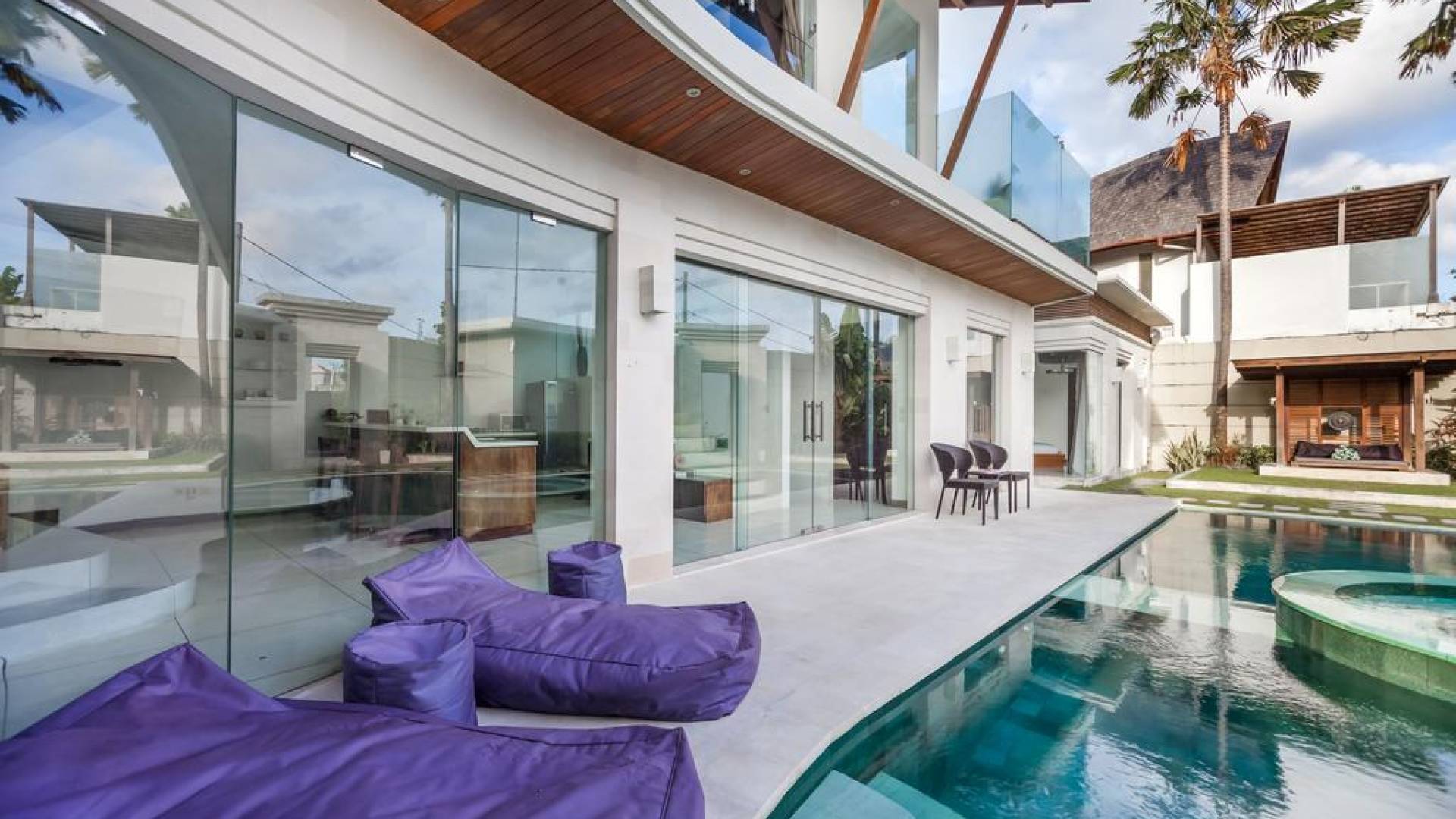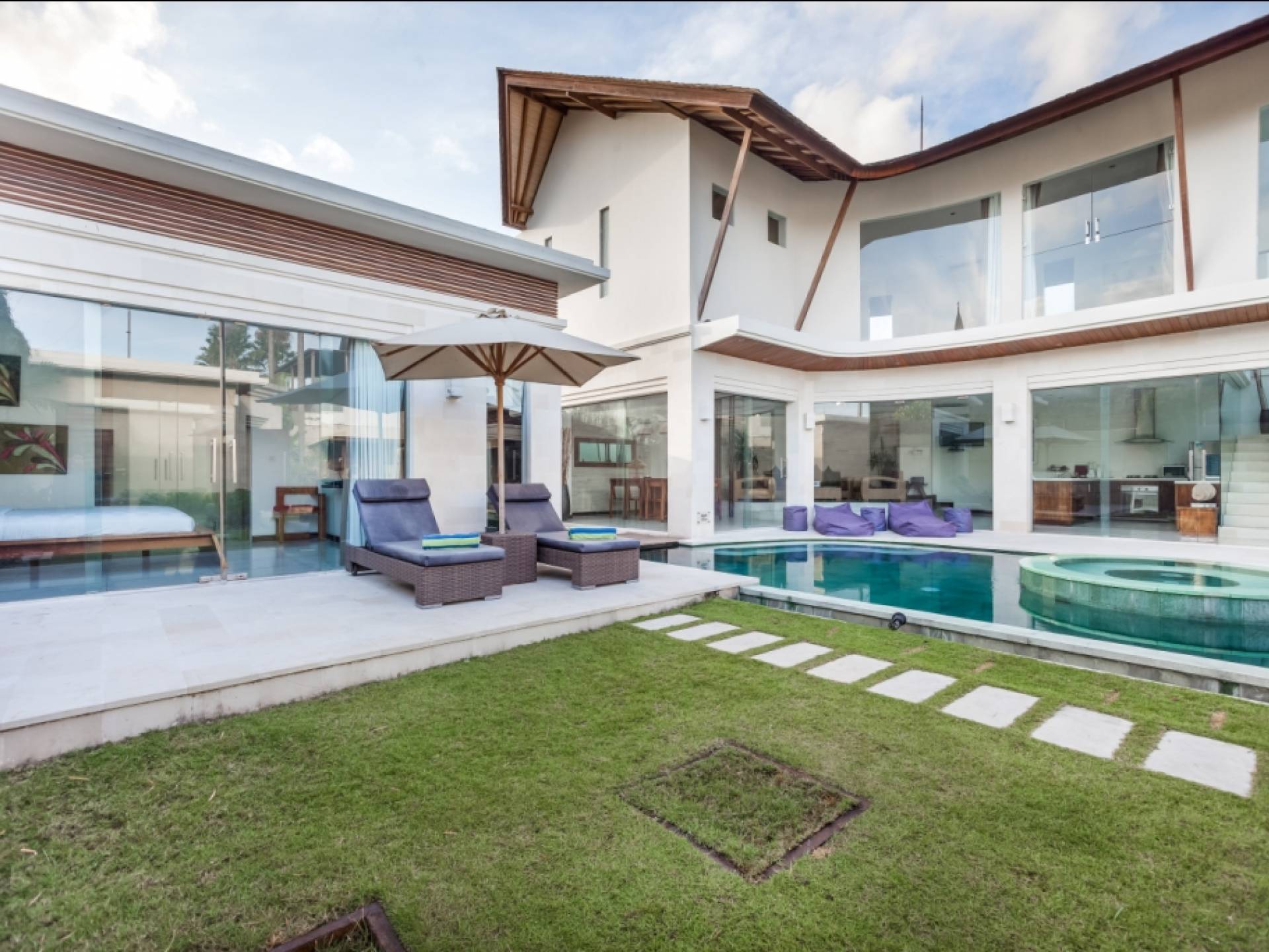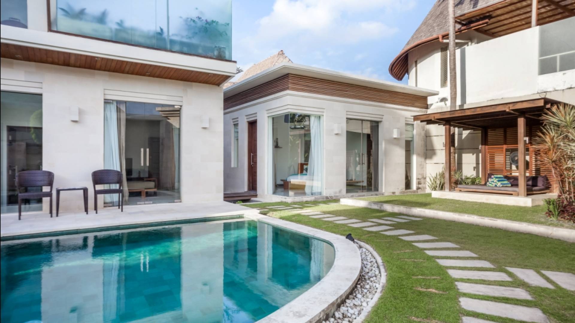 Ogni villa circonda un giardino recintato di prati e rilassanti piscine d'acqua, con una piscina centrale di 12 metri con vasca idromassaggio integrata e terrazza in legno. Una balla aperta sui lati (gazebo balinese) e posti a sedere all'aperto - ogni villa con il proprio allestimento - offre un perfetto relax a bordo piscina e cene all'aperto.