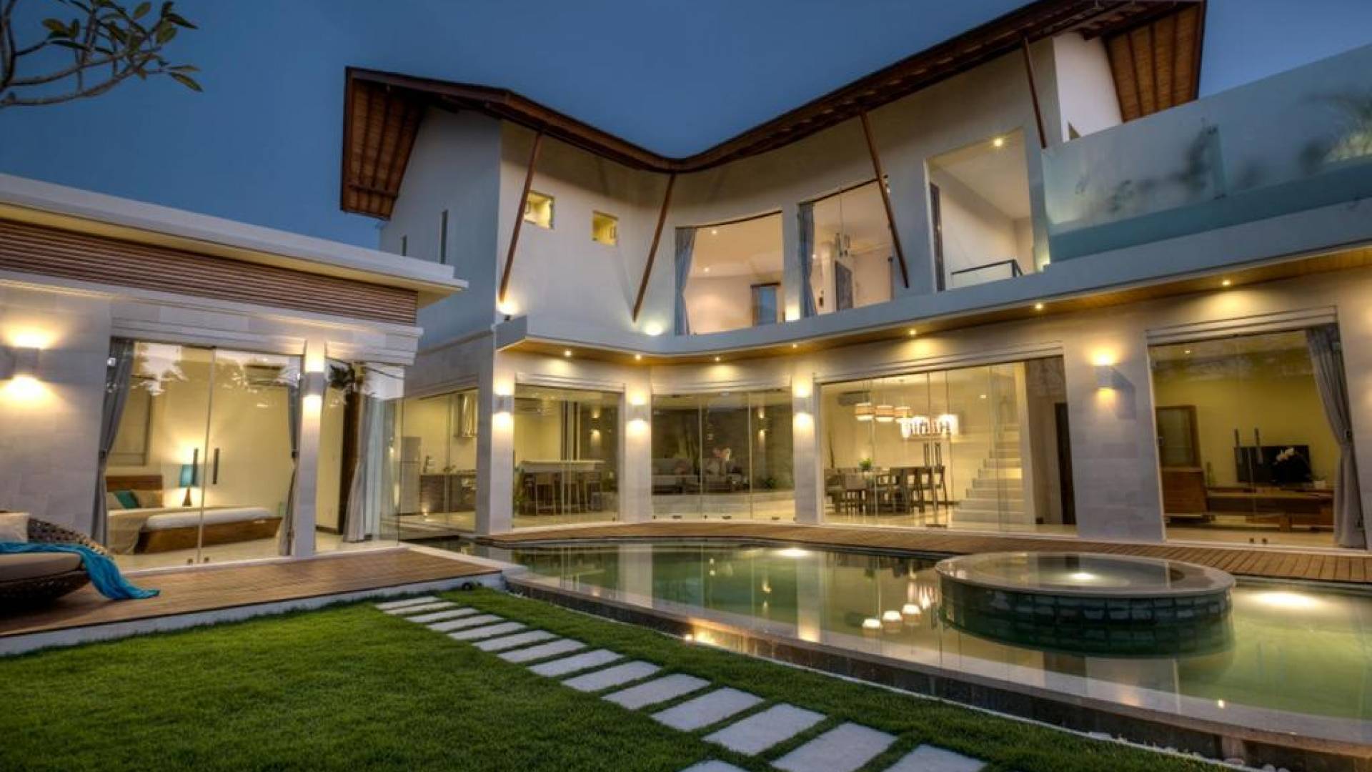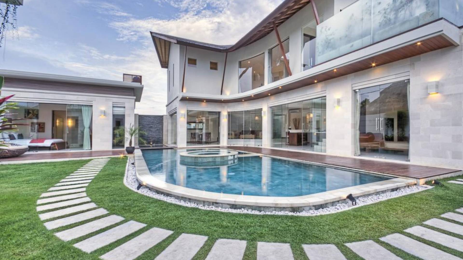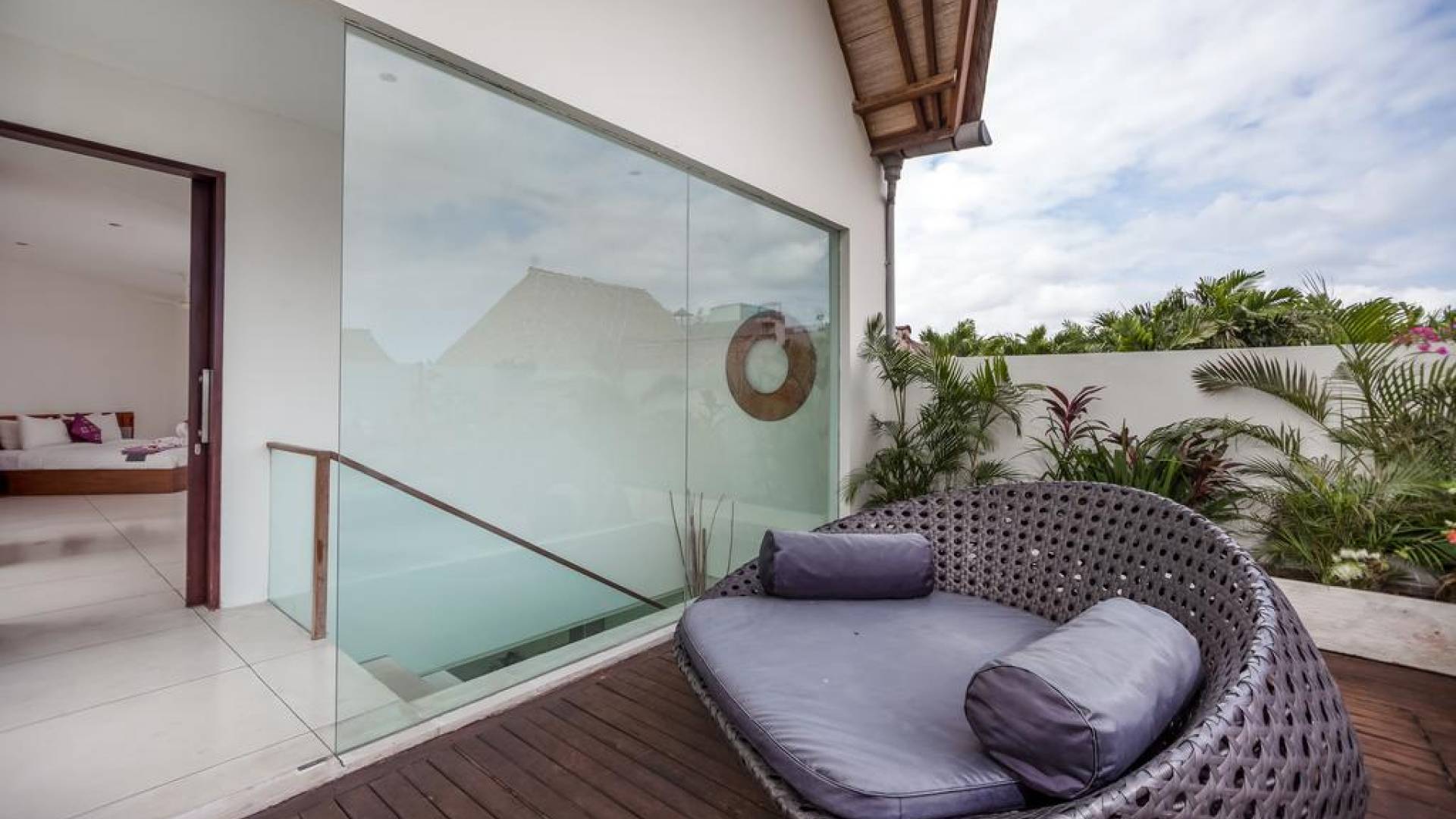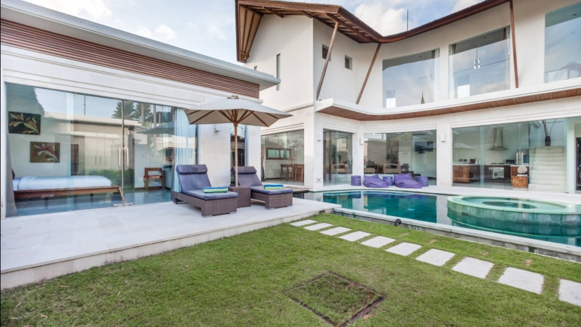 Ogni villa circonda un giardino recintato di prati e rilassanti piscine d'acqua, con una piscina centrale di 12 metri con vasca idromassaggio integrata e terrazza in legno. Una balla aperta sui lati (gazebo balinese) e posti a sedere all'aperto - ogni villa con il proprio allestimento - offre un perfetto relax a bordo piscina e cene all'aperto.