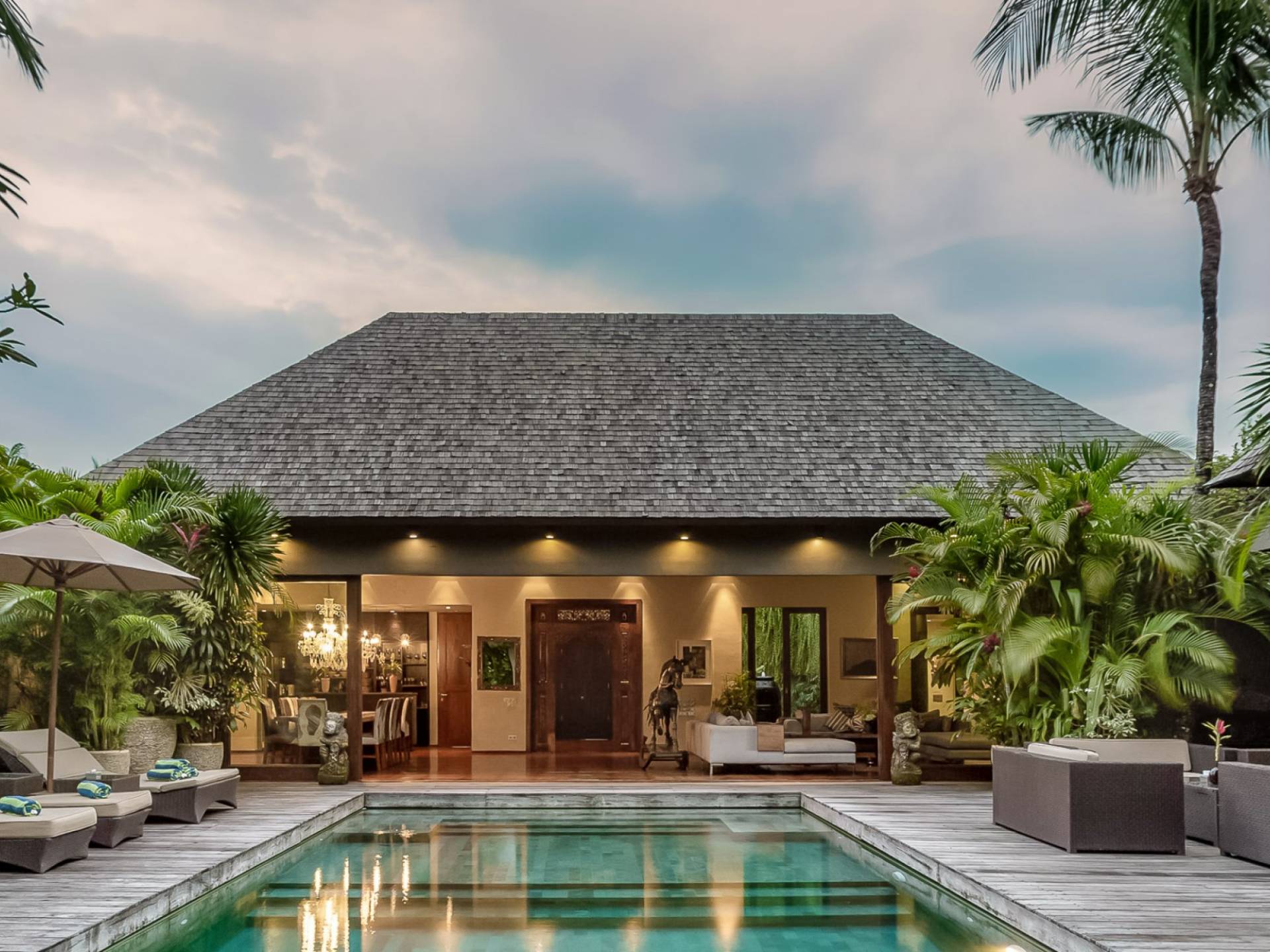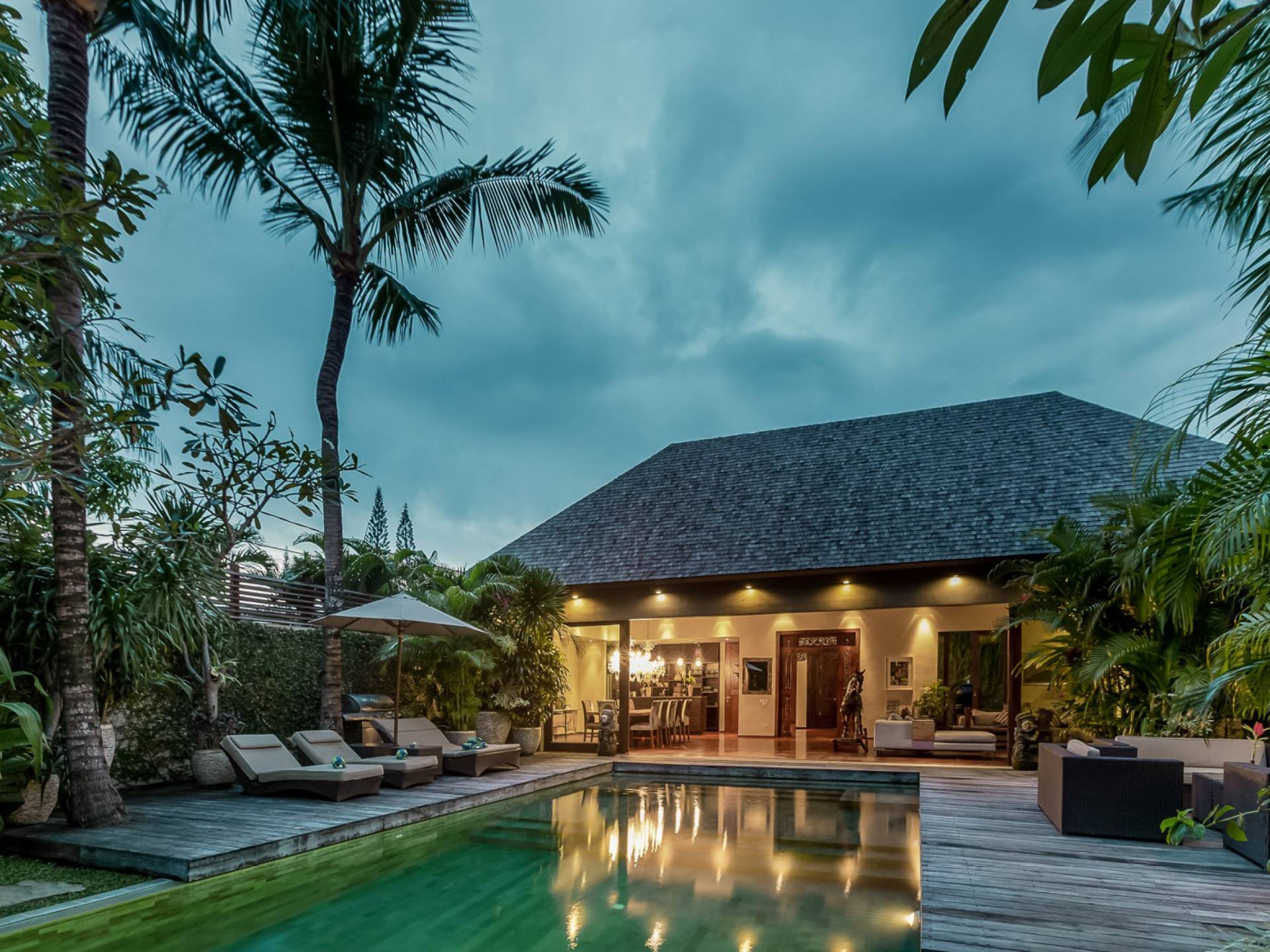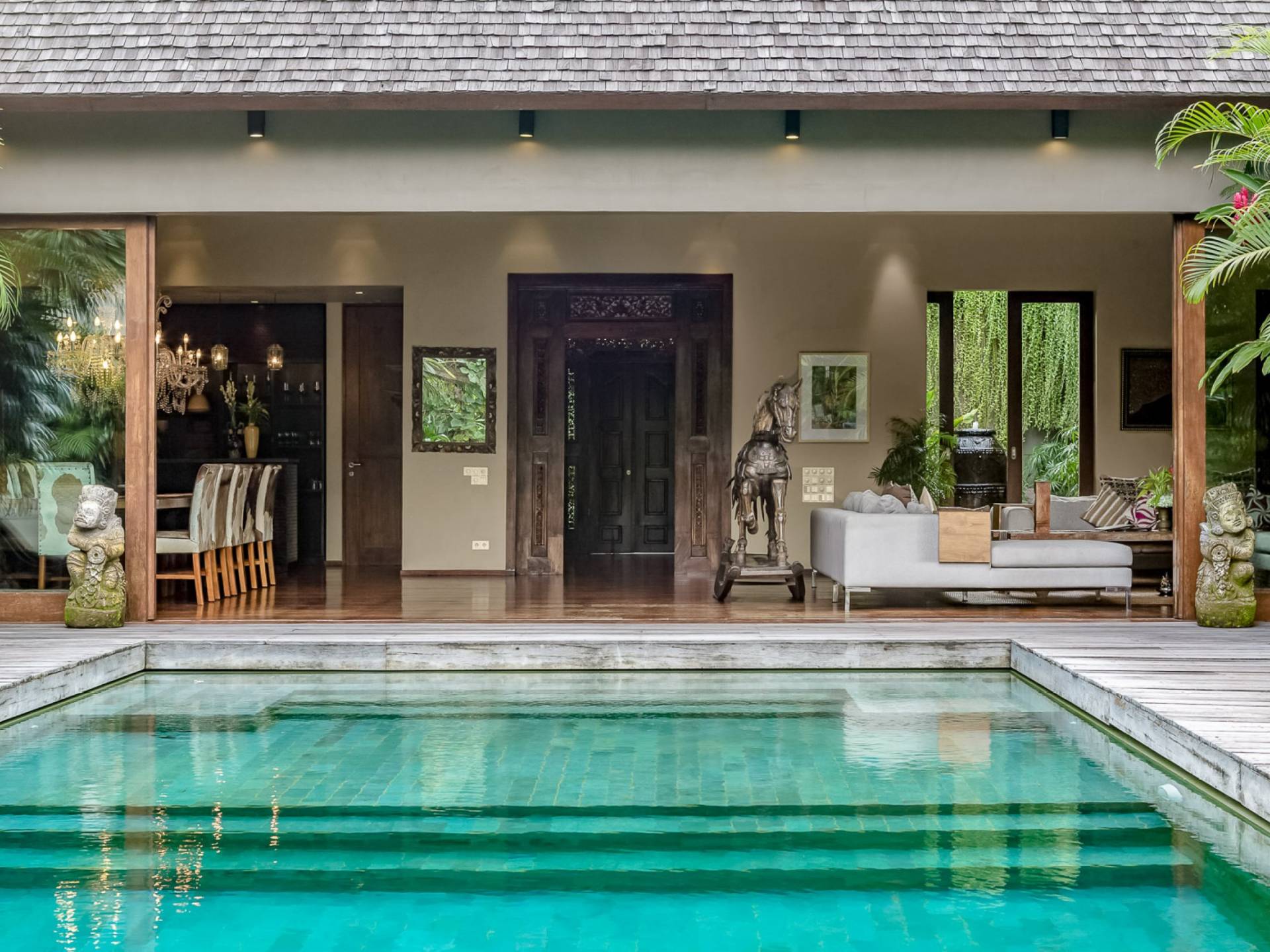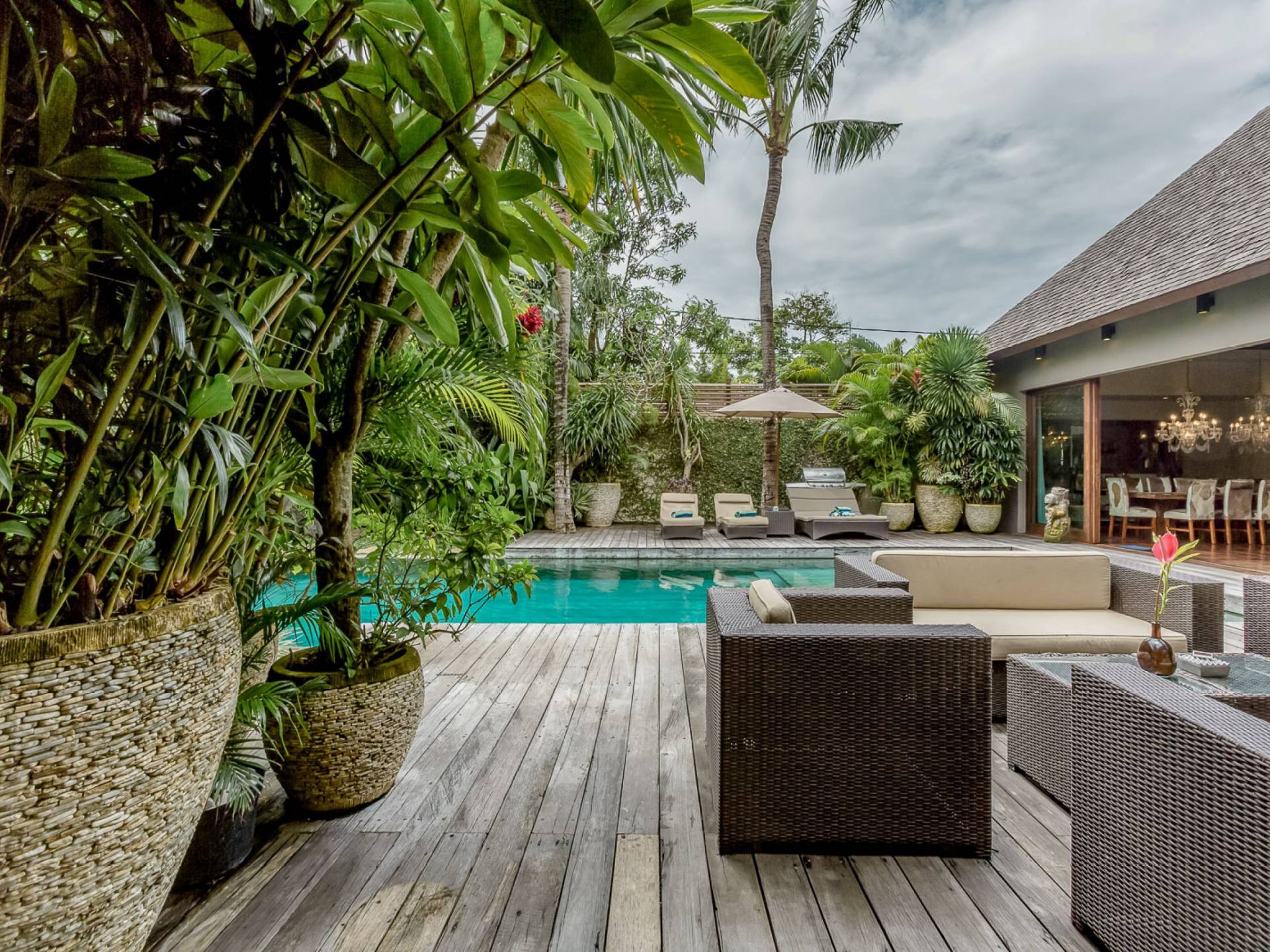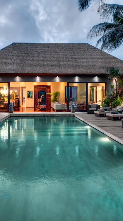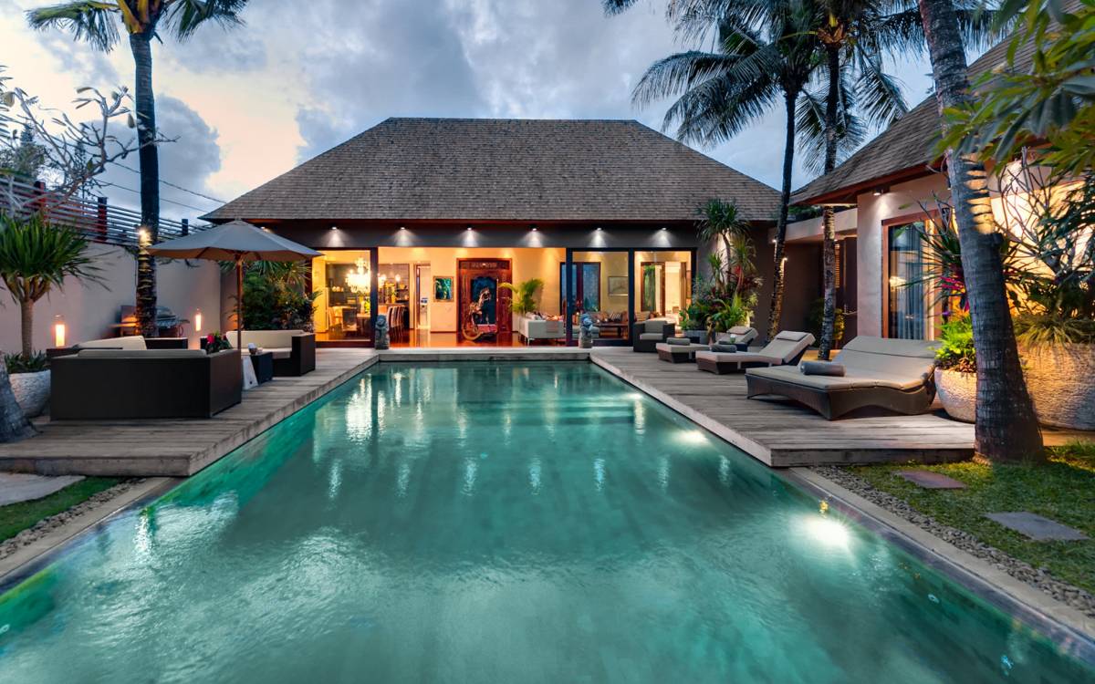 Villa Eshara è una grande villa completamente attrezzata, situata in una strada tranquilla e silenziosa a soli 300 metri dalla spiaggia, dai negozi e dai ristoranti del centro di Seminyak. Questa versatile struttura tre in uno offre la scelta di un'opzione di affitto di 8, 5, 3 o 2 camere da letto grazie a un sistema intelligente di porte scorrevoli e ingressi separati. Ogni villa ha un soggiorno e una sala da pranzo glamour e una cucina integrata, mentre ogni camera da letto con bagno privato ha un letto king-size, una zona spogliatoio e un lettore TV / DVD. Ci sono anche tre piscine immerse in giardini tropicali complete di alberi di frangipani, palme da cocco, lettini e ponti in legno.