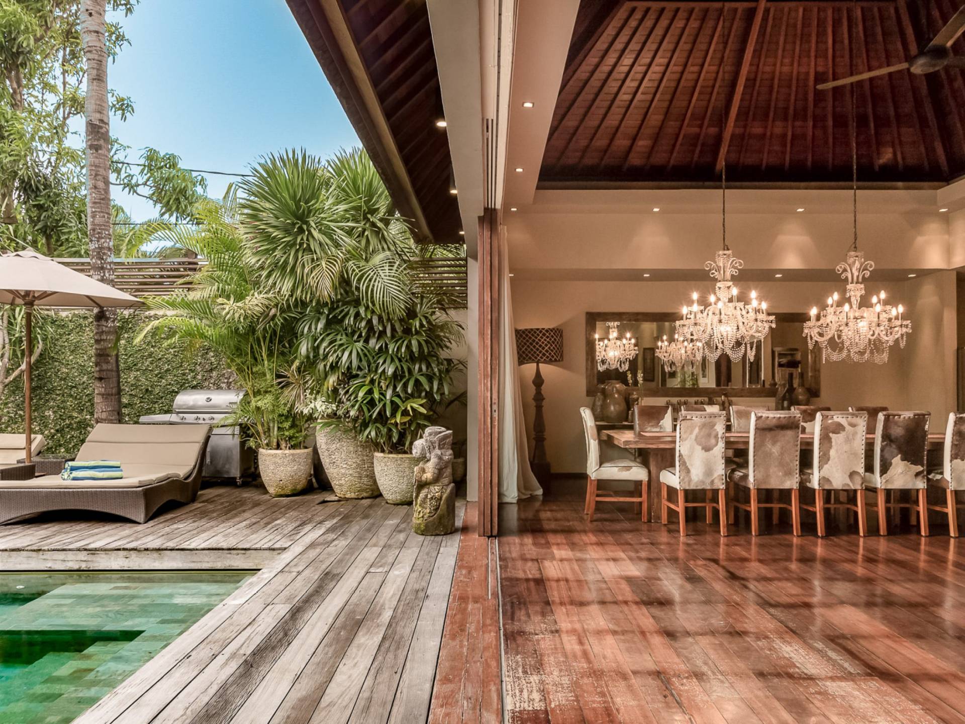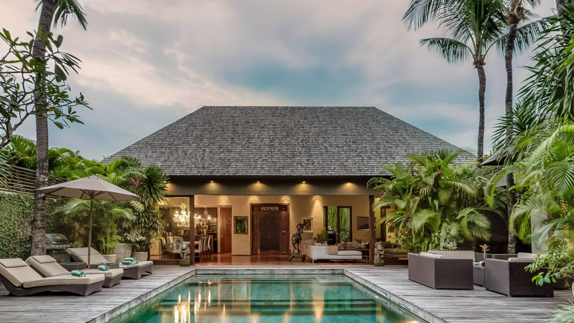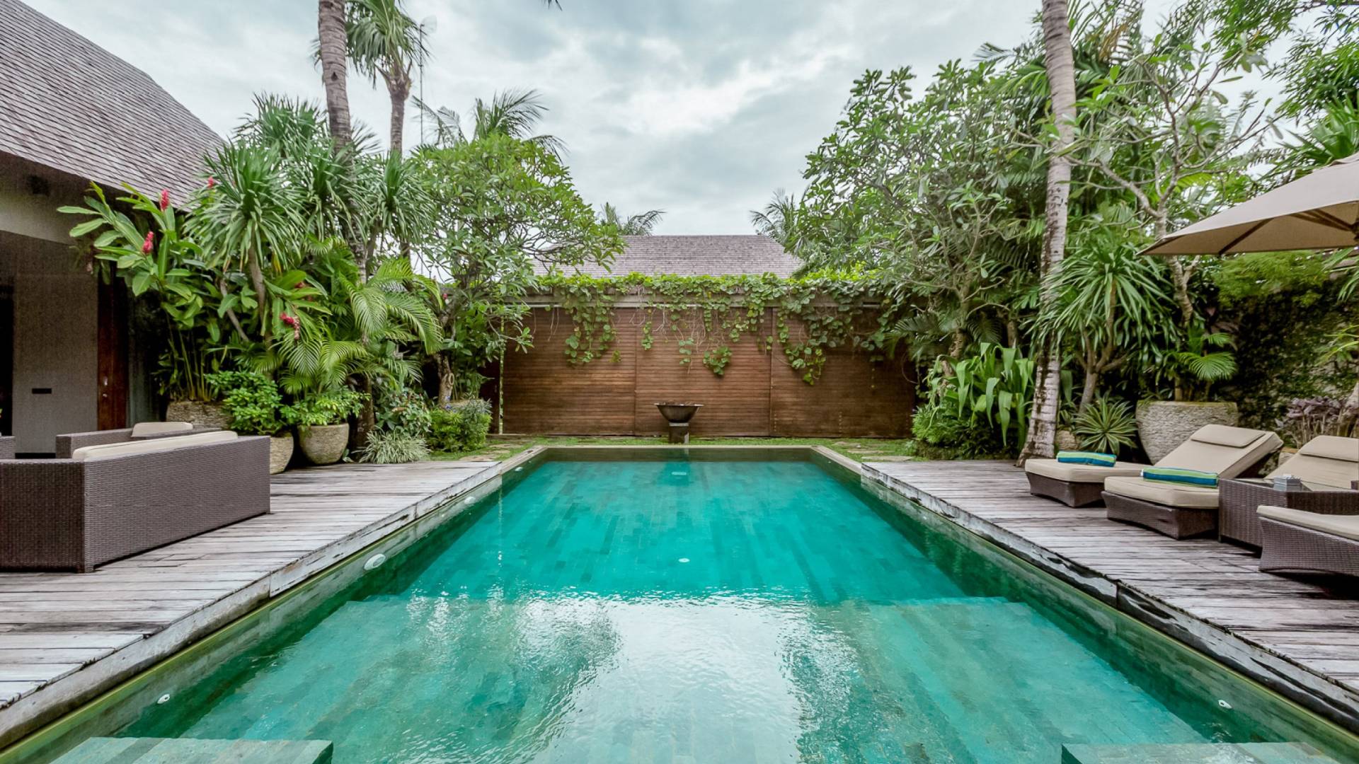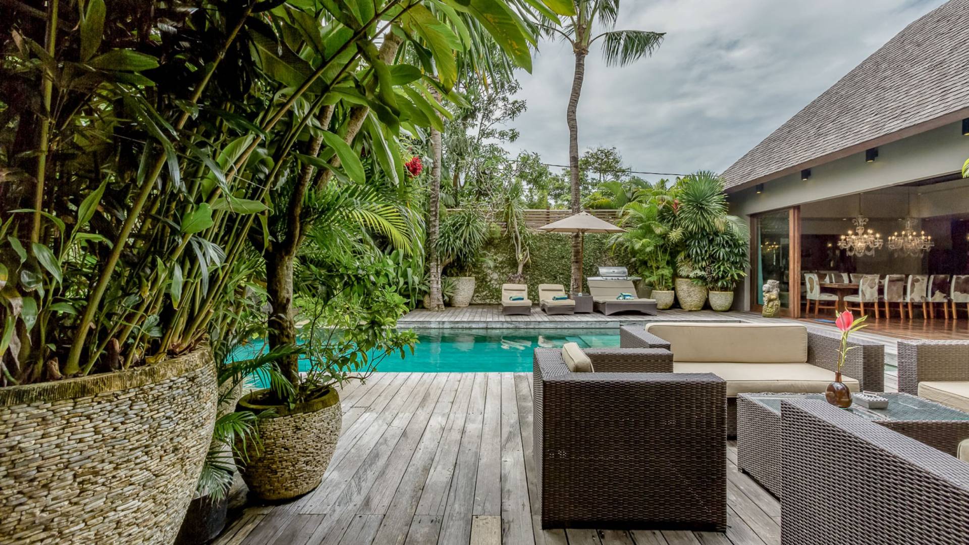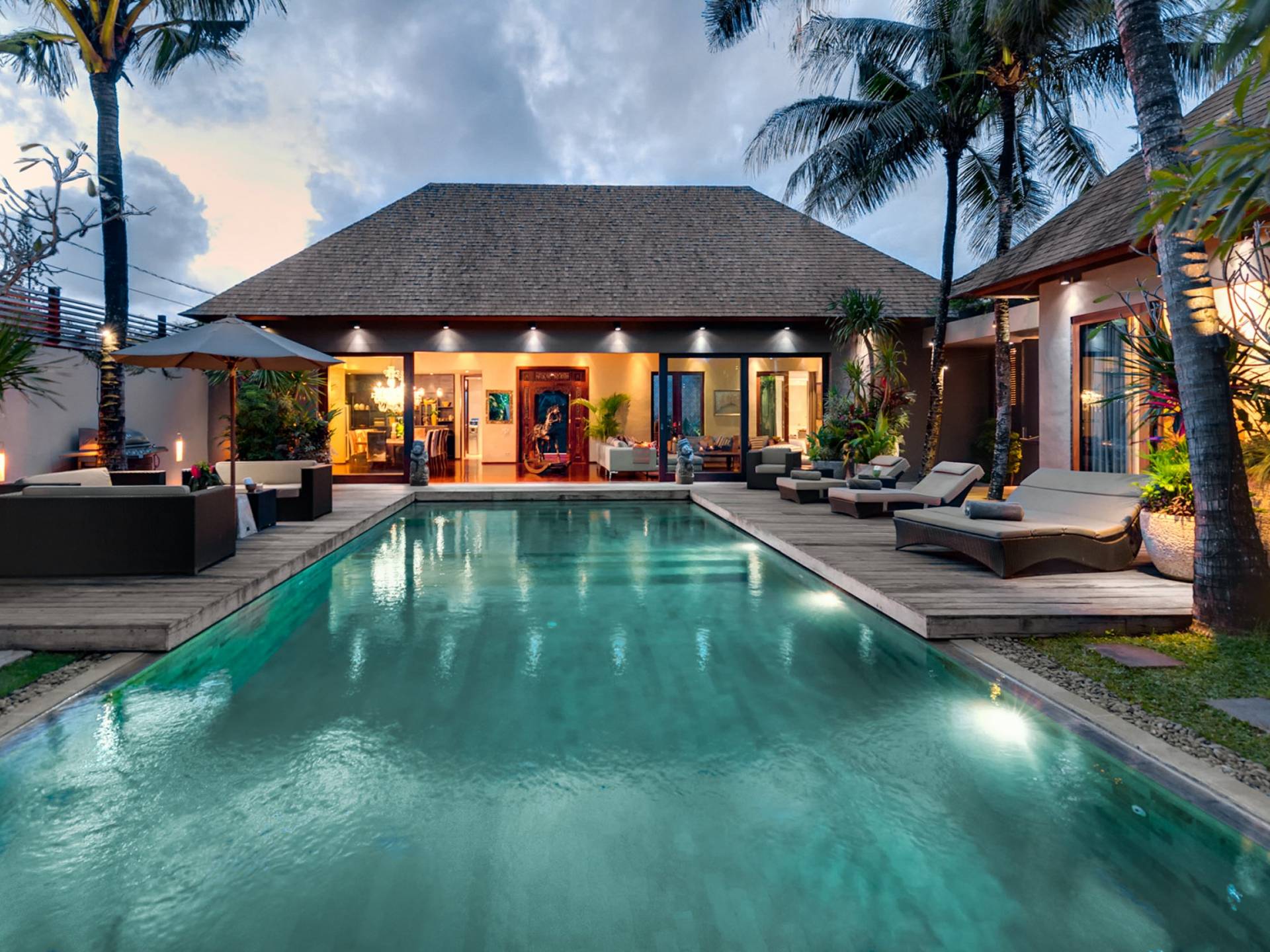 Villa Eshara è una grande villa completamente attrezzata, situata in una strada tranquilla e silenziosa a soli 300 metri dalla spiaggia, dai negozi e dai ristoranti del centro di Seminyak. Questa versatile struttura tre in uno offre la scelta di un'opzione di affitto di 8, 5, 3 o 2 camere da letto grazie a un sistema intelligente di porte scorrevoli e ingressi separati. Ogni villa ha un soggiorno e una sala da pranzo glamour e una cucina integrata, mentre ogni camera da letto con bagno privato ha un letto king-size, una zona spogliatoio e un lettore TV / DVD. Ci sono anche tre piscine immerse in giardini tropicali complete di alberi di frangipani, palme da cocco, lettini e ponti in legno.