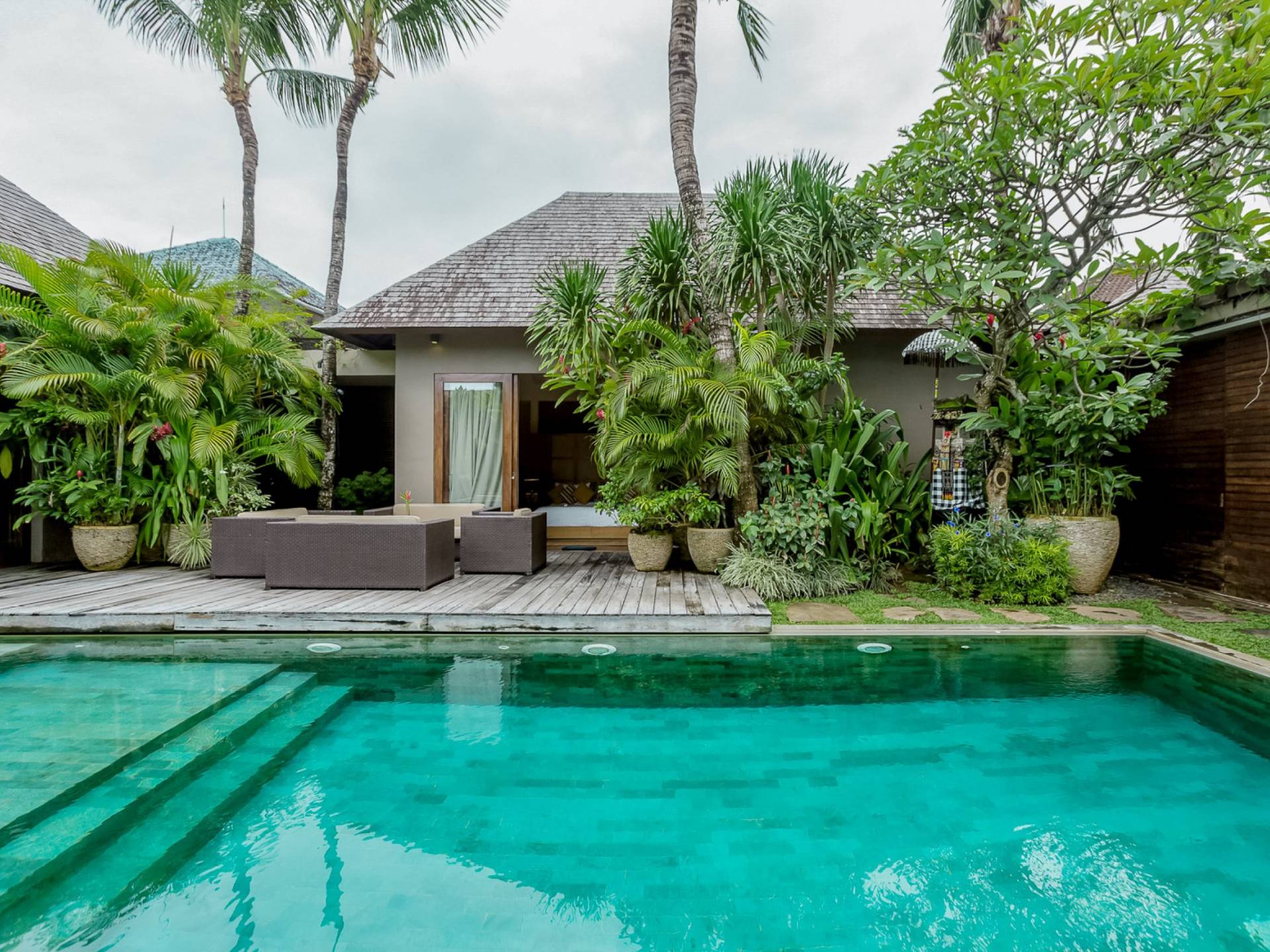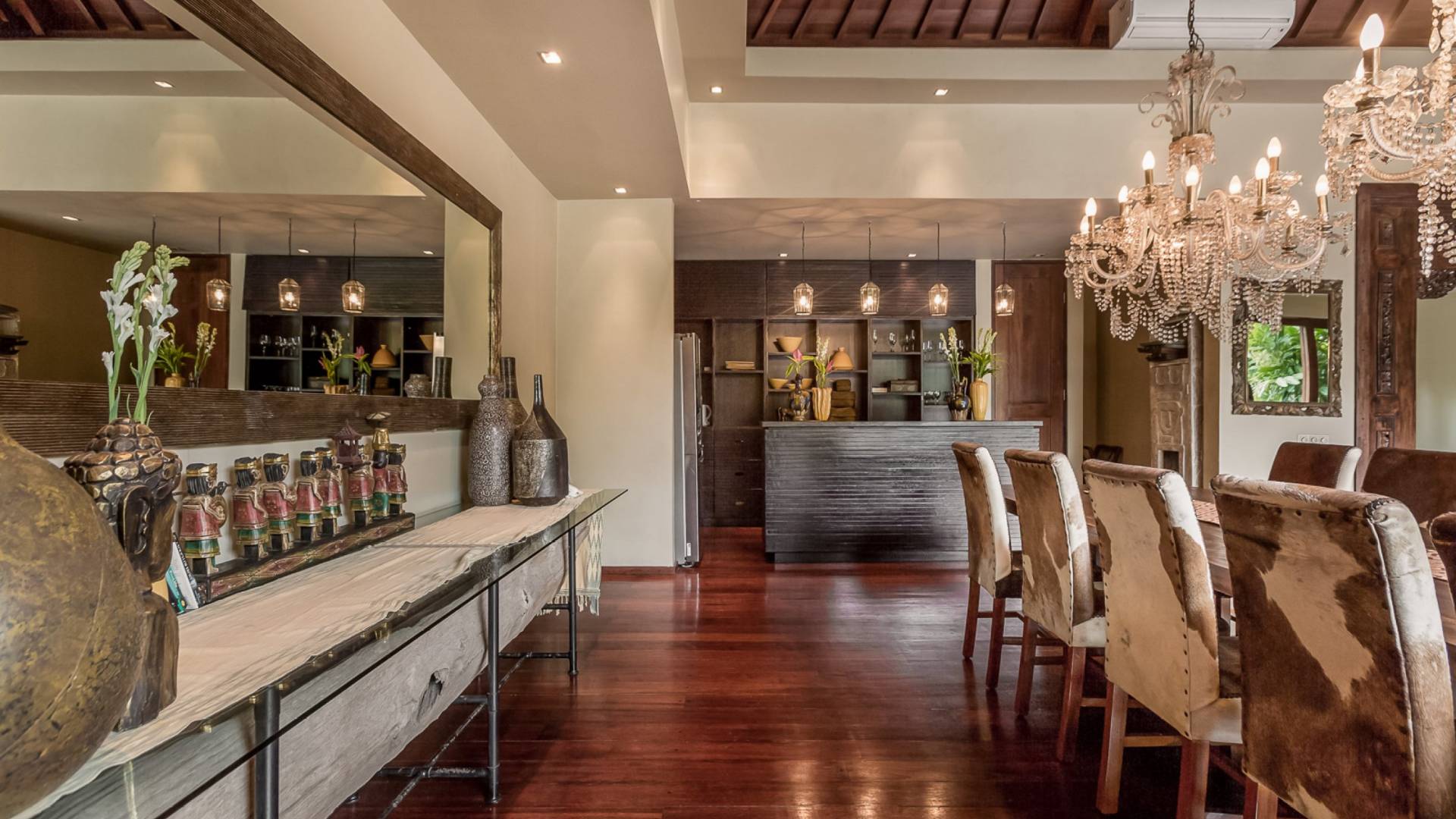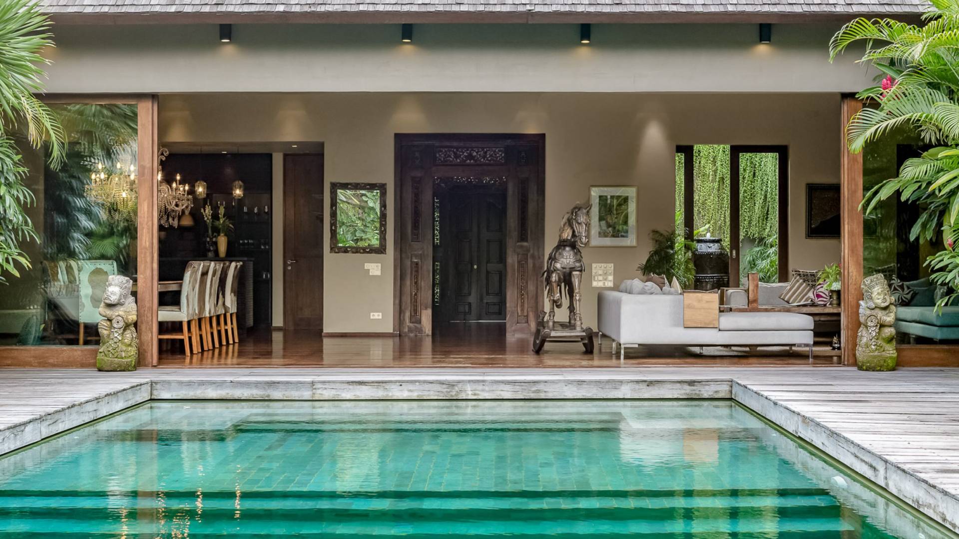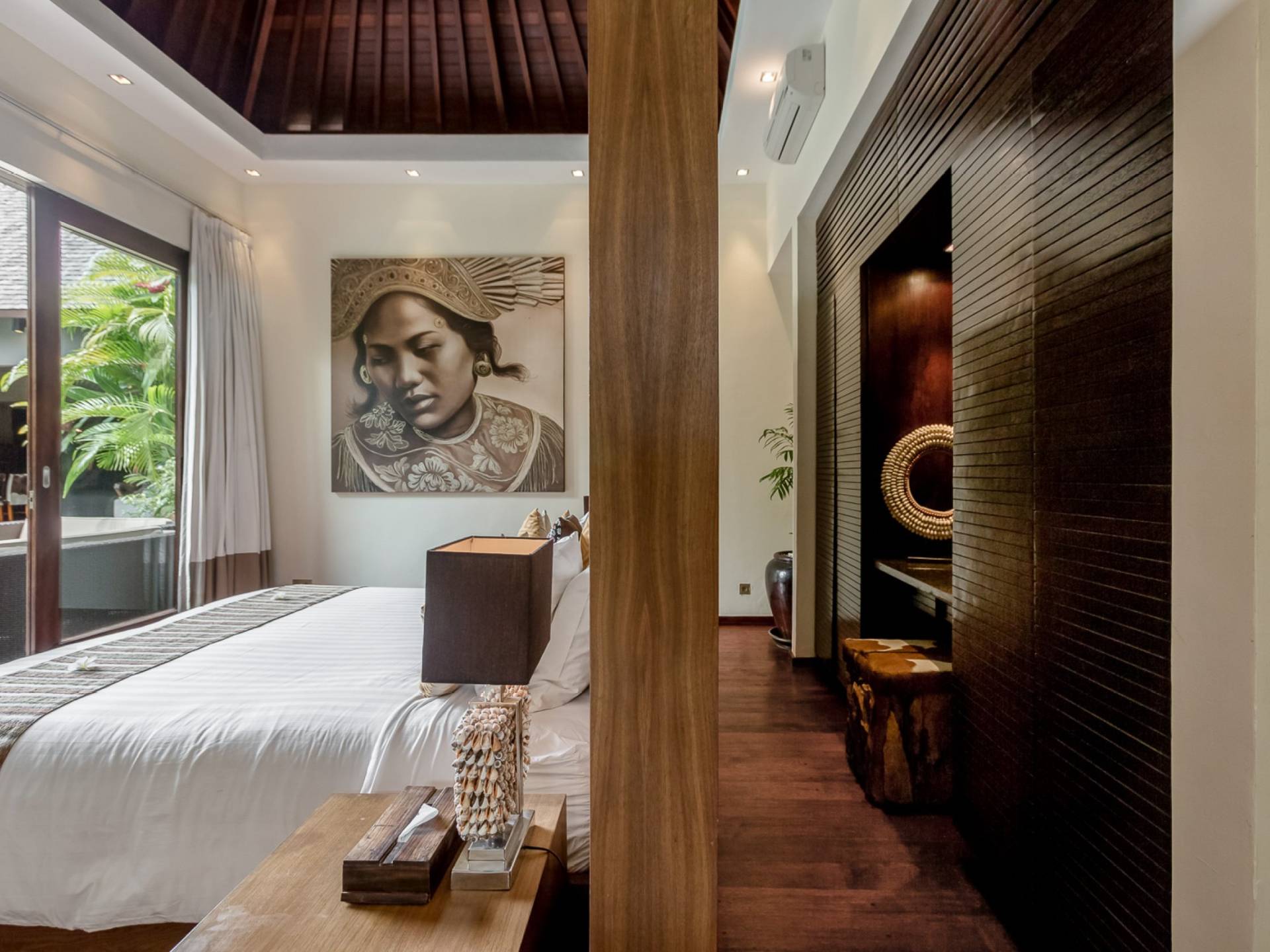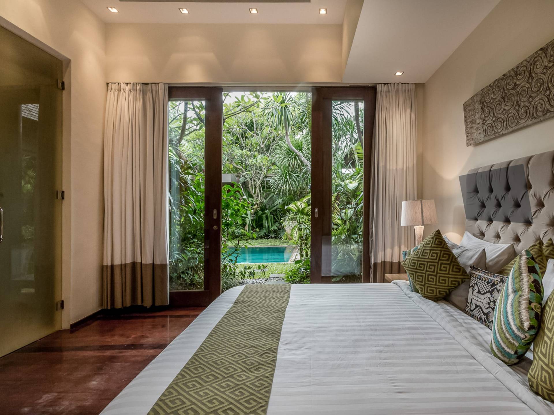 Villa Eshara è una grande villa completamente attrezzata, situata in una strada tranquilla e silenziosa a soli 300 metri dalla spiaggia, dai negozi e dai ristoranti del centro di Seminyak. Questa versatile struttura tre in uno offre la scelta di un'opzione di affitto di 8, 5, 3 o 2 camere da letto grazie a un sistema intelligente di porte scorrevoli e ingressi separati. Ogni villa ha un soggiorno e una sala da pranzo glamour e una cucina integrata, mentre ogni camera da letto con bagno privato ha un letto king-size, una zona spogliatoio e un lettore TV / DVD. Ci sono anche tre piscine immerse in giardini tropicali complete di alberi di frangipani, palme da cocco, lettini e ponti in legno.